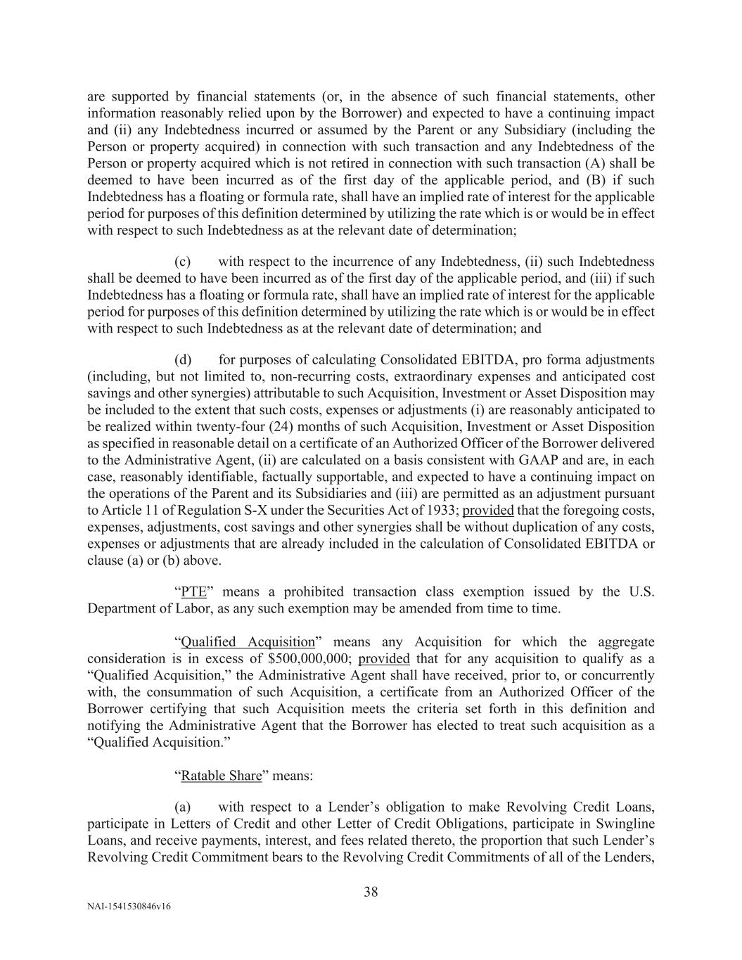NAI-1541530846v16 14 “Connection Income Taxes” means Other Connection Taxes that are imposed on or measured by net income (however denominated) or that are franchise Taxes or branch profits Taxes. “Consolidated EBITDA” means, for any period of determination, the sum of the following determined on a consolidated basis, without duplication, for the Parent and its Subsidiaries in accordance with GAAP: (a) Consolidated Net Income for such period plus (b) the sum of the following, without duplication, to the extent deducted in determining Consolidated Net Income for such period: (i) expenses paid or accrued for taxes based on income, profits or capital, including federal, foreign and state income, franchise and similar taxes, (ii) Consolidated Interest Expense, (iii) amortization, depreciation and other non-cash charges, write-downs and losses (except to the extent that such non-cash charges, write-downs and losses are reserved for cash charges to be taken in the future), (iv) extraordinary, unusual or non-recurring expenses, gains, losses or charges (excluding extraordinary losses from discontinued operations, but including non- recurring litigation expenses and settlements), (v) restructuring charges, severance costs, integration costs and retention costs, (vi) pro forma “run rate” cost savings, operating expense reductions and synergies attributable to Acquisitions, Asset Dispositions, discontinuance of activities of operations, restructurings, cost savings initiatives, operational changes and other initiatives that are reasonably anticipated to be realized within twenty-four (24) months after any such occurrence, change or initiative described above (including actions taken prior to the Closing Date) as specified in reasonable detail on a certificate of an Authorized Officer of the Borrower delivered to the Administrative Agent and are, in each case, reasonably identifiable, factually supportable, and expected to have a continuing impact on the operations of the Parent and its Subsidiaries; provided, that the foregoing costs, expenses, adjustments, cost savings and other synergies shall be without duplication of any costs, expenses or adjustments that are already included in the calculation of Consolidated EBITDA, whether through a pro forma adjustment or otherwise, and (vii) fees and expenses related to any consummated, anticipated, unsuccessful or attempted equity offering or repurchase of equity, debt incurrence (including for the avoidance of doubt, fees and expenses incurred in connection with the Loan Documents), investment or Acquisition less (c) the sum of the following, without duplication, to the extent included in determining Consolidated Net Income for such period: (i) interest income, (ii) any extraordinary gains and (iii) non-cash gains or non-cash items increasing Consolidated Net Income (excluding any items that represent the reversal of any accrual of, or reserve for, anticipated cash expenses, losses or charges in any prior period). For purposes of this Agreement, Consolidated EBITDA shall be adjusted on a Pro Forma Basis for any period of measurement during which any Acquisition, any other Investment that results in a Person becoming a Subsidiary or Asset Disposition has occurred. “Consolidated Funded Indebtedness” means, as of any date of determination, as calculated in accordance with GAAP for the Parent and its Subsidiaries on a consolidated basis, the aggregate amount of Indebtedness of the type described in (a) clauses (a), (b) and (e) of the definition of “Indebtedness” (and all Guaranties of such Indebtedness), (b) solely to the extent drawn and unreimbursed, clause (c) of the definition of “Indebtedness” (and all Guaranties of such Indebtedness). “Consolidated Interest Expense” means, for any Measurement Period, the sum of (a) all interest, premium payments, debt discount, fees, charges and related expenses in connection