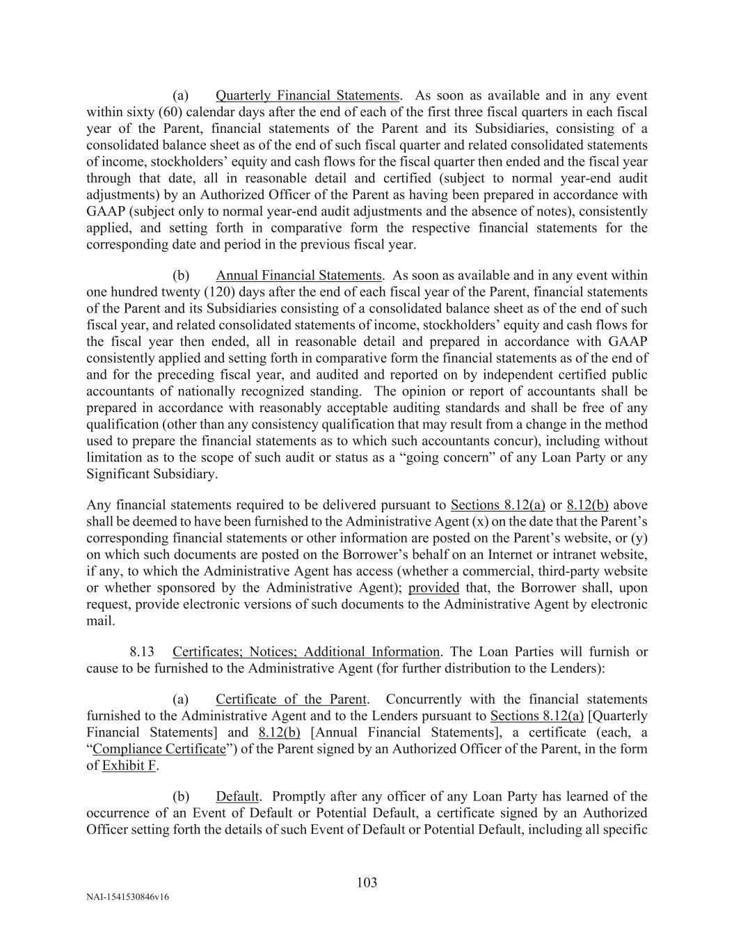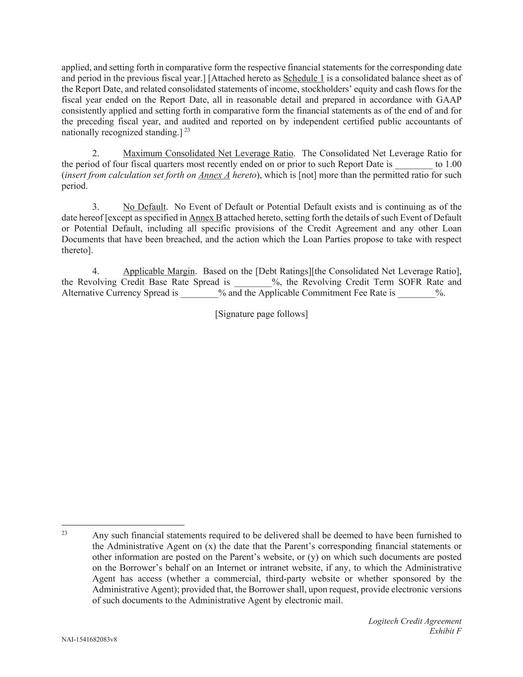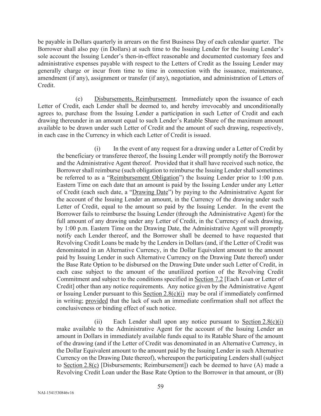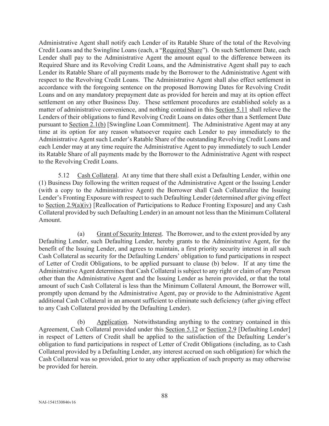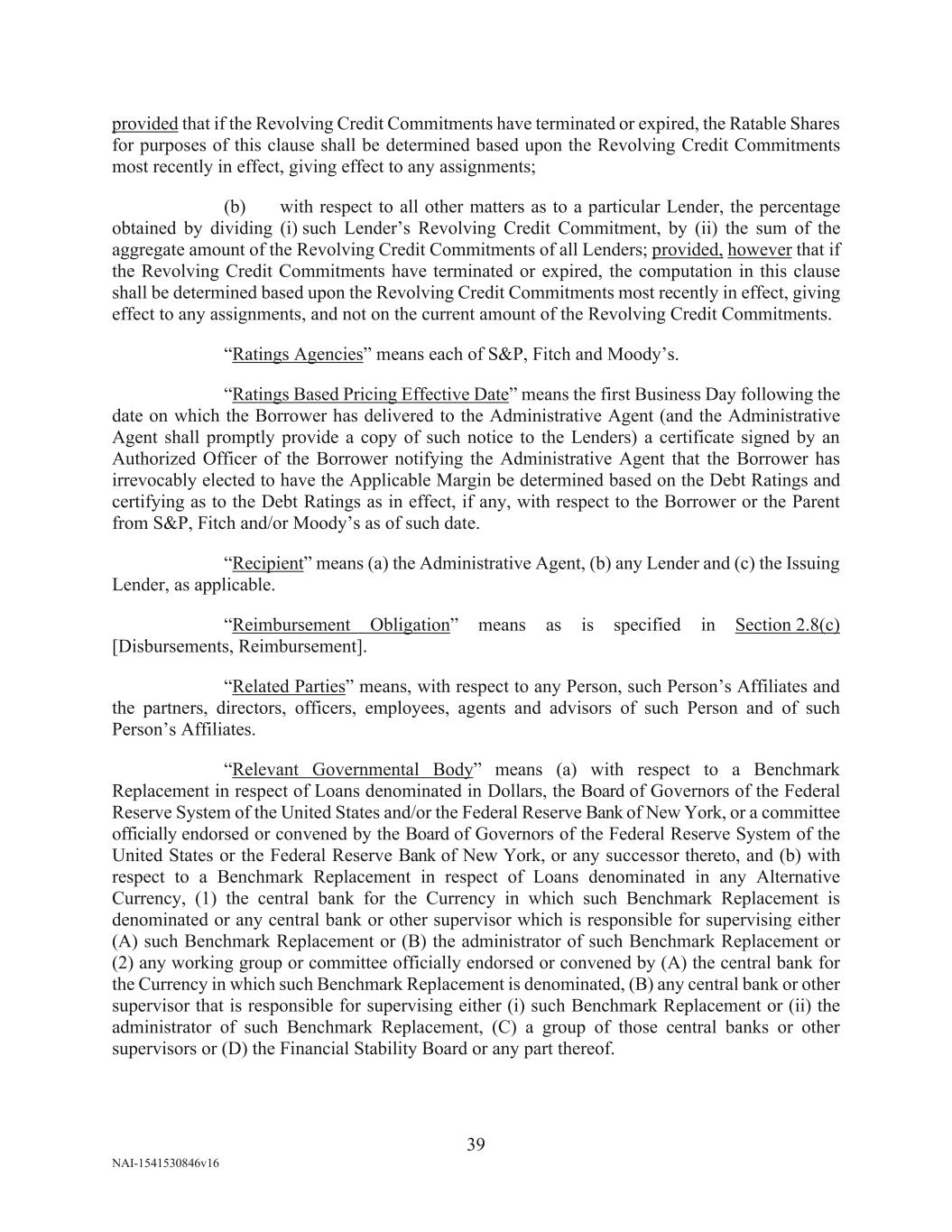 NAI-1541530846v16 4 (b) To the extent that the Applicable Margin and the Applicable Commitment Fee are determined by reference to the Consolidated Net Leverage Ratio, the Applicable Margin and the Applicable Commitment Fee Rate shall be recomputed as of the end of each full fiscal quarter ending after the Closing Date based on the Consolidated Net Leverage Ratio as of such quarter end. Any increase or decrease in the Applicable Margin or the Applicable Commitment Fee Rate computed as of a quarter end shall be effective on the earlier of the date on which the Compliance Certificate evidencing such computation is delivered or due to be delivered under Section 8.13(a) [Certificate of the Parent]. If a Compliance Certificate is not delivered when due in accordance with such Section 8.13 [Certificates; Notices; Additional Information], then the rates in Pricing Level V shall apply as of the first Business Day after the date on which such Compliance Certificate was required to have been delivered and shall remain in effect until the date on which such Compliance Certificate is delivered. (c) If, as a result of any restatement of or other adjustment to the financial statements delivered pursuant to Section 8.12(a) [Quarterly Financial Statements] or 8.12(b) [Annual Financial Statements], as applicable, or for any other reason, the Loan Parties or the Administrative Agent determine that (i) the Consolidated Net Leverage Ratio as calculated by the Loan Parties as of any applicable date was inaccurate and (ii) a proper calculation of the Consolidated Net Leverage Ratio would have resulted in higher pricing for such period, the Loan Parties shall immediately and retroactively be obligated to pay to the Administrative Agent for the account of the applicable Lenders, promptly on demand by the Administrative Agent (or, after the occurrence of an Event of Default that is continuing under Section 10.1(a) [Payments Under Loan Documents], automatically and without further action by the Administrative Agent, any Lender or the Issuing Lender), an amount equal to the excess of the amount of interest and fees that should have been paid for such period over the amount of interest and fees actually paid for such period (provided that if such proper calculation would have led to the application of a higher interest rate or fees in one or more periods and a lower interest rate or fees in one or more periods, the Loan Parties shall only be liable for the positive difference over all such affected periods). This paragraph shall not limit the rights of the Administrative Agent, any Lender or the Issuing Lender, as the case may be, under Section 2.8 [Letter of Credit Subfacility] or Section 4.3 [Interest After Default] or Article 10 [Default]. The Loan Parties’ obligations under this paragraph shall survive the termination of the Commitments and the repayment of all other Obligations hereunder. (d) To the extent that the Applicable Margin and the Applicable Commitment Fee are determined by reference to the Debt Ratings, (i) if only one of the Rating Agencies shall have in effect a Debt Rating, then the Pricing Level shall be determined by reference to such available Debt Rating, (ii) if two Rating Agencies shall have in effect Debt Ratings, and such Debt Ratings differ by one Pricing Level, then the higher of the two Pricing Levels shall apply (with Pricing Level V being the highest and Pricing Level I being the lowest), (iii) if two Rating Agencies shall have in effect Debt Ratings, and there is a split in Debt Ratings of such Rating Agencies of more than one Pricing Level, then the Pricing Level that is one Pricing Level below the higher of the two Pricing Levels shall apply, (iv) if three Rating Agencies shall have in effect Debt Ratings, and any two or three of the Debt Ratings are the same, then the Pricing Level shall be determined by reference to such Debt Ratings that are the same, (v) if three Rating Agencies shall have in effect Debt Ratings, each Debt Rating is in a different Pricing Level and there is not a split in Debt Ratings by more than two Pricing Levels, the Pricing Level that is the middle of the other two Rating Agencies shall apply, (vi) if three Rating Agencies shall have in effect Debt Ratings, clause