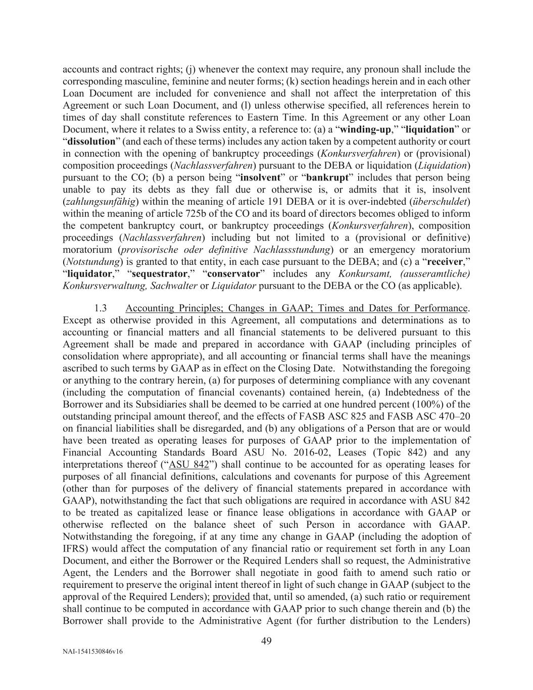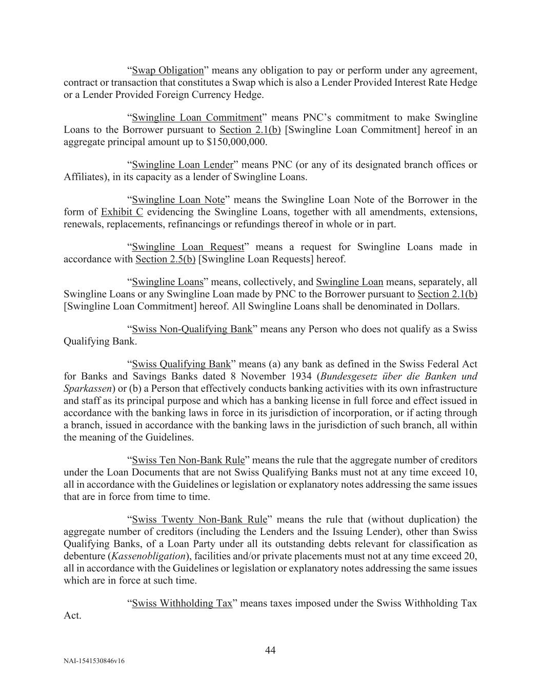 NAI-1541530846v16 12 “Cash Management Bank” means any Person that, at the time it enters into an Other Lender Provided Financial Service Product, is a Lender or an Affiliate of a Lender, in its capacity as a party to such Other Lender Provided Financial Service Product. “Certificate of Beneficial Ownership” means, for the Borrower, a certificate in form and substance acceptable to the Administrative Agent (as amended or modified by the Administrative Agent from time to time in its sole discretion), certifying, among other things, the Beneficial Owner of the Borrower. “CEA” means the Commodity Exchange Act (7 U.S.C. §1 et seq.), as amended from time to time, and any successor statute. “CFTC” means the Commodity Futures Trading Commission. “Change in Law” means the occurrence, after the date of this Agreement, of any of the following: (a) the adoption or taking effect of any Law, (b) any change in any Law or in the administration, interpretation, implementation or application thereof by any Official Body or (c) the making or issuance of any request, rule, guideline or directive (whether or not having the force of Law) by any Official Body; provided that notwithstanding anything herein to the contrary, (x) the Dodd-Frank Wall Street Reform and Consumer Protection Act and all requests, rules, regulations, guidelines, interpretations or directives thereunder or issued in connection therewith (whether or not having the force of Law) and (y) all requests, rules, regulations, guidelines, interpretations or directives promulgated by the Bank for International Settlements, the Basel Committee on Banking Supervision (or any successor or similar authority) or the United States or foreign regulatory authorities (whether or not having the force of Law), in each case pursuant to Basel III, shall in each case be deemed to be a Change in Law regardless of the date enacted, adopted, issued, promulgated or implemented. “Change of Control” means any “person” or “group” (as such terms are used in Sections 13(d) and 14(d) of the Securities Exchange Act of 1934, as amended (the “Exchange Act”)), shall become, or obtain rights (whether by means of warrants, options or otherwise) to become, the “beneficial owner” (as defined in Rules 13(d)-3 and 13(d)-5 under the Exchange Act), directly or indirectly, of more than 50% of the aggregate ordinary voting power represented by the issued and outstanding Equity Interests of the Borrower. “CIP Regulations” means as is specified in Section 11.12 [No Reliance on Administrative Agent’s Customer Identification Program]. “Class”, when used in reference to any Loan, refers to whether such Loan, or the advances comprising such Loans, are Revolving Credit Loans or Swingline Loans and, when used in reference to any Lender, refers to whether such Lender has any outstanding Revolving Credit Loans or Revolving Credit Commitments. “Closing Date” means January 27, 2025. “CO” means the Swiss Code of Obligations (Schweizerisches Obligationenrecht, OR), as amended from time to time.
