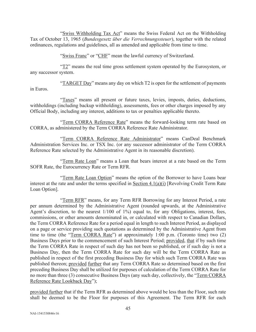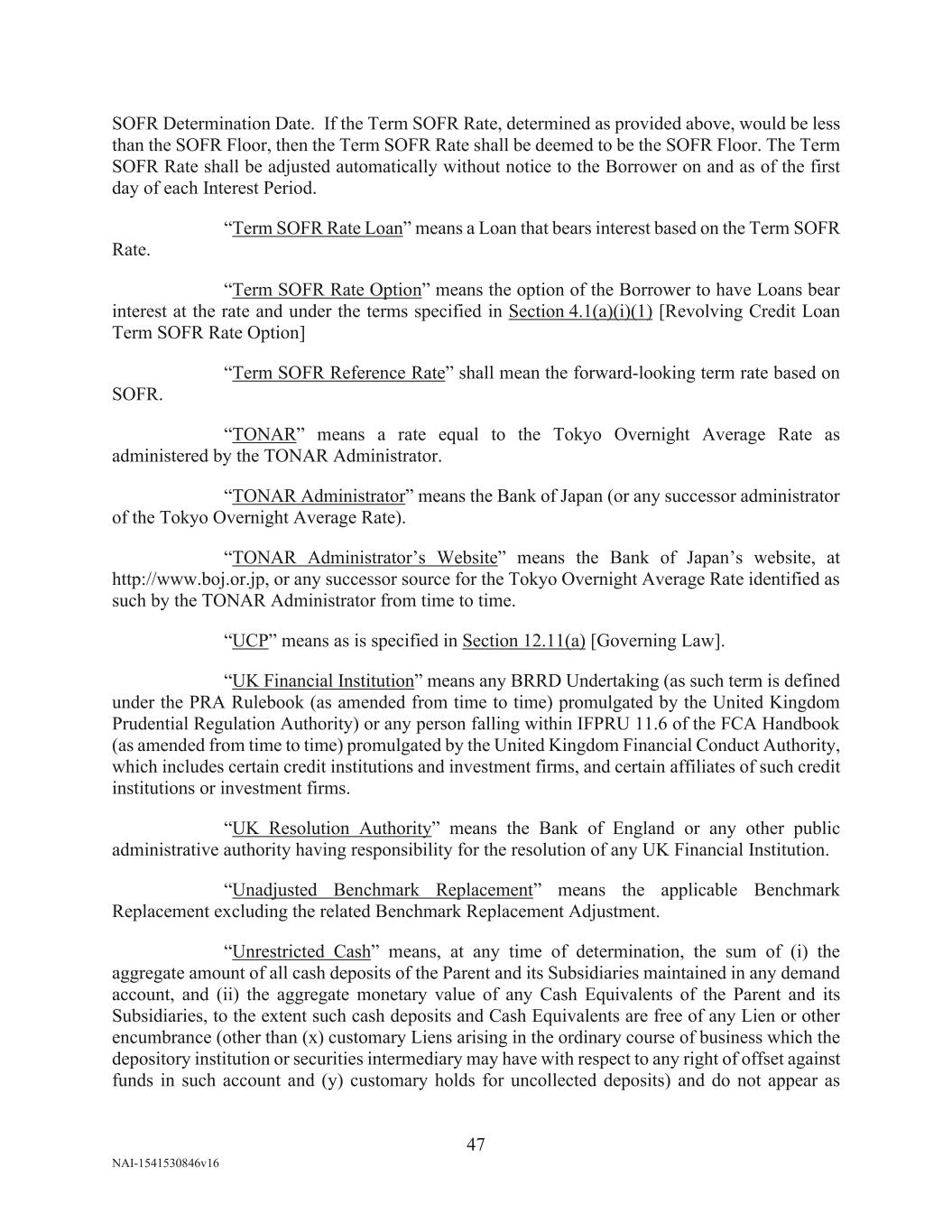 NAI-1541530846v16 16 exercise voting power, by contract or otherwise. “Controlling” and “Controlled” have meanings correlative thereto. “CORRA” means a rate equal to the Canadian Overnight Repo Rate Average as administered by the CORRA Administrator. “CORRA Administrator” means the Bank of Canada (or any successor administrator of the Canadian Overnight Repo Rate Average). “Covered Entity” means (a) the Borrower and each of the Borrower’s Subsidiaries; (b) the Parent; and (c) each Person that, directly or indirectly, controls a Person described in clause (a) or (b) above. “Currency” means Dollars or any Alternative Currency and “Currencies” shall mean, collectively, Dollars and each Alternative Currency. “Daily Rate Loan” means a Loan that bears interest at a rate based on the (i) Base Rate or (ii) Daily Simple RFR. “Daily Rate Loan Option” means the option of the Borrower to have Loans bear interest at the rate and under the terms specified in Section 4.1(a)(ii) [Revolving Credit Daily Rate Loan Option] or Section 4.1(b) [Swingline Loan Interest Rate], as applicable. “Daily Simple RFR” means, for any day (a “Daily RFR Day”), a rate per annum determined by the Administrative Agent (rounded upwards, at the Administrative Agent’s discretion, to the nearest 1/100 of 1%) equal to, for any Obligations, interest, fees, commissions or other amounts denominated in, or calculated with respect to: (a) Sterling, SONIA for the day (such day, adjusted as applicable as set forth herein, the “SONIA Lookback Day”) that is two (2) Business Days prior to (A) if such Daily RFR Day is a Business Day, such Daily RFR Day or (B) if such Daily RFR Day is not a Business Day, the Business Day immediately preceding such Daily RFR Day, in each case, as such SONIA is published by the SONIA Administrator on the SONIA Administrator’s Website; (b) Euro, €STR for the day (such day, adjusted as applicable as set forth herein, the “€STR Lookback Day”) that is two (2) Business Days prior to (A) if such Daily RFR Day is a Business Day, such Daily RFR Day or (B) if such Daily RFR Day is not a Business Day, the Business Day immediately preceding such Daily RFR Day, in each case, as such €STR is published by the €STR Administrator on the €STR Administrator’s Website; (c) Yen, TONAR for the day (such day, adjusted as applicable as set forth herein, the “TONAR Lookback Day”) that is two (2) Business Days prior to (A) if such Daily RFR Day is a Business Day, such Daily RFR Day or (B) if such Daily RFR Day is not a Business Day, the Business Day immediately preceding such Daily RFR Day, in each case, as such TONAR is published by the TONAR Administrator on the TONAR Administrator’s Website; and (d) Swiss Franc, SARON for the day (such day, adjusted as applicable as set forth herein, the “SARON Lookback Day”) that is two (2) Business Days prior to (A) if such Daily RFR