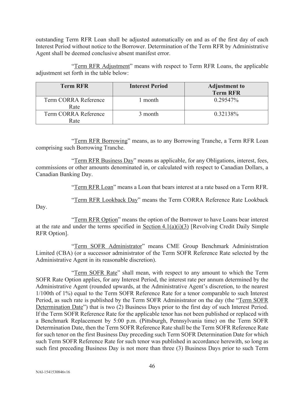 NAI-1541530846v16 7 “Benchmark” means, initially, with respect to Obligations, interest, fees, commissions, or other amounts denominated in, or calculated with respect to, (a) Dollars, SOFR and the Term SOFR Reference Rate, (b) Euros, Sterling, Swiss Francs or Yen, the Daily Simple RFR applicable for such Currency, (c) Canadian Dollars, the Term RFR applicable for such Currency, or (d) Australian Dollars, the Eurocurrency Rate; provided that if a Benchmark Transition Event has occurred with respect to the then-current Benchmark, then “Benchmark” means the applicable Benchmark Replacement to the extent that such Benchmark Replacement has replaced such prior benchmark rate pursuant to Section 4.4(d) [Benchmark Replacement Setting]. “Benchmark Replacement” means, with respect to any Benchmark Transition Event, the first applicable alternative set forth in the order below that can be determined by the Administrative Agent for the applicable Benchmark Replacement Date: (1) Where the Benchmark is Term SOFR, Daily Simple SOFR; (2) Where the Benchmark is the Term CORRA Reference Rate, the sum of: (A) the Daily Simple RFR for Canadian Dollars (CORRA) and (B) the related Benchmark Replacement Adjustment; and (3) the sum of (A) the alternate benchmark rate that has been selected by the Administrative Agent and the Borrower, giving due consideration to (x) any selection or recommendation of a replacement benchmark rate or the mechanism for determining such a rate by the Relevant Governmental Body or (y) any evolving or then-prevailing market convention for determining a benchmark rate as a replacement to the then-current Benchmark for syndicated credit facilities denominated in the applicable Currency at such time and (B) the related Benchmark Replacement Adjustment; provided, that if the Benchmark Replacement as determined pursuant to the foregoing would be less than the Floor, the Benchmark Replacement will be deemed to be the Floor for the purposes of this Agreement and the other Loan Documents; and provided further, that any Benchmark Replacement shall be administratively feasible as determined by the Administrative Agent in its sole discretion. “Benchmark Replacement Adjustment” means, with respect to any replacement of the then-current Benchmark with an Unadjusted Benchmark Replacement, the spread adjustment, or method for calculating or determining such spread adjustment (which may be a positive or negative value or zero) that has been selected by the Administrative Agent and the Borrower, giving due consideration to (A) any selection or recommendation of a spread adjustment, or method for calculating or determining such spread adjustment, for the replacement of such Benchmark with the applicable Unadjusted Benchmark Replacement by the Relevant Governmental Body or (B) any evolving or then-prevailing market convention for determining a spread adjustment, or method for calculating or determining such spread adjustment, for the replacement of such Benchmark with the applicable Unadjusted Benchmark Replacement for syndicated credit facilities denominated in the applicable Currency at such time.