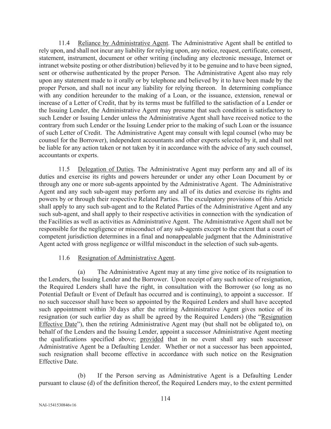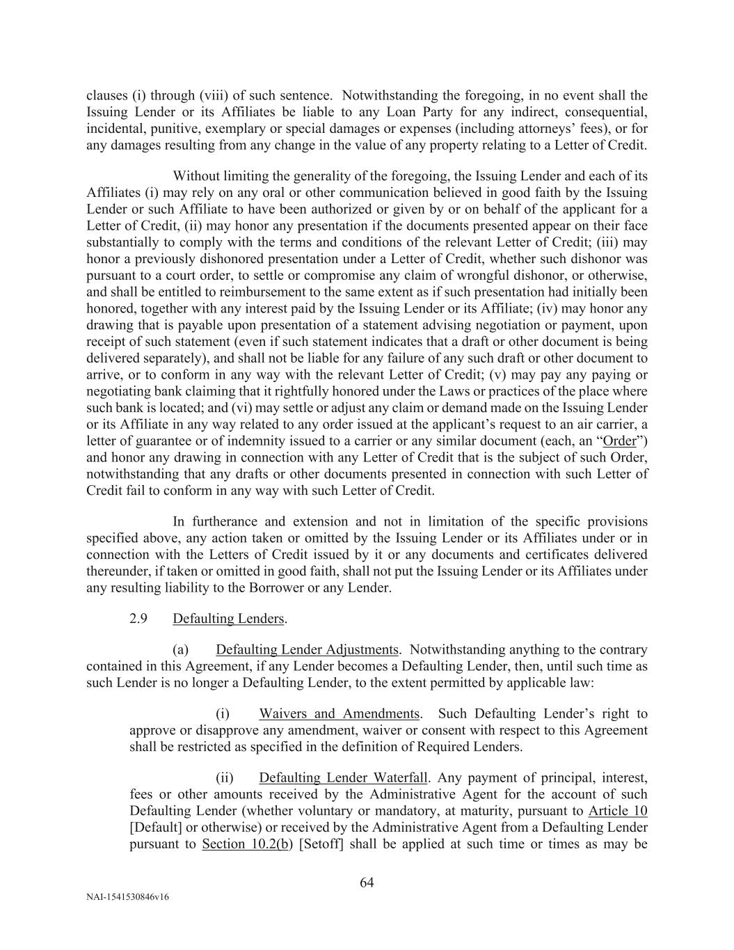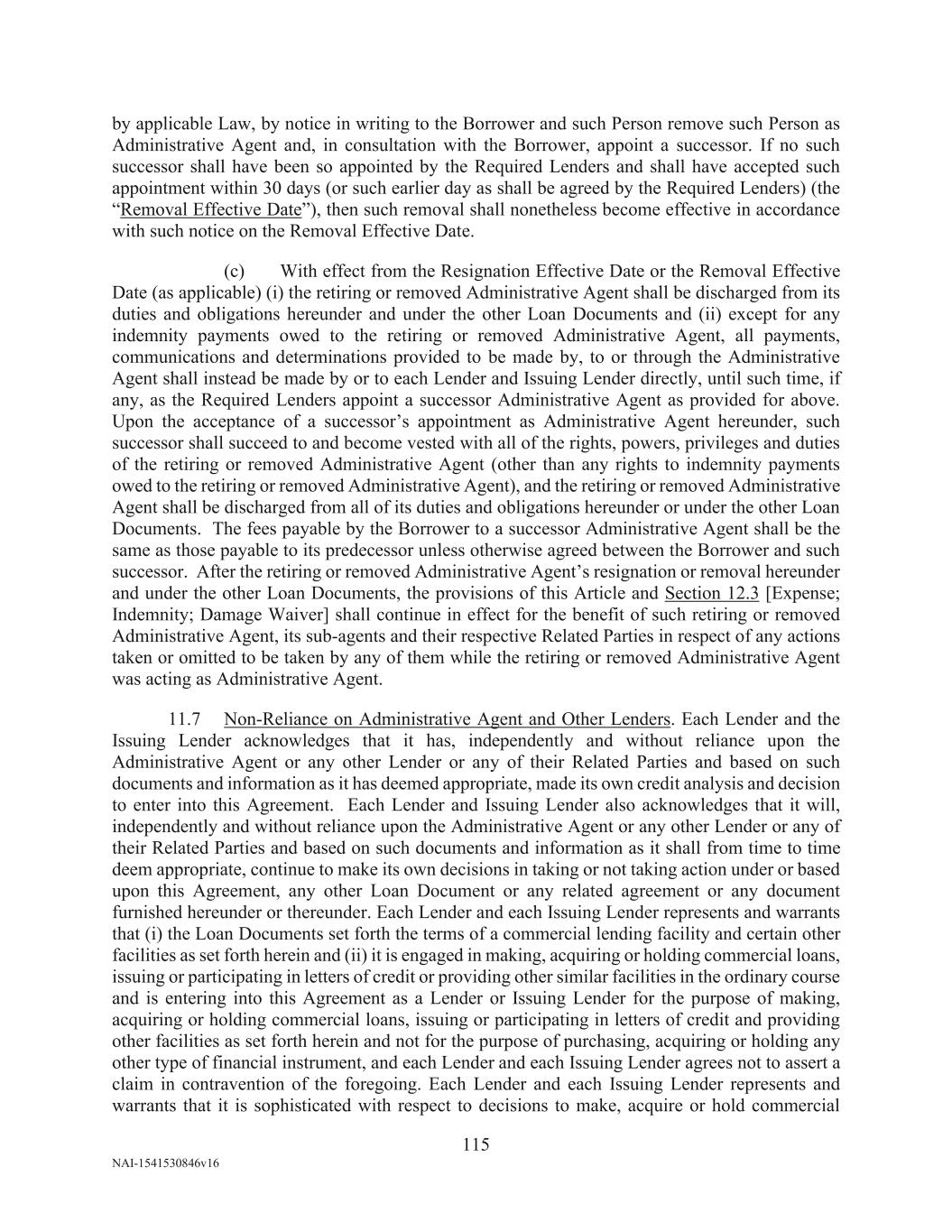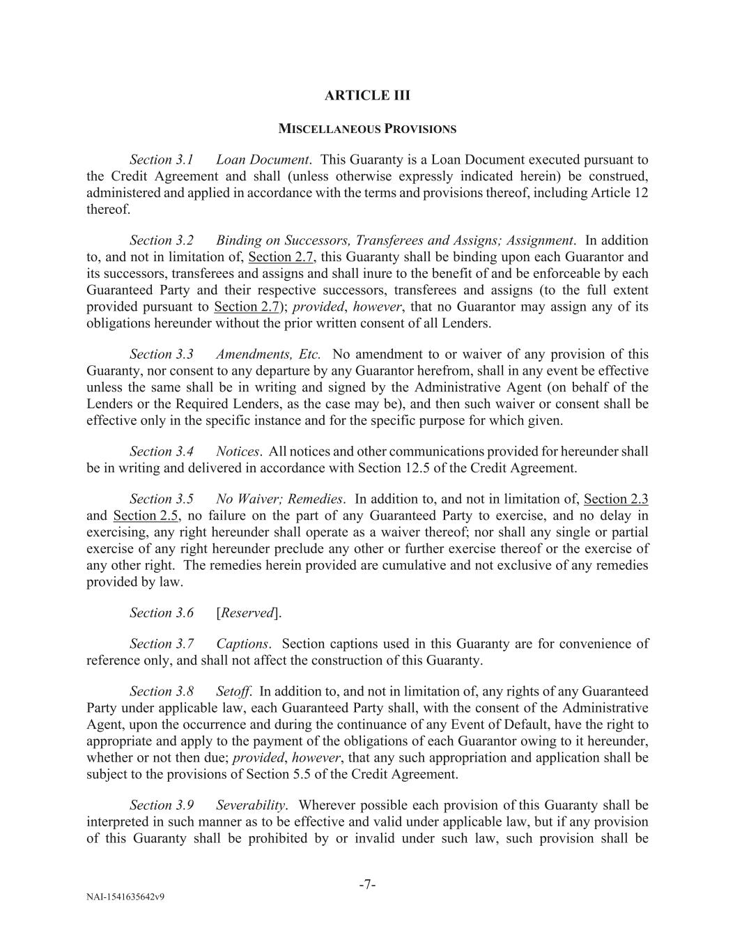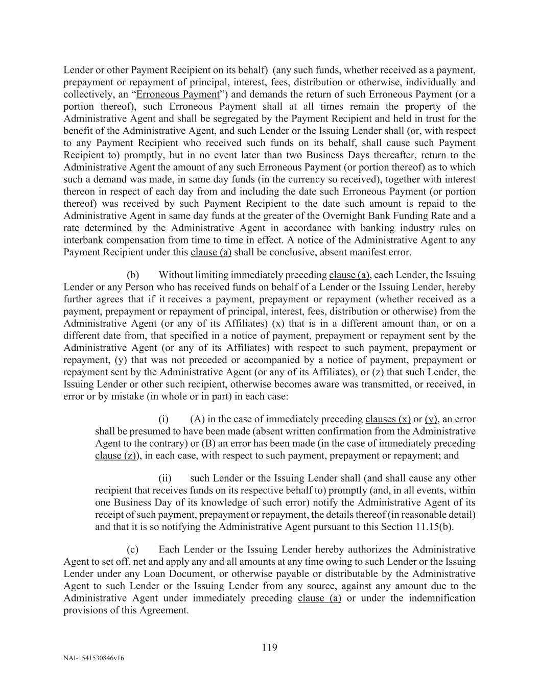 NAI-1541530846v16 TABLE OF CONTENTS (continued) Page ARTICLE 10 DEFAULT ........................................................................................................ 107 10.1 Events of Default ............................................................................................... 107 10.2 Consequences of Event of Default. .................................................................... 109 10.3 Application of Proceeds ..................................................................................... 111 ARTICLE 11 THE ADMINISTRATIVE AGENT ............................................................... 112 11.1 Appointment and Authority ............................................................................... 112 11.2 Rights as a Lender .............................................................................................. 112 11.3 Exculpatory Provisions. ..................................................................................... 112 11.4 Reliance by Administrative Agent ..................................................................... 114 11.5 Delegation of Duties .......................................................................................... 114 11.6 Resignation of Administrative Agent. ............................................................... 114 11.7 Non-Reliance on Administrative Agent and Other Lenders .............................. 115 11.8 No Other Duties, Etc. ......................................................................................... 116 11.9 Administrative Agent’s Fee ............................................................................... 116 11.10 Administrative Agent May File Proofs of Claim ............................................... 116 11.11 [Reserved]. ......................................................................................................... 117 11.12 No Reliance on Administrative Agent’s Customer Identification Program ...... 117 11.13 Lender Provided Interest Rate Hedges, Lender Provided Foreign Currency Hedges and Other Lender Provided Financial Service Products ....................... 117 11.14 Certain ERISA Matters. ..................................................................................... 117 11.15 Erroneous Payments........................................................................................... 118 ARTICLE 12 MISCELLANEOUS ........................................................................................ 121 12.1 Modifications, Amendments or Waivers ........................................................... 121 12.2 No Implied Waivers; Cumulative Remedies ..................................................... 123 12.3 Expenses; Indemnity; Damage Waiver. ............................................................. 123 12.4 Holidays ............................................................................................................. 125 12.5 Notices; Effectiveness; Electronic Communication. ......................................... 125 12.6 Severability ........................................................................................................ 127 12.7 Duration; Survival .............................................................................................. 127 12.8 Successors and Assigns...................................................................................... 128 12.9 Confidentiality. .................................................................................................. 133