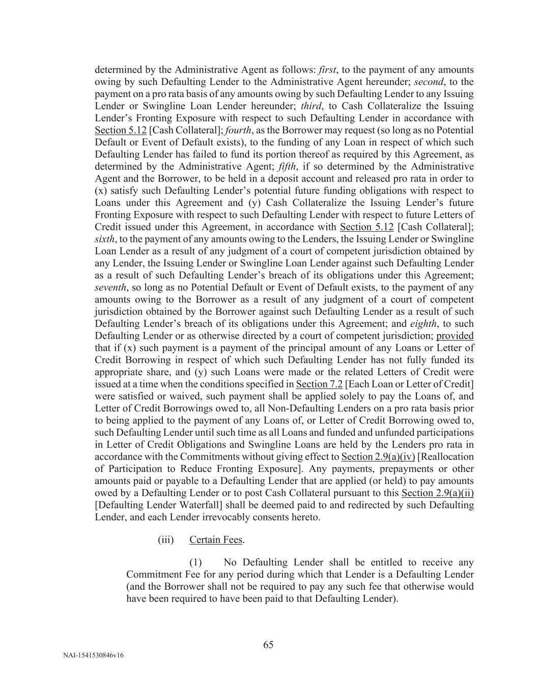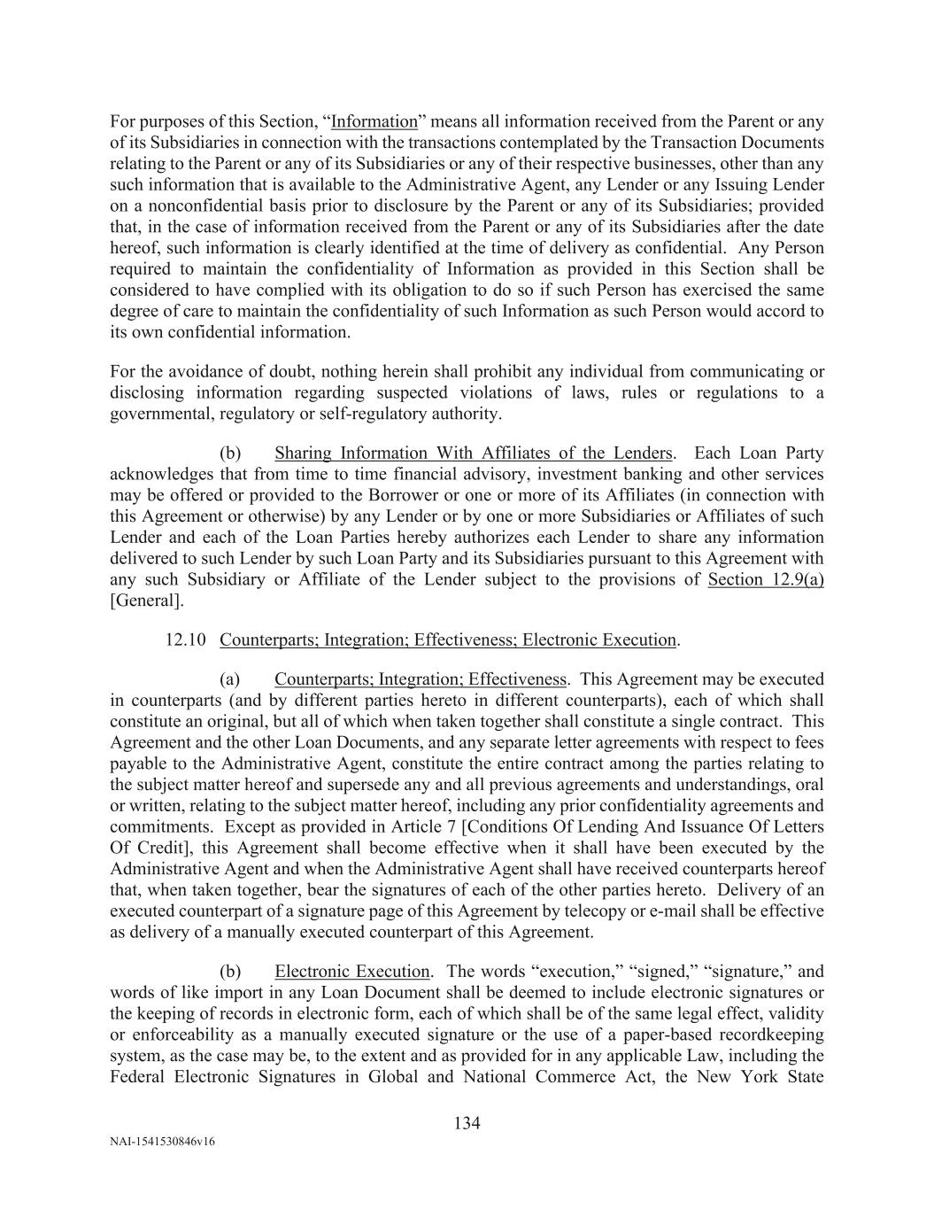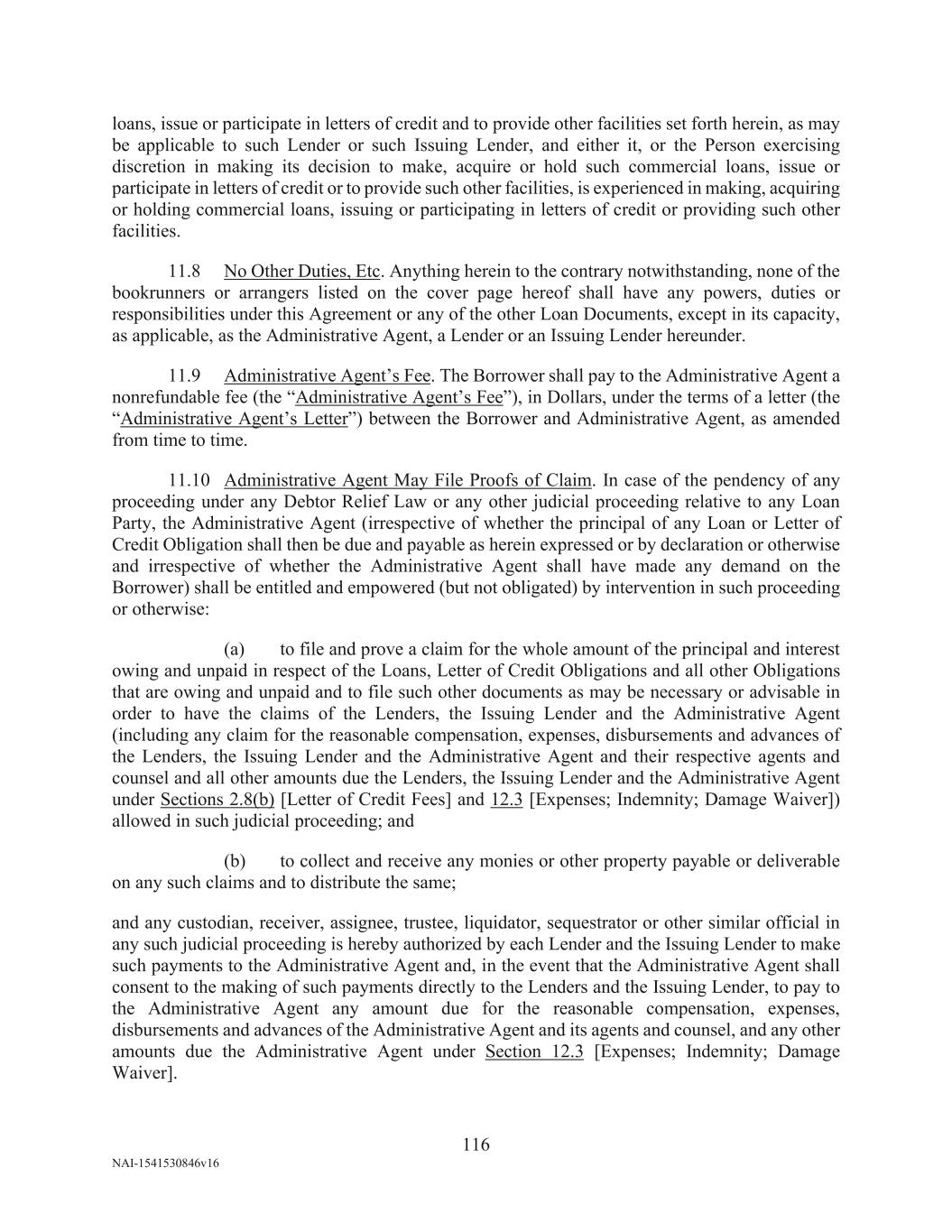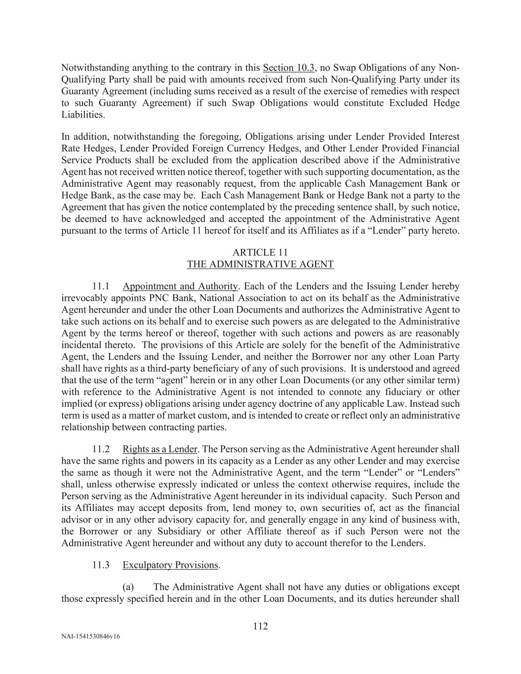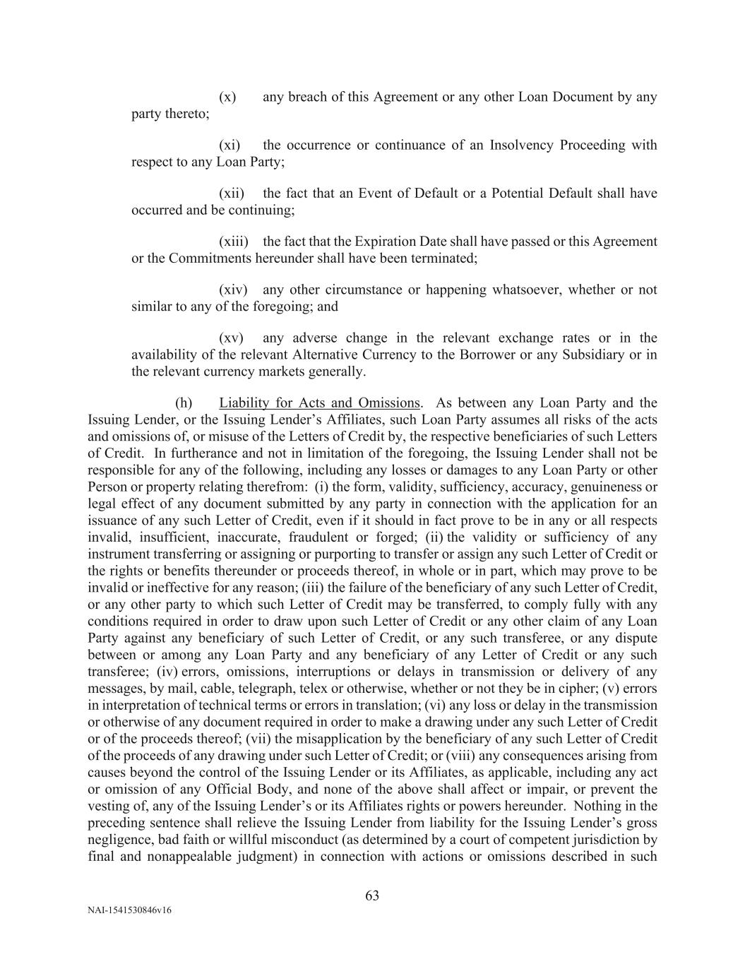 NAI-1541530846v16 TABLE OF CONTENTS (continued) Page ARTICLE 10 DEFAULT ........................................................................................................ 107 10.1 Events of Default ............................................................................................... 107 10.2 Consequences of Event of Default. .................................................................... 109 10.3 Application of Proceeds ..................................................................................... 111 ARTICLE 11 THE ADMINISTRATIVE AGENT ............................................................... 112 11.1 Appointment and Authority ............................................................................... 112 11.2 Rights as a Lender .............................................................................................. 112 11.3 Exculpatory Provisions. ..................................................................................... 112 11.4 Reliance by Administrative Agent ..................................................................... 114 11.5 Delegation of Duties .......................................................................................... 114 11.6 Resignation of Administrative Agent. ............................................................... 114 11.7 Non-Reliance on Administrative Agent and Other Lenders .............................. 115 11.8 No Other Duties, Etc. ......................................................................................... 116 11.9 Administrative Agent’s Fee ............................................................................... 116 11.10 Administrative Agent May File Proofs of Claim ............................................... 116 11.11 [Reserved]. ......................................................................................................... 117 11.12 No Reliance on Administrative Agent’s Customer Identification Program ...... 117 11.13 Lender Provided Interest Rate Hedges, Lender Provided Foreign Currency Hedges and Other Lender Provided Financial Service Products ....................... 117 11.14 Certain ERISA Matters. ..................................................................................... 117 11.15 Erroneous Payments........................................................................................... 118 ARTICLE 12 MISCELLANEOUS ........................................................................................ 121 12.1 Modifications, Amendments or Waivers ........................................................... 121 12.2 No Implied Waivers; Cumulative Remedies ..................................................... 123 12.3 Expenses; Indemnity; Damage Waiver. ............................................................. 123 12.4 Holidays ............................................................................................................. 125 12.5 Notices; Effectiveness; Electronic Communication. ......................................... 125 12.6 Severability ........................................................................................................ 127 12.7 Duration; Survival .............................................................................................. 127 12.8 Successors and Assigns...................................................................................... 128 12.9 Confidentiality. .................................................................................................. 133