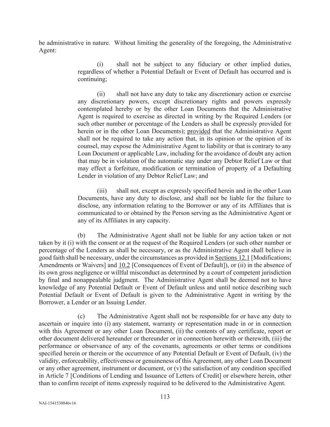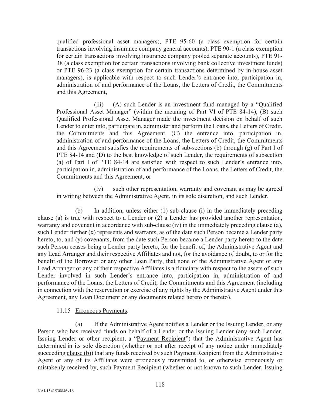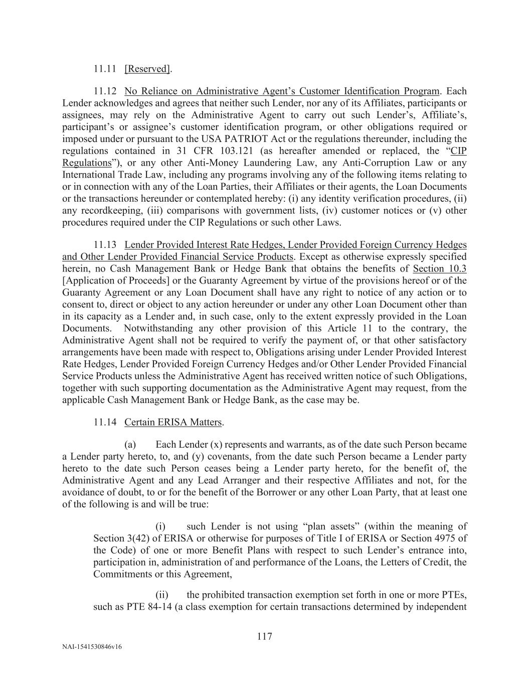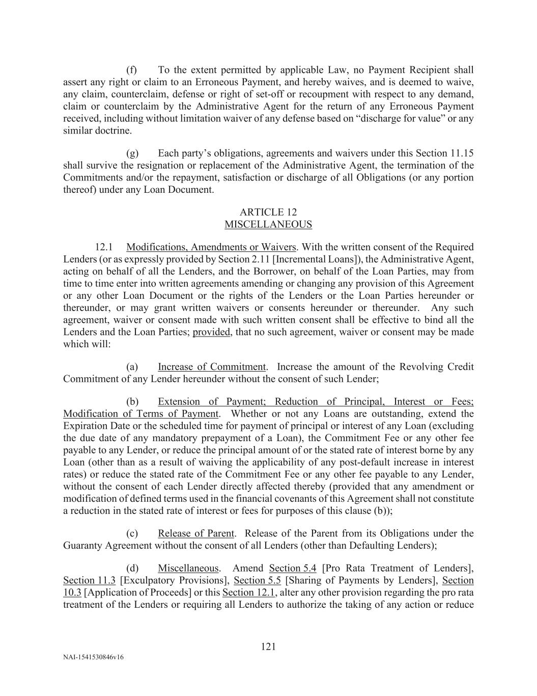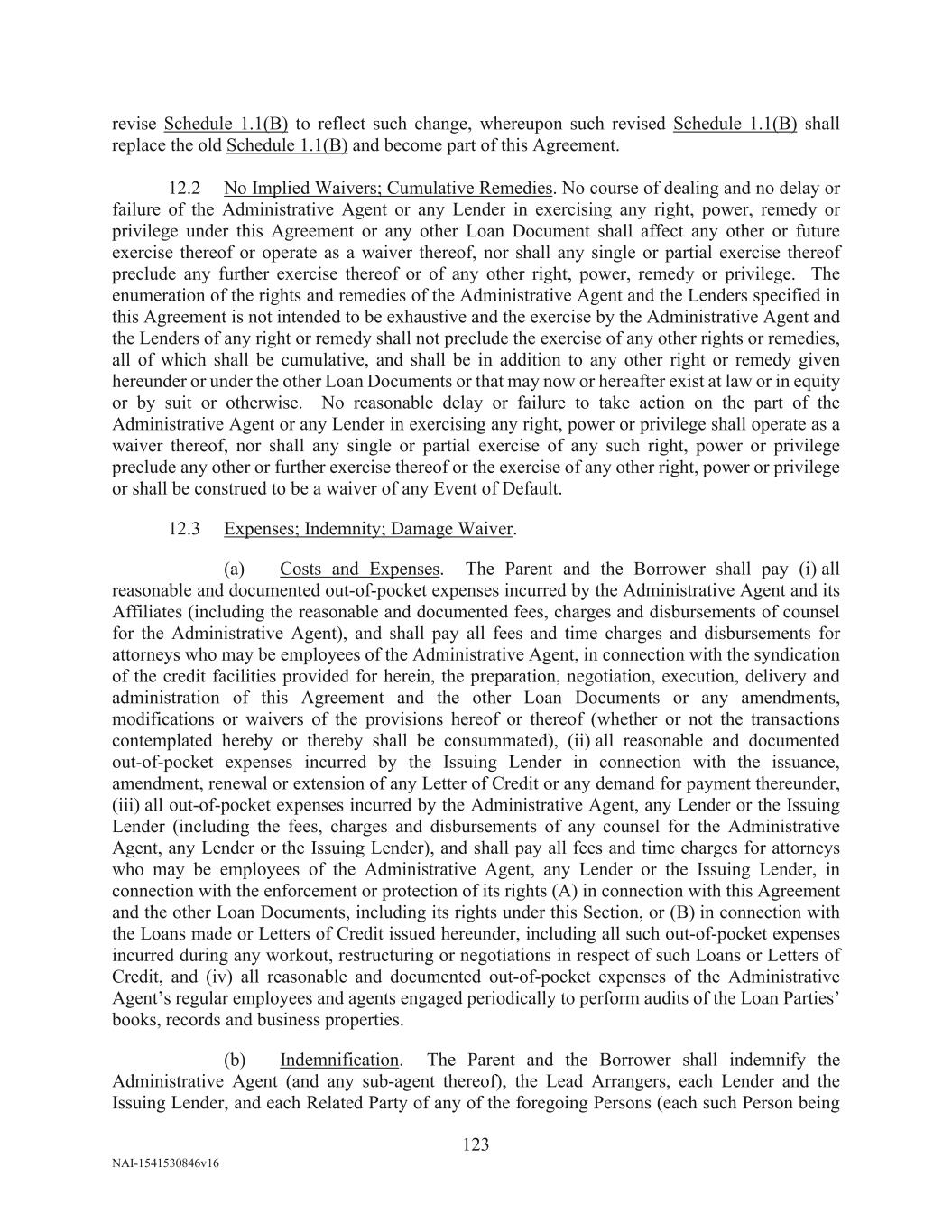 NAI-1541530846v16 TABLE OF CONTENTS (continued) Page ARTICLE 10 DEFAULT ........................................................................................................ 107 10.1 Events of Default ............................................................................................... 107 10.2 Consequences of Event of Default. .................................................................... 109 10.3 Application of Proceeds ..................................................................................... 111 ARTICLE 11 THE ADMINISTRATIVE AGENT ............................................................... 112 11.1 Appointment and Authority ............................................................................... 112 11.2 Rights as a Lender .............................................................................................. 112 11.3 Exculpatory Provisions. ..................................................................................... 112 11.4 Reliance by Administrative Agent ..................................................................... 114 11.5 Delegation of Duties .......................................................................................... 114 11.6 Resignation of Administrative Agent. ............................................................... 114 11.7 Non-Reliance on Administrative Agent and Other Lenders .............................. 115 11.8 No Other Duties, Etc. ......................................................................................... 116 11.9 Administrative Agent’s Fee ............................................................................... 116 11.10 Administrative Agent May File Proofs of Claim ............................................... 116 11.11 [Reserved]. ......................................................................................................... 117 11.12 No Reliance on Administrative Agent’s Customer Identification Program ...... 117 11.13 Lender Provided Interest Rate Hedges, Lender Provided Foreign Currency Hedges and Other Lender Provided Financial Service Products ....................... 117 11.14 Certain ERISA Matters. ..................................................................................... 117 11.15 Erroneous Payments........................................................................................... 118 ARTICLE 12 MISCELLANEOUS ........................................................................................ 121 12.1 Modifications, Amendments or Waivers ........................................................... 121 12.2 No Implied Waivers; Cumulative Remedies ..................................................... 123 12.3 Expenses; Indemnity; Damage Waiver. ............................................................. 123 12.4 Holidays ............................................................................................................. 125 12.5 Notices; Effectiveness; Electronic Communication. ......................................... 125 12.6 Severability ........................................................................................................ 127 12.7 Duration; Survival .............................................................................................. 127 12.8 Successors and Assigns...................................................................................... 128 12.9 Confidentiality. .................................................................................................. 133