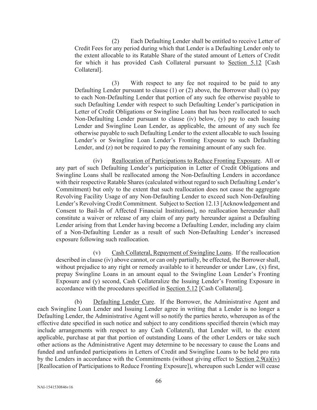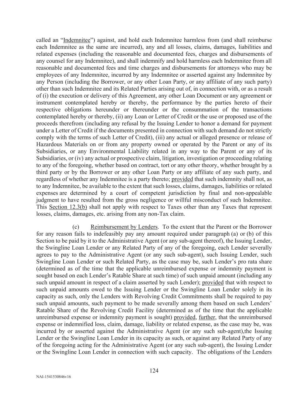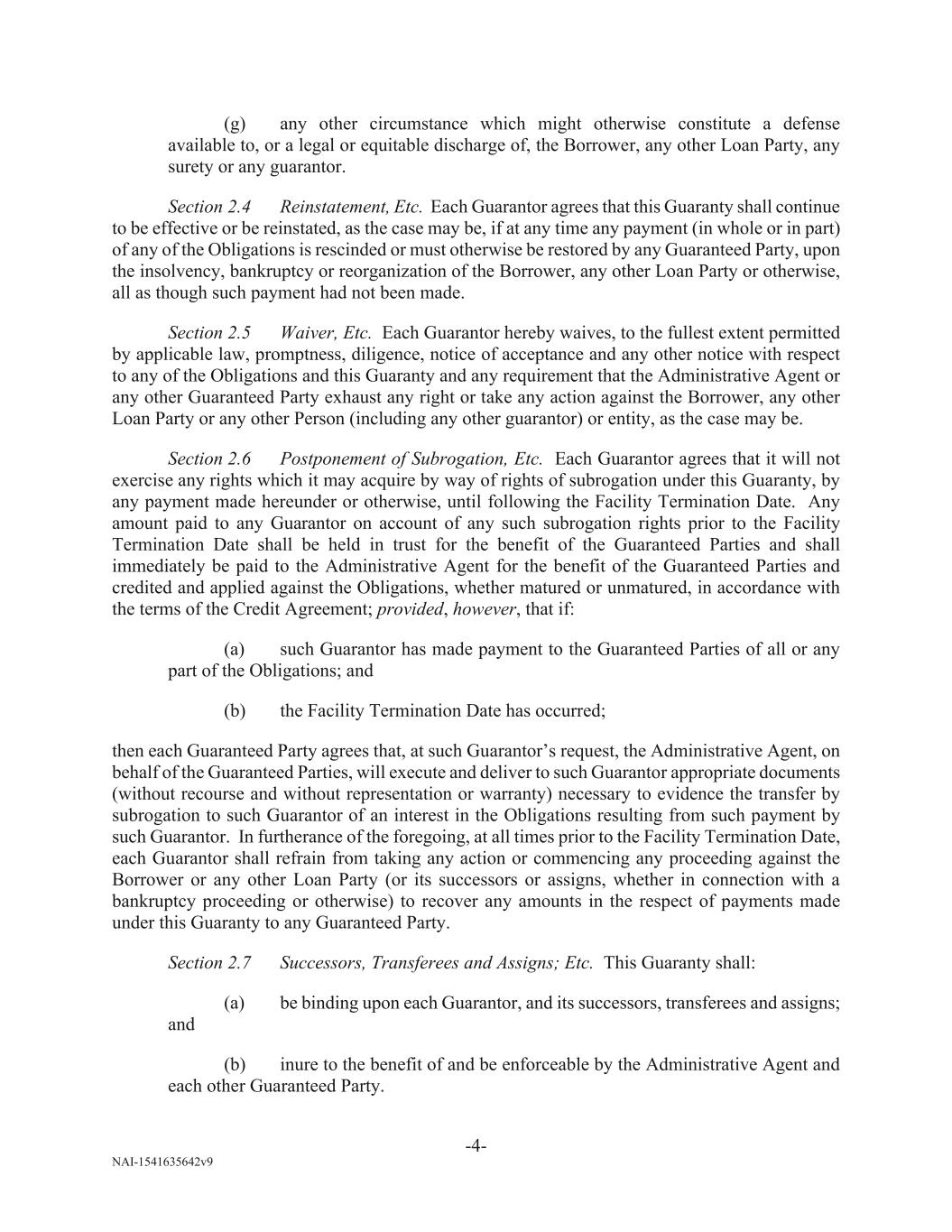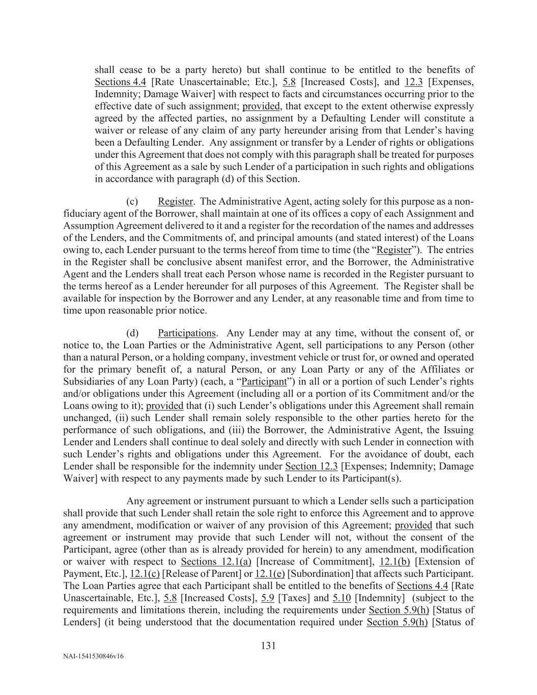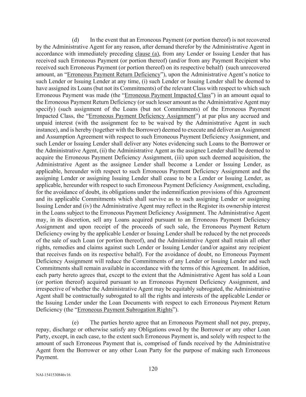 NAI-1541530846v16 TABLE OF CONTENTS (continued) Page ARTICLE 10 DEFAULT ........................................................................................................ 107 10.1 Events of Default ............................................................................................... 107 10.2 Consequences of Event of Default. .................................................................... 109 10.3 Application of Proceeds ..................................................................................... 111 ARTICLE 11 THE ADMINISTRATIVE AGENT ............................................................... 112 11.1 Appointment and Authority ............................................................................... 112 11.2 Rights as a Lender .............................................................................................. 112 11.3 Exculpatory Provisions. ..................................................................................... 112 11.4 Reliance by Administrative Agent ..................................................................... 114 11.5 Delegation of Duties .......................................................................................... 114 11.6 Resignation of Administrative Agent. ............................................................... 114 11.7 Non-Reliance on Administrative Agent and Other Lenders .............................. 115 11.8 No Other Duties, Etc. ......................................................................................... 116 11.9 Administrative Agent’s Fee ............................................................................... 116 11.10 Administrative Agent May File Proofs of Claim ............................................... 116 11.11 [Reserved]. ......................................................................................................... 117 11.12 No Reliance on Administrative Agent’s Customer Identification Program ...... 117 11.13 Lender Provided Interest Rate Hedges, Lender Provided Foreign Currency Hedges and Other Lender Provided Financial Service Products ....................... 117 11.14 Certain ERISA Matters. ..................................................................................... 117 11.15 Erroneous Payments........................................................................................... 118 ARTICLE 12 MISCELLANEOUS ........................................................................................ 121 12.1 Modifications, Amendments or Waivers ........................................................... 121 12.2 No Implied Waivers; Cumulative Remedies ..................................................... 123 12.3 Expenses; Indemnity; Damage Waiver. ............................................................. 123 12.4 Holidays ............................................................................................................. 125 12.5 Notices; Effectiveness; Electronic Communication. ......................................... 125 12.6 Severability ........................................................................................................ 127 12.7 Duration; Survival .............................................................................................. 127 12.8 Successors and Assigns...................................................................................... 128 12.9 Confidentiality. .................................................................................................. 133