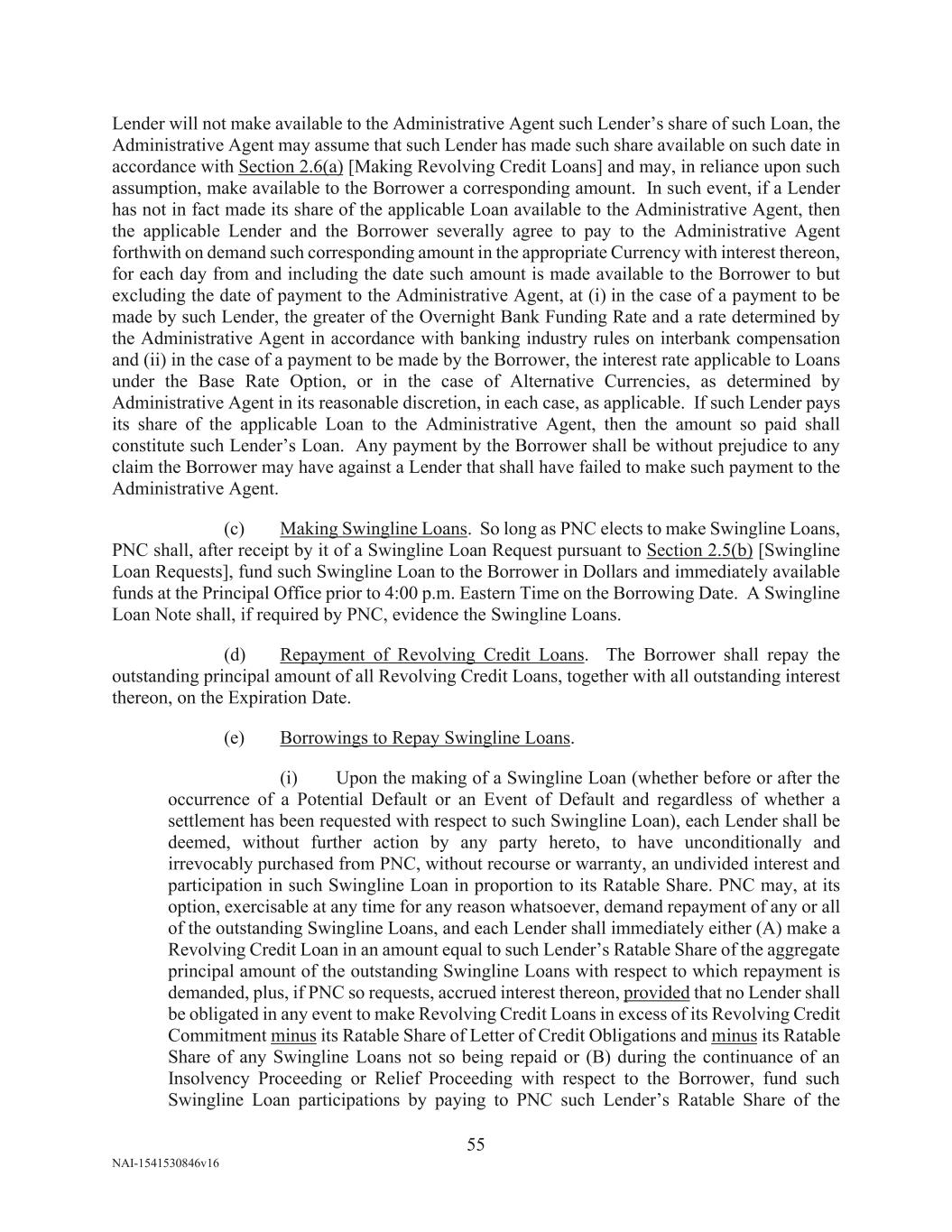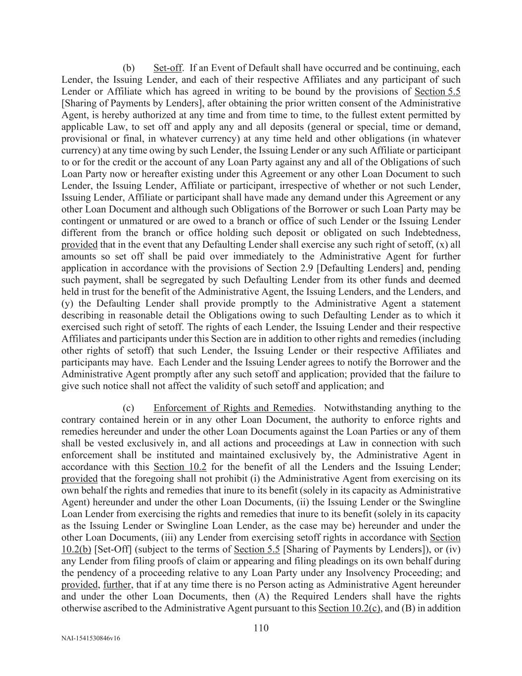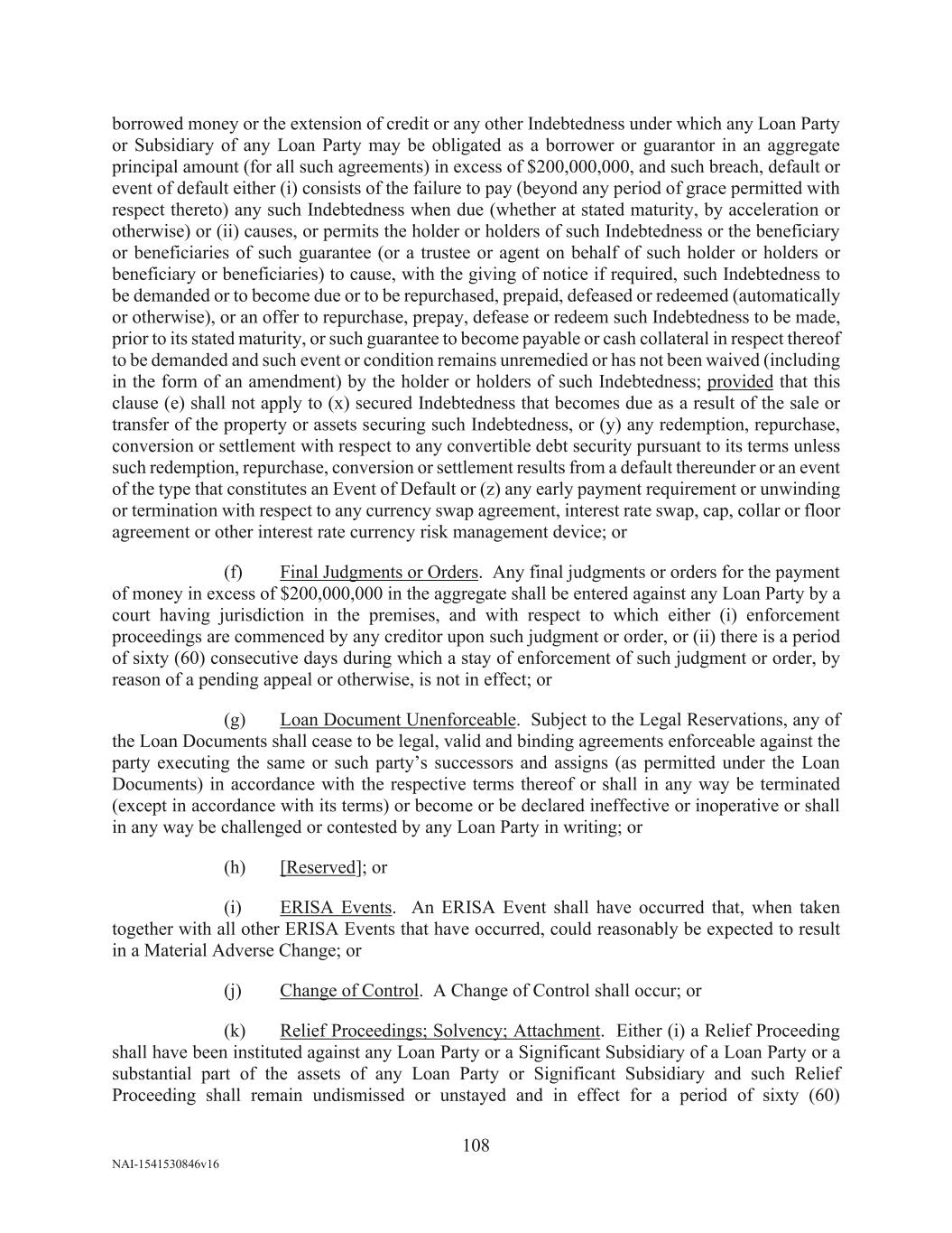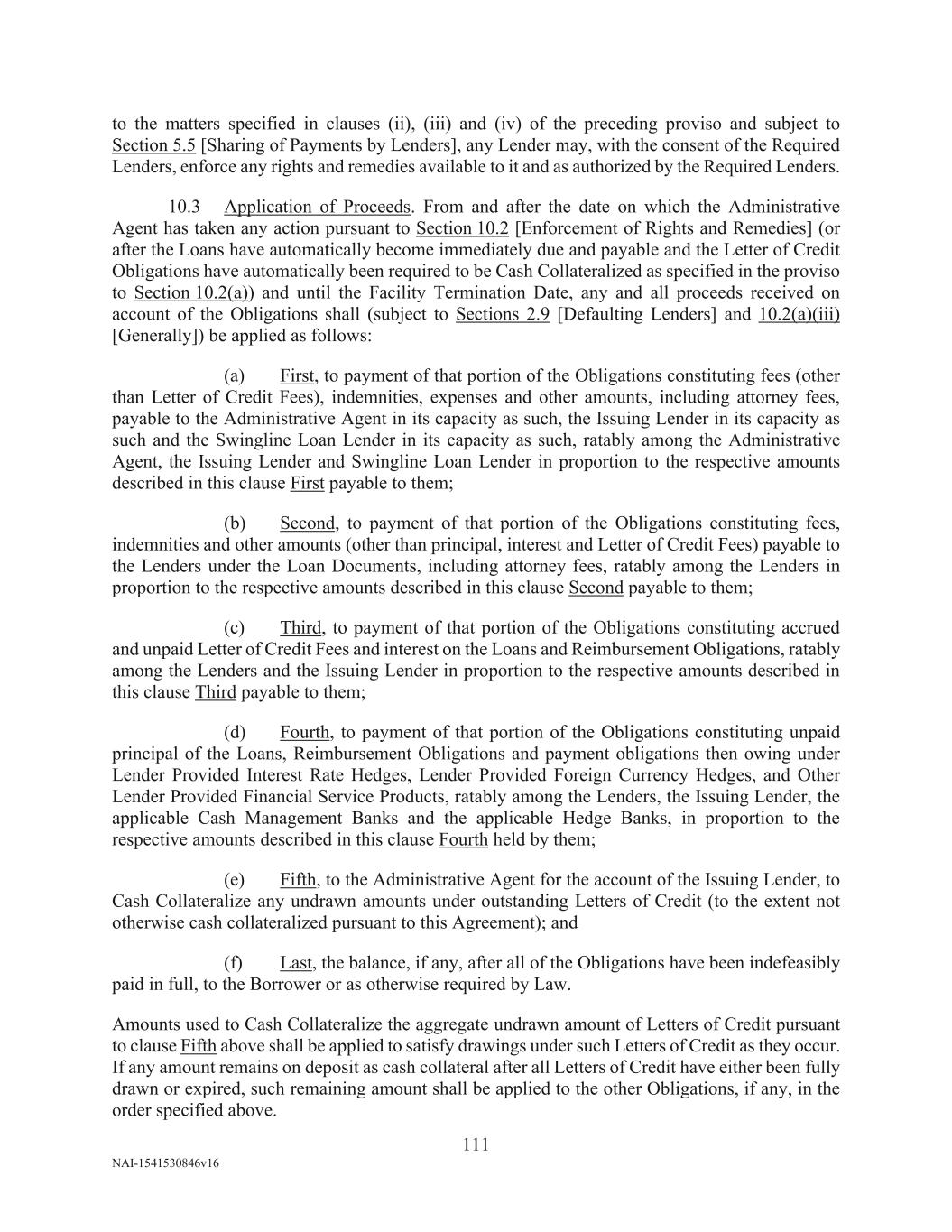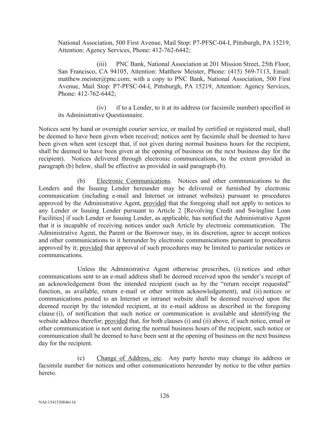 NAI-1541530846v16 TABLE OF CONTENTS (continued) Page ARTICLE 10 DEFAULT ........................................................................................................ 107 10.1 Events of Default ............................................................................................... 107 10.2 Consequences of Event of Default. .................................................................... 109 10.3 Application of Proceeds ..................................................................................... 111 ARTICLE 11 THE ADMINISTRATIVE AGENT ............................................................... 112 11.1 Appointment and Authority ............................................................................... 112 11.2 Rights as a Lender .............................................................................................. 112 11.3 Exculpatory Provisions. ..................................................................................... 112 11.4 Reliance by Administrative Agent ..................................................................... 114 11.5 Delegation of Duties .......................................................................................... 114 11.6 Resignation of Administrative Agent. ............................................................... 114 11.7 Non-Reliance on Administrative Agent and Other Lenders .............................. 115 11.8 No Other Duties, Etc. ......................................................................................... 116 11.9 Administrative Agent’s Fee ............................................................................... 116 11.10 Administrative Agent May File Proofs of Claim ............................................... 116 11.11 [Reserved]. ......................................................................................................... 117 11.12 No Reliance on Administrative Agent’s Customer Identification Program ...... 117 11.13 Lender Provided Interest Rate Hedges, Lender Provided Foreign Currency Hedges and Other Lender Provided Financial Service Products ....................... 117 11.14 Certain ERISA Matters. ..................................................................................... 117 11.15 Erroneous Payments........................................................................................... 118 ARTICLE 12 MISCELLANEOUS ........................................................................................ 121 12.1 Modifications, Amendments or Waivers ........................................................... 121 12.2 No Implied Waivers; Cumulative Remedies ..................................................... 123 12.3 Expenses; Indemnity; Damage Waiver. ............................................................. 123 12.4 Holidays ............................................................................................................. 125 12.5 Notices; Effectiveness; Electronic Communication. ......................................... 125 12.6 Severability ........................................................................................................ 127 12.7 Duration; Survival .............................................................................................. 127 12.8 Successors and Assigns...................................................................................... 128 12.9 Confidentiality. .................................................................................................. 133