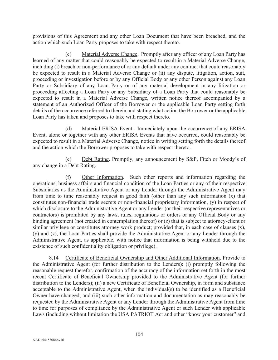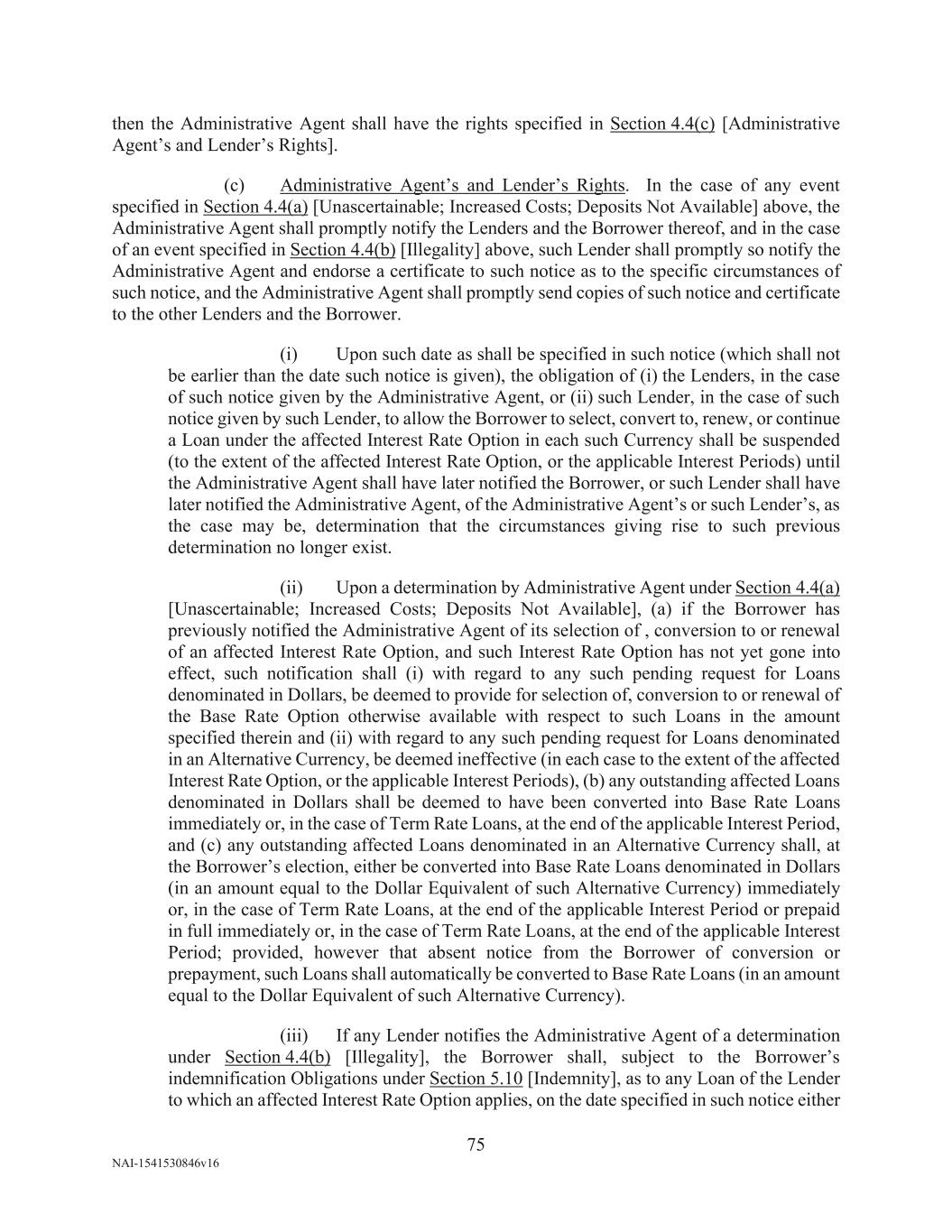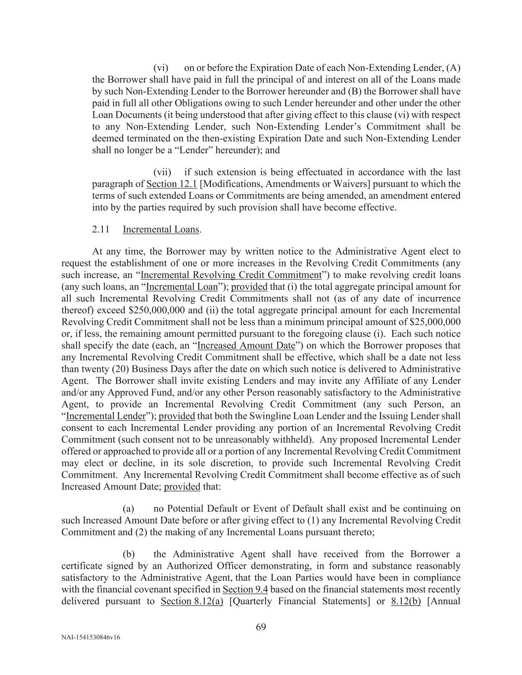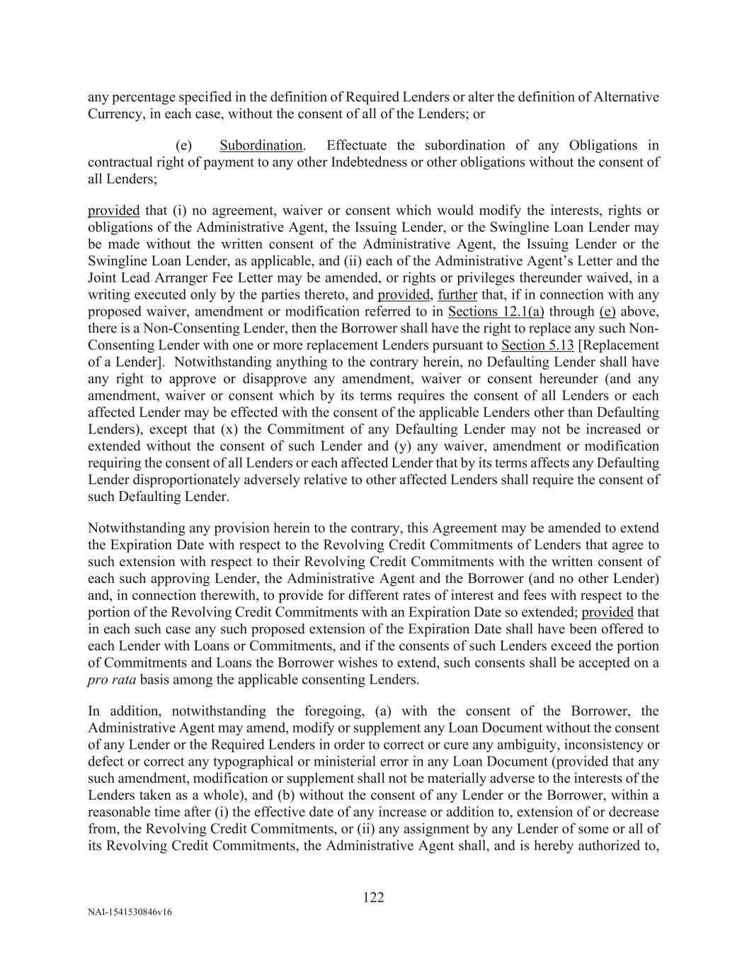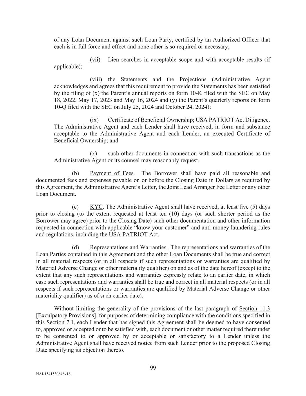 NAI-1541530846v16 TABLE OF CONTENTS (continued) Page ARTICLE 10 DEFAULT ........................................................................................................ 107 10.1 Events of Default ............................................................................................... 107 10.2 Consequences of Event of Default. .................................................................... 109 10.3 Application of Proceeds ..................................................................................... 111 ARTICLE 11 THE ADMINISTRATIVE AGENT ............................................................... 112 11.1 Appointment and Authority ............................................................................... 112 11.2 Rights as a Lender .............................................................................................. 112 11.3 Exculpatory Provisions. ..................................................................................... 112 11.4 Reliance by Administrative Agent ..................................................................... 114 11.5 Delegation of Duties .......................................................................................... 114 11.6 Resignation of Administrative Agent. ............................................................... 114 11.7 Non-Reliance on Administrative Agent and Other Lenders .............................. 115 11.8 No Other Duties, Etc. ......................................................................................... 116 11.9 Administrative Agent’s Fee ............................................................................... 116 11.10 Administrative Agent May File Proofs of Claim ............................................... 116 11.11 [Reserved]. ......................................................................................................... 117 11.12 No Reliance on Administrative Agent’s Customer Identification Program ...... 117 11.13 Lender Provided Interest Rate Hedges, Lender Provided Foreign Currency Hedges and Other Lender Provided Financial Service Products ....................... 117 11.14 Certain ERISA Matters. ..................................................................................... 117 11.15 Erroneous Payments........................................................................................... 118 ARTICLE 12 MISCELLANEOUS ........................................................................................ 121 12.1 Modifications, Amendments or Waivers ........................................................... 121 12.2 No Implied Waivers; Cumulative Remedies ..................................................... 123 12.3 Expenses; Indemnity; Damage Waiver. ............................................................. 123 12.4 Holidays ............................................................................................................. 125 12.5 Notices; Effectiveness; Electronic Communication. ......................................... 125 12.6 Severability ........................................................................................................ 127 12.7 Duration; Survival .............................................................................................. 127 12.8 Successors and Assigns...................................................................................... 128 12.9 Confidentiality. .................................................................................................. 133