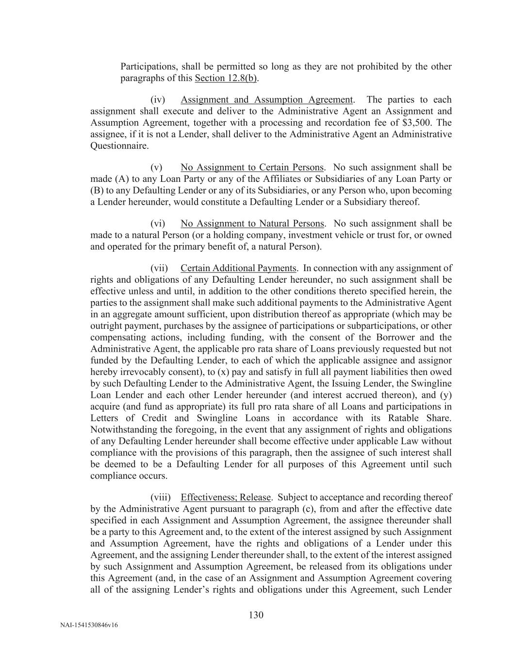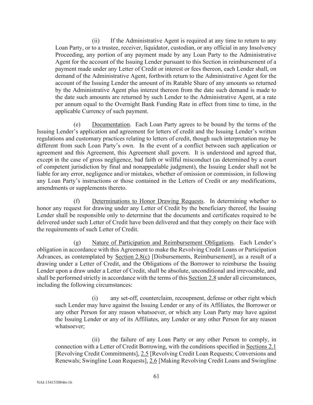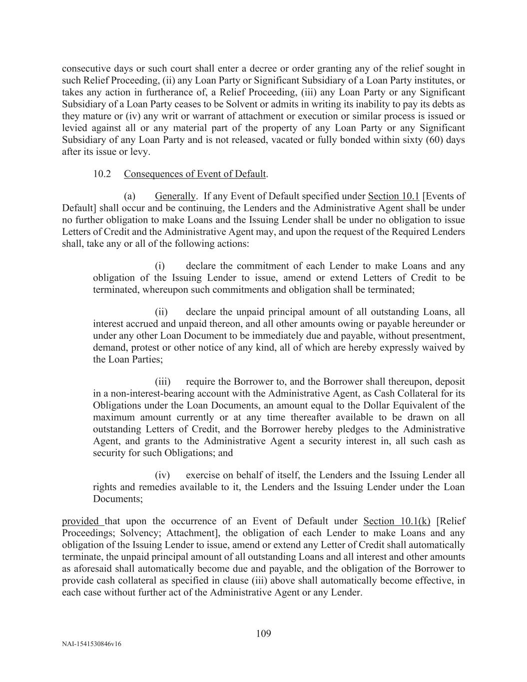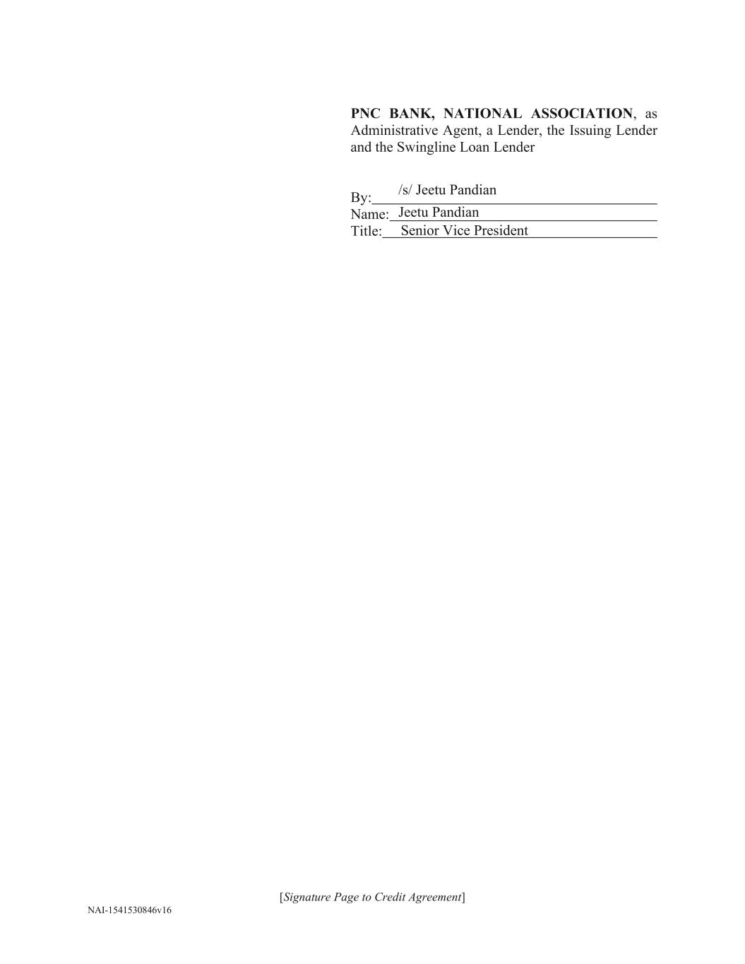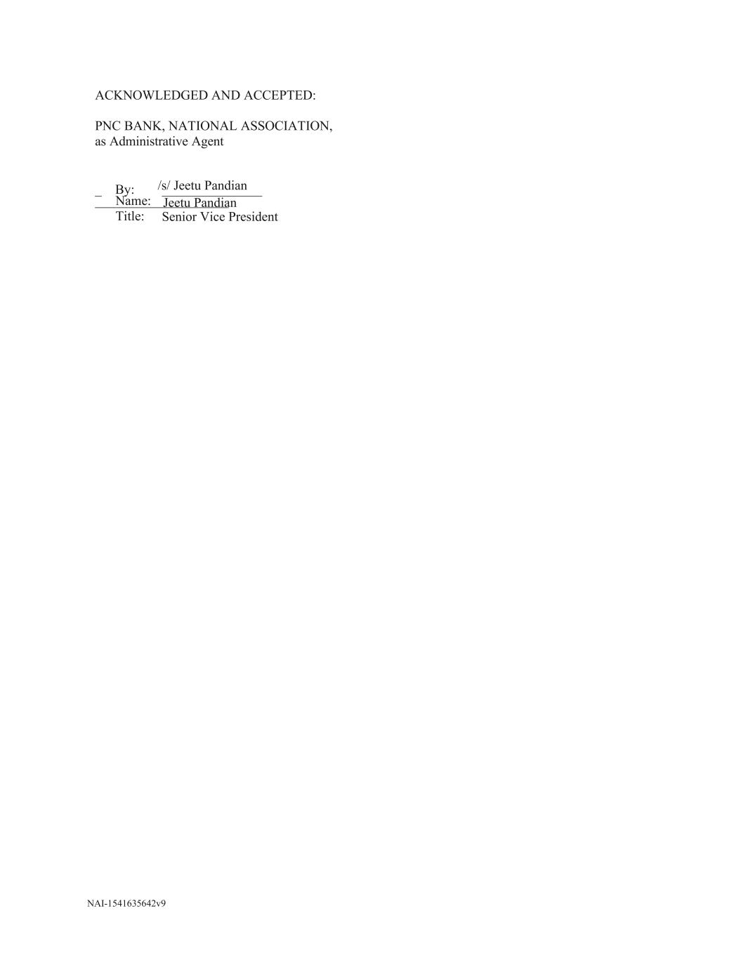 NAI-1541530846v16 TABLE OF CONTENTS (continued) Page ARTICLE 10 DEFAULT ........................................................................................................ 107 10.1 Events of Default ............................................................................................... 107 10.2 Consequences of Event of Default. .................................................................... 109 10.3 Application of Proceeds ..................................................................................... 111 ARTICLE 11 THE ADMINISTRATIVE AGENT ............................................................... 112 11.1 Appointment and Authority ............................................................................... 112 11.2 Rights as a Lender .............................................................................................. 112 11.3 Exculpatory Provisions. ..................................................................................... 112 11.4 Reliance by Administrative Agent ..................................................................... 114 11.5 Delegation of Duties .......................................................................................... 114 11.6 Resignation of Administrative Agent. ............................................................... 114 11.7 Non-Reliance on Administrative Agent and Other Lenders .............................. 115 11.8 No Other Duties, Etc. ......................................................................................... 116 11.9 Administrative Agent’s Fee ............................................................................... 116 11.10 Administrative Agent May File Proofs of Claim ............................................... 116 11.11 [Reserved]. ......................................................................................................... 117 11.12 No Reliance on Administrative Agent’s Customer Identification Program ...... 117 11.13 Lender Provided Interest Rate Hedges, Lender Provided Foreign Currency Hedges and Other Lender Provided Financial Service Products ....................... 117 11.14 Certain ERISA Matters. ..................................................................................... 117 11.15 Erroneous Payments........................................................................................... 118 ARTICLE 12 MISCELLANEOUS ........................................................................................ 121 12.1 Modifications, Amendments or Waivers ........................................................... 121 12.2 No Implied Waivers; Cumulative Remedies ..................................................... 123 12.3 Expenses; Indemnity; Damage Waiver. ............................................................. 123 12.4 Holidays ............................................................................................................. 125 12.5 Notices; Effectiveness; Electronic Communication. ......................................... 125 12.6 Severability ........................................................................................................ 127 12.7 Duration; Survival .............................................................................................. 127 12.8 Successors and Assigns...................................................................................... 128 12.9 Confidentiality. .................................................................................................. 133
