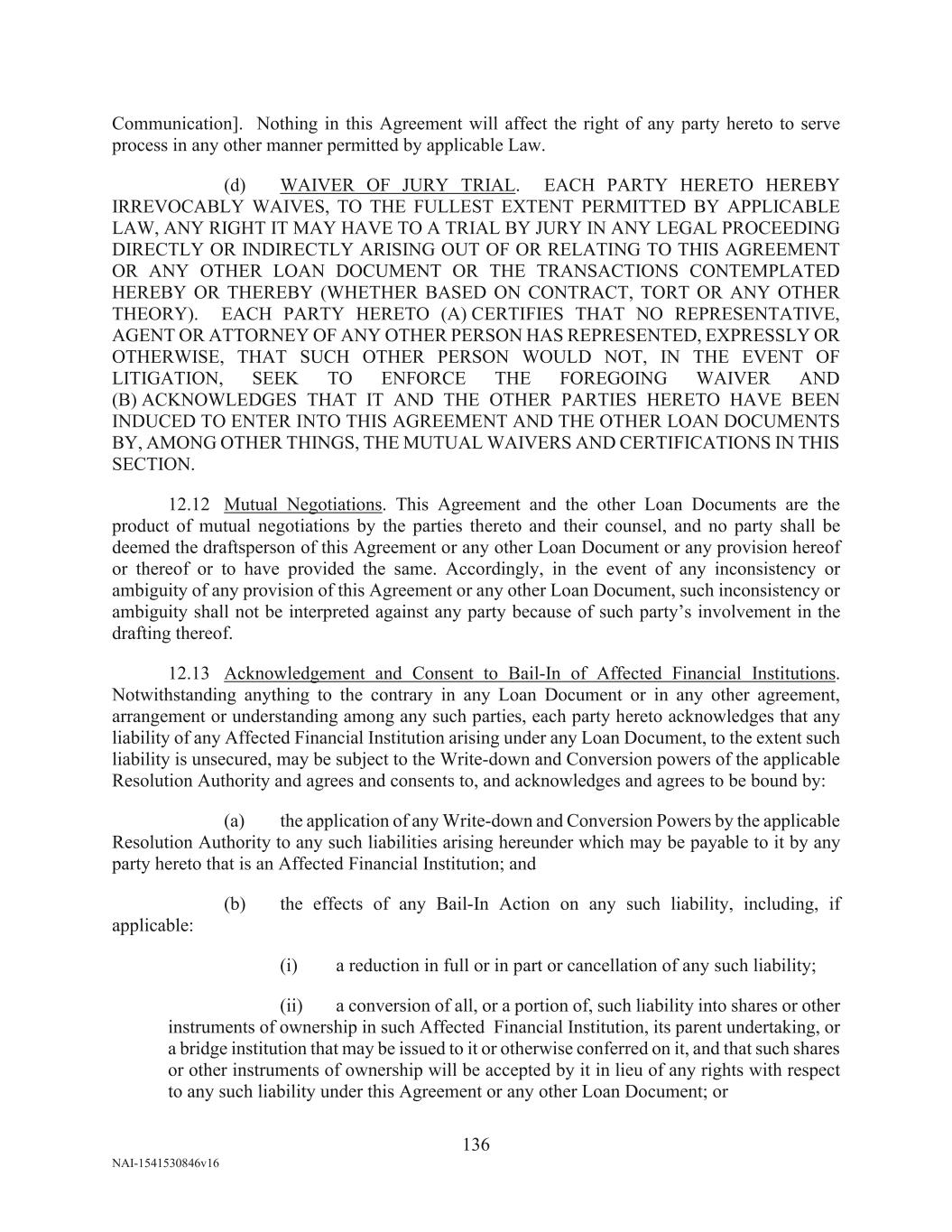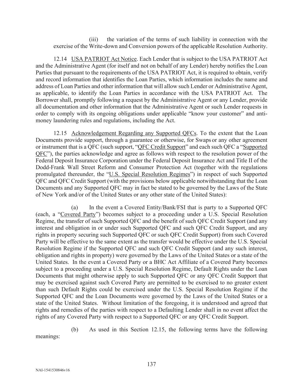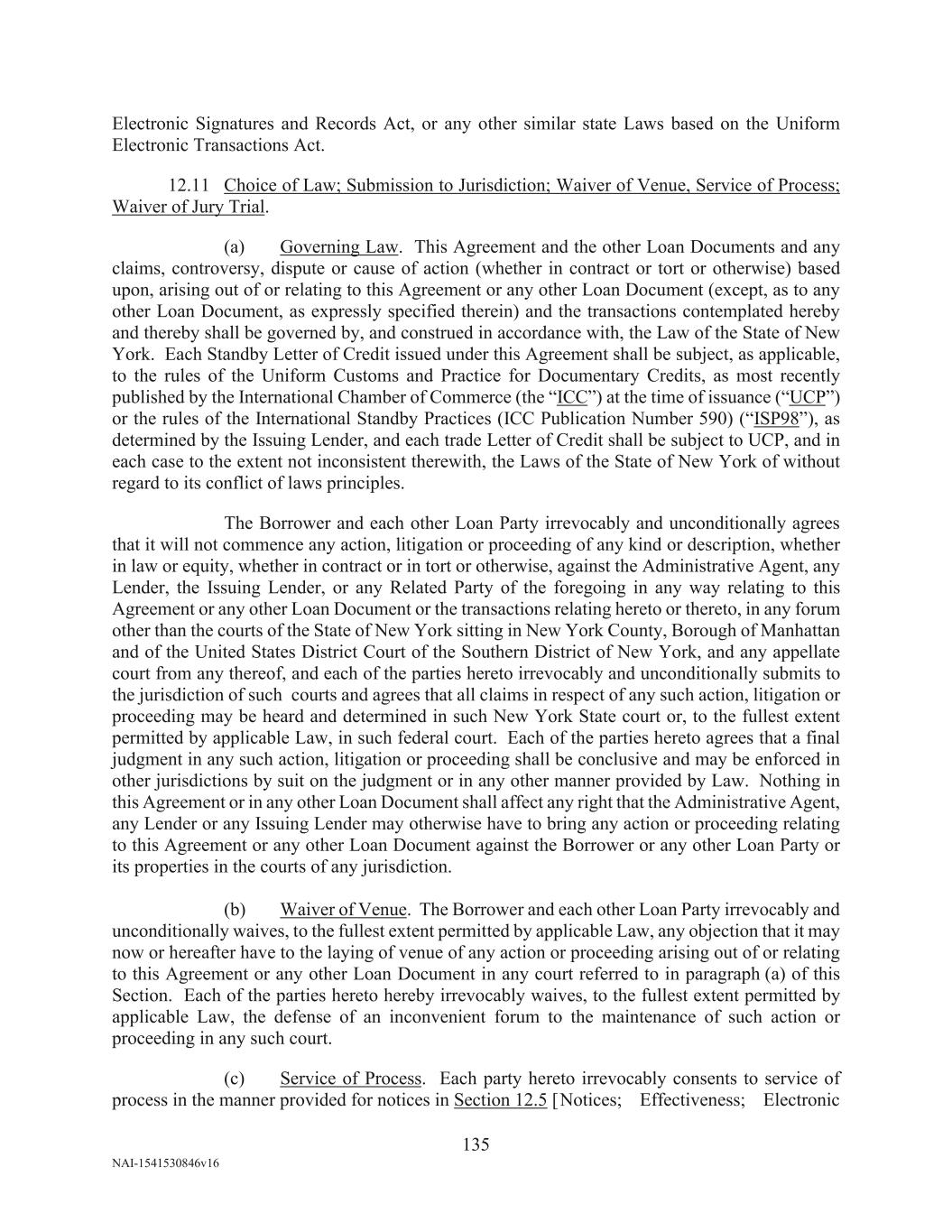 NAI-1541530846v16 TABLE OF CONTENTS (continued) Page 12.10 Counterparts; Integration; Effectiveness; Electronic Execution. ....................... 134 12.11 Choice of Law; Submission to Jurisdiction; Waiver of Venue, Service of Process; Waiver of Jury Trial. ........................................................................... 135 12.12 Mutual Negotiations........................................................................................... 136 12.13 Acknowledgement and Consent to Bail-In of Affected Financial Institutions.......................................................................................................... 136 12.14 USA PATRIOT Act Notice ............................................................................... 137 12.15 Acknowledgement Regarding any Supported QFCs. ........................................ 137 12.16 [Reserved] .......................................................................................................... 138 12.17 Judgment Currency ............................................................................................ 138