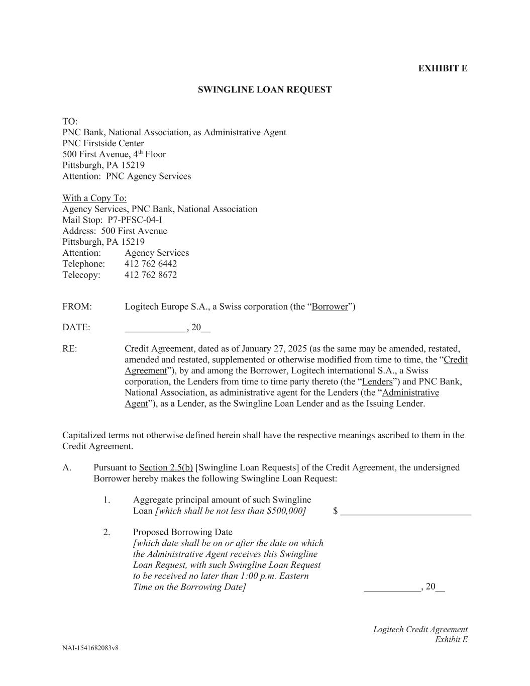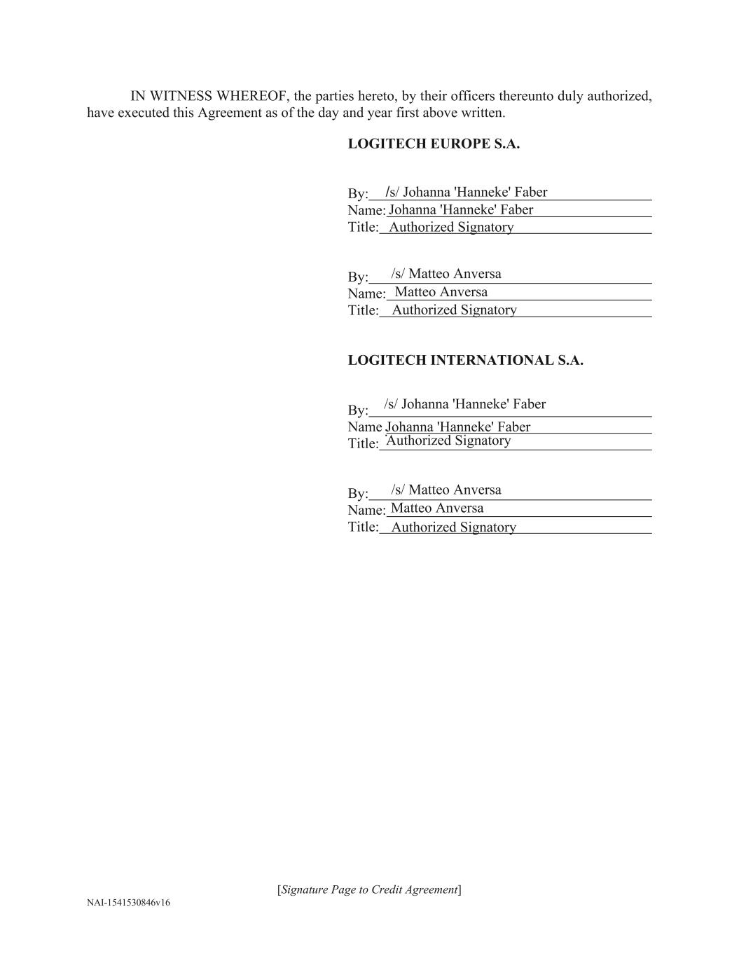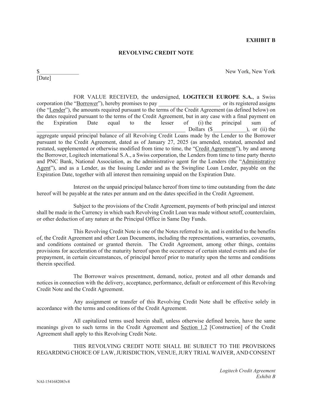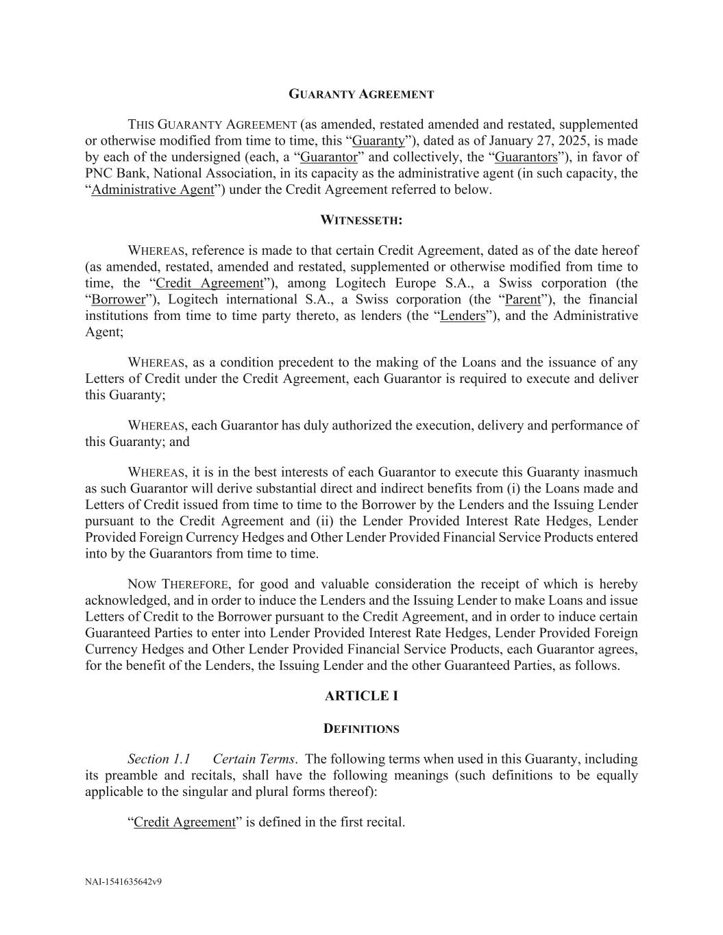 NAI-1541530846v16 CREDIT AGREEMENT THIS CREDIT AGREEMENT is dated as of January 27, 2025, and is made by and among LOGITECH EUROPE S.A., a Swiss corporation (the “Borrower”), LOGITECH INTERNATIONAL S.A., a Swiss corporation (the “Parent”), PNC BANK, NATIONAL ASSOCIATION, in its capacity as the Administrative Agent (as hereinafter defined), a Lender (as hereinafter defined), Swingline Loan Lender (as hereinafter defined) and Issuing Lender (as hereinafter defined), and the other Lenders party hereto. The Borrower has requested the Lenders to provide a revolving credit facility to the Borrower in an aggregate principal amount not to exceed $750,000,000, including therein a Swingline Loan (as hereinafter defined) subfacility and a Letter of Credit (as hereinafter defined) subfacility. In consideration of their mutual covenants and agreements hereinafter specified and intending to be legally bound hereby, the parties hereto covenant and agree as follows: ARTICLE 1 CERTAIN DEFINITIONS 1.1 Certain Definitions. In addition to words and terms defined elsewhere in this Agreement, the following words and terms shall have the following meanings, respectively, unless the context hereof clearly requires otherwise: “Acquisition” means any transaction, or any series of related transactions, by which any Loan Party or any of its Subsidiaries (a) acquires any going business or all or substantially all of the assets of any firm, corporation or limited liability company, or line of business or division thereof, whether through purchase of assets, merger or otherwise or (b) directly or indirectly acquires (in one transaction or as the most recent transaction in a series of transactions) at least a majority (in number of votes) of the securities of a corporation which have ordinary voting power for the election of directors (other than securities having such power only by reason of the happening of a contingency) or a majority (by percentage or voting power) of the outstanding ownership interests of a partnership or limited liability company. “Additional Commitment Lender” means as is specified in Section 2.10(d) [Additional Commitment Lender]. “Adjusted Leverage Ratio Period” means as is specified in Section 9.4 [Maximum Consolidated Net Leverage Ratio]. “Administrative Agent” means PNC Bank, National Association, in its capacity as administrative agent hereunder or any successor administrative agent. “Administrative Agent’s Fee” means as is specified in Section 11.9 [Administrative Agent’s Fee]. “Administrative Agent’s Letter” means as is specified in Section 11.9 [Administrative Agent’s Fee].