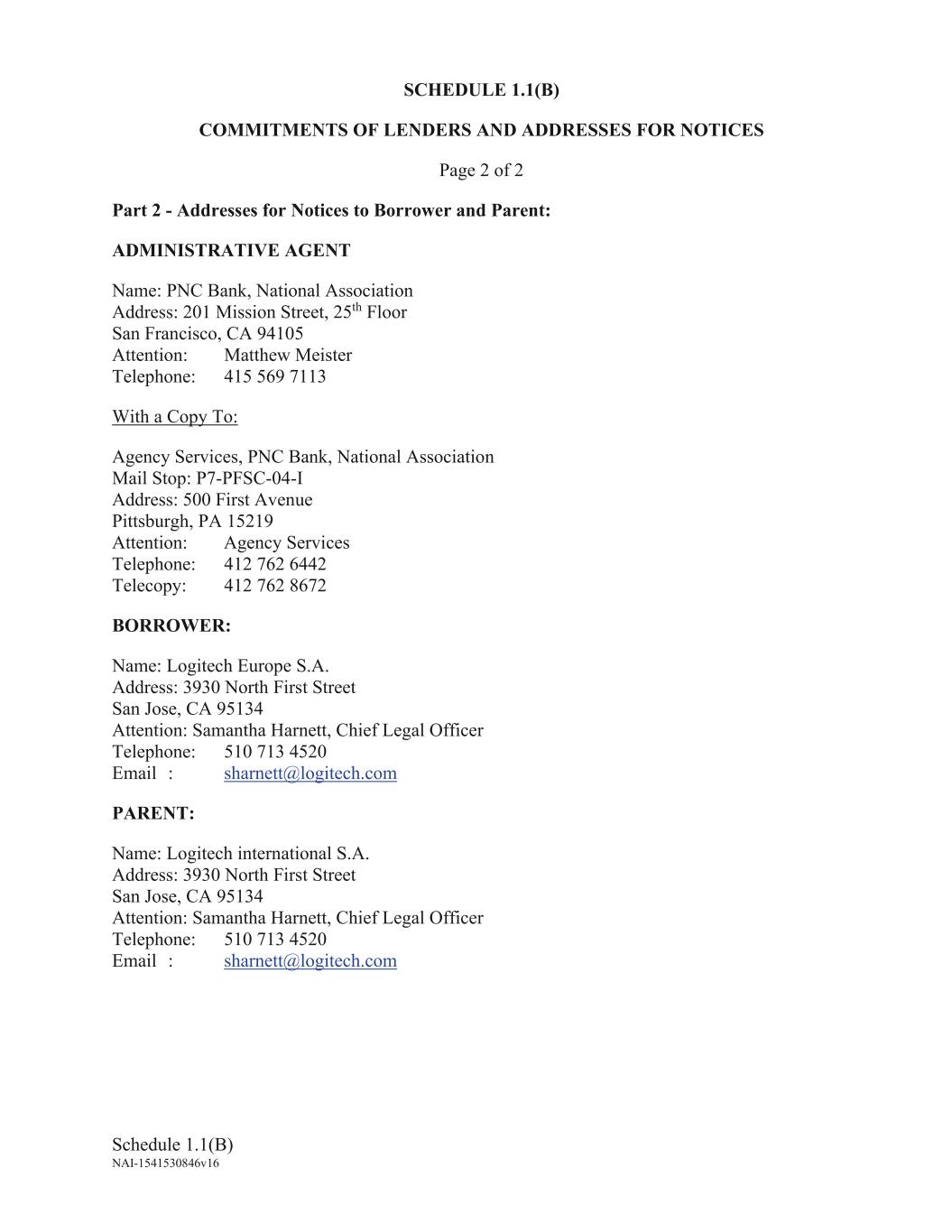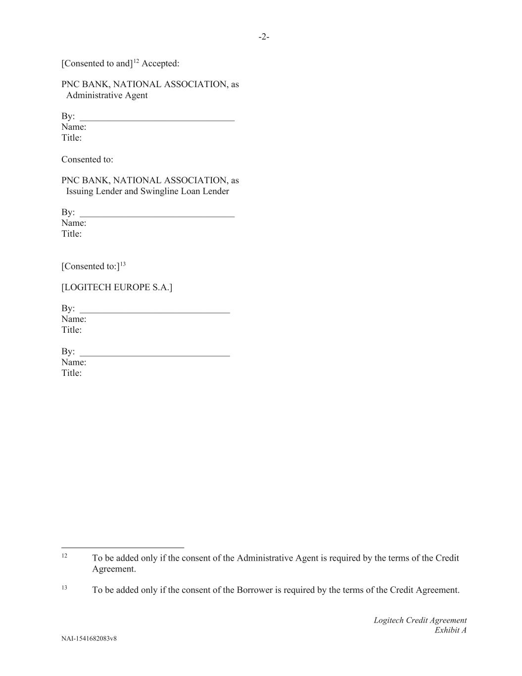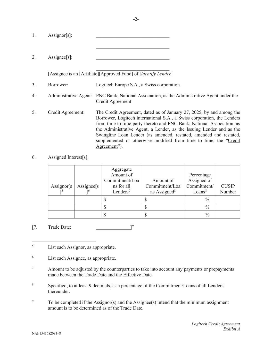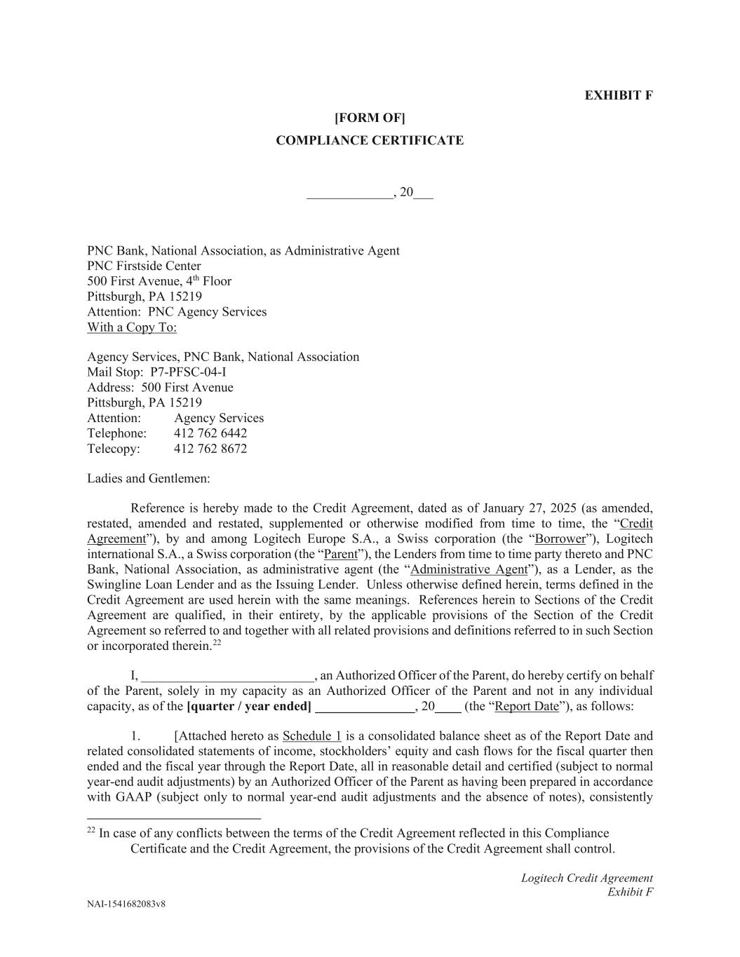 NAI-1541530846v16 CREDIT AGREEMENT THIS CREDIT AGREEMENT is dated as of January 27, 2025, and is made by and among LOGITECH EUROPE S.A., a Swiss corporation (the “Borrower”), LOGITECH INTERNATIONAL S.A., a Swiss corporation (the “Parent”), PNC BANK, NATIONAL ASSOCIATION, in its capacity as the Administrative Agent (as hereinafter defined), a Lender (as hereinafter defined), Swingline Loan Lender (as hereinafter defined) and Issuing Lender (as hereinafter defined), and the other Lenders party hereto. The Borrower has requested the Lenders to provide a revolving credit facility to the Borrower in an aggregate principal amount not to exceed $750,000,000, including therein a Swingline Loan (as hereinafter defined) subfacility and a Letter of Credit (as hereinafter defined) subfacility. In consideration of their mutual covenants and agreements hereinafter specified and intending to be legally bound hereby, the parties hereto covenant and agree as follows: ARTICLE 1 CERTAIN DEFINITIONS 1.1 Certain Definitions. In addition to words and terms defined elsewhere in this Agreement, the following words and terms shall have the following meanings, respectively, unless the context hereof clearly requires otherwise: “Acquisition” means any transaction, or any series of related transactions, by which any Loan Party or any of its Subsidiaries (a) acquires any going business or all or substantially all of the assets of any firm, corporation or limited liability company, or line of business or division thereof, whether through purchase of assets, merger or otherwise or (b) directly or indirectly acquires (in one transaction or as the most recent transaction in a series of transactions) at least a majority (in number of votes) of the securities of a corporation which have ordinary voting power for the election of directors (other than securities having such power only by reason of the happening of a contingency) or a majority (by percentage or voting power) of the outstanding ownership interests of a partnership or limited liability company. “Additional Commitment Lender” means as is specified in Section 2.10(d) [Additional Commitment Lender]. “Adjusted Leverage Ratio Period” means as is specified in Section 9.4 [Maximum Consolidated Net Leverage Ratio]. “Administrative Agent” means PNC Bank, National Association, in its capacity as administrative agent hereunder or any successor administrative agent. “Administrative Agent’s Fee” means as is specified in Section 11.9 [Administrative Agent’s Fee]. “Administrative Agent’s Letter” means as is specified in Section 11.9 [Administrative Agent’s Fee].