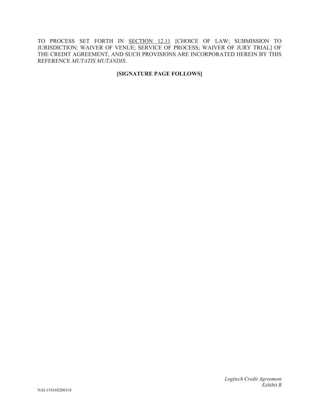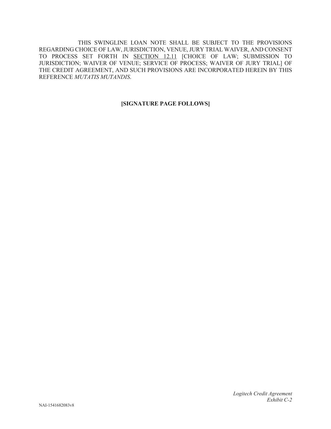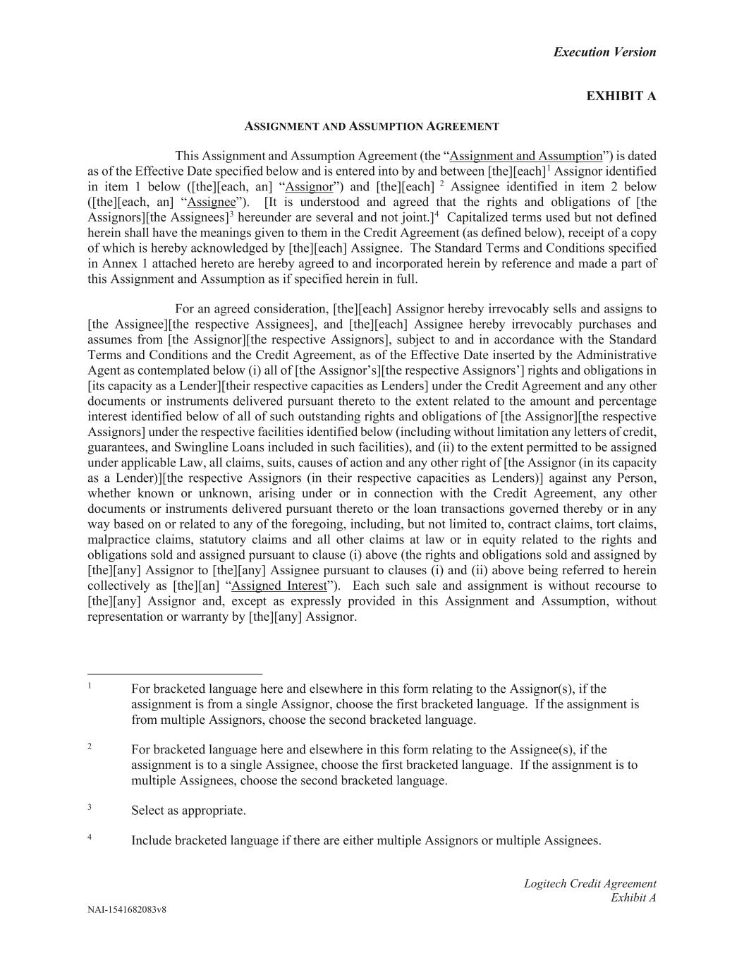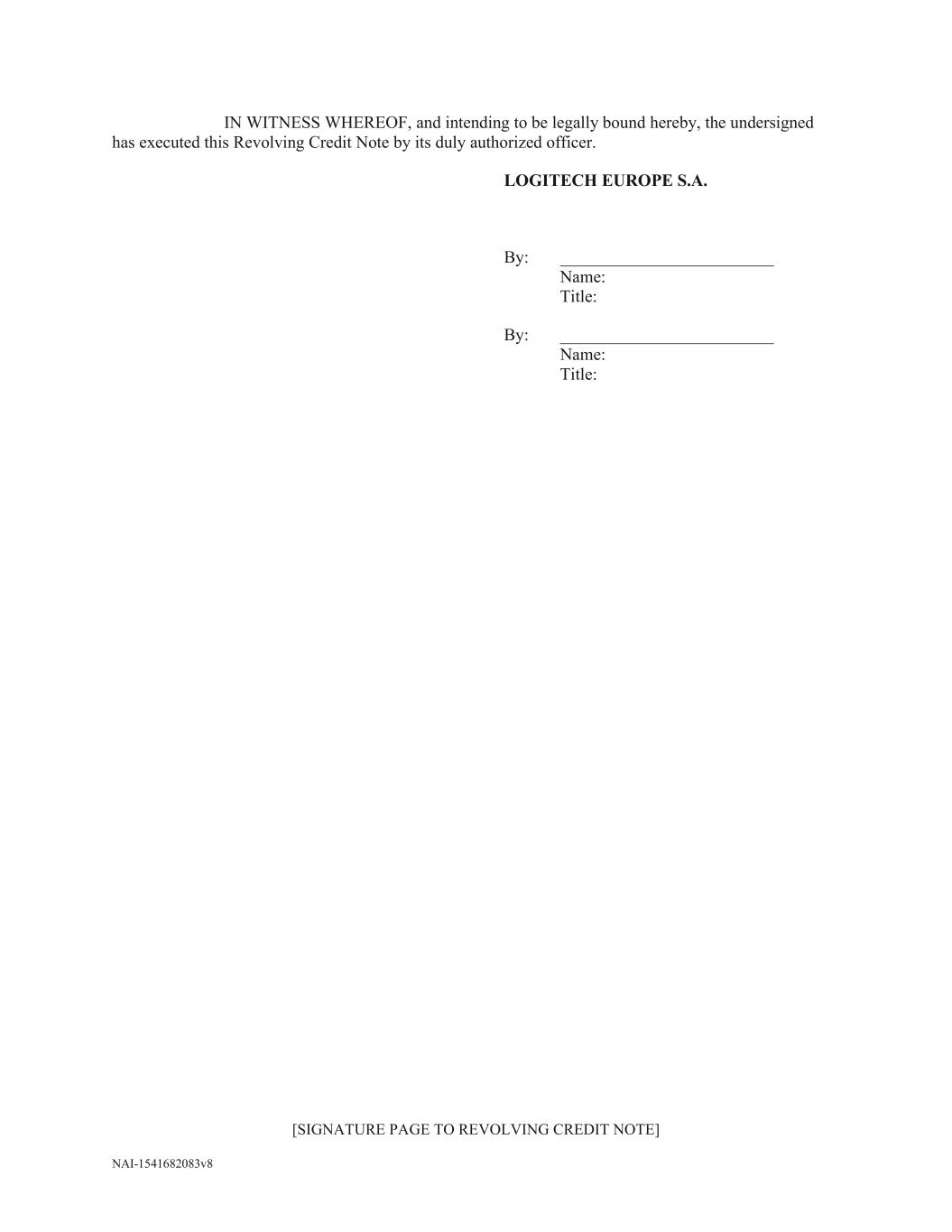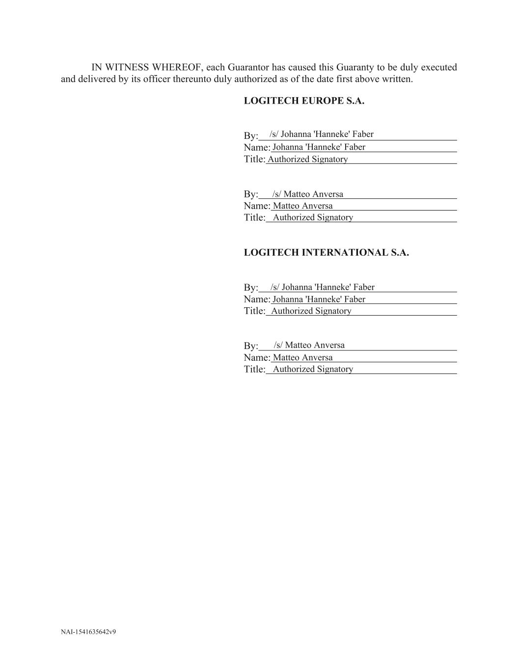 NAI-1541530846v16 CREDIT AGREEMENT THIS CREDIT AGREEMENT is dated as of January 27, 2025, and is made by and among LOGITECH EUROPE S.A., a Swiss corporation (the “Borrower”), LOGITECH INTERNATIONAL S.A., a Swiss corporation (the “Parent”), PNC BANK, NATIONAL ASSOCIATION, in its capacity as the Administrative Agent (as hereinafter defined), a Lender (as hereinafter defined), Swingline Loan Lender (as hereinafter defined) and Issuing Lender (as hereinafter defined), and the other Lenders party hereto. The Borrower has requested the Lenders to provide a revolving credit facility to the Borrower in an aggregate principal amount not to exceed $750,000,000, including therein a Swingline Loan (as hereinafter defined) subfacility and a Letter of Credit (as hereinafter defined) subfacility. In consideration of their mutual covenants and agreements hereinafter specified and intending to be legally bound hereby, the parties hereto covenant and agree as follows: ARTICLE 1 CERTAIN DEFINITIONS 1.1 Certain Definitions. In addition to words and terms defined elsewhere in this Agreement, the following words and terms shall have the following meanings, respectively, unless the context hereof clearly requires otherwise: “Acquisition” means any transaction, or any series of related transactions, by which any Loan Party or any of its Subsidiaries (a) acquires any going business or all or substantially all of the assets of any firm, corporation or limited liability company, or line of business or division thereof, whether through purchase of assets, merger or otherwise or (b) directly or indirectly acquires (in one transaction or as the most recent transaction in a series of transactions) at least a majority (in number of votes) of the securities of a corporation which have ordinary voting power for the election of directors (other than securities having such power only by reason of the happening of a contingency) or a majority (by percentage or voting power) of the outstanding ownership interests of a partnership or limited liability company. “Additional Commitment Lender” means as is specified in Section 2.10(d) [Additional Commitment Lender]. “Adjusted Leverage Ratio Period” means as is specified in Section 9.4 [Maximum Consolidated Net Leverage Ratio]. “Administrative Agent” means PNC Bank, National Association, in its capacity as administrative agent hereunder or any successor administrative agent. “Administrative Agent’s Fee” means as is specified in Section 11.9 [Administrative Agent’s Fee]. “Administrative Agent’s Letter” means as is specified in Section 11.9 [Administrative Agent’s Fee].