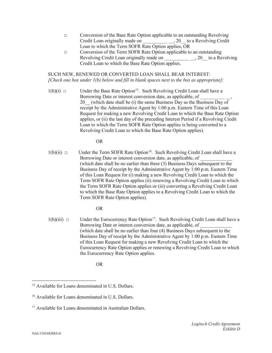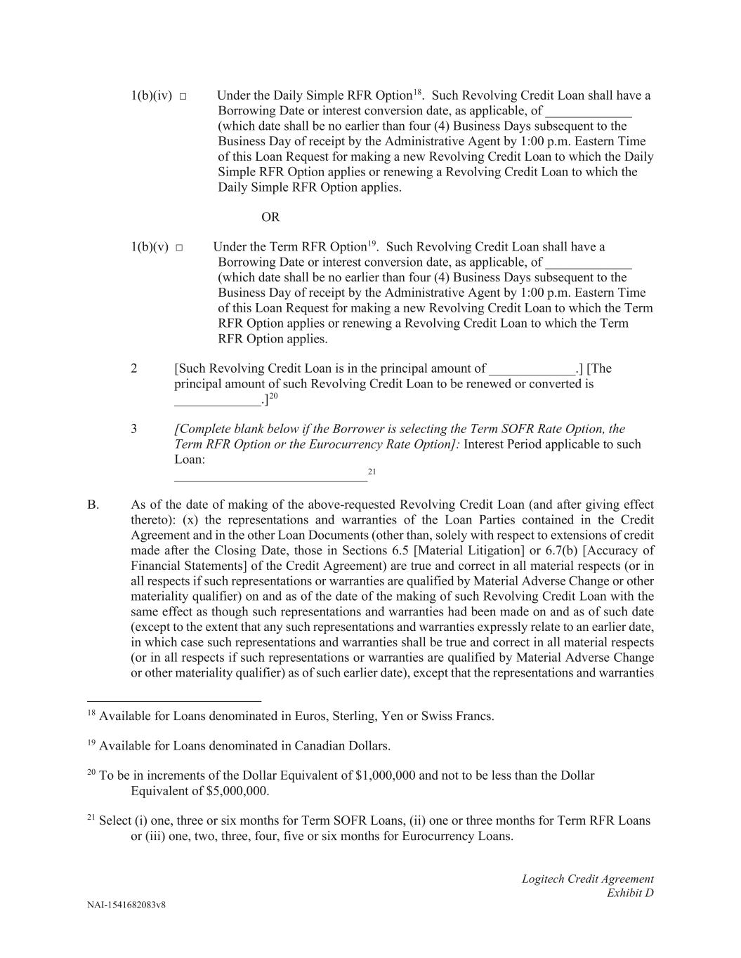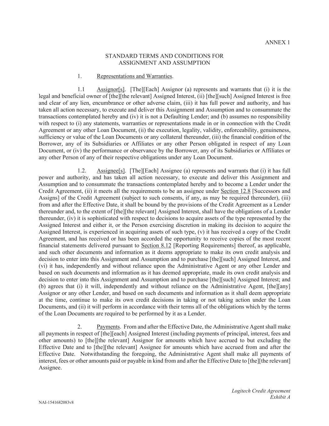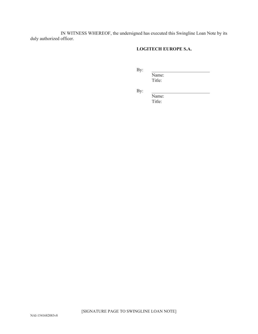 NAI-1541530846v16 CREDIT AGREEMENT THIS CREDIT AGREEMENT is dated as of January 27, 2025, and is made by and among LOGITECH EUROPE S.A., a Swiss corporation (the “Borrower”), LOGITECH INTERNATIONAL S.A., a Swiss corporation (the “Parent”), PNC BANK, NATIONAL ASSOCIATION, in its capacity as the Administrative Agent (as hereinafter defined), a Lender (as hereinafter defined), Swingline Loan Lender (as hereinafter defined) and Issuing Lender (as hereinafter defined), and the other Lenders party hereto. The Borrower has requested the Lenders to provide a revolving credit facility to the Borrower in an aggregate principal amount not to exceed $750,000,000, including therein a Swingline Loan (as hereinafter defined) subfacility and a Letter of Credit (as hereinafter defined) subfacility. In consideration of their mutual covenants and agreements hereinafter specified and intending to be legally bound hereby, the parties hereto covenant and agree as follows: ARTICLE 1 CERTAIN DEFINITIONS 1.1 Certain Definitions. In addition to words and terms defined elsewhere in this Agreement, the following words and terms shall have the following meanings, respectively, unless the context hereof clearly requires otherwise: “Acquisition” means any transaction, or any series of related transactions, by which any Loan Party or any of its Subsidiaries (a) acquires any going business or all or substantially all of the assets of any firm, corporation or limited liability company, or line of business or division thereof, whether through purchase of assets, merger or otherwise or (b) directly or indirectly acquires (in one transaction or as the most recent transaction in a series of transactions) at least a majority (in number of votes) of the securities of a corporation which have ordinary voting power for the election of directors (other than securities having such power only by reason of the happening of a contingency) or a majority (by percentage or voting power) of the outstanding ownership interests of a partnership or limited liability company. “Additional Commitment Lender” means as is specified in Section 2.10(d) [Additional Commitment Lender]. “Adjusted Leverage Ratio Period” means as is specified in Section 9.4 [Maximum Consolidated Net Leverage Ratio]. “Administrative Agent” means PNC Bank, National Association, in its capacity as administrative agent hereunder or any successor administrative agent. “Administrative Agent’s Fee” means as is specified in Section 11.9 [Administrative Agent’s Fee]. “Administrative Agent’s Letter” means as is specified in Section 11.9 [Administrative Agent’s Fee].
