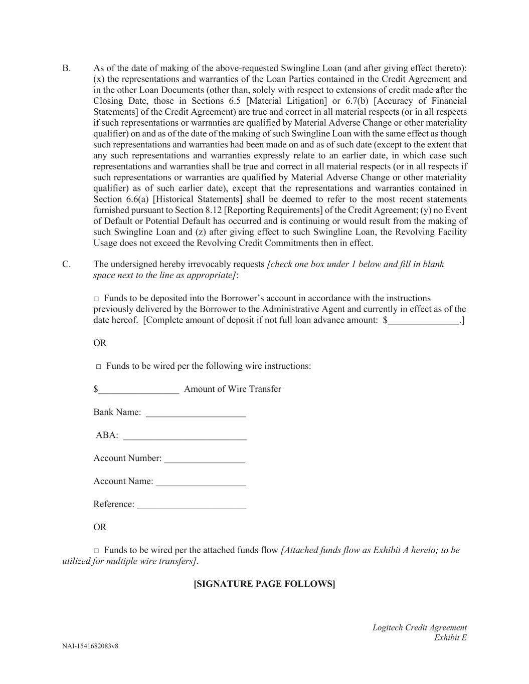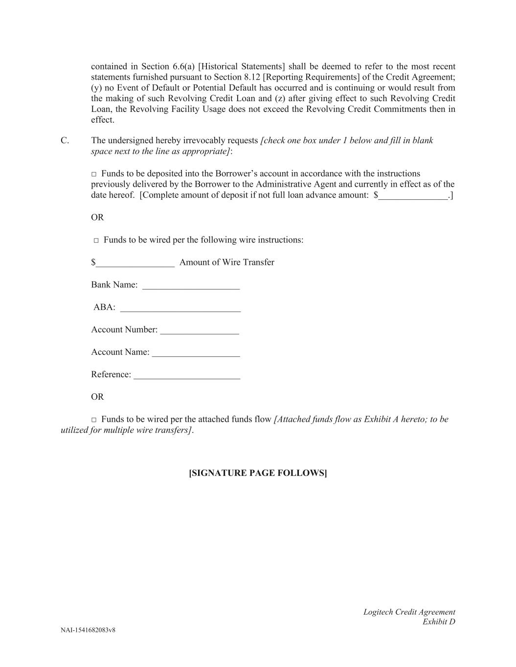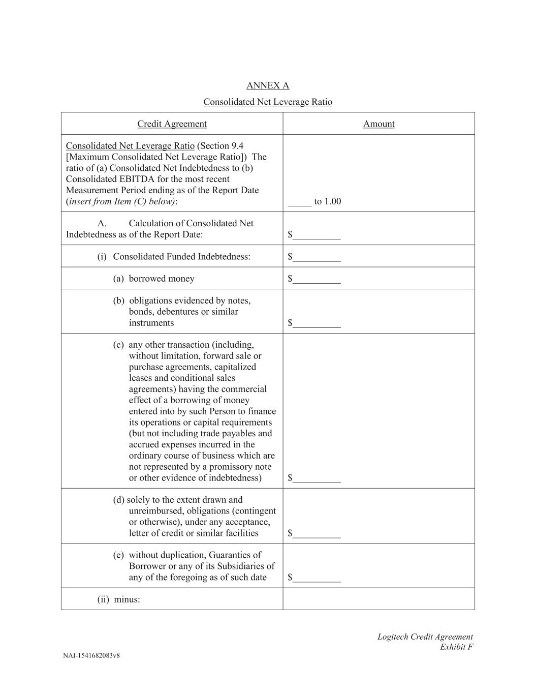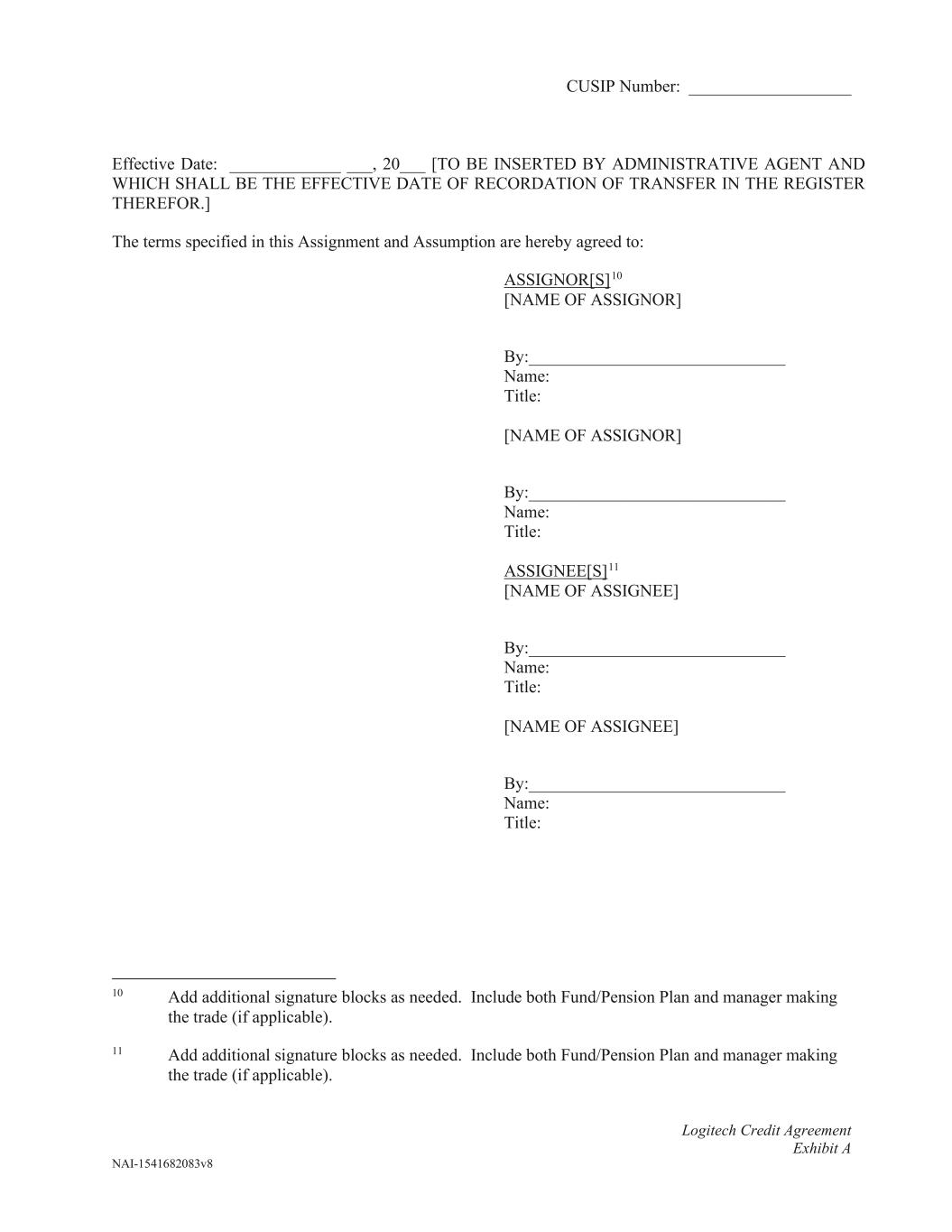 NAI-1541530846v16 CREDIT AGREEMENT THIS CREDIT AGREEMENT is dated as of January 27, 2025, and is made by and among LOGITECH EUROPE S.A., a Swiss corporation (the “Borrower”), LOGITECH INTERNATIONAL S.A., a Swiss corporation (the “Parent”), PNC BANK, NATIONAL ASSOCIATION, in its capacity as the Administrative Agent (as hereinafter defined), a Lender (as hereinafter defined), Swingline Loan Lender (as hereinafter defined) and Issuing Lender (as hereinafter defined), and the other Lenders party hereto. The Borrower has requested the Lenders to provide a revolving credit facility to the Borrower in an aggregate principal amount not to exceed $750,000,000, including therein a Swingline Loan (as hereinafter defined) subfacility and a Letter of Credit (as hereinafter defined) subfacility. In consideration of their mutual covenants and agreements hereinafter specified and intending to be legally bound hereby, the parties hereto covenant and agree as follows: ARTICLE 1 CERTAIN DEFINITIONS 1.1 Certain Definitions. In addition to words and terms defined elsewhere in this Agreement, the following words and terms shall have the following meanings, respectively, unless the context hereof clearly requires otherwise: “Acquisition” means any transaction, or any series of related transactions, by which any Loan Party or any of its Subsidiaries (a) acquires any going business or all or substantially all of the assets of any firm, corporation or limited liability company, or line of business or division thereof, whether through purchase of assets, merger or otherwise or (b) directly or indirectly acquires (in one transaction or as the most recent transaction in a series of transactions) at least a majority (in number of votes) of the securities of a corporation which have ordinary voting power for the election of directors (other than securities having such power only by reason of the happening of a contingency) or a majority (by percentage or voting power) of the outstanding ownership interests of a partnership or limited liability company. “Additional Commitment Lender” means as is specified in Section 2.10(d) [Additional Commitment Lender]. “Adjusted Leverage Ratio Period” means as is specified in Section 9.4 [Maximum Consolidated Net Leverage Ratio]. “Administrative Agent” means PNC Bank, National Association, in its capacity as administrative agent hereunder or any successor administrative agent. “Administrative Agent’s Fee” means as is specified in Section 11.9 [Administrative Agent’s Fee]. “Administrative Agent’s Letter” means as is specified in Section 11.9 [Administrative Agent’s Fee].