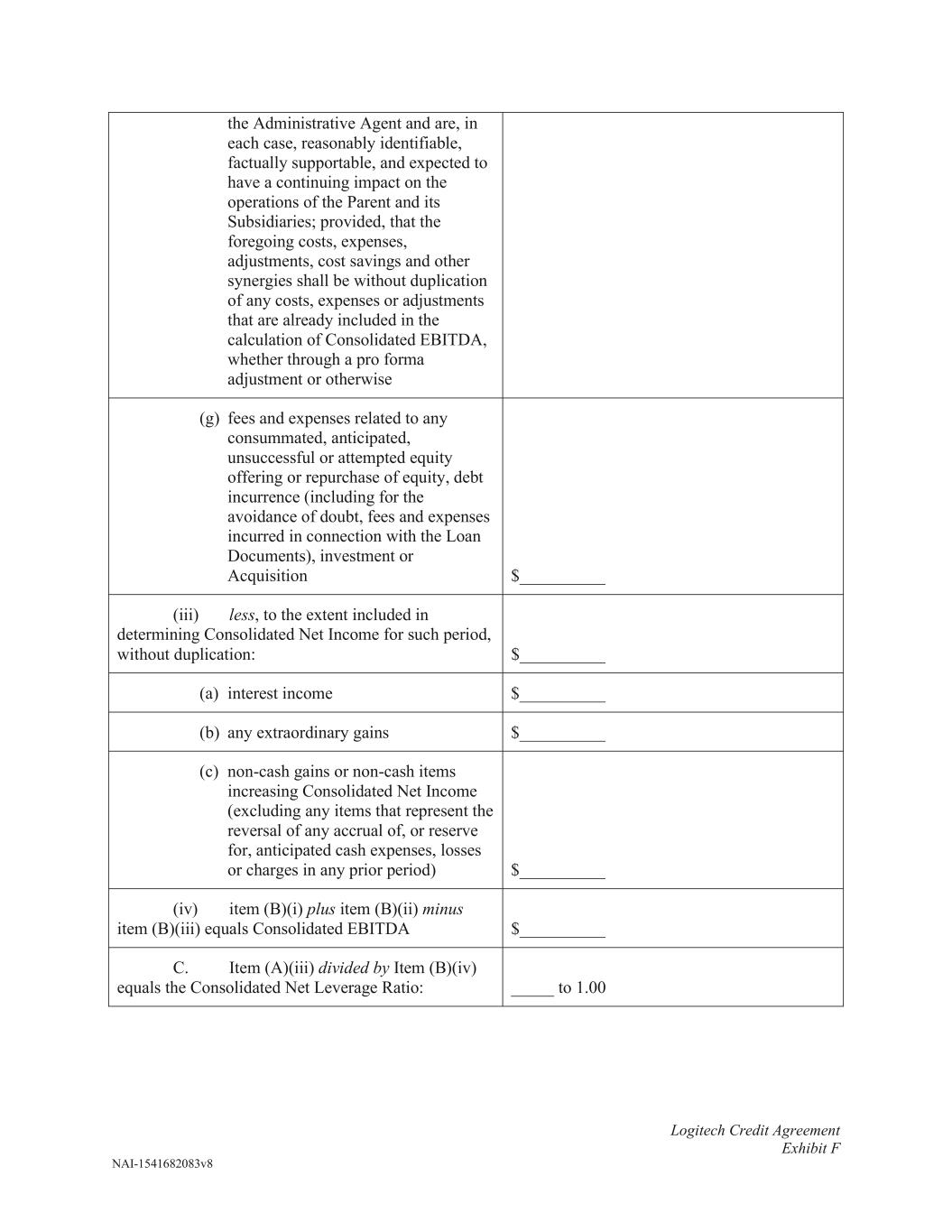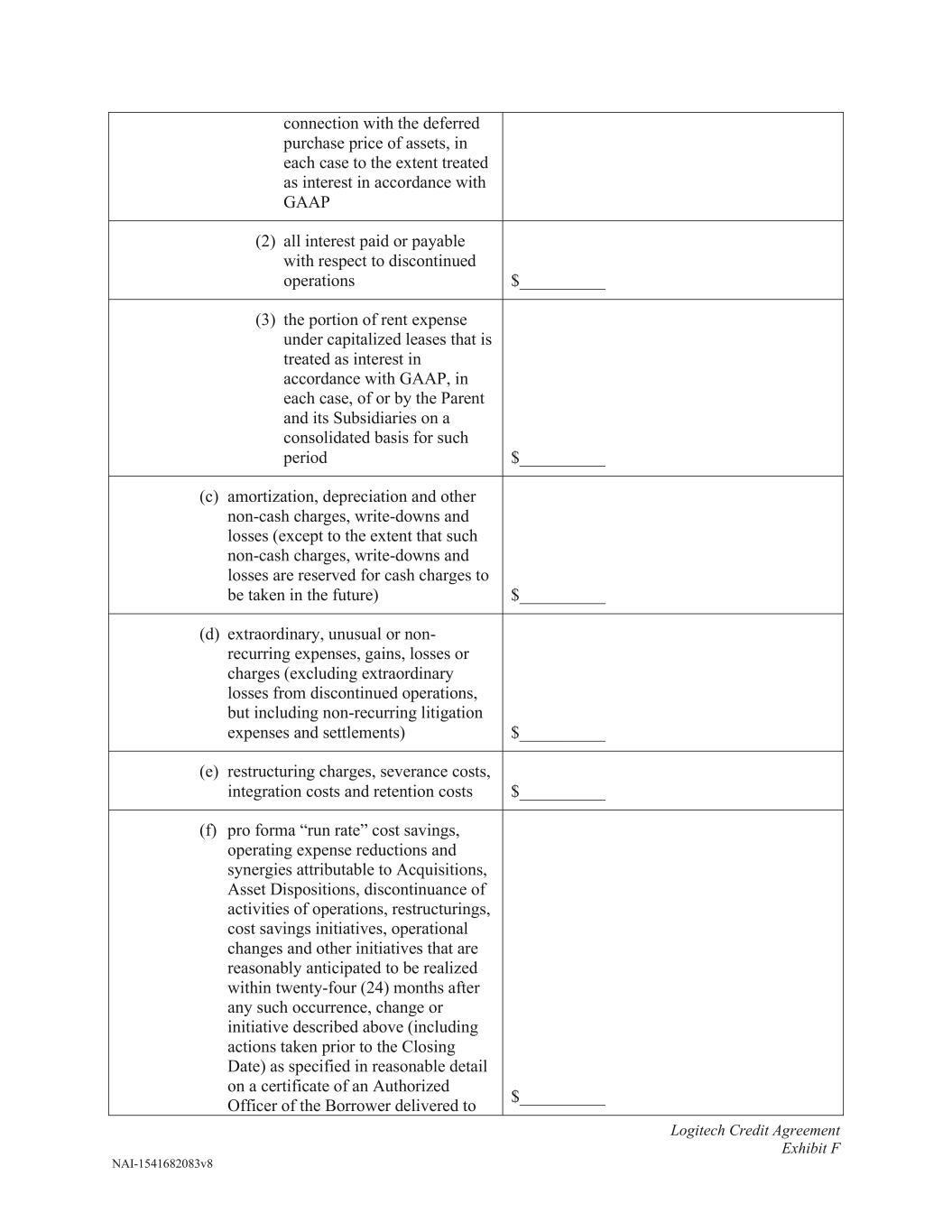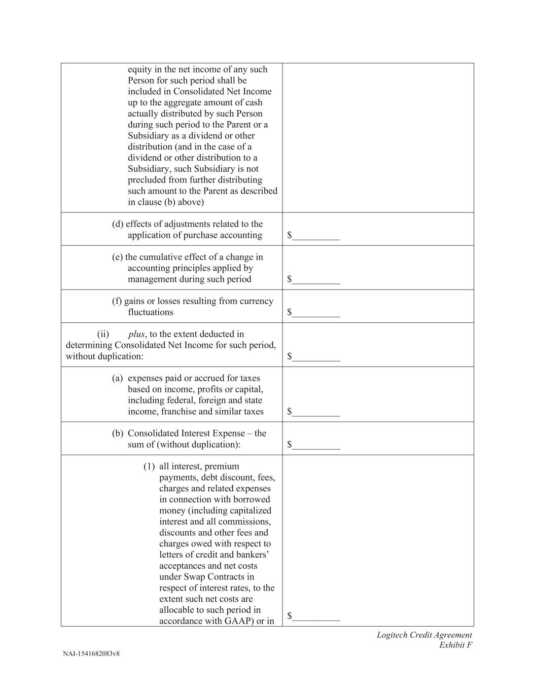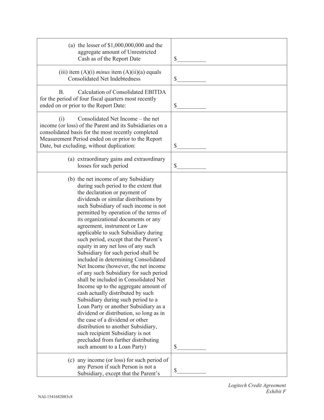 NAI-1541530846v16 15 with borrowed money (including capitalized interest and all commissions, discounts and other fees and charges owed with respect to letters of credit and bankers’ acceptances and net costs under Swap Contracts in respect of interest rates, to the extent such net costs are allocable to such period in accordance with GAAP) or in connection with the deferred purchase price of assets, in each case to the extent treated as interest in accordance with GAAP, (b) all interest paid or payable with respect to discontinued operations and (c) the portion of rent expense under capitalized leases that is treated as interest in accordance with GAAP, in each case, of or by the Parent and its Subsidiaries on a consolidated basis for the most recently completed Measurement Period. “Consolidated Net Income” means, at any date of determination, the net income (or loss) of the Parent and its Subsidiaries on a consolidated basis for the most recently completed Measurement Period; provided that Consolidated Net Income shall exclude (a) extraordinary gains and extraordinary losses for such Measurement Period, (b) the net income of any Subsidiary during such Measurement Period to the extent that the declaration or payment of dividends or similar distributions by such Subsidiary of such income is not permitted by operation of the terms of its organizational documents or any agreement, instrument or Law applicable to such Subsidiary during such Measurement Period, except that the Parent’s equity in any net loss of any such Subsidiary for such Measurement Period shall be included in determining Consolidated Net Income (however, the net income of any such Subsidiary for such period shall be included in Consolidated Net Income up to the aggregate amount of cash actually distributed by such Subsidiary during such period to a Loan Party or another Subsidiary as a dividend or distribution, so long as in the case of a dividend or other distribution to another Subsidiary, such recipient Subsidiary is not precluded from further distributing such amount to a Loan Party as described in this definition), (c) any income (or loss) for such Measurement Period of any Person if such Person is not a Subsidiary, except that the Parent’s equity in the net income of any such Person for such Measurement Period shall be included in Consolidated Net Income up to the aggregate amount of cash actually distributed by such Person during such Measurement Period to the Parent or a Subsidiary as a dividend or other distribution (and in the case of a dividend or other distribution to a Subsidiary, such Subsidiary is not precluded from further distributing such amount to the Parent as described in clause (b) of this proviso), (d) effects of adjustments related to the application of purchase accounting, (e) the cumulative effect of a change in accounting principles applied by management during such period and (f) gains or losses resulting from currency fluctuations. “Consolidated Net Indebtedness” means, as of any date of determination, the difference of (a) Consolidated Funded Indebtedness minus (b) the lesser of (i) $1,000,000,000 and (ii) the aggregate amount of Unrestricted Cash as of such date. “Consolidated Net Leverage Ratio” means, as of any date of determination, the ratio of (a) Consolidated Net Indebtedness to (b) Consolidated EBITDA for the most recent Measurement Period. “Consolidated Total Assets” means, as of the date of any determination thereof, total assets of the Parent and its Subsidiaries calculated in accordance with GAAP on a consolidated basis as of such date. “Control” means the possession, directly or indirectly, of the power to direct or cause the direction of the management or policies of a Person, whether through the ability to