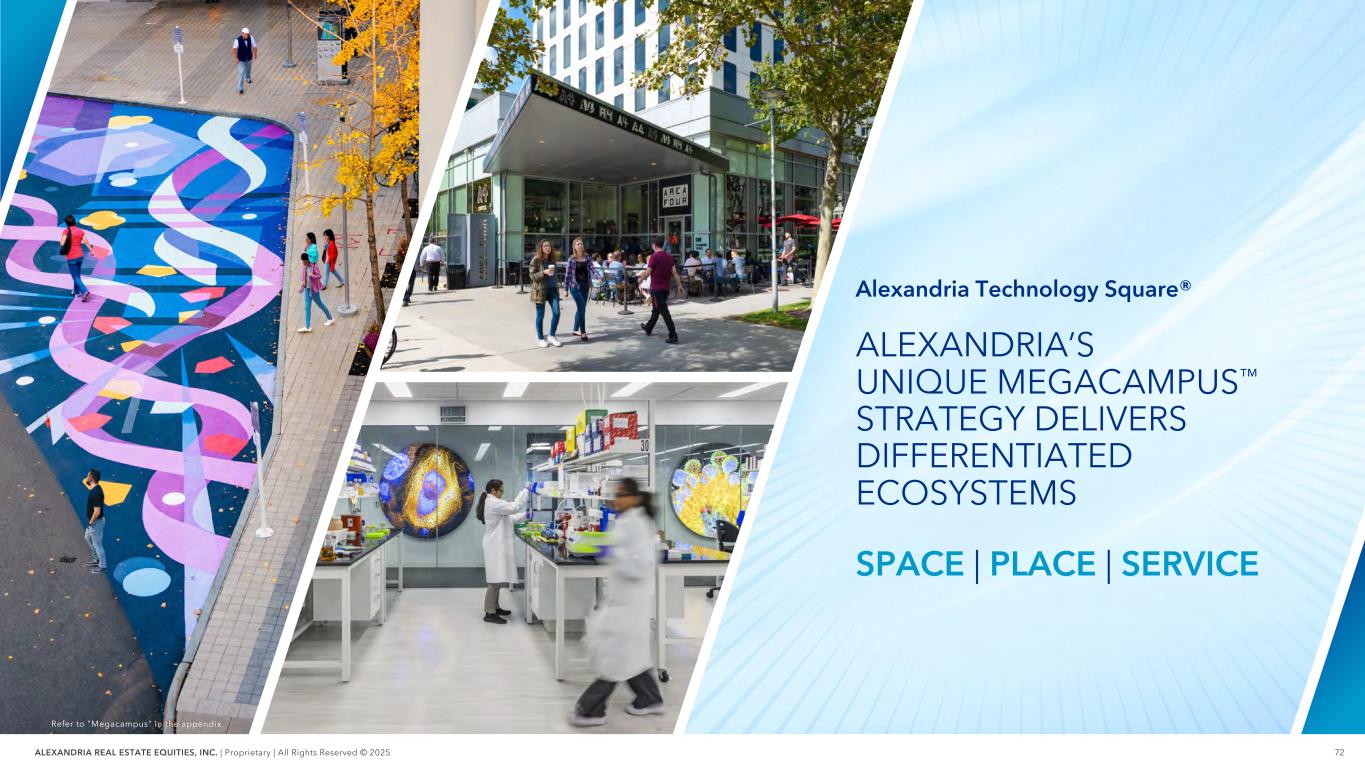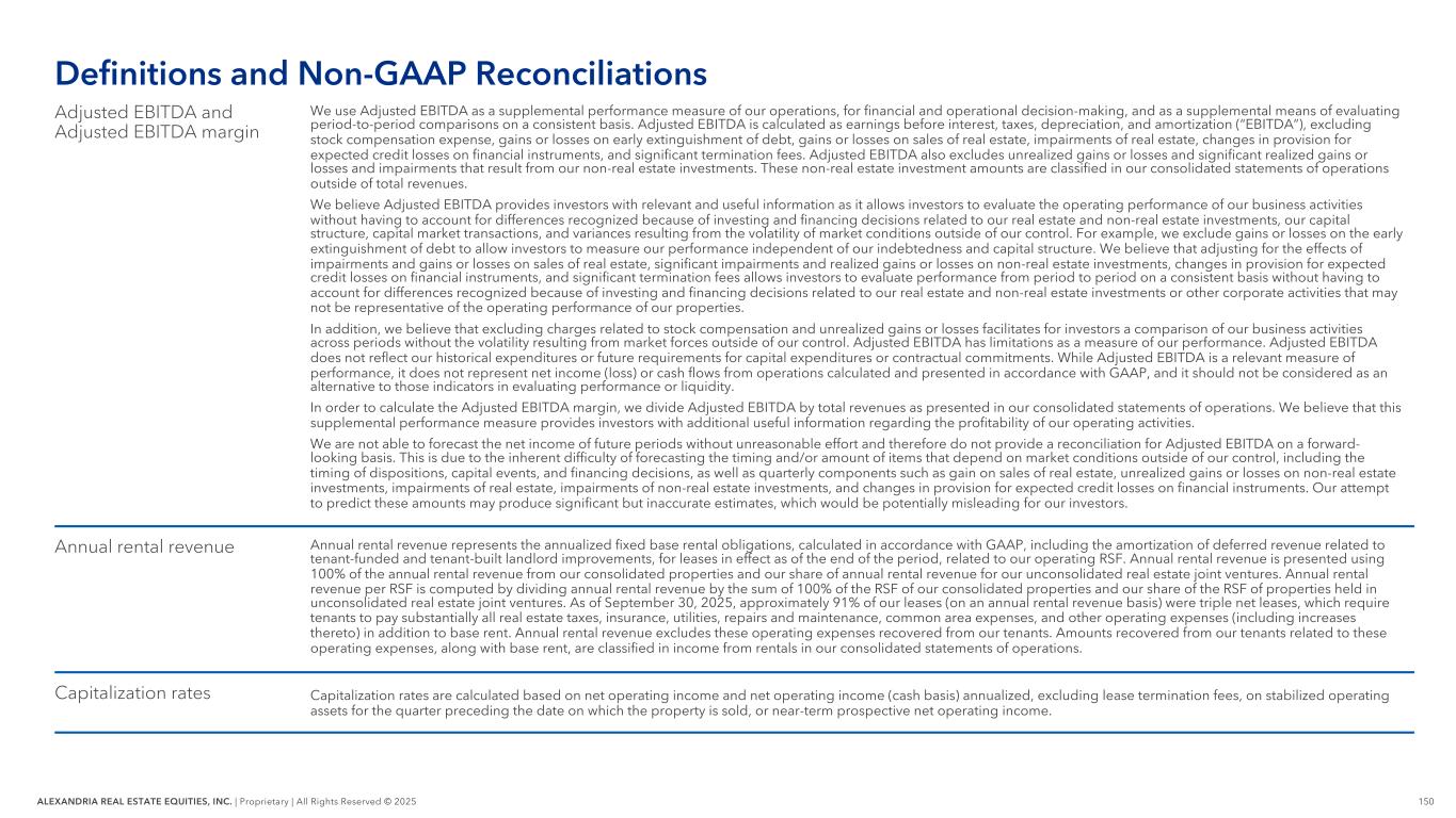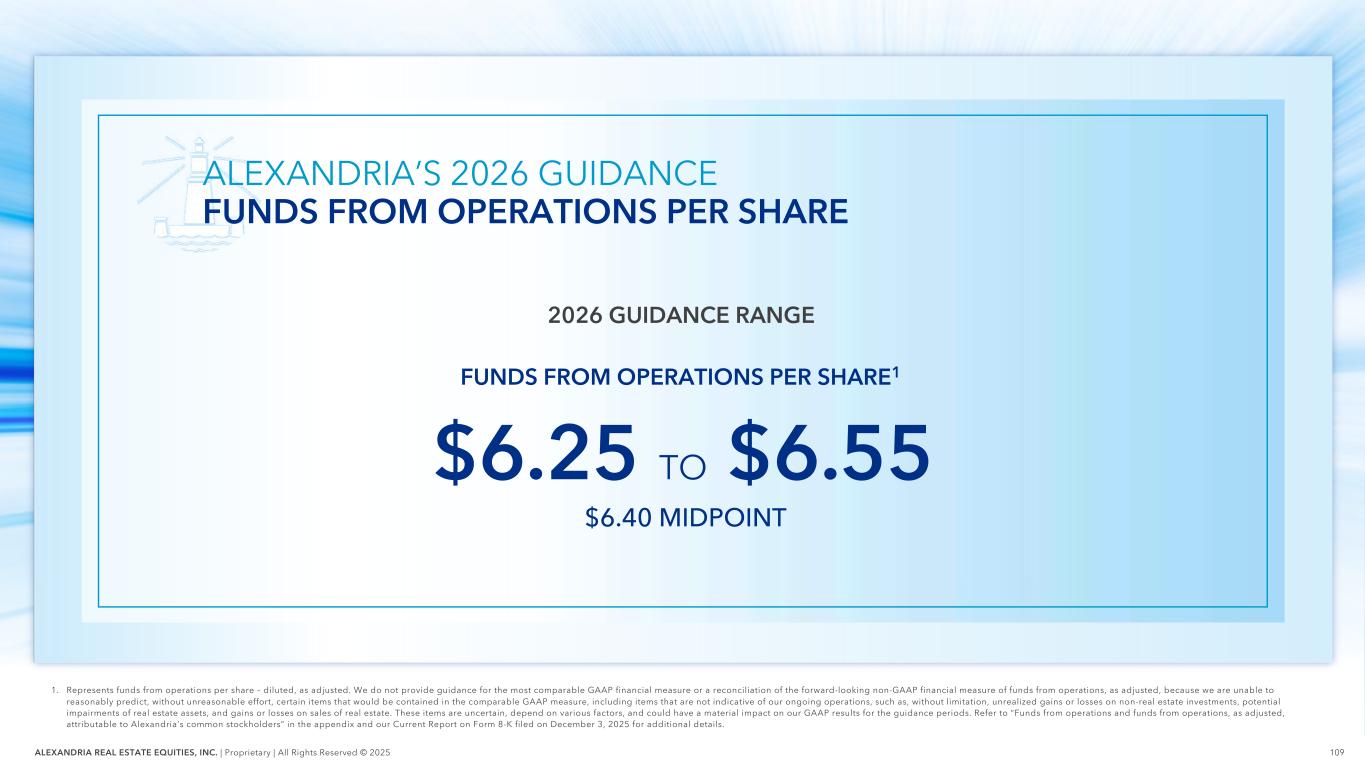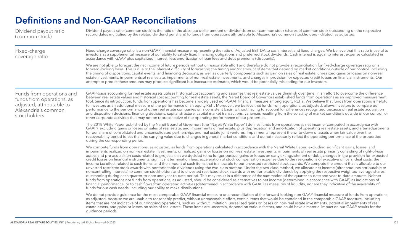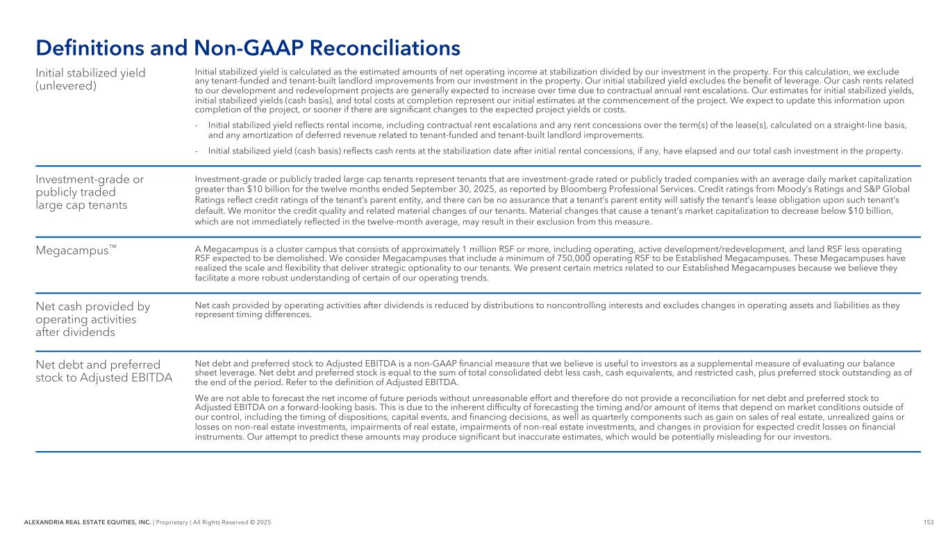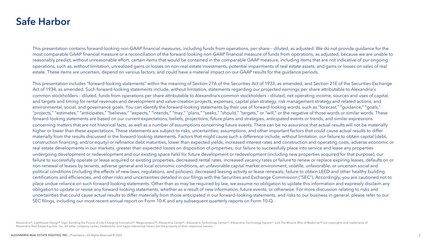 2ALEXANDRIA REAL ESTATE EQUITIES, INC. | Proprietary | All Rights Reserved © 2025 Safe Harbor Alexandria®, Lighthouse Design® logo, Building the Future of Life-Changing Innovation®, Megacampus™, Alexandria Center®, Alexandria Technology Center®, Alexandria Technology Square®, and The Miracle Mile of Medicine™ are copyrights and trademarks of Alexandria Real Estate Equities, Inc. All other company names, trademarks, and logos referenced herein are the property of their respective owners. This presentation contains forward-looking non-GAAP financial measures, including funds from operations, per share – diluted, as adjusted. We do not provide guidance for the most comparable GAAP financial measure or a reconciliation of the forward-looking non-GAAP financial measure of funds from operations, as adjusted, because we are unable to reasonably predict, without unreasonable effort, certain items that would be contained in the comparable GAAP measure, including items that are not indicative of our ongoing operations, such as, without limitation, unrealized gains or losses on non-real estate investments, potential impairments of real estate assets, and gains or losses on sales of real estate. These items are uncertain, depend on various factors, and could have a material impact on our GAAP results for the guidance periods. This presentation includes “forward-looking statements” within the meaning of Section 27A of the Securities Act of 1933, as amended, and Section 21E of the Securities Exchange Act of 1934, as amended. Such forward-looking statements include, without limitation, statements regarding our projected earnings per share attributable to Alexandria’s common stockholders – diluted, funds from operations per share attributable to Alexandria’s common stockholders – diluted, net operating income, sources and uses of capital, and targets and timing for rental revenues and development and value-creation projects, expenses, capital plan strategy, risk management strategy and related actions, and environmental, social, and governance goals. You can identify the forward-looking statements by their use of forward-looking words, such as “forecast,” “guidance,” “goals,” “projects,” “estimates,” “anticipates,” “believes,” “expects,” “intends,” “may,” “plans,” “seeks,” “should,” “targets,” or “will,” or the negative of those words or similar words. These forward-looking statements are based on our current expectations, beliefs, projections, future plans and strategies, anticipated events or trends, and similar expressions concerning matters that are not historical facts, as well as a number of assumptions concerning future events. There can be no assurance that actual results will not be materially higher or lower than these expectations. These statements are subject to risks, uncertainties, assumptions, and other important factors that could cause actual results to differ materially from the results discussed in the forward-looking statements. Factors that might cause such a difference include, without limitation, our failure to obtain capital (debt, construction financing, and/or equity) or refinance debt maturities, lower than expected yields, increased interest rates and construction and operating costs, adverse economic or real estate developments in our markets, greater than expected losses on disposition of properties, our failure to successfully place into service and lease any properties undergoing development or redevelopment and our existing space held for future development or redevelopment (including new properties acquired for that purpose), our failure to successfully operate or lease acquired or existing properties, decreased rental rates, increased vacancy rates or failure to renew or replace expiring leases, defaults on or non-renewal of leases by tenants, adverse general and local economic conditions, an unfavorable capital market environment, volatile, unfavorable, or uncertain social and political conditions (including the effects of new laws, regulations, and policies), decreased leasing activity or lease renewals, failure to obtain LEED and other healthy building certifications and efficiencies, and other risks and uncertainties detailed in our filings with the Securities and Exchange Commission (“SEC”). Accordingly, you are cautioned not to place undue reliance on such forward-looking statements. Other than as may be required by law, we assume no obligation to update this information and expressly disclaim any obligation to update or revise any forward-looking statements, whether as a result of new information, future events, or otherwise. For more discussion relating to risks and uncertainties that could cause actual results to differ materially from those anticipated in our forward-looking statements, and risks to our business in general, please refer to our SEC filings, including our most recent annual report on Form 10-K and any subsequent quarterly reports on Form 10-Q.