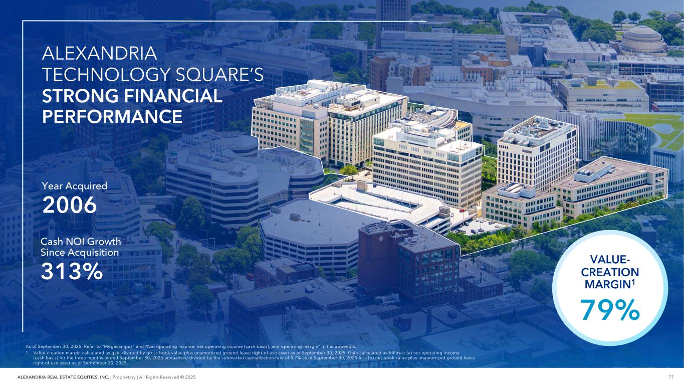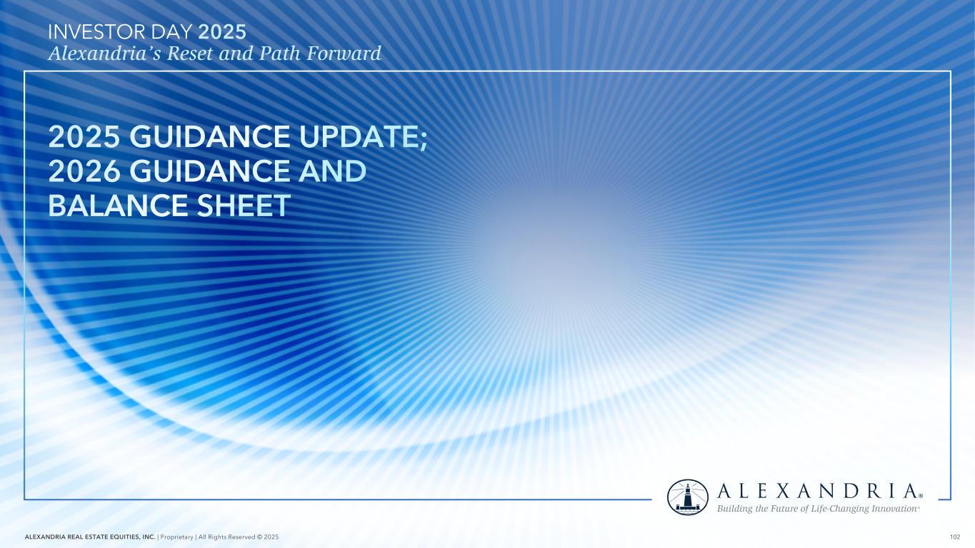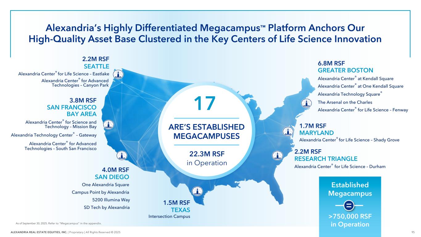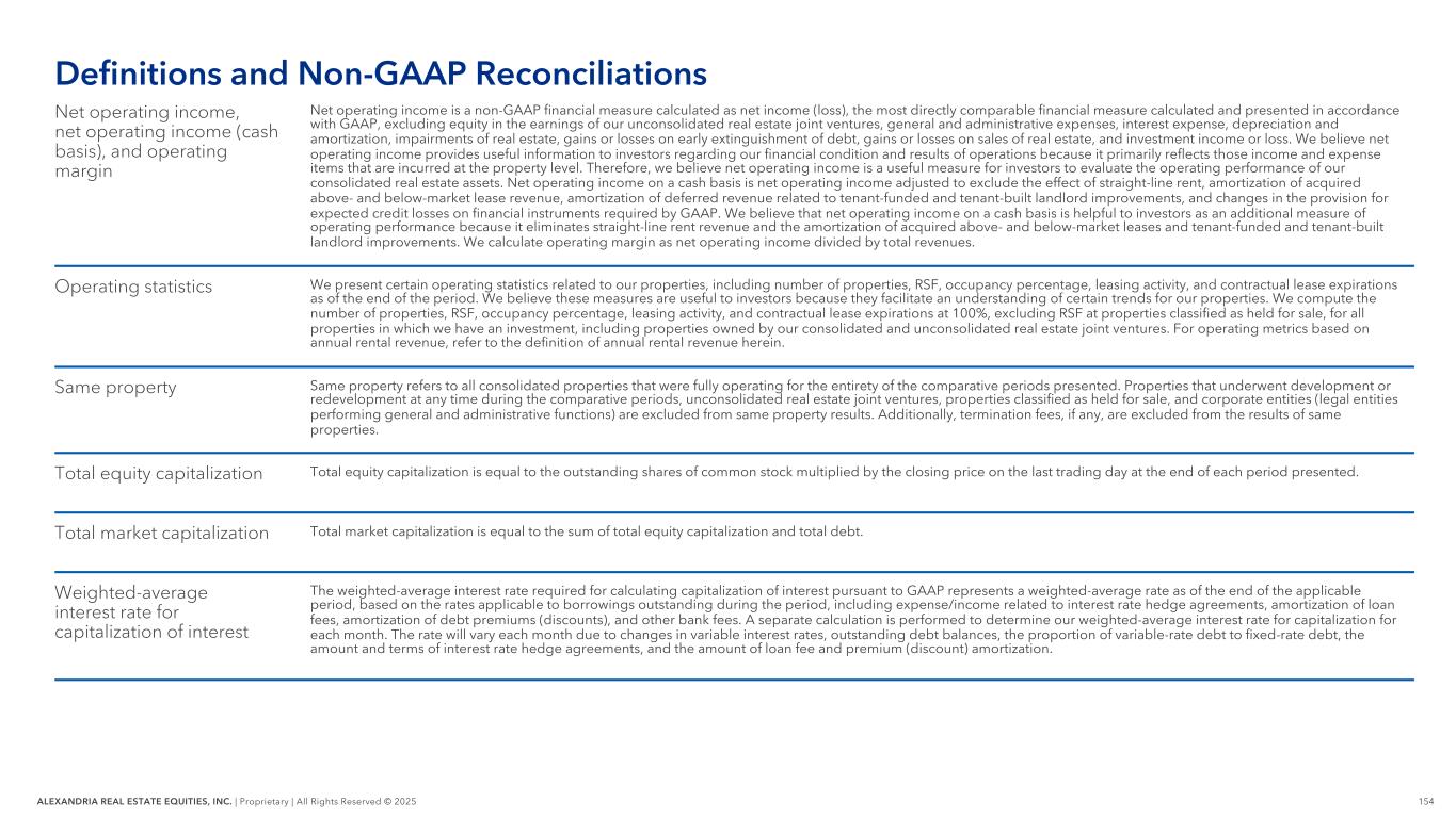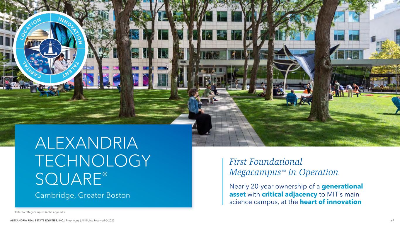 2ALEXANDRIA REAL ESTATE EQUITIES, INC. | Proprietary | All Rights Reserved © 2025 Safe Harbor Alexandria®, Lighthouse Design® logo, Building the Future of Life-Changing Innovation®, Megacampus™, Alexandria Center®, Alexandria Technology Center®, Alexandria Technology Square®, and The Miracle Mile of Medicine™ are copyrights and trademarks of Alexandria Real Estate Equities, Inc. All other company names, trademarks, and logos referenced herein are the property of their respective owners. This presentation contains forward-looking non-GAAP financial measures, including funds from operations, per share – diluted, as adjusted. We do not provide guidance for the most comparable GAAP financial measure or a reconciliation of the forward-looking non-GAAP financial measure of funds from operations, as adjusted, because we are unable to reasonably predict, without unreasonable effort, certain items that would be contained in the comparable GAAP measure, including items that are not indicative of our ongoing operations, such as, without limitation, unrealized gains or losses on non-real estate investments, potential impairments of real estate assets, and gains or losses on sales of real estate. These items are uncertain, depend on various factors, and could have a material impact on our GAAP results for the guidance periods. This presentation includes “forward-looking statements” within the meaning of Section 27A of the Securities Act of 1933, as amended, and Section 21E of the Securities Exchange Act of 1934, as amended. Such forward-looking statements include, without limitation, statements regarding our projected earnings per share attributable to Alexandria’s common stockholders – diluted, funds from operations per share attributable to Alexandria’s common stockholders – diluted, net operating income, sources and uses of capital, and targets and timing for rental revenues and development and value-creation projects, expenses, capital plan strategy, risk management strategy and related actions, and environmental, social, and governance goals. You can identify the forward-looking statements by their use of forward-looking words, such as “forecast,” “guidance,” “goals,” “projects,” “estimates,” “anticipates,” “believes,” “expects,” “intends,” “may,” “plans,” “seeks,” “should,” “targets,” or “will,” or the negative of those words or similar words. These forward-looking statements are based on our current expectations, beliefs, projections, future plans and strategies, anticipated events or trends, and similar expressions concerning matters that are not historical facts, as well as a number of assumptions concerning future events. There can be no assurance that actual results will not be materially higher or lower than these expectations. These statements are subject to risks, uncertainties, assumptions, and other important factors that could cause actual results to differ materially from the results discussed in the forward-looking statements. Factors that might cause such a difference include, without limitation, our failure to obtain capital (debt, construction financing, and/or equity) or refinance debt maturities, lower than expected yields, increased interest rates and construction and operating costs, adverse economic or real estate developments in our markets, greater than expected losses on disposition of properties, our failure to successfully place into service and lease any properties undergoing development or redevelopment and our existing space held for future development or redevelopment (including new properties acquired for that purpose), our failure to successfully operate or lease acquired or existing properties, decreased rental rates, increased vacancy rates or failure to renew or replace expiring leases, defaults on or non-renewal of leases by tenants, adverse general and local economic conditions, an unfavorable capital market environment, volatile, unfavorable, or uncertain social and political conditions (including the effects of new laws, regulations, and policies), decreased leasing activity or lease renewals, failure to obtain LEED and other healthy building certifications and efficiencies, and other risks and uncertainties detailed in our filings with the Securities and Exchange Commission (“SEC”). Accordingly, you are cautioned not to place undue reliance on such forward-looking statements. Other than as may be required by law, we assume no obligation to update this information and expressly disclaim any obligation to update or revise any forward-looking statements, whether as a result of new information, future events, or otherwise. For more discussion relating to risks and uncertainties that could cause actual results to differ materially from those anticipated in our forward-looking statements, and risks to our business in general, please refer to our SEC filings, including our most recent annual report on Form 10-K and any subsequent quarterly reports on Form 10-Q.