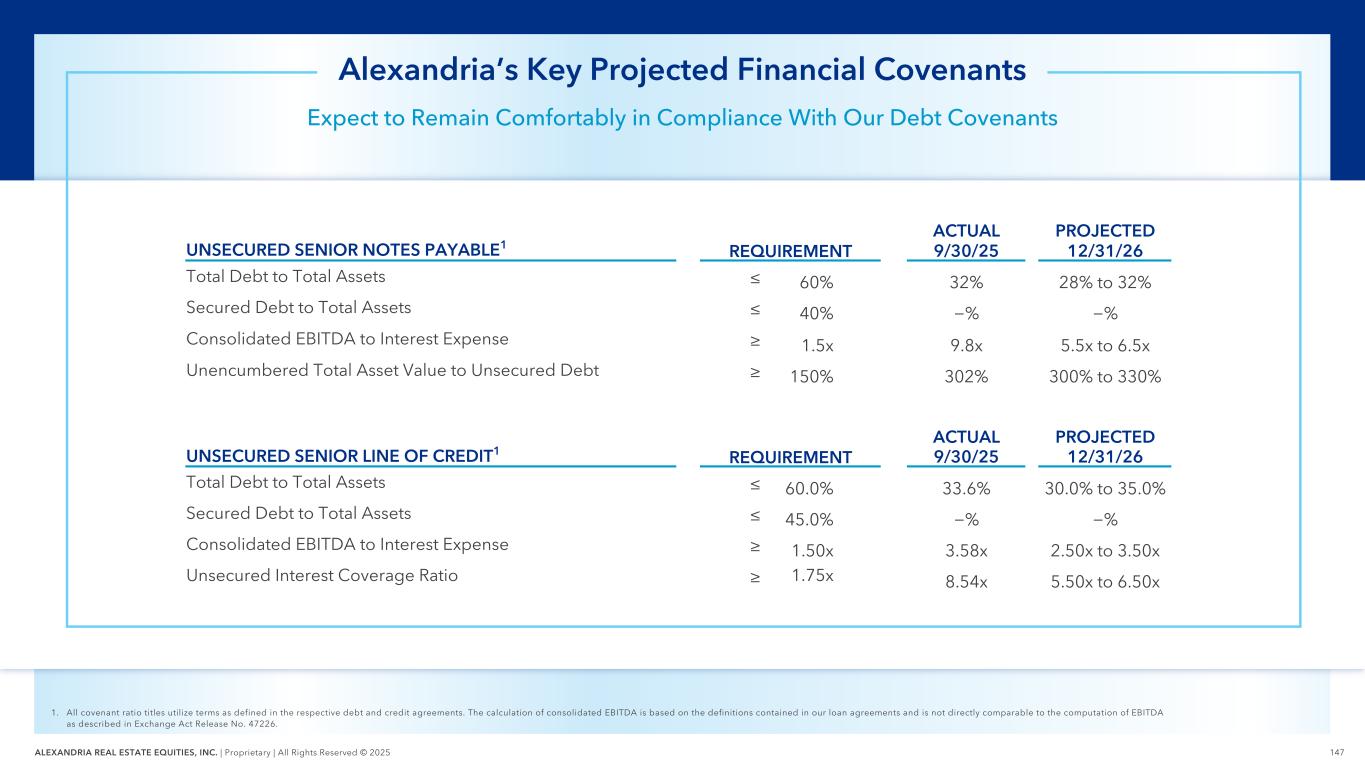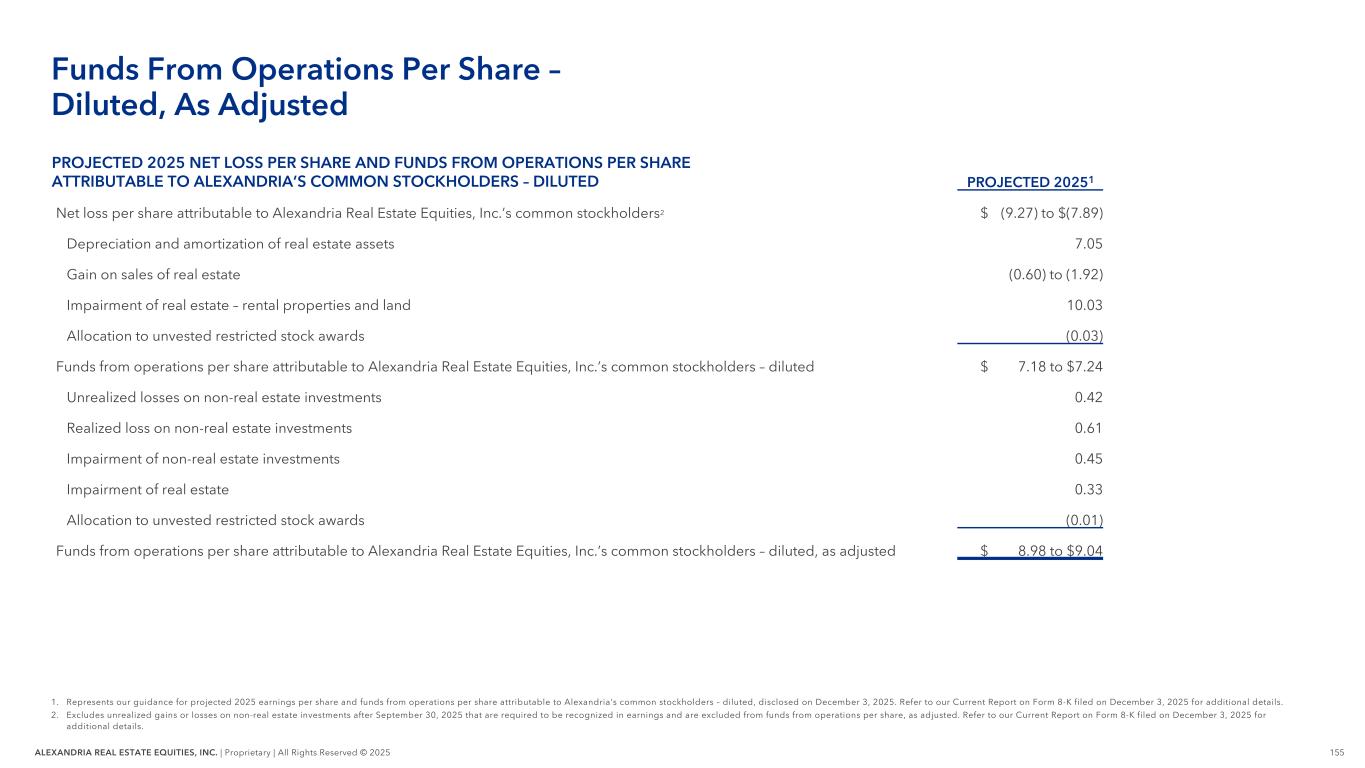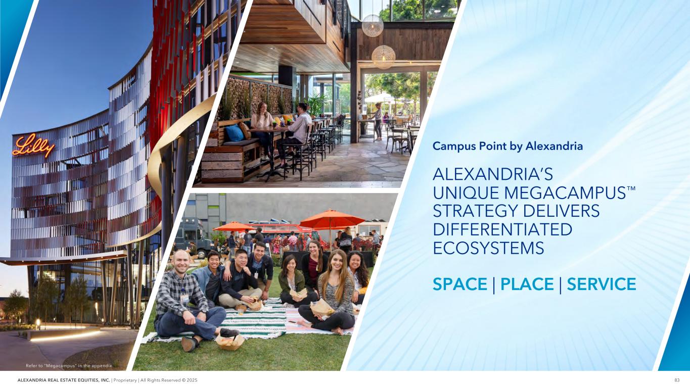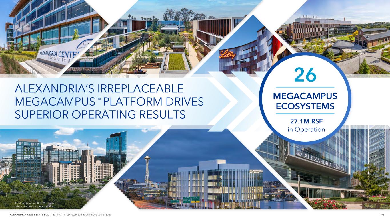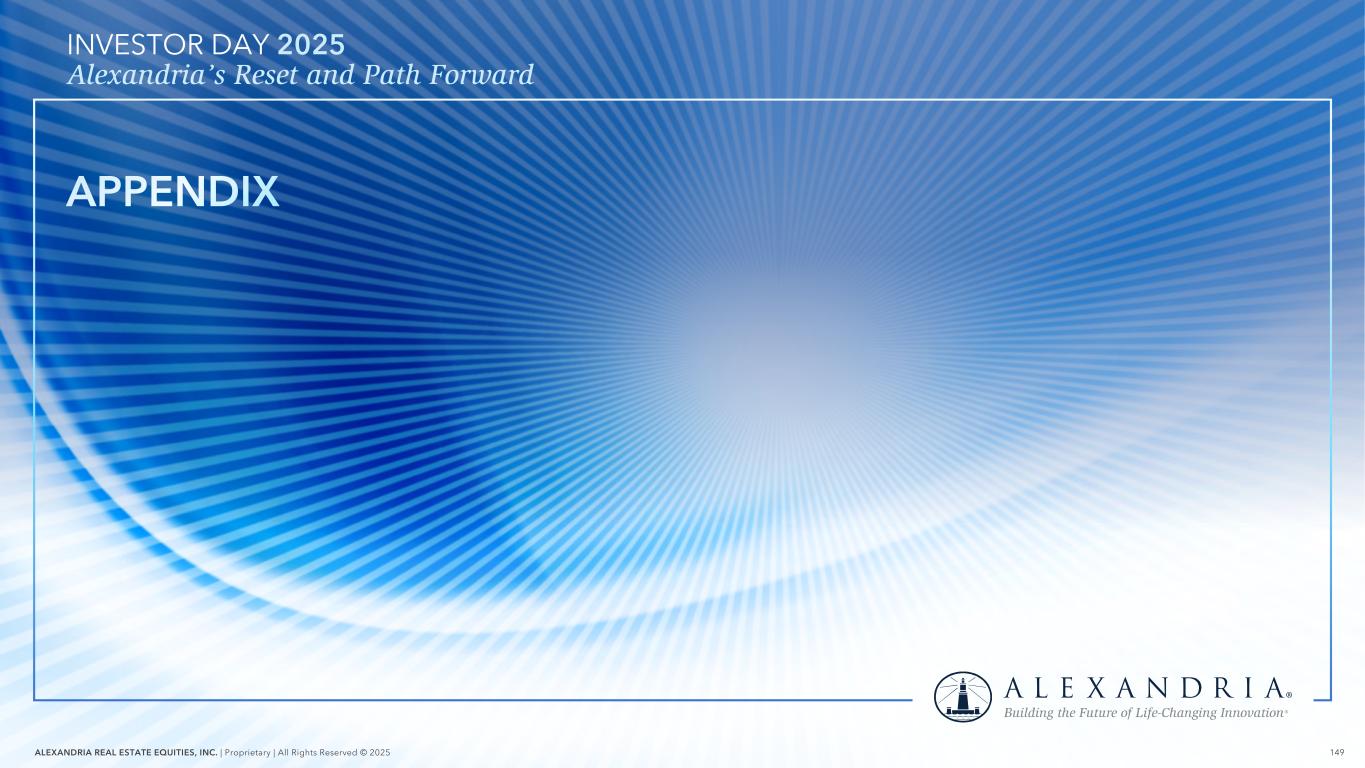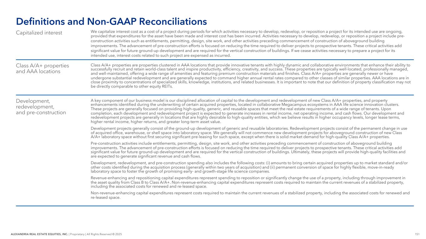2ALEXANDRIA REAL ESTATE EQUITIES, INC. | Proprietary | All Rights Reserved © 2025 Safe Harbor Alexandria®, Lighthouse Design® logo, Building the Future of Life-Changing Innovation®, Megacampus™, Alexandria Center®, Alexandria Technology Center®, Alexandria Technology Square®, and The Miracle Mile of Medicine™ are copyrights and trademarks of Alexandria Real Estate Equities, Inc. All other company names, trademarks, and logos referenced herein are the property of their respective owners. This presentation contains forward-looking non-GAAP financial measures, including funds from operations, per share – diluted, as adjusted. We do not provide guidance for the most comparable GAAP financial measure or a reconciliation of the forward-looking non-GAAP financial measure of funds from operations, as adjusted, because we are unable to reasonably predict, without unreasonable effort, certain items that would be contained in the comparable GAAP measure, including items that are not indicative of our ongoing operations, such as, without limitation, unrealized gains or losses on non-real estate investments, potential impairments of real estate assets, and gains or losses on sales of real estate. These items are uncertain, depend on various factors, and could have a material impact on our GAAP results for the guidance periods. This presentation includes “forward-looking statements” within the meaning of Section 27A of the Securities Act of 1933, as amended, and Section 21E of the Securities Exchange Act of 1934, as amended. Such forward-looking statements include, without limitation, statements regarding our projected earnings per share attributable to Alexandria’s common stockholders – diluted, funds from operations per share attributable to Alexandria’s common stockholders – diluted, net operating income, sources and uses of capital, and targets and timing for rental revenues and development and value-creation projects, expenses, capital plan strategy, risk management strategy and related actions, and environmental, social, and governance goals. You can identify the forward-looking statements by their use of forward-looking words, such as “forecast,” “guidance,” “goals,” “projects,” “estimates,” “anticipates,” “believes,” “expects,” “intends,” “may,” “plans,” “seeks,” “should,” “targets,” or “will,” or the negative of those words or similar words. These forward-looking statements are based on our current expectations, beliefs, projections, future plans and strategies, anticipated events or trends, and similar expressions concerning matters that are not historical facts, as well as a number of assumptions concerning future events. There can be no assurance that actual results will not be materially higher or lower than these expectations. These statements are subject to risks, uncertainties, assumptions, and other important factors that could cause actual results to differ materially from the results discussed in the forward-looking statements. Factors that might cause such a difference include, without limitation, our failure to obtain capital (debt, construction financing, and/or equity) or refinance debt maturities, lower than expected yields, increased interest rates and construction and operating costs, adverse economic or real estate developments in our markets, greater than expected losses on disposition of properties, our failure to successfully place into service and lease any properties undergoing development or redevelopment and our existing space held for future development or redevelopment (including new properties acquired for that purpose), our failure to successfully operate or lease acquired or existing properties, decreased rental rates, increased vacancy rates or failure to renew or replace expiring leases, defaults on or non-renewal of leases by tenants, adverse general and local economic conditions, an unfavorable capital market environment, volatile, unfavorable, or uncertain social and political conditions (including the effects of new laws, regulations, and policies), decreased leasing activity or lease renewals, failure to obtain LEED and other healthy building certifications and efficiencies, and other risks and uncertainties detailed in our filings with the Securities and Exchange Commission (“SEC”). Accordingly, you are cautioned not to place undue reliance on such forward-looking statements. Other than as may be required by law, we assume no obligation to update this information and expressly disclaim any obligation to update or revise any forward-looking statements, whether as a result of new information, future events, or otherwise. For more discussion relating to risks and uncertainties that could cause actual results to differ materially from those anticipated in our forward-looking statements, and risks to our business in general, please refer to our SEC filings, including our most recent annual report on Form 10-K and any subsequent quarterly reports on Form 10-Q.