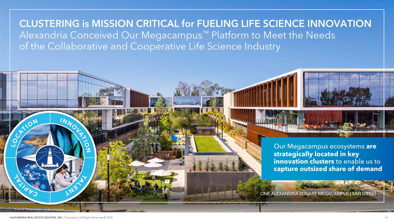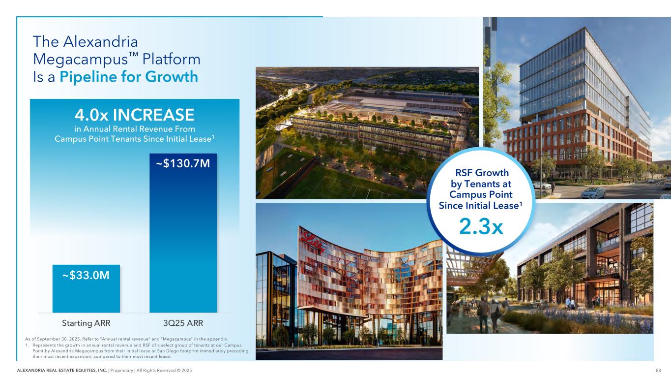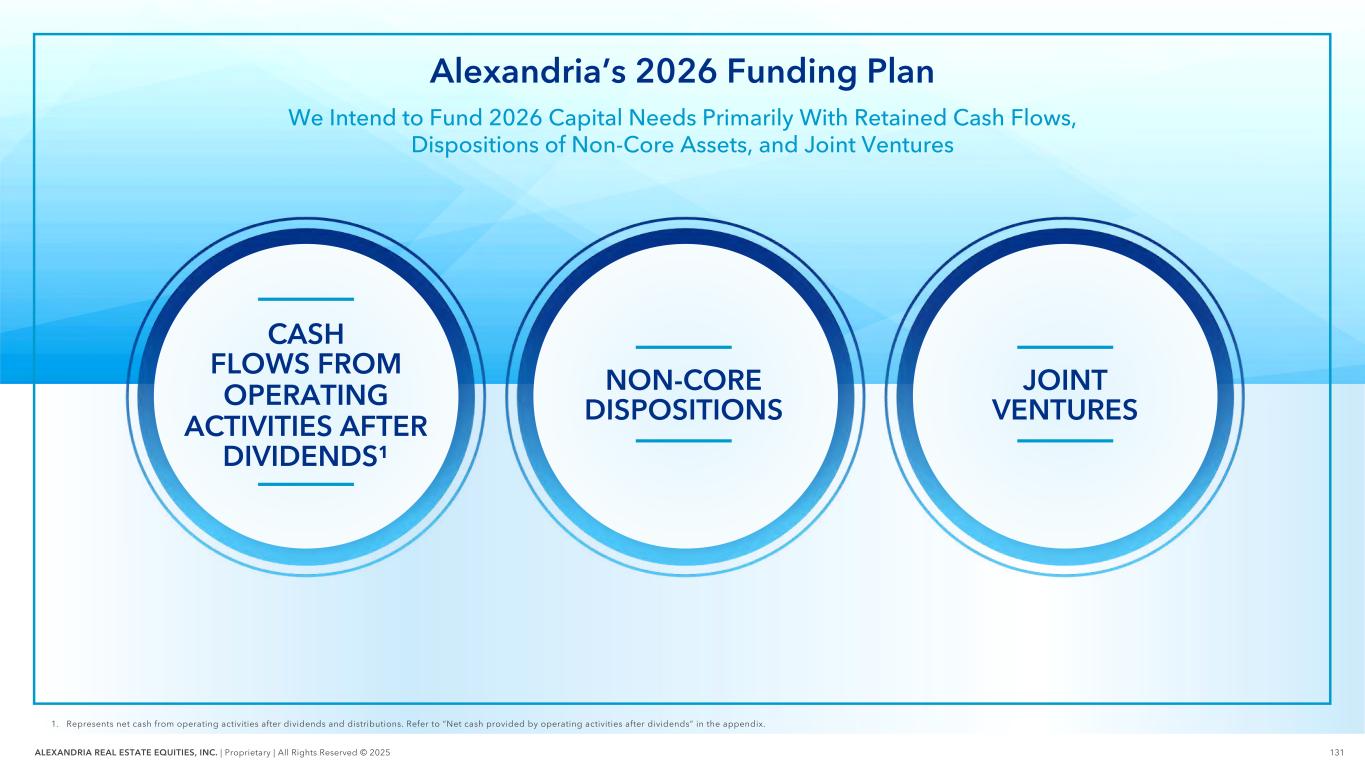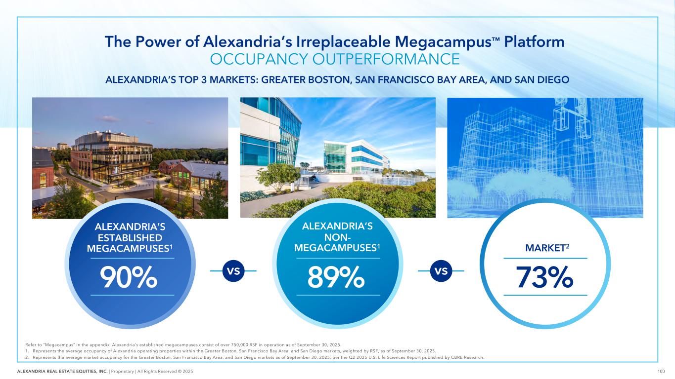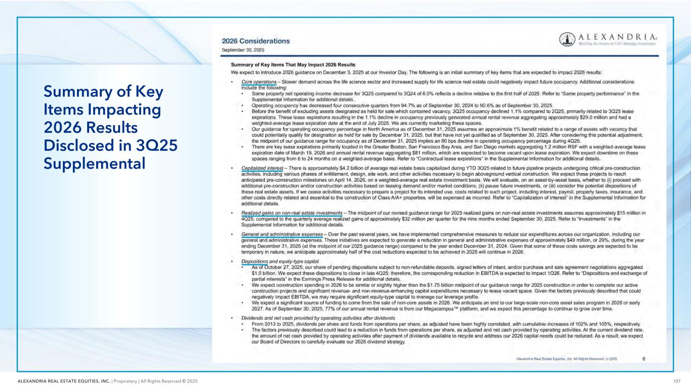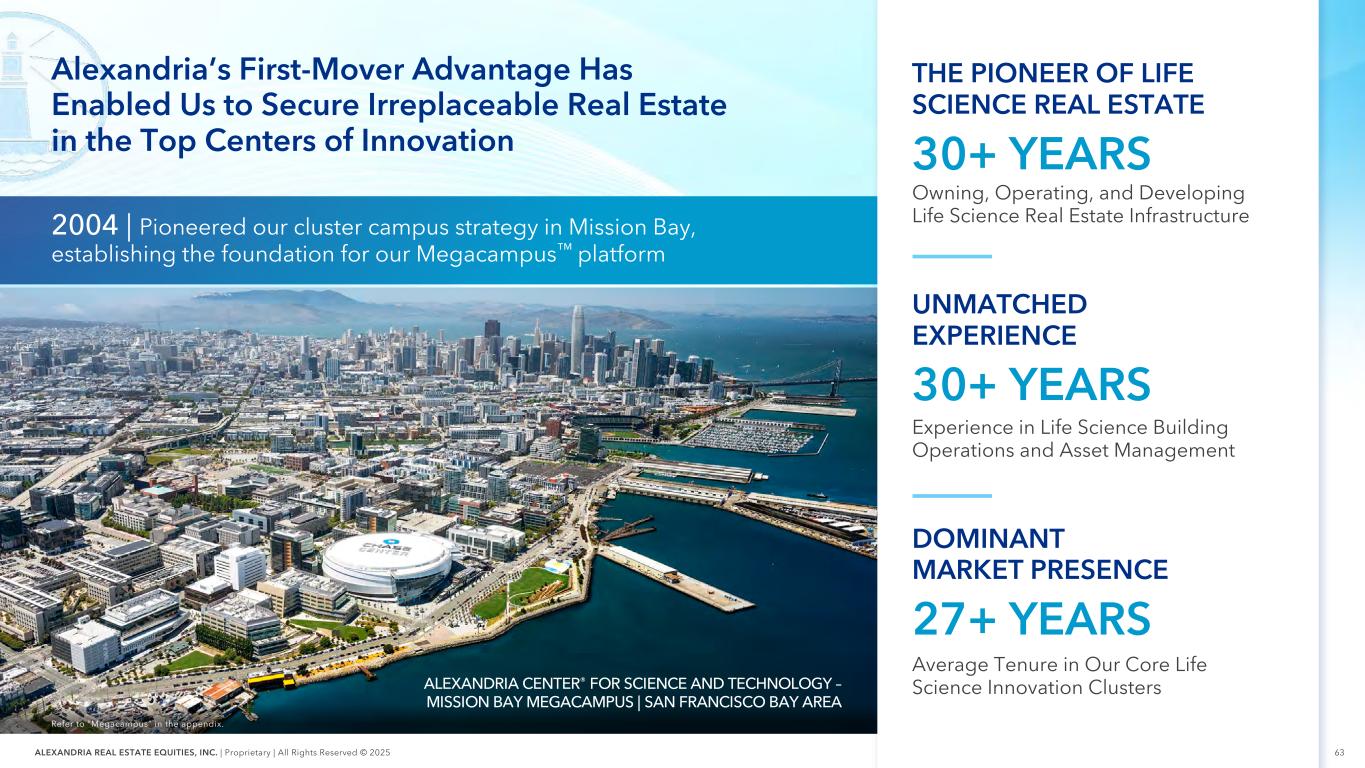 2ALEXANDRIA REAL ESTATE EQUITIES, INC. | Proprietary | All Rights Reserved © 2025 Safe Harbor Alexandria®, Lighthouse Design® logo, Building the Future of Life-Changing Innovation®, Megacampus™, Alexandria Center®, Alexandria Technology Center®, Alexandria Technology Square®, and The Miracle Mile of Medicine™ are copyrights and trademarks of Alexandria Real Estate Equities, Inc. All other company names, trademarks, and logos referenced herein are the property of their respective owners. This presentation contains forward-looking non-GAAP financial measures, including funds from operations, per share – diluted, as adjusted. We do not provide guidance for the most comparable GAAP financial measure or a reconciliation of the forward-looking non-GAAP financial measure of funds from operations, as adjusted, because we are unable to reasonably predict, without unreasonable effort, certain items that would be contained in the comparable GAAP measure, including items that are not indicative of our ongoing operations, such as, without limitation, unrealized gains or losses on non-real estate investments, potential impairments of real estate assets, and gains or losses on sales of real estate. These items are uncertain, depend on various factors, and could have a material impact on our GAAP results for the guidance periods. This presentation includes “forward-looking statements” within the meaning of Section 27A of the Securities Act of 1933, as amended, and Section 21E of the Securities Exchange Act of 1934, as amended. Such forward-looking statements include, without limitation, statements regarding our projected earnings per share attributable to Alexandria’s common stockholders – diluted, funds from operations per share attributable to Alexandria’s common stockholders – diluted, net operating income, sources and uses of capital, and targets and timing for rental revenues and development and value-creation projects, expenses, capital plan strategy, risk management strategy and related actions, and environmental, social, and governance goals. You can identify the forward-looking statements by their use of forward-looking words, such as “forecast,” “guidance,” “goals,” “projects,” “estimates,” “anticipates,” “believes,” “expects,” “intends,” “may,” “plans,” “seeks,” “should,” “targets,” or “will,” or the negative of those words or similar words. These forward-looking statements are based on our current expectations, beliefs, projections, future plans and strategies, anticipated events or trends, and similar expressions concerning matters that are not historical facts, as well as a number of assumptions concerning future events. There can be no assurance that actual results will not be materially higher or lower than these expectations. These statements are subject to risks, uncertainties, assumptions, and other important factors that could cause actual results to differ materially from the results discussed in the forward-looking statements. Factors that might cause such a difference include, without limitation, our failure to obtain capital (debt, construction financing, and/or equity) or refinance debt maturities, lower than expected yields, increased interest rates and construction and operating costs, adverse economic or real estate developments in our markets, greater than expected losses on disposition of properties, our failure to successfully place into service and lease any properties undergoing development or redevelopment and our existing space held for future development or redevelopment (including new properties acquired for that purpose), our failure to successfully operate or lease acquired or existing properties, decreased rental rates, increased vacancy rates or failure to renew or replace expiring leases, defaults on or non-renewal of leases by tenants, adverse general and local economic conditions, an unfavorable capital market environment, volatile, unfavorable, or uncertain social and political conditions (including the effects of new laws, regulations, and policies), decreased leasing activity or lease renewals, failure to obtain LEED and other healthy building certifications and efficiencies, and other risks and uncertainties detailed in our filings with the Securities and Exchange Commission (“SEC”). Accordingly, you are cautioned not to place undue reliance on such forward-looking statements. Other than as may be required by law, we assume no obligation to update this information and expressly disclaim any obligation to update or revise any forward-looking statements, whether as a result of new information, future events, or otherwise. For more discussion relating to risks and uncertainties that could cause actual results to differ materially from those anticipated in our forward-looking statements, and risks to our business in general, please refer to our SEC filings, including our most recent annual report on Form 10-K and any subsequent quarterly reports on Form 10-Q.