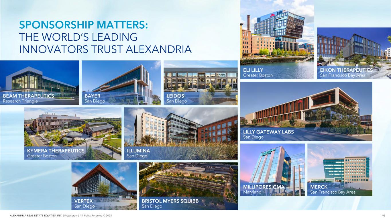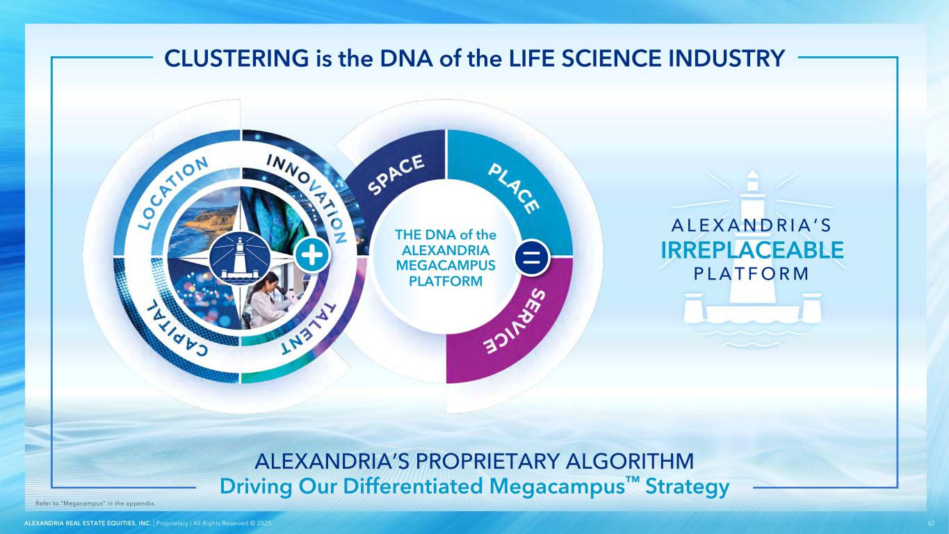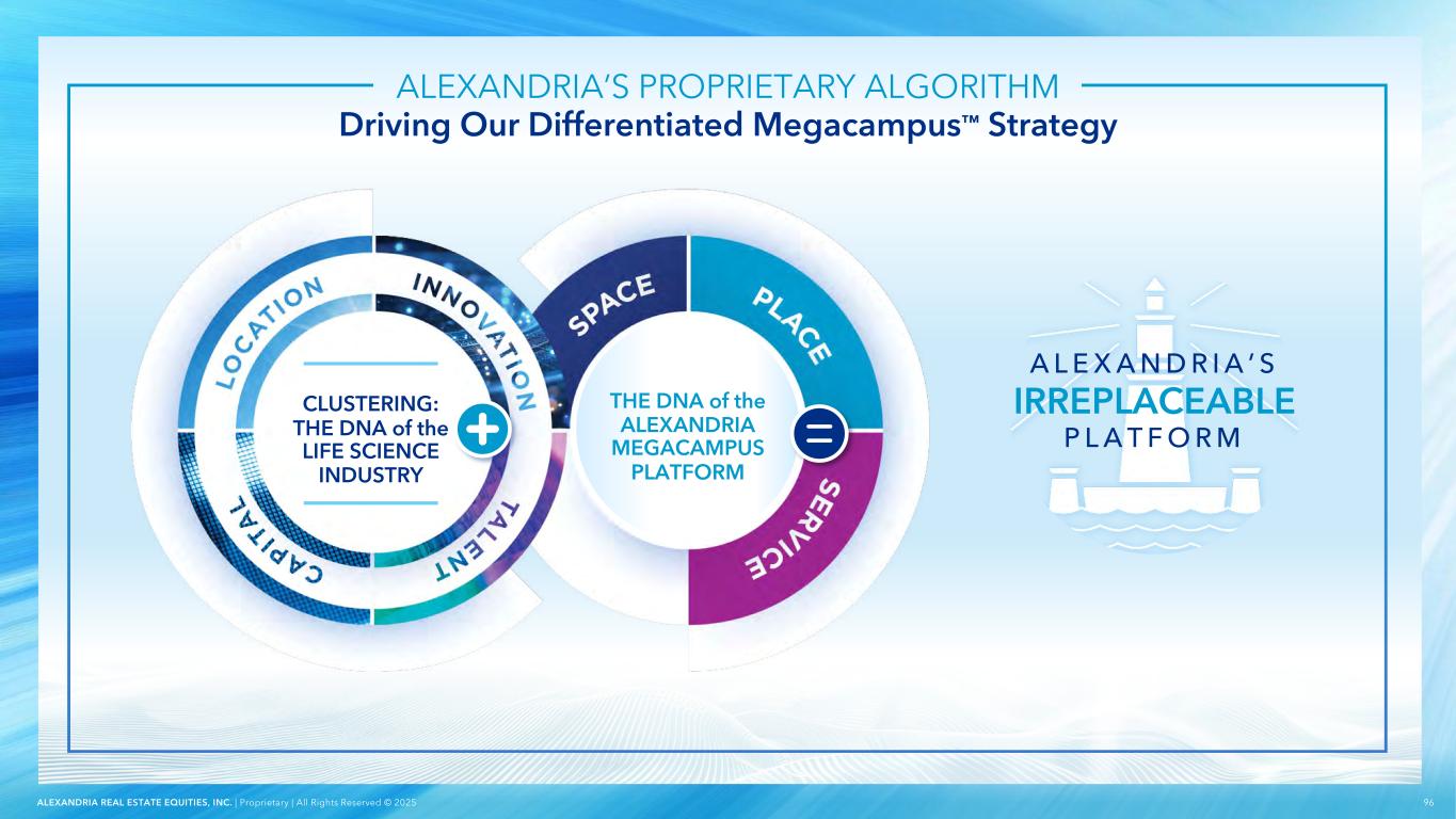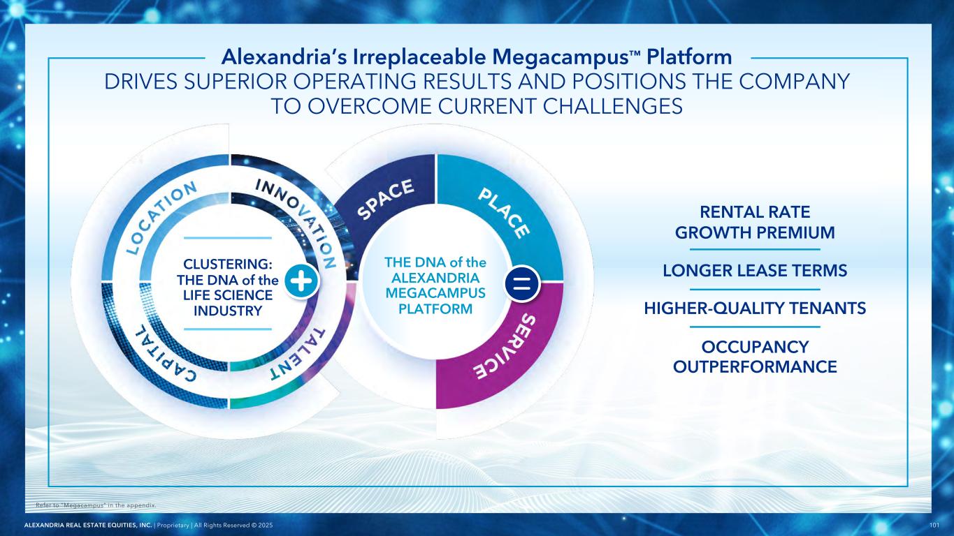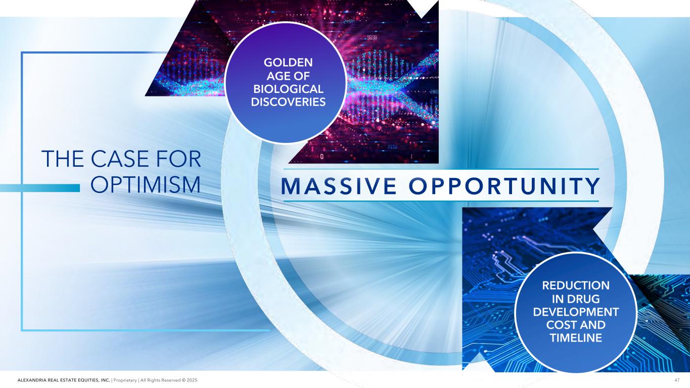 2ALEXANDRIA REAL ESTATE EQUITIES, INC. | Proprietary | All Rights Reserved © 2025 Safe Harbor Alexandria®, Lighthouse Design® logo, Building the Future of Life-Changing Innovation®, Megacampus™, Alexandria Center®, Alexandria Technology Center®, Alexandria Technology Square®, and The Miracle Mile of Medicine™ are copyrights and trademarks of Alexandria Real Estate Equities, Inc. All other company names, trademarks, and logos referenced herein are the property of their respective owners. This presentation contains forward-looking non-GAAP financial measures, including funds from operations, per share – diluted, as adjusted. We do not provide guidance for the most comparable GAAP financial measure or a reconciliation of the forward-looking non-GAAP financial measure of funds from operations, as adjusted, because we are unable to reasonably predict, without unreasonable effort, certain items that would be contained in the comparable GAAP measure, including items that are not indicative of our ongoing operations, such as, without limitation, unrealized gains or losses on non-real estate investments, potential impairments of real estate assets, and gains or losses on sales of real estate. These items are uncertain, depend on various factors, and could have a material impact on our GAAP results for the guidance periods. This presentation includes “forward-looking statements” within the meaning of Section 27A of the Securities Act of 1933, as amended, and Section 21E of the Securities Exchange Act of 1934, as amended. Such forward-looking statements include, without limitation, statements regarding our projected earnings per share attributable to Alexandria’s common stockholders – diluted, funds from operations per share attributable to Alexandria’s common stockholders – diluted, net operating income, sources and uses of capital, and targets and timing for rental revenues and development and value-creation projects, expenses, capital plan strategy, risk management strategy and related actions, and environmental, social, and governance goals. You can identify the forward-looking statements by their use of forward-looking words, such as “forecast,” “guidance,” “goals,” “projects,” “estimates,” “anticipates,” “believes,” “expects,” “intends,” “may,” “plans,” “seeks,” “should,” “targets,” or “will,” or the negative of those words or similar words. These forward-looking statements are based on our current expectations, beliefs, projections, future plans and strategies, anticipated events or trends, and similar expressions concerning matters that are not historical facts, as well as a number of assumptions concerning future events. There can be no assurance that actual results will not be materially higher or lower than these expectations. These statements are subject to risks, uncertainties, assumptions, and other important factors that could cause actual results to differ materially from the results discussed in the forward-looking statements. Factors that might cause such a difference include, without limitation, our failure to obtain capital (debt, construction financing, and/or equity) or refinance debt maturities, lower than expected yields, increased interest rates and construction and operating costs, adverse economic or real estate developments in our markets, greater than expected losses on disposition of properties, our failure to successfully place into service and lease any properties undergoing development or redevelopment and our existing space held for future development or redevelopment (including new properties acquired for that purpose), our failure to successfully operate or lease acquired or existing properties, decreased rental rates, increased vacancy rates or failure to renew or replace expiring leases, defaults on or non-renewal of leases by tenants, adverse general and local economic conditions, an unfavorable capital market environment, volatile, unfavorable, or uncertain social and political conditions (including the effects of new laws, regulations, and policies), decreased leasing activity or lease renewals, failure to obtain LEED and other healthy building certifications and efficiencies, and other risks and uncertainties detailed in our filings with the Securities and Exchange Commission (“SEC”). Accordingly, you are cautioned not to place undue reliance on such forward-looking statements. Other than as may be required by law, we assume no obligation to update this information and expressly disclaim any obligation to update or revise any forward-looking statements, whether as a result of new information, future events, or otherwise. For more discussion relating to risks and uncertainties that could cause actual results to differ materially from those anticipated in our forward-looking statements, and risks to our business in general, please refer to our SEC filings, including our most recent annual report on Form 10-K and any subsequent quarterly reports on Form 10-Q.
