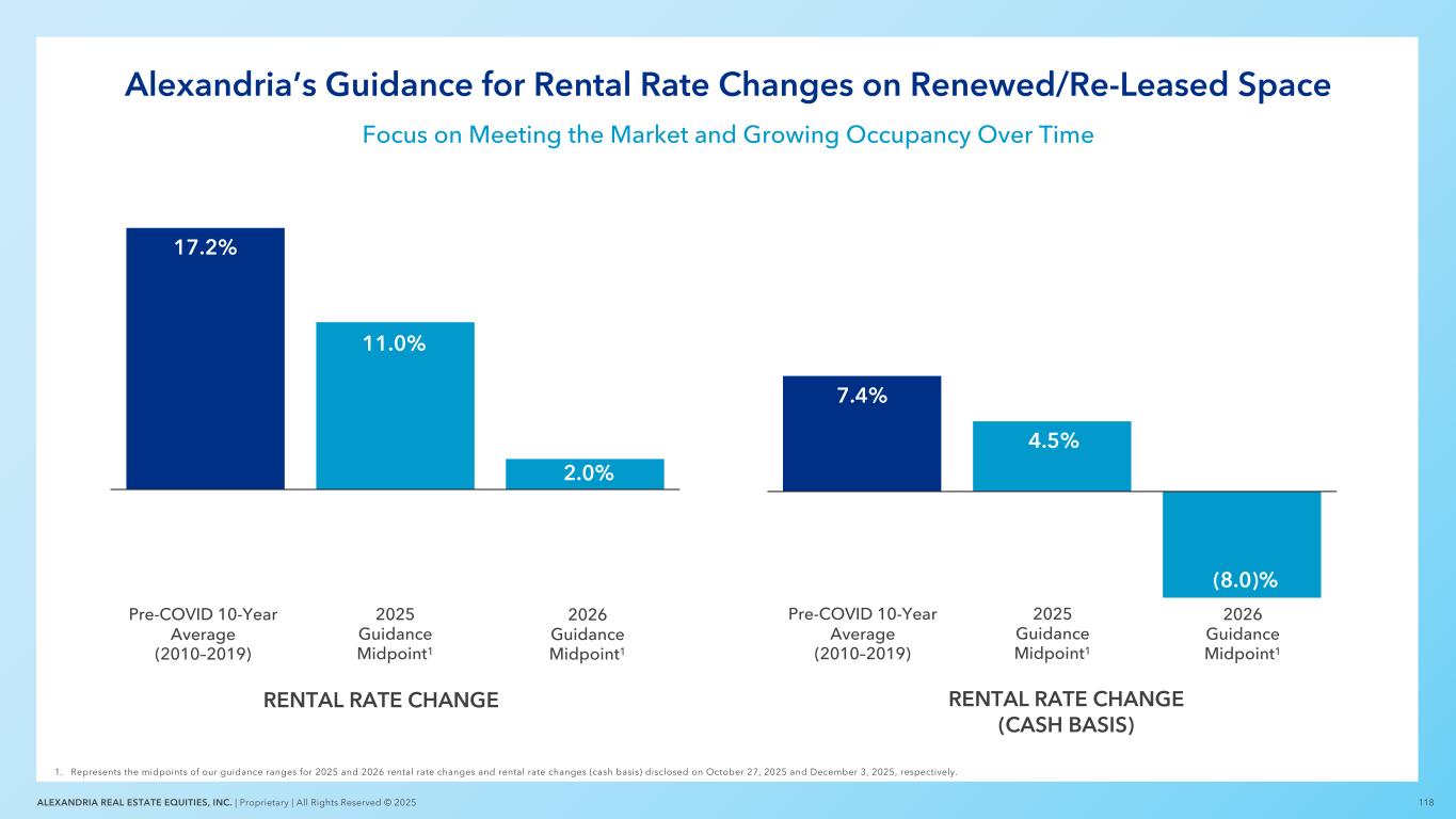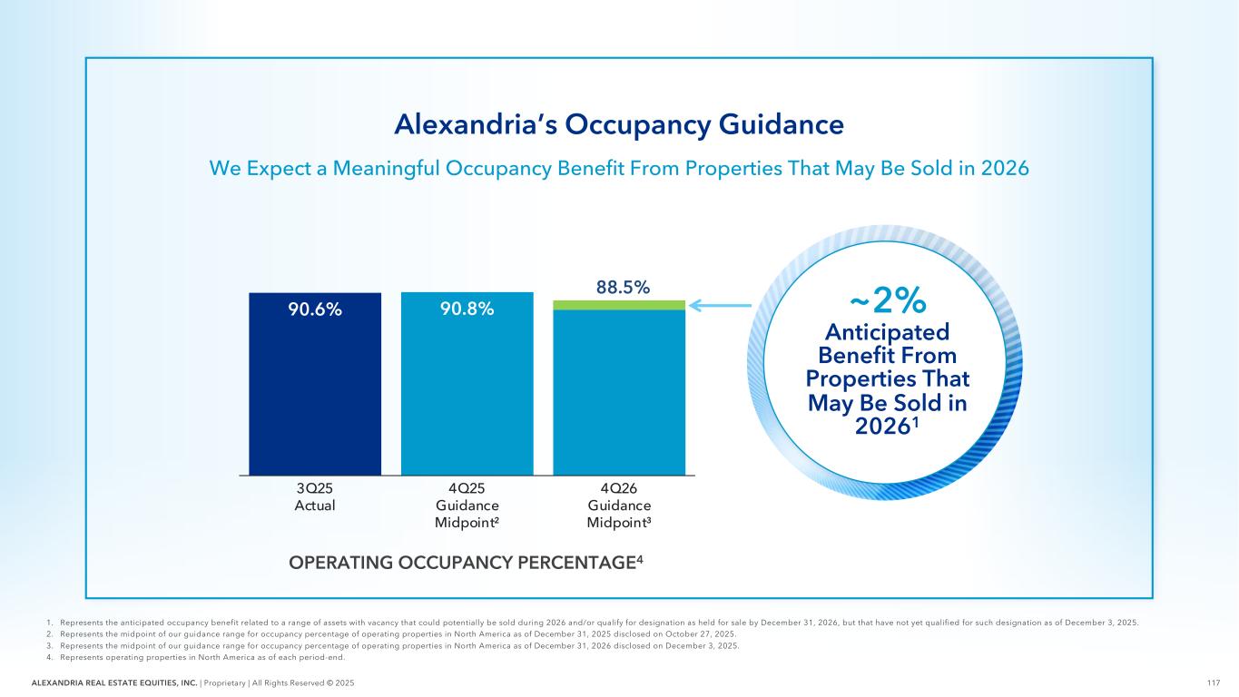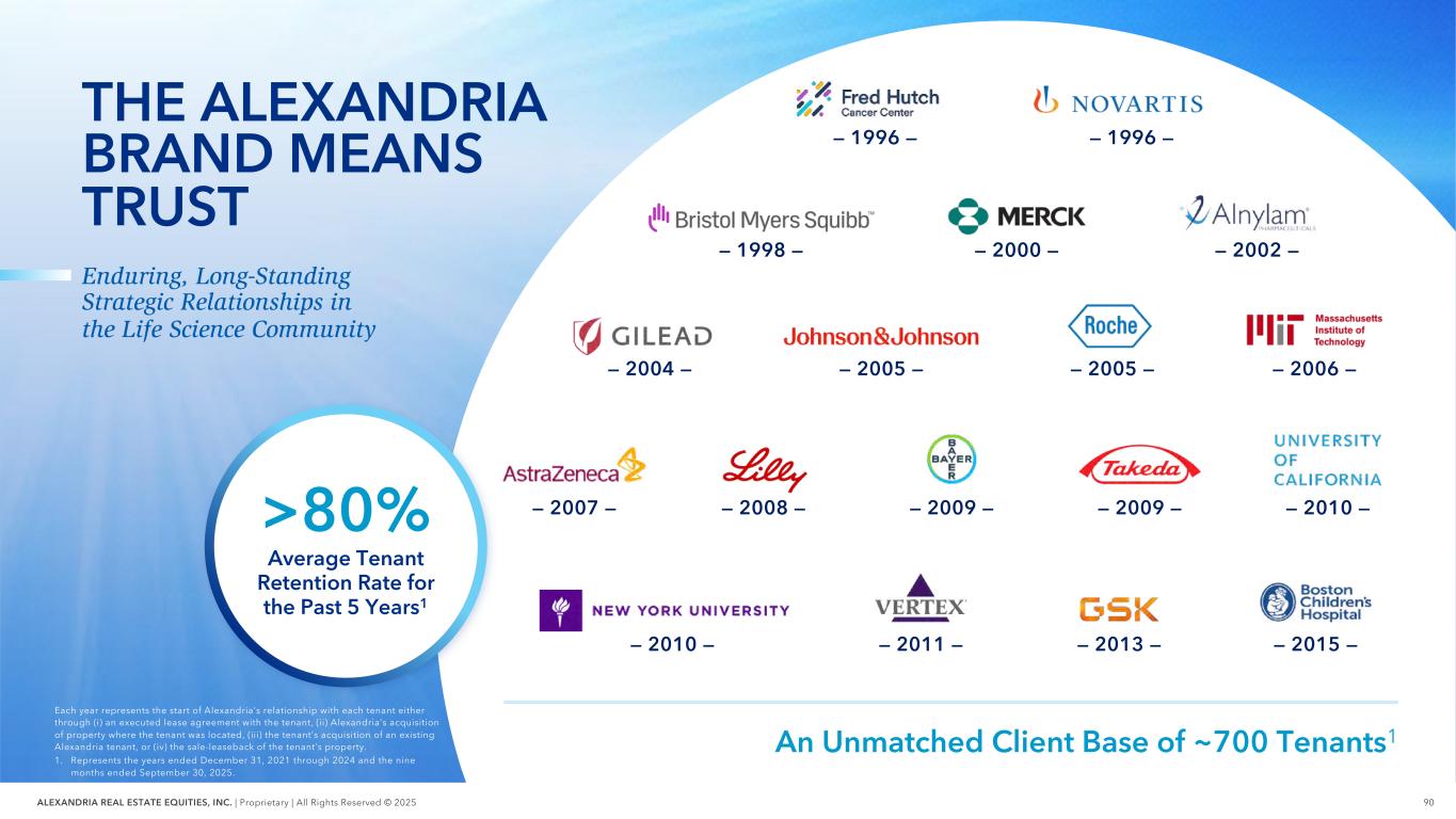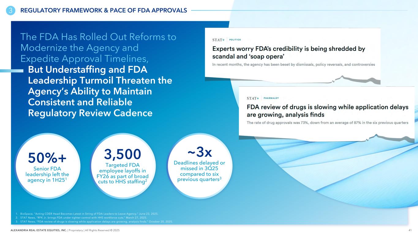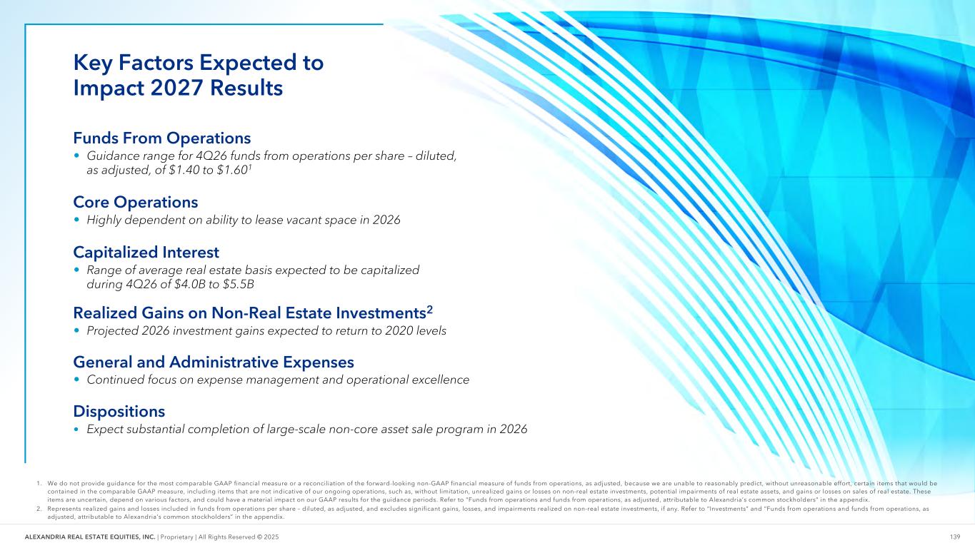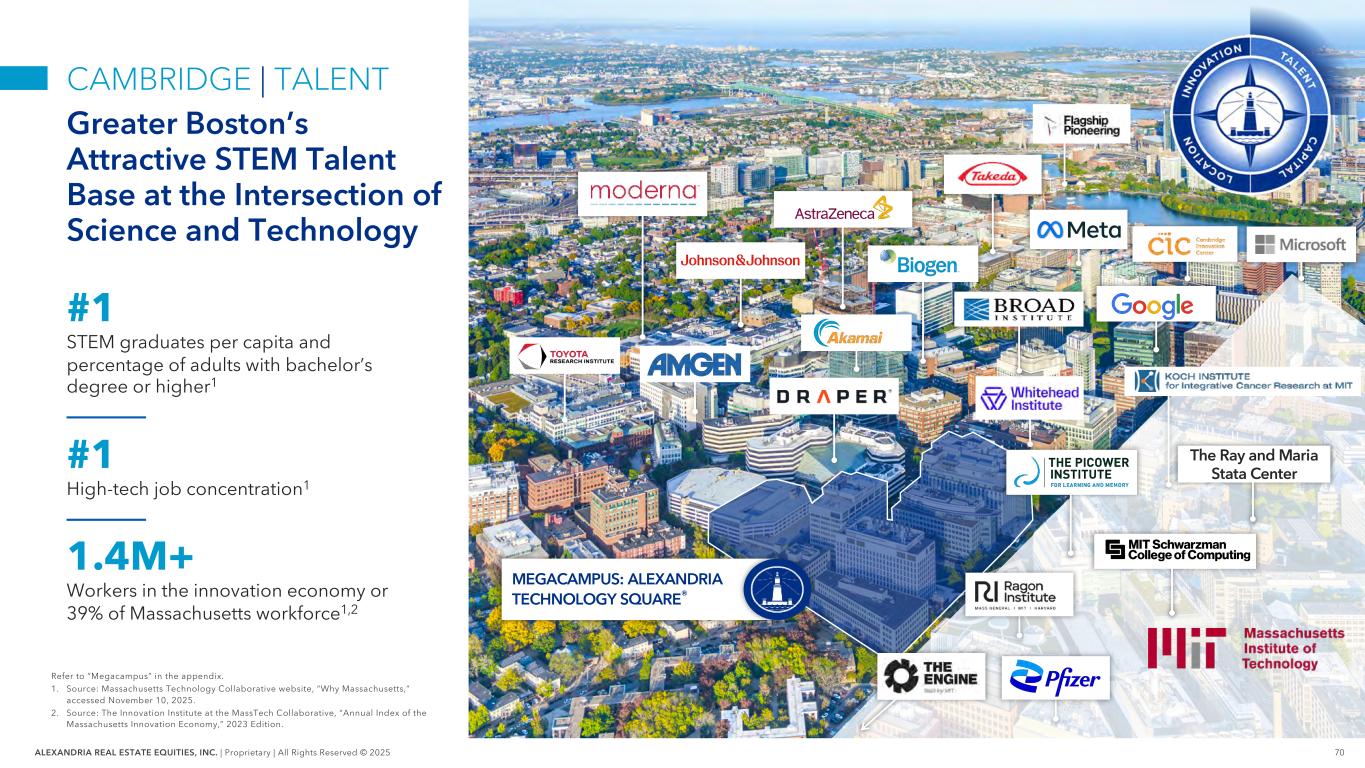 2ALEXANDRIA REAL ESTATE EQUITIES, INC. | Proprietary | All Rights Reserved © 2025 Safe Harbor Alexandria®, Lighthouse Design® logo, Building the Future of Life-Changing Innovation®, Megacampus™, Alexandria Center®, Alexandria Technology Center®, Alexandria Technology Square®, and The Miracle Mile of Medicine™ are copyrights and trademarks of Alexandria Real Estate Equities, Inc. All other company names, trademarks, and logos referenced herein are the property of their respective owners. This presentation contains forward-looking non-GAAP financial measures, including funds from operations, per share – diluted, as adjusted. We do not provide guidance for the most comparable GAAP financial measure or a reconciliation of the forward-looking non-GAAP financial measure of funds from operations, as adjusted, because we are unable to reasonably predict, without unreasonable effort, certain items that would be contained in the comparable GAAP measure, including items that are not indicative of our ongoing operations, such as, without limitation, unrealized gains or losses on non-real estate investments, potential impairments of real estate assets, and gains or losses on sales of real estate. These items are uncertain, depend on various factors, and could have a material impact on our GAAP results for the guidance periods. This presentation includes “forward-looking statements” within the meaning of Section 27A of the Securities Act of 1933, as amended, and Section 21E of the Securities Exchange Act of 1934, as amended. Such forward-looking statements include, without limitation, statements regarding our projected earnings per share attributable to Alexandria’s common stockholders – diluted, funds from operations per share attributable to Alexandria’s common stockholders – diluted, net operating income, sources and uses of capital, and targets and timing for rental revenues and development and value-creation projects, expenses, capital plan strategy, risk management strategy and related actions, and environmental, social, and governance goals. You can identify the forward-looking statements by their use of forward-looking words, such as “forecast,” “guidance,” “goals,” “projects,” “estimates,” “anticipates,” “believes,” “expects,” “intends,” “may,” “plans,” “seeks,” “should,” “targets,” or “will,” or the negative of those words or similar words. These forward-looking statements are based on our current expectations, beliefs, projections, future plans and strategies, anticipated events or trends, and similar expressions concerning matters that are not historical facts, as well as a number of assumptions concerning future events. There can be no assurance that actual results will not be materially higher or lower than these expectations. These statements are subject to risks, uncertainties, assumptions, and other important factors that could cause actual results to differ materially from the results discussed in the forward-looking statements. Factors that might cause such a difference include, without limitation, our failure to obtain capital (debt, construction financing, and/or equity) or refinance debt maturities, lower than expected yields, increased interest rates and construction and operating costs, adverse economic or real estate developments in our markets, greater than expected losses on disposition of properties, our failure to successfully place into service and lease any properties undergoing development or redevelopment and our existing space held for future development or redevelopment (including new properties acquired for that purpose), our failure to successfully operate or lease acquired or existing properties, decreased rental rates, increased vacancy rates or failure to renew or replace expiring leases, defaults on or non-renewal of leases by tenants, adverse general and local economic conditions, an unfavorable capital market environment, volatile, unfavorable, or uncertain social and political conditions (including the effects of new laws, regulations, and policies), decreased leasing activity or lease renewals, failure to obtain LEED and other healthy building certifications and efficiencies, and other risks and uncertainties detailed in our filings with the Securities and Exchange Commission (“SEC”). Accordingly, you are cautioned not to place undue reliance on such forward-looking statements. Other than as may be required by law, we assume no obligation to update this information and expressly disclaim any obligation to update or revise any forward-looking statements, whether as a result of new information, future events, or otherwise. For more discussion relating to risks and uncertainties that could cause actual results to differ materially from those anticipated in our forward-looking statements, and risks to our business in general, please refer to our SEC filings, including our most recent annual report on Form 10-K and any subsequent quarterly reports on Form 10-Q.