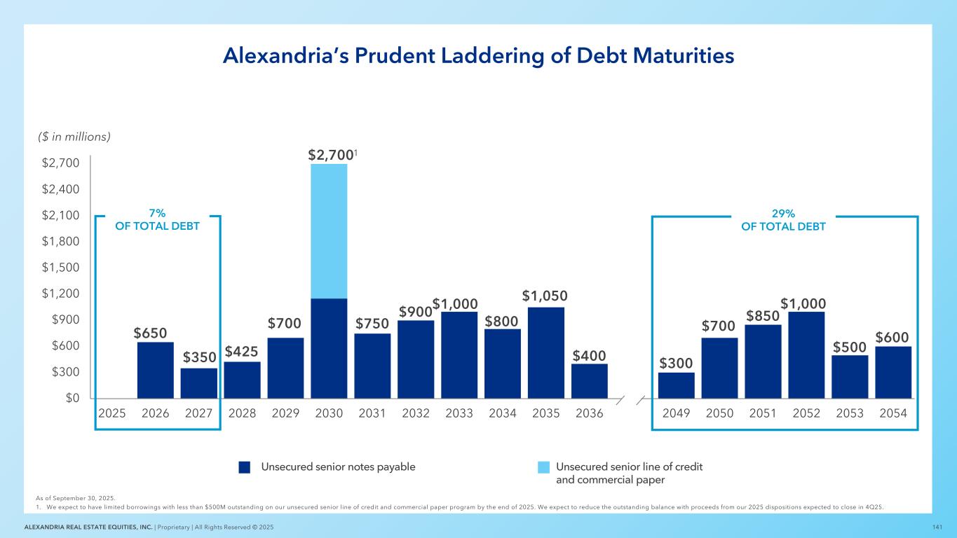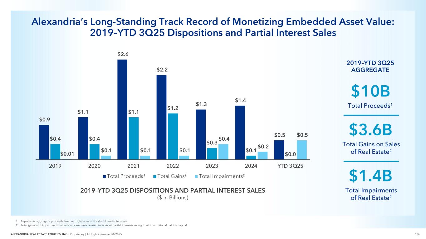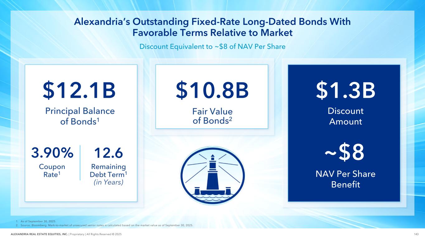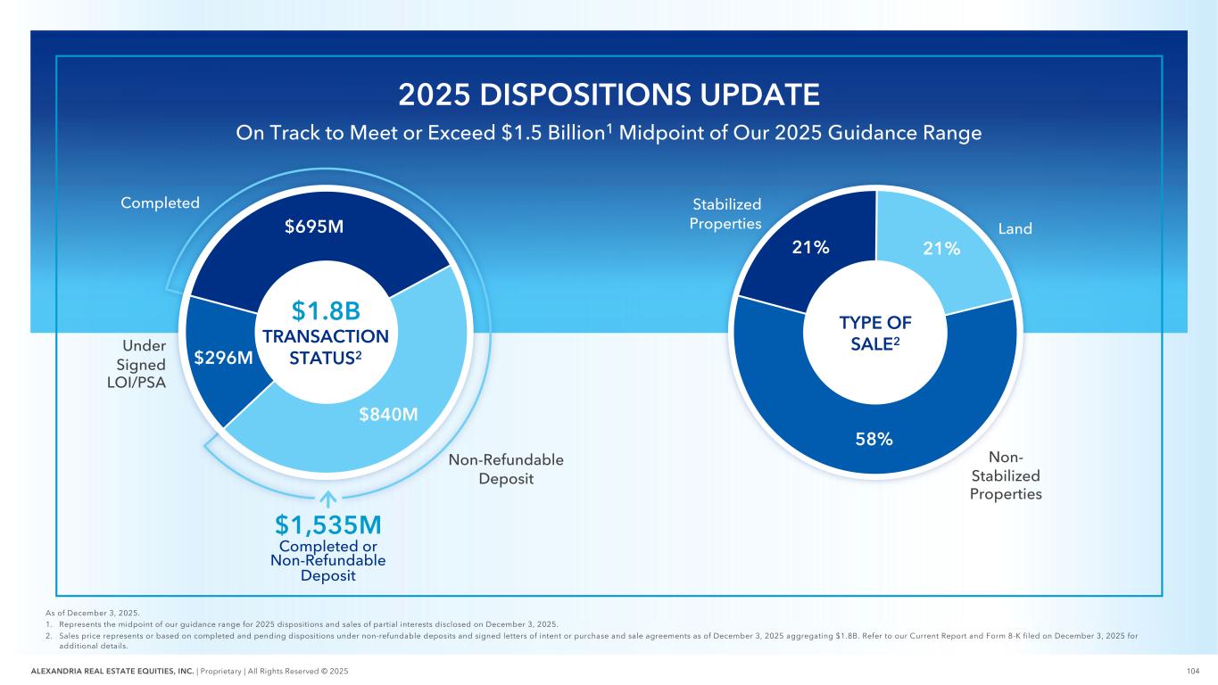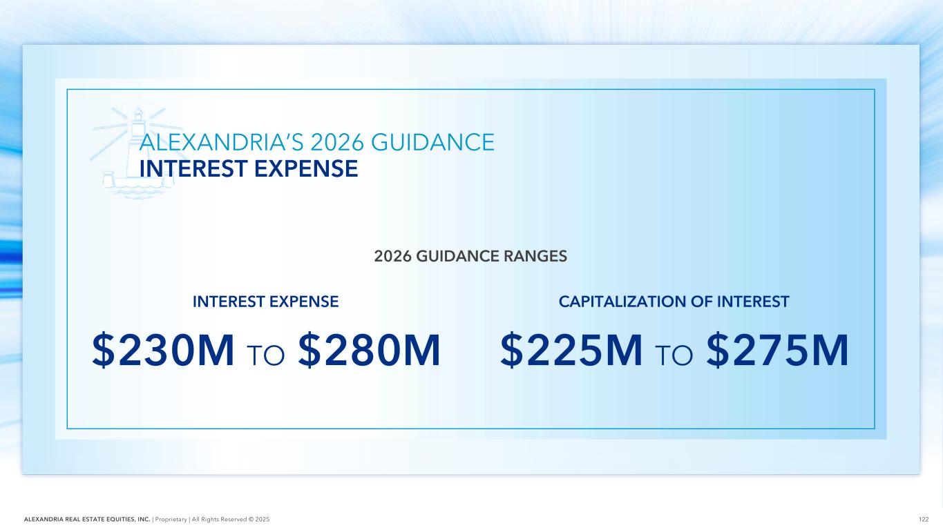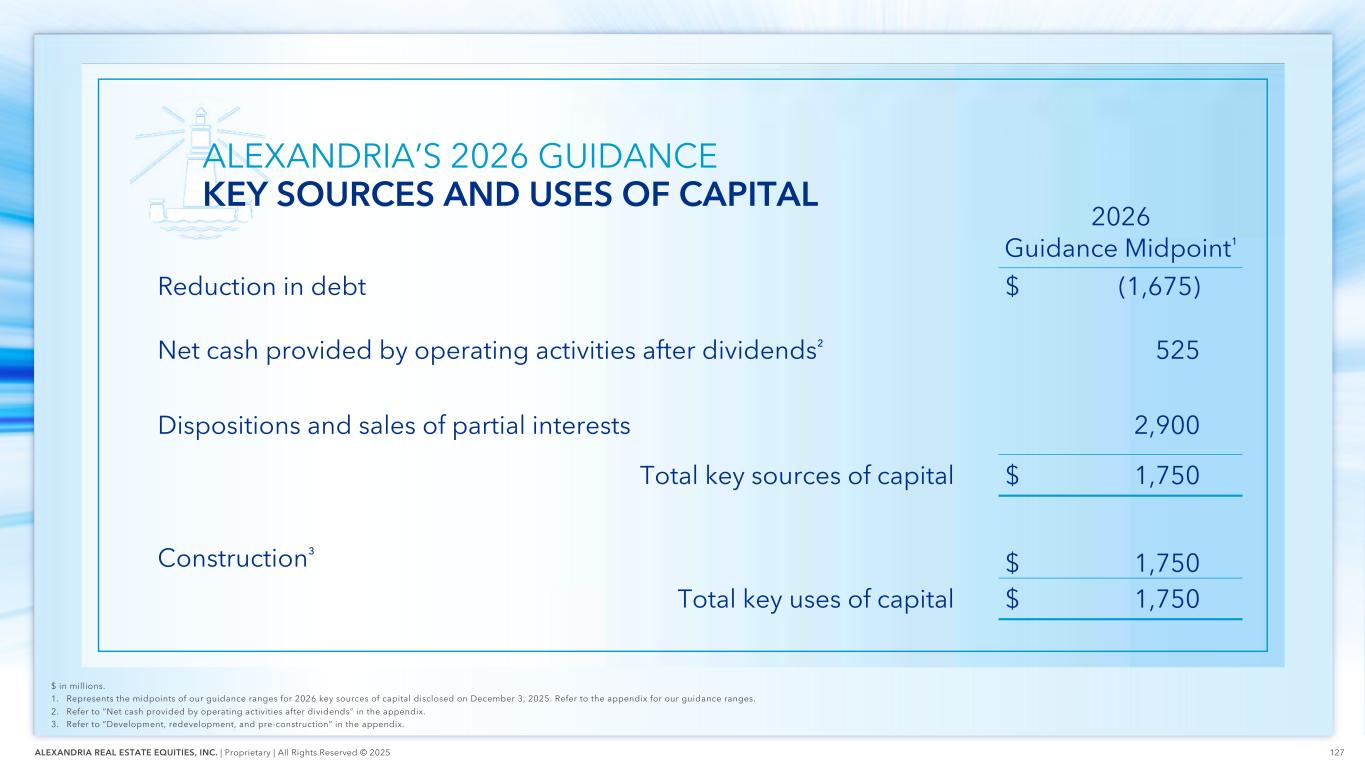 2ALEXANDRIA REAL ESTATE EQUITIES, INC. | Proprietary | All Rights Reserved © 2025 Safe Harbor Alexandria®, Lighthouse Design® logo, Building the Future of Life-Changing Innovation®, Megacampus™, Alexandria Center®, Alexandria Technology Center®, Alexandria Technology Square®, and The Miracle Mile of Medicine™ are copyrights and trademarks of Alexandria Real Estate Equities, Inc. All other company names, trademarks, and logos referenced herein are the property of their respective owners. This presentation contains forward-looking non-GAAP financial measures, including funds from operations, per share – diluted, as adjusted. We do not provide guidance for the most comparable GAAP financial measure or a reconciliation of the forward-looking non-GAAP financial measure of funds from operations, as adjusted, because we are unable to reasonably predict, without unreasonable effort, certain items that would be contained in the comparable GAAP measure, including items that are not indicative of our ongoing operations, such as, without limitation, unrealized gains or losses on non-real estate investments, potential impairments of real estate assets, and gains or losses on sales of real estate. These items are uncertain, depend on various factors, and could have a material impact on our GAAP results for the guidance periods. This presentation includes “forward-looking statements” within the meaning of Section 27A of the Securities Act of 1933, as amended, and Section 21E of the Securities Exchange Act of 1934, as amended. Such forward-looking statements include, without limitation, statements regarding our projected earnings per share attributable to Alexandria’s common stockholders – diluted, funds from operations per share attributable to Alexandria’s common stockholders – diluted, net operating income, sources and uses of capital, and targets and timing for rental revenues and development and value-creation projects, expenses, capital plan strategy, risk management strategy and related actions, and environmental, social, and governance goals. You can identify the forward-looking statements by their use of forward-looking words, such as “forecast,” “guidance,” “goals,” “projects,” “estimates,” “anticipates,” “believes,” “expects,” “intends,” “may,” “plans,” “seeks,” “should,” “targets,” or “will,” or the negative of those words or similar words. These forward-looking statements are based on our current expectations, beliefs, projections, future plans and strategies, anticipated events or trends, and similar expressions concerning matters that are not historical facts, as well as a number of assumptions concerning future events. There can be no assurance that actual results will not be materially higher or lower than these expectations. These statements are subject to risks, uncertainties, assumptions, and other important factors that could cause actual results to differ materially from the results discussed in the forward-looking statements. Factors that might cause such a difference include, without limitation, our failure to obtain capital (debt, construction financing, and/or equity) or refinance debt maturities, lower than expected yields, increased interest rates and construction and operating costs, adverse economic or real estate developments in our markets, greater than expected losses on disposition of properties, our failure to successfully place into service and lease any properties undergoing development or redevelopment and our existing space held for future development or redevelopment (including new properties acquired for that purpose), our failure to successfully operate or lease acquired or existing properties, decreased rental rates, increased vacancy rates or failure to renew or replace expiring leases, defaults on or non-renewal of leases by tenants, adverse general and local economic conditions, an unfavorable capital market environment, volatile, unfavorable, or uncertain social and political conditions (including the effects of new laws, regulations, and policies), decreased leasing activity or lease renewals, failure to obtain LEED and other healthy building certifications and efficiencies, and other risks and uncertainties detailed in our filings with the Securities and Exchange Commission (“SEC”). Accordingly, you are cautioned not to place undue reliance on such forward-looking statements. Other than as may be required by law, we assume no obligation to update this information and expressly disclaim any obligation to update or revise any forward-looking statements, whether as a result of new information, future events, or otherwise. For more discussion relating to risks and uncertainties that could cause actual results to differ materially from those anticipated in our forward-looking statements, and risks to our business in general, please refer to our SEC filings, including our most recent annual report on Form 10-K and any subsequent quarterly reports on Form 10-Q.