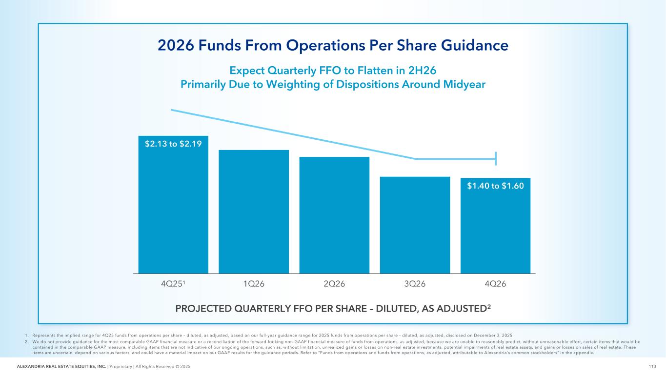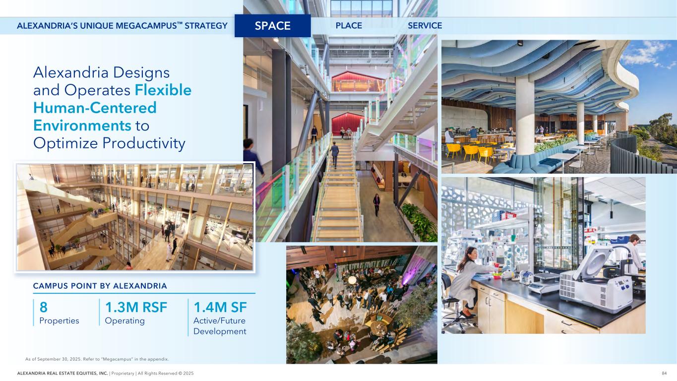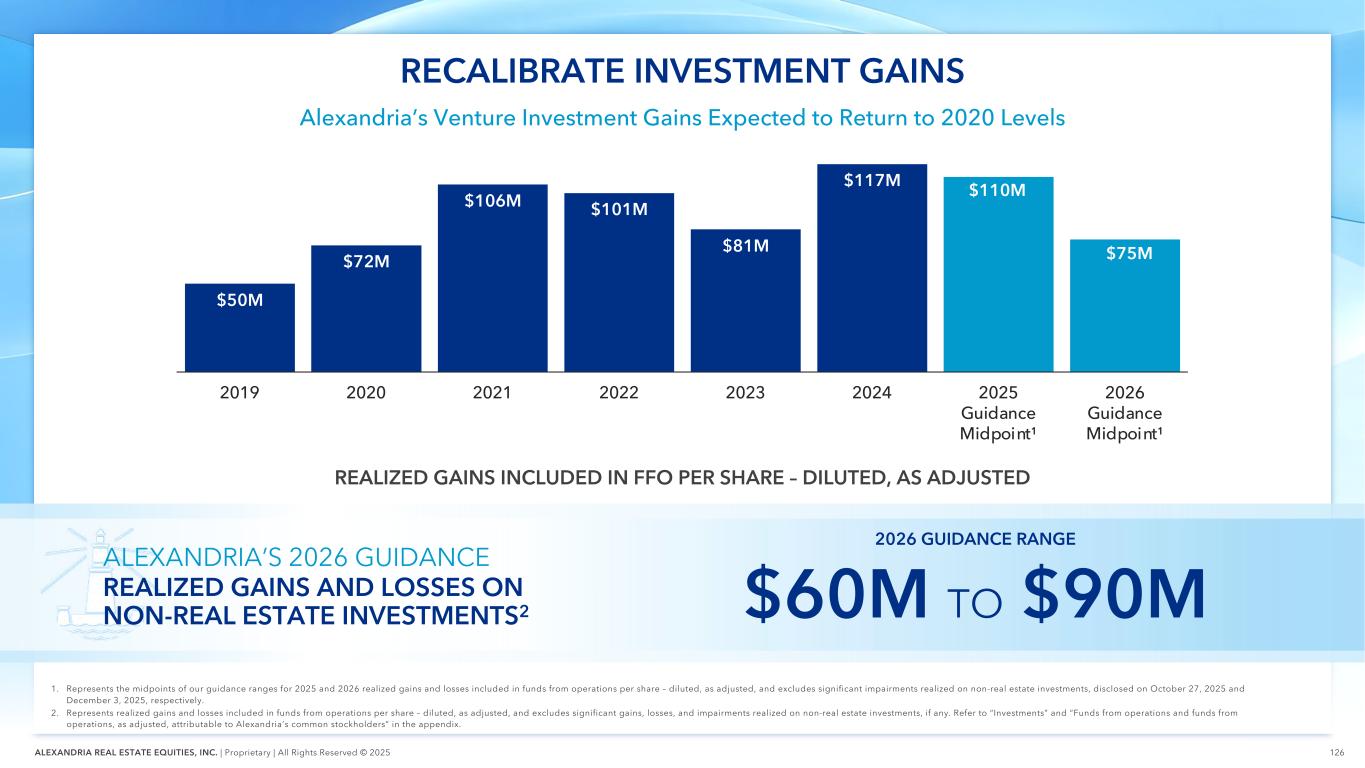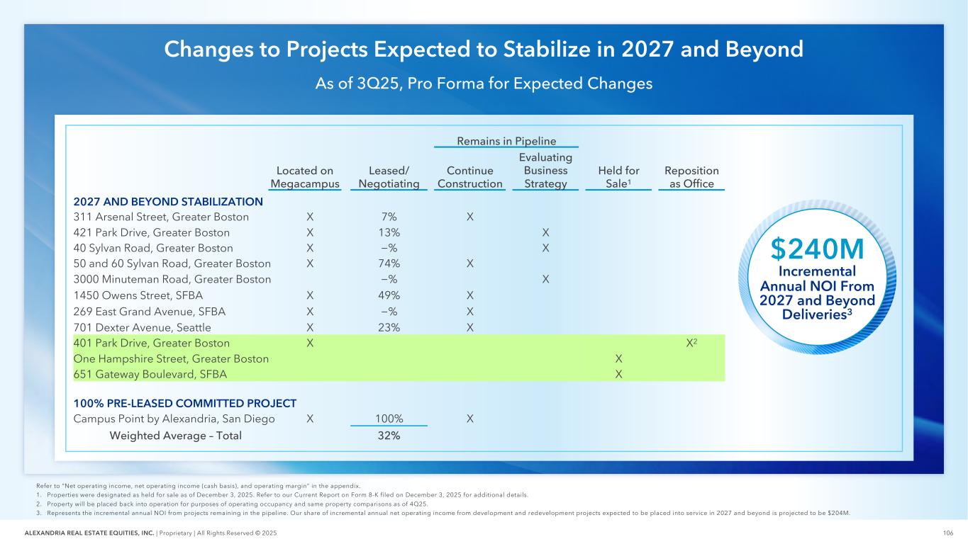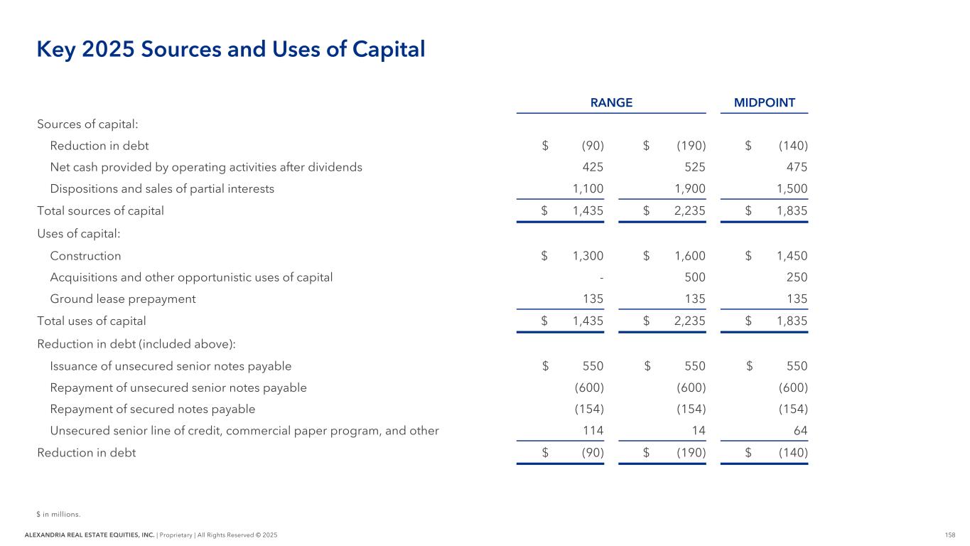 2ALEXANDRIA REAL ESTATE EQUITIES, INC. | Proprietary | All Rights Reserved © 2025 Safe Harbor Alexandria®, Lighthouse Design® logo, Building the Future of Life-Changing Innovation®, Megacampus™, Alexandria Center®, Alexandria Technology Center®, Alexandria Technology Square®, and The Miracle Mile of Medicine™ are copyrights and trademarks of Alexandria Real Estate Equities, Inc. All other company names, trademarks, and logos referenced herein are the property of their respective owners. This presentation contains forward-looking non-GAAP financial measures, including funds from operations, per share – diluted, as adjusted. We do not provide guidance for the most comparable GAAP financial measure or a reconciliation of the forward-looking non-GAAP financial measure of funds from operations, as adjusted, because we are unable to reasonably predict, without unreasonable effort, certain items that would be contained in the comparable GAAP measure, including items that are not indicative of our ongoing operations, such as, without limitation, unrealized gains or losses on non-real estate investments, potential impairments of real estate assets, and gains or losses on sales of real estate. These items are uncertain, depend on various factors, and could have a material impact on our GAAP results for the guidance periods. This presentation includes “forward-looking statements” within the meaning of Section 27A of the Securities Act of 1933, as amended, and Section 21E of the Securities Exchange Act of 1934, as amended. Such forward-looking statements include, without limitation, statements regarding our projected earnings per share attributable to Alexandria’s common stockholders – diluted, funds from operations per share attributable to Alexandria’s common stockholders – diluted, net operating income, sources and uses of capital, and targets and timing for rental revenues and development and value-creation projects, expenses, capital plan strategy, risk management strategy and related actions, and environmental, social, and governance goals. You can identify the forward-looking statements by their use of forward-looking words, such as “forecast,” “guidance,” “goals,” “projects,” “estimates,” “anticipates,” “believes,” “expects,” “intends,” “may,” “plans,” “seeks,” “should,” “targets,” or “will,” or the negative of those words or similar words. These forward-looking statements are based on our current expectations, beliefs, projections, future plans and strategies, anticipated events or trends, and similar expressions concerning matters that are not historical facts, as well as a number of assumptions concerning future events. There can be no assurance that actual results will not be materially higher or lower than these expectations. These statements are subject to risks, uncertainties, assumptions, and other important factors that could cause actual results to differ materially from the results discussed in the forward-looking statements. Factors that might cause such a difference include, without limitation, our failure to obtain capital (debt, construction financing, and/or equity) or refinance debt maturities, lower than expected yields, increased interest rates and construction and operating costs, adverse economic or real estate developments in our markets, greater than expected losses on disposition of properties, our failure to successfully place into service and lease any properties undergoing development or redevelopment and our existing space held for future development or redevelopment (including new properties acquired for that purpose), our failure to successfully operate or lease acquired or existing properties, decreased rental rates, increased vacancy rates or failure to renew or replace expiring leases, defaults on or non-renewal of leases by tenants, adverse general and local economic conditions, an unfavorable capital market environment, volatile, unfavorable, or uncertain social and political conditions (including the effects of new laws, regulations, and policies), decreased leasing activity or lease renewals, failure to obtain LEED and other healthy building certifications and efficiencies, and other risks and uncertainties detailed in our filings with the Securities and Exchange Commission (“SEC”). Accordingly, you are cautioned not to place undue reliance on such forward-looking statements. Other than as may be required by law, we assume no obligation to update this information and expressly disclaim any obligation to update or revise any forward-looking statements, whether as a result of new information, future events, or otherwise. For more discussion relating to risks and uncertainties that could cause actual results to differ materially from those anticipated in our forward-looking statements, and risks to our business in general, please refer to our SEC filings, including our most recent annual report on Form 10-K and any subsequent quarterly reports on Form 10-Q.