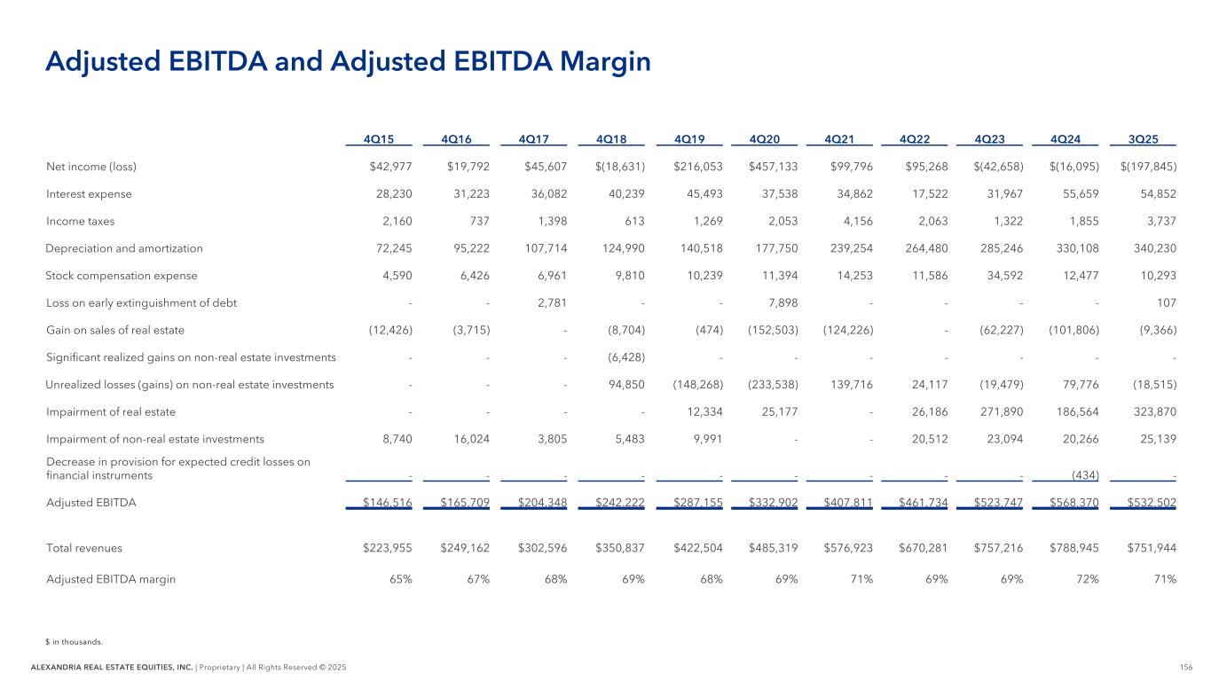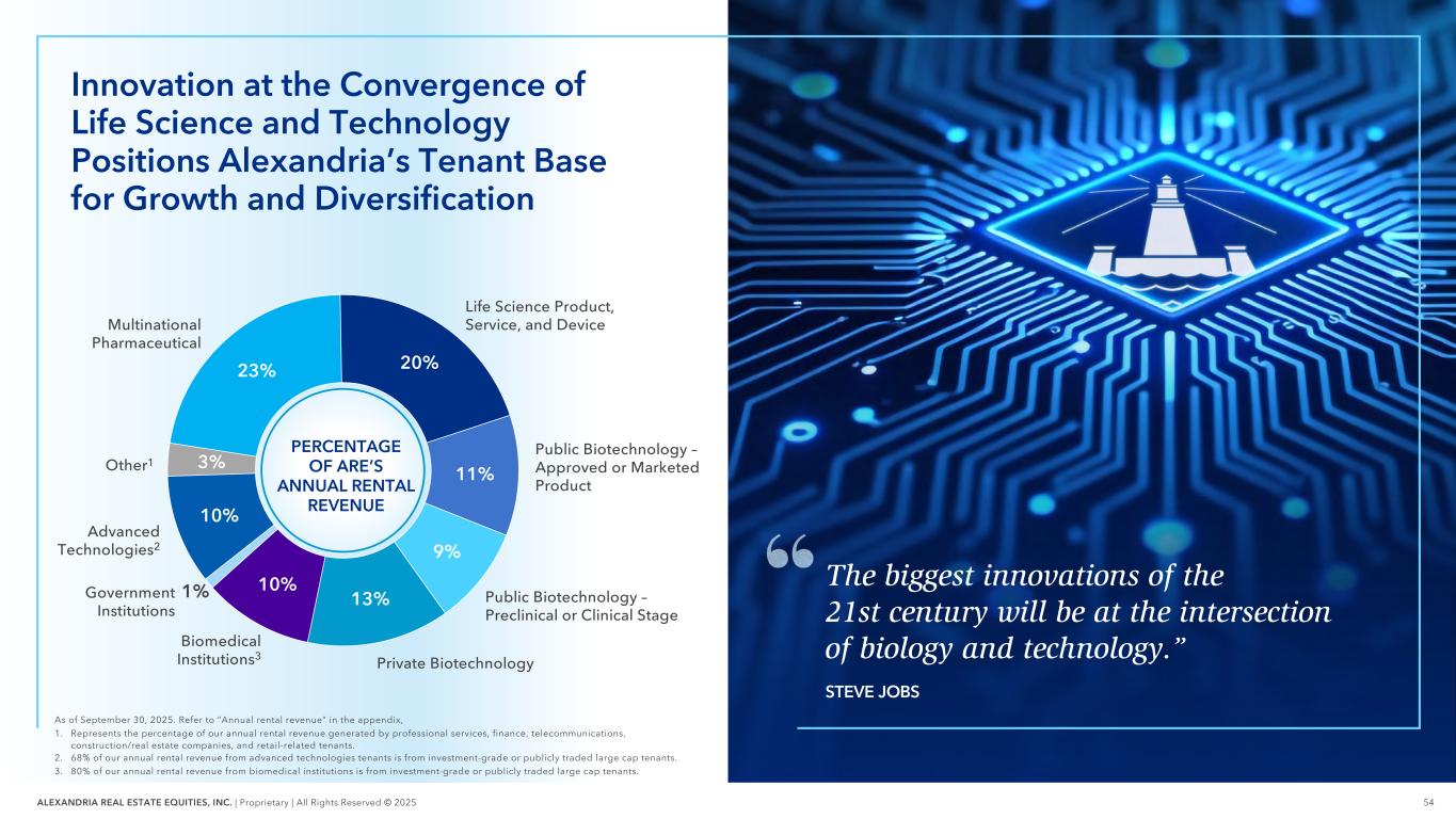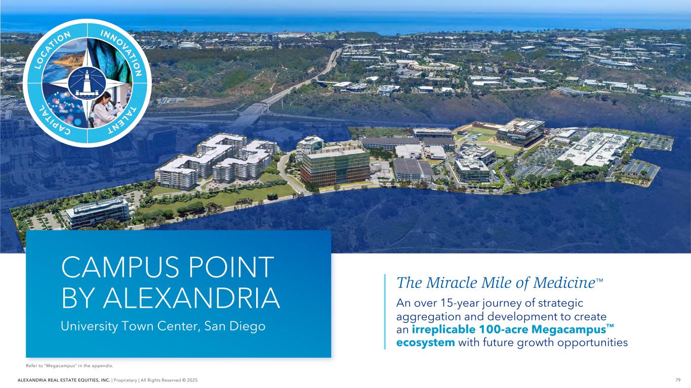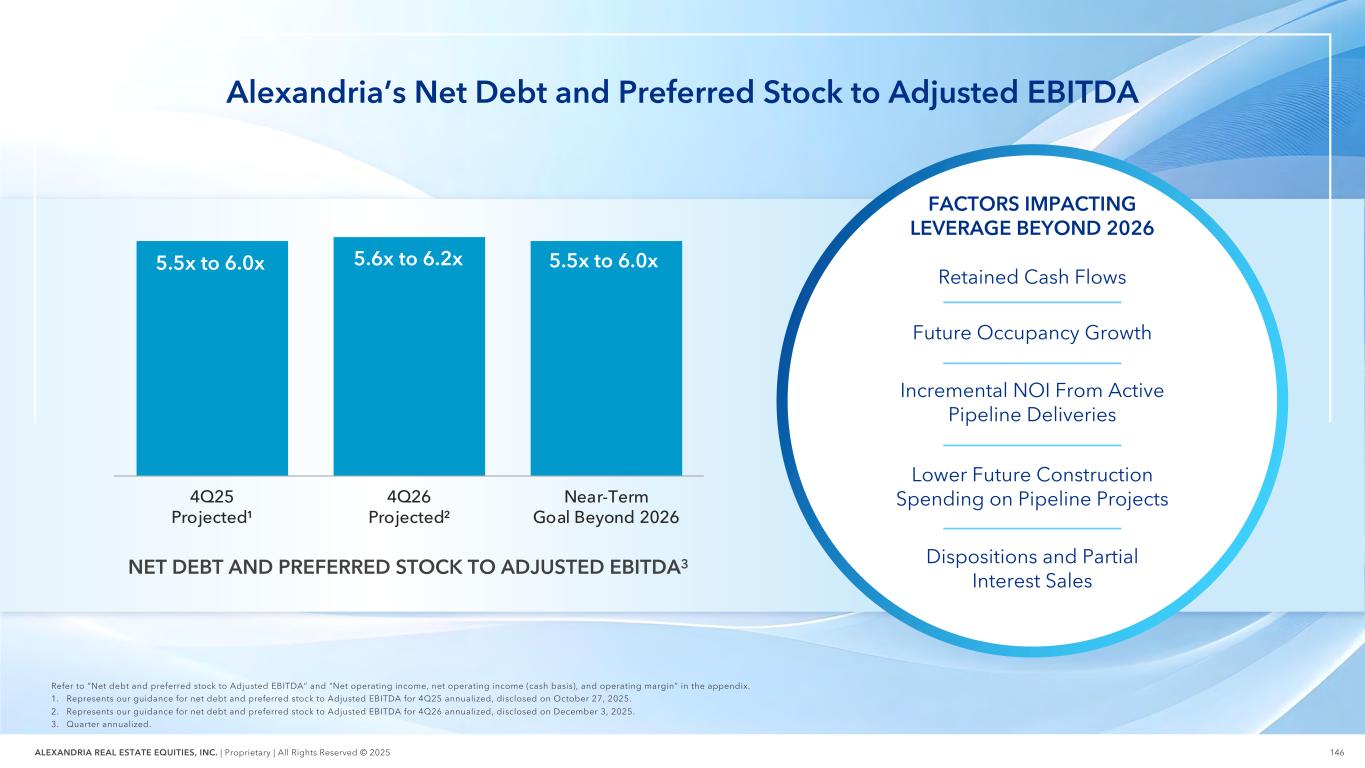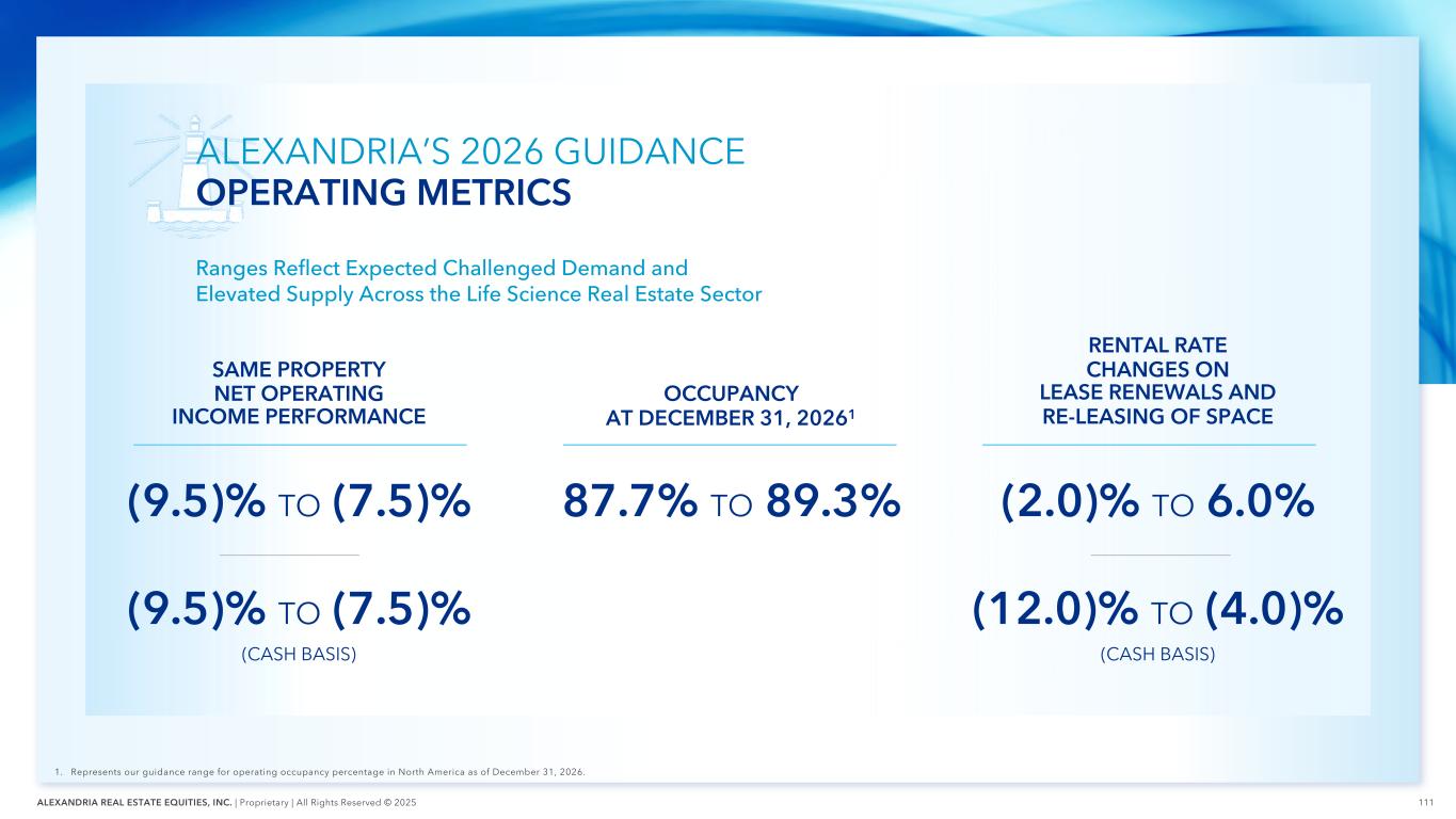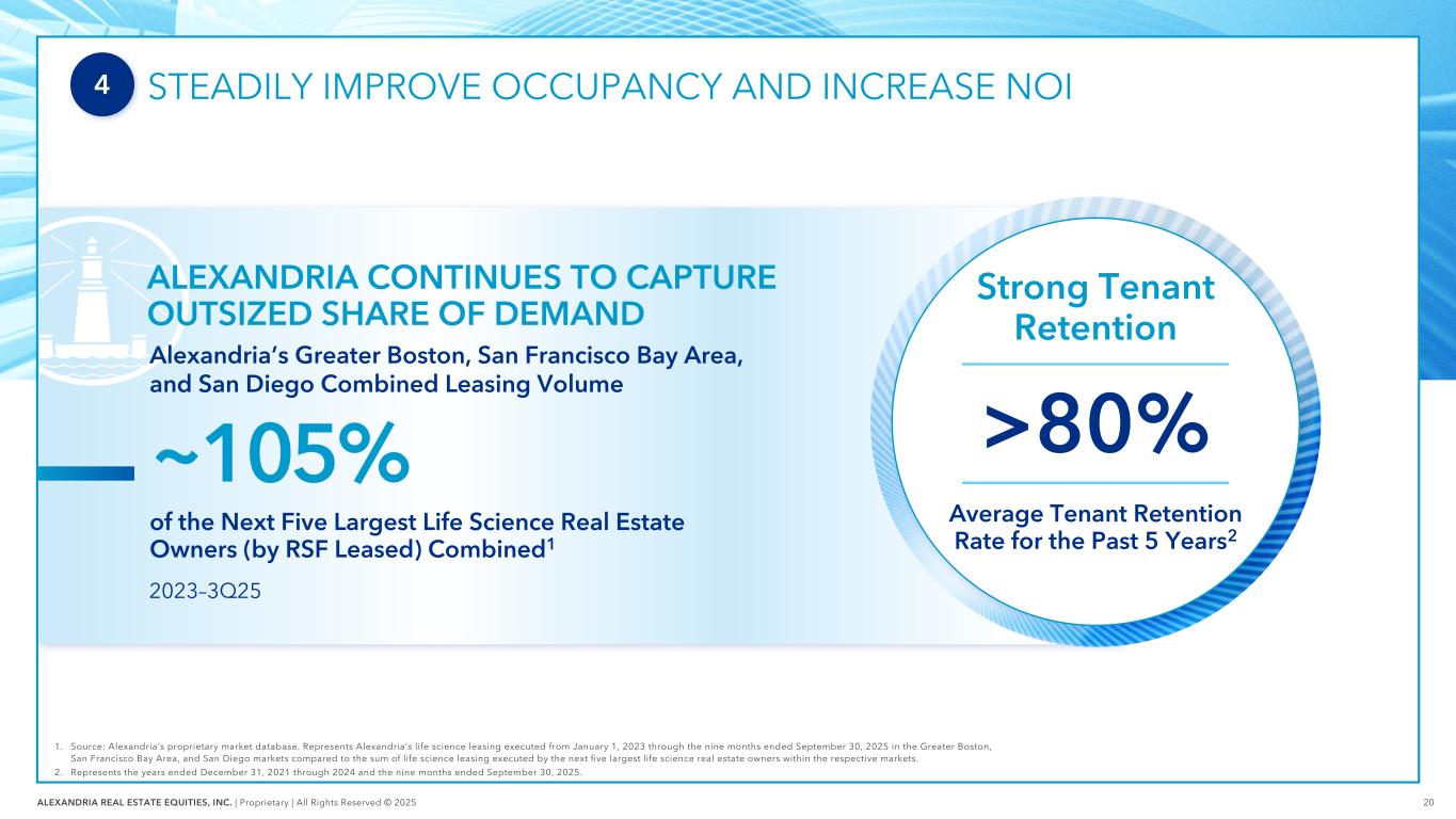 2ALEXANDRIA REAL ESTATE EQUITIES, INC. | Proprietary | All Rights Reserved © 2025 Safe Harbor Alexandria®, Lighthouse Design® logo, Building the Future of Life-Changing Innovation®, Megacampus™, Alexandria Center®, Alexandria Technology Center®, Alexandria Technology Square®, and The Miracle Mile of Medicine™ are copyrights and trademarks of Alexandria Real Estate Equities, Inc. All other company names, trademarks, and logos referenced herein are the property of their respective owners. This presentation contains forward-looking non-GAAP financial measures, including funds from operations, per share – diluted, as adjusted. We do not provide guidance for the most comparable GAAP financial measure or a reconciliation of the forward-looking non-GAAP financial measure of funds from operations, as adjusted, because we are unable to reasonably predict, without unreasonable effort, certain items that would be contained in the comparable GAAP measure, including items that are not indicative of our ongoing operations, such as, without limitation, unrealized gains or losses on non-real estate investments, potential impairments of real estate assets, and gains or losses on sales of real estate. These items are uncertain, depend on various factors, and could have a material impact on our GAAP results for the guidance periods. This presentation includes “forward-looking statements” within the meaning of Section 27A of the Securities Act of 1933, as amended, and Section 21E of the Securities Exchange Act of 1934, as amended. Such forward-looking statements include, without limitation, statements regarding our projected earnings per share attributable to Alexandria’s common stockholders – diluted, funds from operations per share attributable to Alexandria’s common stockholders – diluted, net operating income, sources and uses of capital, and targets and timing for rental revenues and development and value-creation projects, expenses, capital plan strategy, risk management strategy and related actions, and environmental, social, and governance goals. You can identify the forward-looking statements by their use of forward-looking words, such as “forecast,” “guidance,” “goals,” “projects,” “estimates,” “anticipates,” “believes,” “expects,” “intends,” “may,” “plans,” “seeks,” “should,” “targets,” or “will,” or the negative of those words or similar words. These forward-looking statements are based on our current expectations, beliefs, projections, future plans and strategies, anticipated events or trends, and similar expressions concerning matters that are not historical facts, as well as a number of assumptions concerning future events. There can be no assurance that actual results will not be materially higher or lower than these expectations. These statements are subject to risks, uncertainties, assumptions, and other important factors that could cause actual results to differ materially from the results discussed in the forward-looking statements. Factors that might cause such a difference include, without limitation, our failure to obtain capital (debt, construction financing, and/or equity) or refinance debt maturities, lower than expected yields, increased interest rates and construction and operating costs, adverse economic or real estate developments in our markets, greater than expected losses on disposition of properties, our failure to successfully place into service and lease any properties undergoing development or redevelopment and our existing space held for future development or redevelopment (including new properties acquired for that purpose), our failure to successfully operate or lease acquired or existing properties, decreased rental rates, increased vacancy rates or failure to renew or replace expiring leases, defaults on or non-renewal of leases by tenants, adverse general and local economic conditions, an unfavorable capital market environment, volatile, unfavorable, or uncertain social and political conditions (including the effects of new laws, regulations, and policies), decreased leasing activity or lease renewals, failure to obtain LEED and other healthy building certifications and efficiencies, and other risks and uncertainties detailed in our filings with the Securities and Exchange Commission (“SEC”). Accordingly, you are cautioned not to place undue reliance on such forward-looking statements. Other than as may be required by law, we assume no obligation to update this information and expressly disclaim any obligation to update or revise any forward-looking statements, whether as a result of new information, future events, or otherwise. For more discussion relating to risks and uncertainties that could cause actual results to differ materially from those anticipated in our forward-looking statements, and risks to our business in general, please refer to our SEC filings, including our most recent annual report on Form 10-K and any subsequent quarterly reports on Form 10-Q.