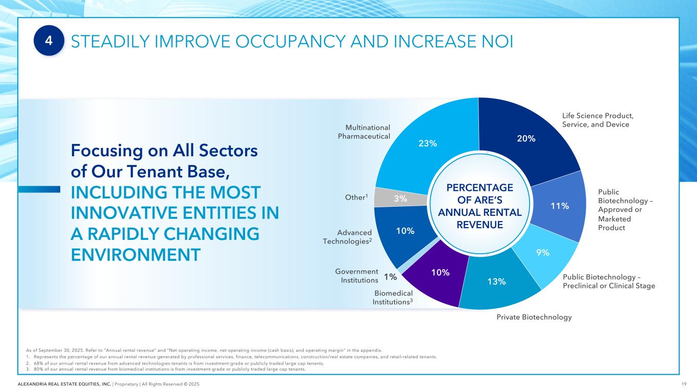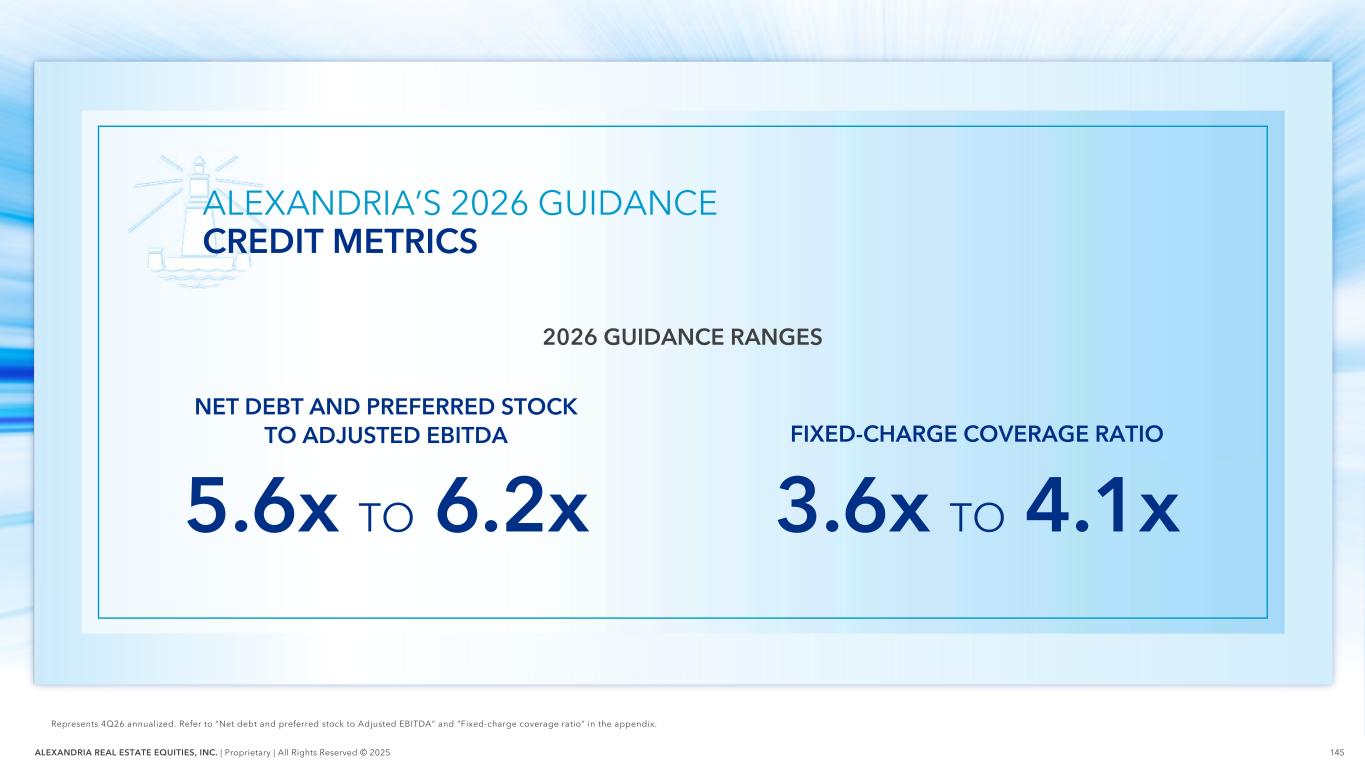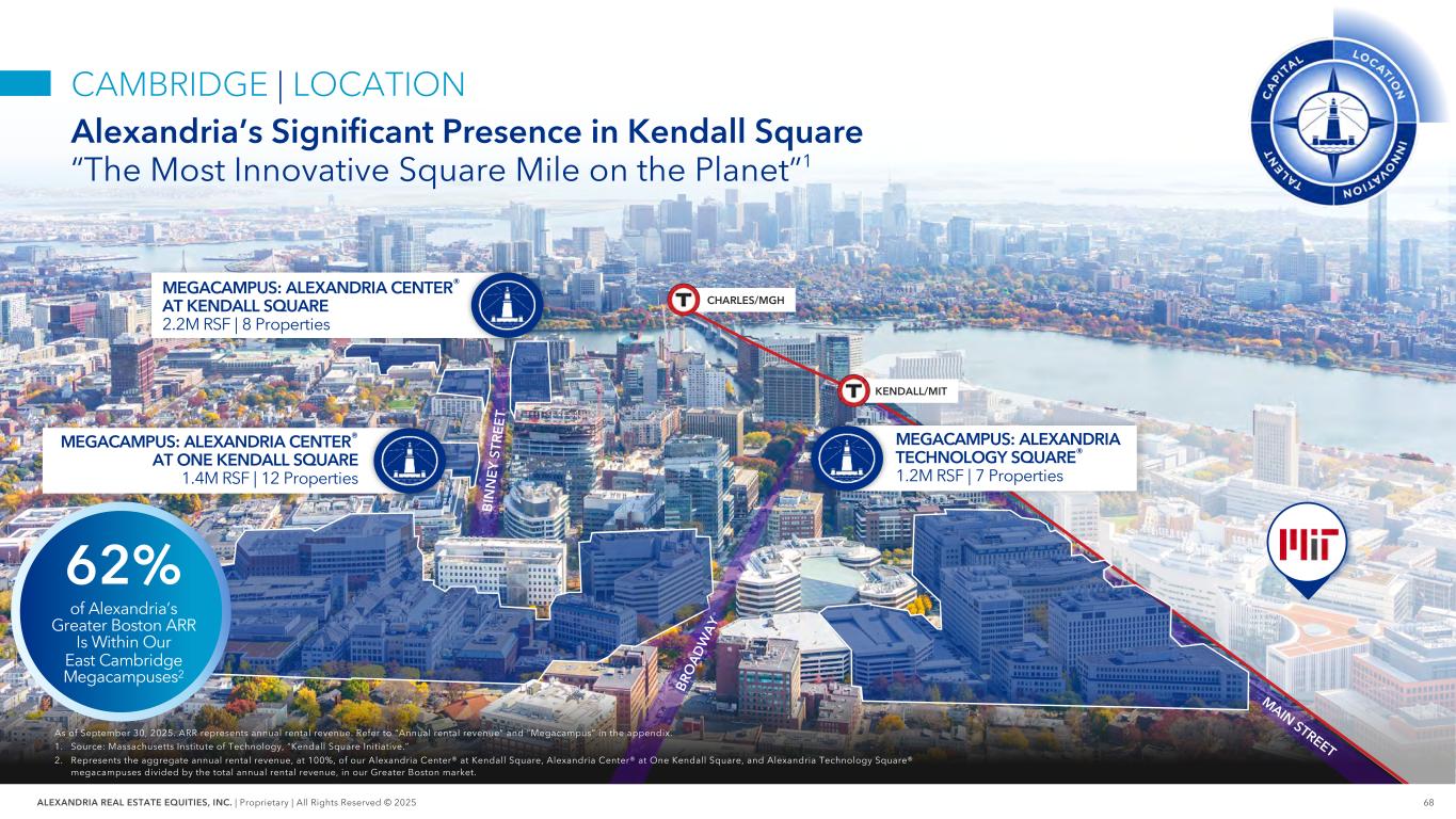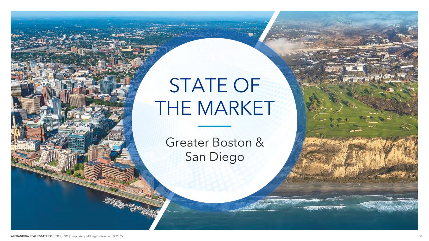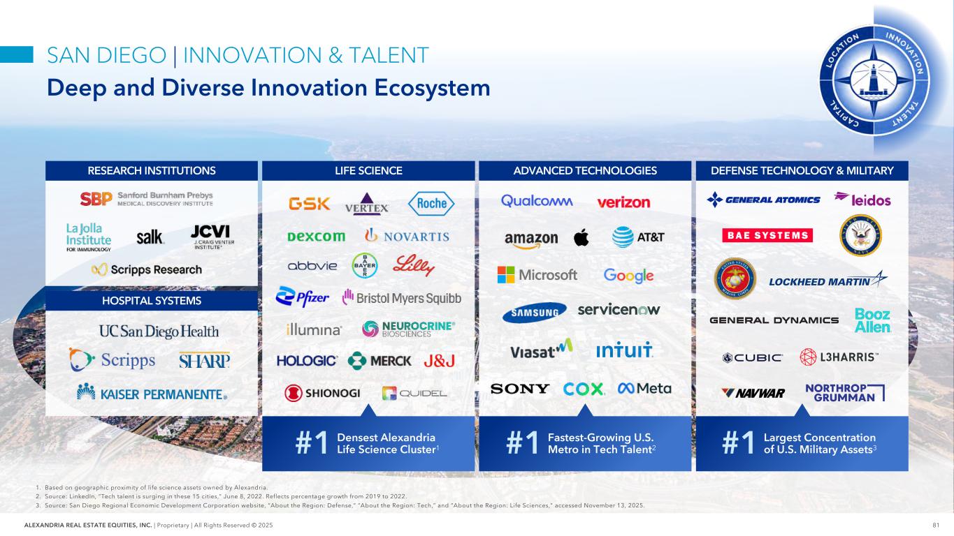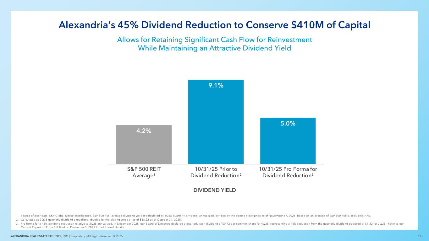 2ALEXANDRIA REAL ESTATE EQUITIES, INC. | Proprietary | All Rights Reserved © 2025 Safe Harbor Alexandria®, Lighthouse Design® logo, Building the Future of Life-Changing Innovation®, Megacampus™, Alexandria Center®, Alexandria Technology Center®, Alexandria Technology Square®, and The Miracle Mile of Medicine™ are copyrights and trademarks of Alexandria Real Estate Equities, Inc. All other company names, trademarks, and logos referenced herein are the property of their respective owners. This presentation contains forward-looking non-GAAP financial measures, including funds from operations, per share – diluted, as adjusted. We do not provide guidance for the most comparable GAAP financial measure or a reconciliation of the forward-looking non-GAAP financial measure of funds from operations, as adjusted, because we are unable to reasonably predict, without unreasonable effort, certain items that would be contained in the comparable GAAP measure, including items that are not indicative of our ongoing operations, such as, without limitation, unrealized gains or losses on non-real estate investments, potential impairments of real estate assets, and gains or losses on sales of real estate. These items are uncertain, depend on various factors, and could have a material impact on our GAAP results for the guidance periods. This presentation includes “forward-looking statements” within the meaning of Section 27A of the Securities Act of 1933, as amended, and Section 21E of the Securities Exchange Act of 1934, as amended. Such forward-looking statements include, without limitation, statements regarding our projected earnings per share attributable to Alexandria’s common stockholders – diluted, funds from operations per share attributable to Alexandria’s common stockholders – diluted, net operating income, sources and uses of capital, and targets and timing for rental revenues and development and value-creation projects, expenses, capital plan strategy, risk management strategy and related actions, and environmental, social, and governance goals. You can identify the forward-looking statements by their use of forward-looking words, such as “forecast,” “guidance,” “goals,” “projects,” “estimates,” “anticipates,” “believes,” “expects,” “intends,” “may,” “plans,” “seeks,” “should,” “targets,” or “will,” or the negative of those words or similar words. These forward-looking statements are based on our current expectations, beliefs, projections, future plans and strategies, anticipated events or trends, and similar expressions concerning matters that are not historical facts, as well as a number of assumptions concerning future events. There can be no assurance that actual results will not be materially higher or lower than these expectations. These statements are subject to risks, uncertainties, assumptions, and other important factors that could cause actual results to differ materially from the results discussed in the forward-looking statements. Factors that might cause such a difference include, without limitation, our failure to obtain capital (debt, construction financing, and/or equity) or refinance debt maturities, lower than expected yields, increased interest rates and construction and operating costs, adverse economic or real estate developments in our markets, greater than expected losses on disposition of properties, our failure to successfully place into service and lease any properties undergoing development or redevelopment and our existing space held for future development or redevelopment (including new properties acquired for that purpose), our failure to successfully operate or lease acquired or existing properties, decreased rental rates, increased vacancy rates or failure to renew or replace expiring leases, defaults on or non-renewal of leases by tenants, adverse general and local economic conditions, an unfavorable capital market environment, volatile, unfavorable, or uncertain social and political conditions (including the effects of new laws, regulations, and policies), decreased leasing activity or lease renewals, failure to obtain LEED and other healthy building certifications and efficiencies, and other risks and uncertainties detailed in our filings with the Securities and Exchange Commission (“SEC”). Accordingly, you are cautioned not to place undue reliance on such forward-looking statements. Other than as may be required by law, we assume no obligation to update this information and expressly disclaim any obligation to update or revise any forward-looking statements, whether as a result of new information, future events, or otherwise. For more discussion relating to risks and uncertainties that could cause actual results to differ materially from those anticipated in our forward-looking statements, and risks to our business in general, please refer to our SEC filings, including our most recent annual report on Form 10-K and any subsequent quarterly reports on Form 10-Q.
