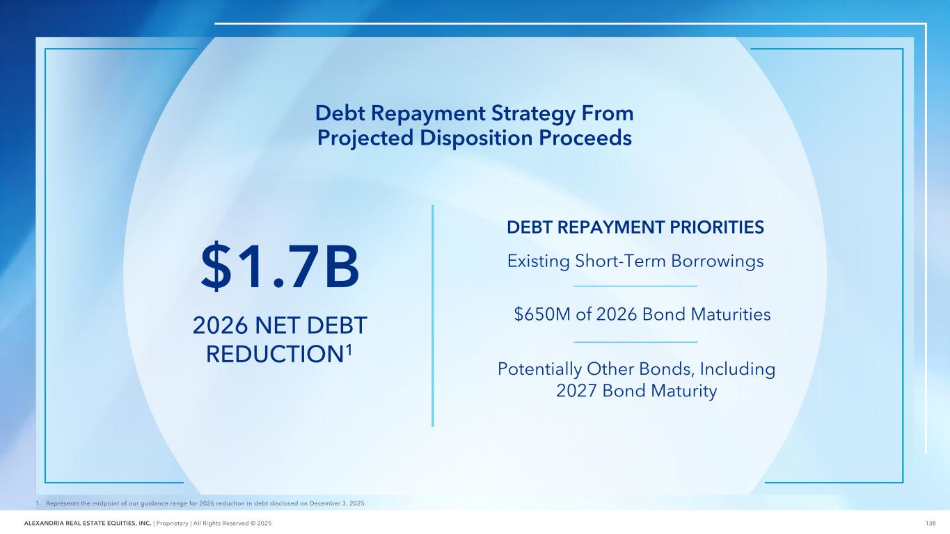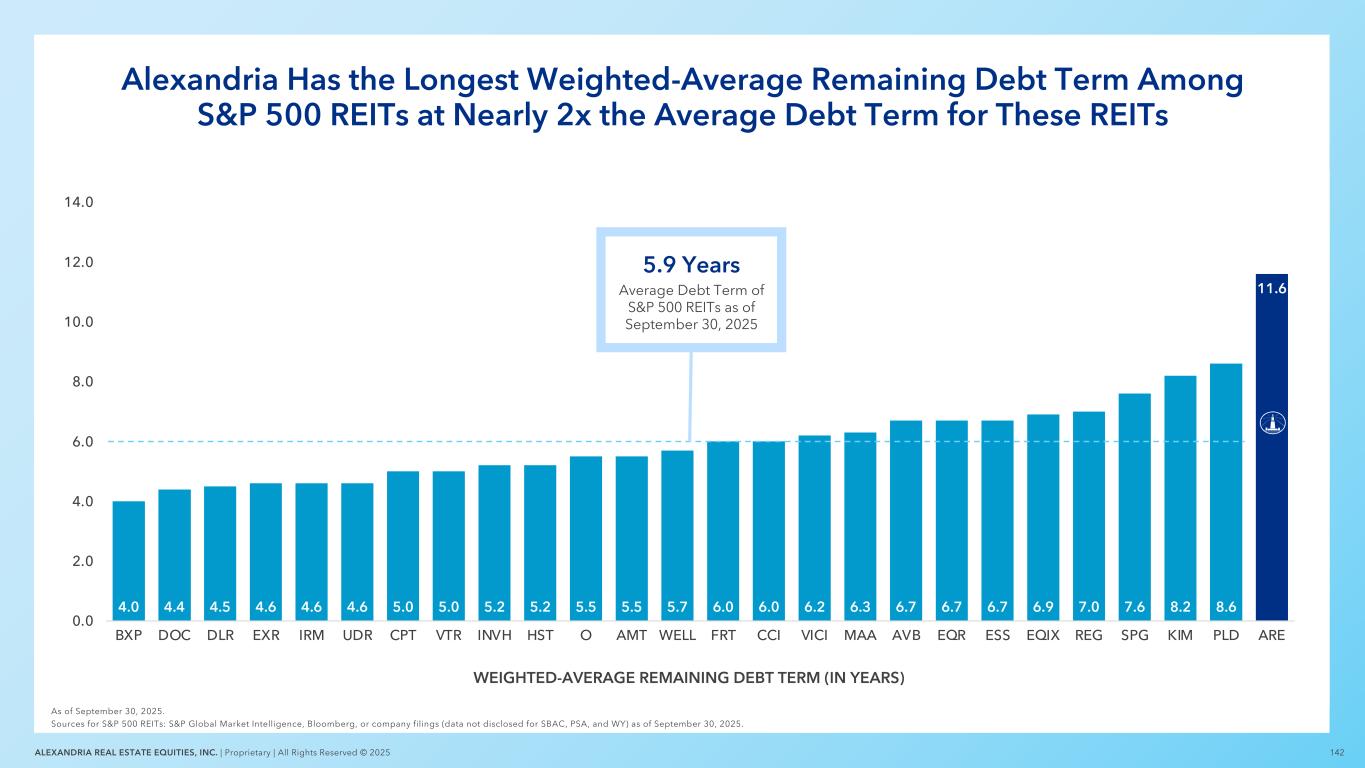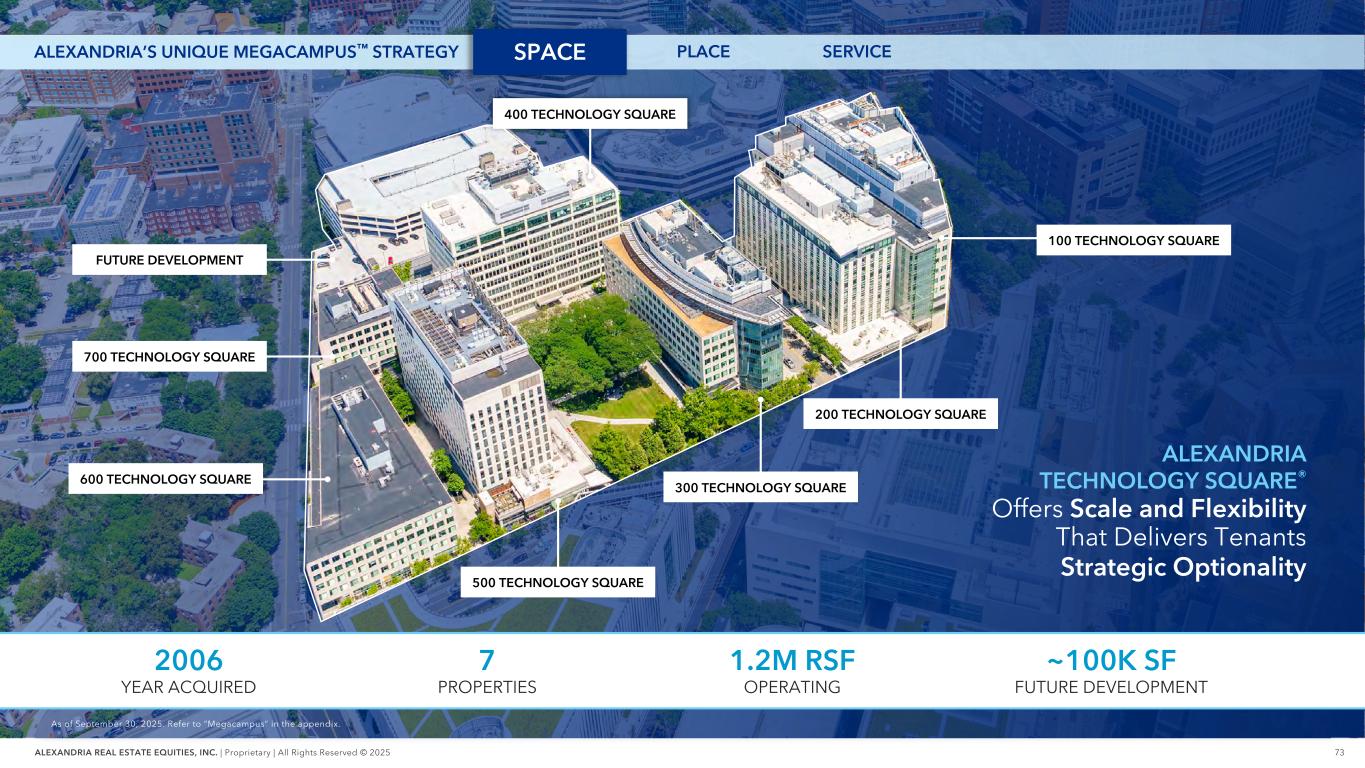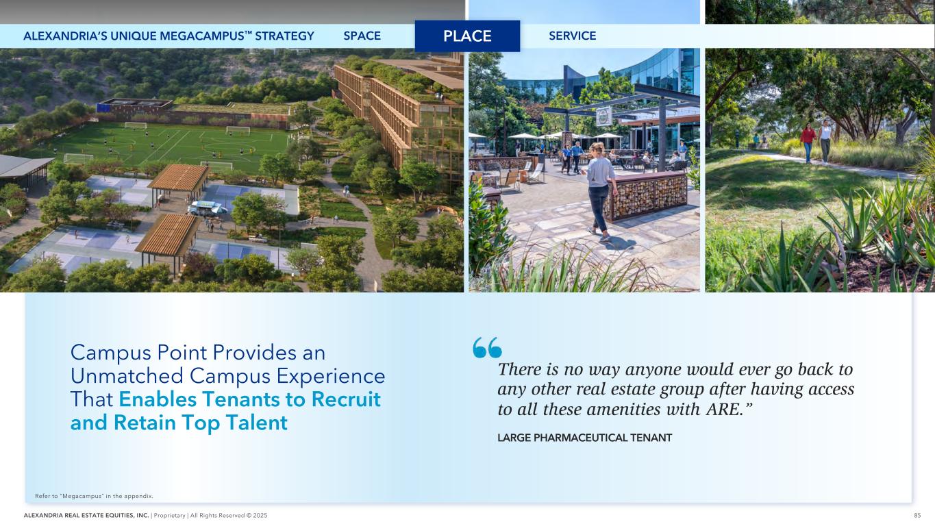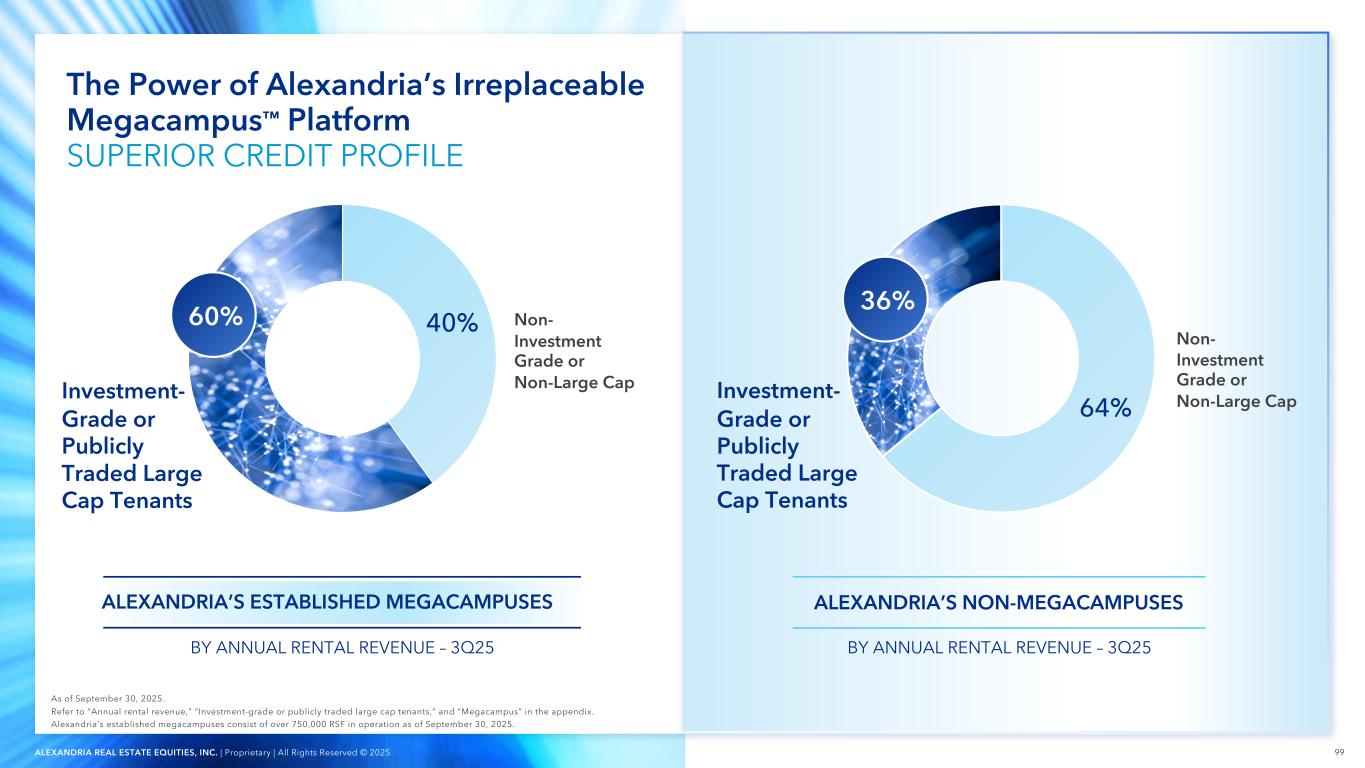 2ALEXANDRIA REAL ESTATE EQUITIES, INC. | Proprietary | All Rights Reserved © 2025 Safe Harbor Alexandria®, Lighthouse Design® logo, Building the Future of Life-Changing Innovation®, Megacampus™, Alexandria Center®, Alexandria Technology Center®, Alexandria Technology Square®, and The Miracle Mile of Medicine™ are copyrights and trademarks of Alexandria Real Estate Equities, Inc. All other company names, trademarks, and logos referenced herein are the property of their respective owners. This presentation contains forward-looking non-GAAP financial measures, including funds from operations, per share – diluted, as adjusted. We do not provide guidance for the most comparable GAAP financial measure or a reconciliation of the forward-looking non-GAAP financial measure of funds from operations, as adjusted, because we are unable to reasonably predict, without unreasonable effort, certain items that would be contained in the comparable GAAP measure, including items that are not indicative of our ongoing operations, such as, without limitation, unrealized gains or losses on non-real estate investments, potential impairments of real estate assets, and gains or losses on sales of real estate. These items are uncertain, depend on various factors, and could have a material impact on our GAAP results for the guidance periods. This presentation includes “forward-looking statements” within the meaning of Section 27A of the Securities Act of 1933, as amended, and Section 21E of the Securities Exchange Act of 1934, as amended. Such forward-looking statements include, without limitation, statements regarding our projected earnings per share attributable to Alexandria’s common stockholders – diluted, funds from operations per share attributable to Alexandria’s common stockholders – diluted, net operating income, sources and uses of capital, and targets and timing for rental revenues and development and value-creation projects, expenses, capital plan strategy, risk management strategy and related actions, and environmental, social, and governance goals. You can identify the forward-looking statements by their use of forward-looking words, such as “forecast,” “guidance,” “goals,” “projects,” “estimates,” “anticipates,” “believes,” “expects,” “intends,” “may,” “plans,” “seeks,” “should,” “targets,” or “will,” or the negative of those words or similar words. These forward-looking statements are based on our current expectations, beliefs, projections, future plans and strategies, anticipated events or trends, and similar expressions concerning matters that are not historical facts, as well as a number of assumptions concerning future events. There can be no assurance that actual results will not be materially higher or lower than these expectations. These statements are subject to risks, uncertainties, assumptions, and other important factors that could cause actual results to differ materially from the results discussed in the forward-looking statements. Factors that might cause such a difference include, without limitation, our failure to obtain capital (debt, construction financing, and/or equity) or refinance debt maturities, lower than expected yields, increased interest rates and construction and operating costs, adverse economic or real estate developments in our markets, greater than expected losses on disposition of properties, our failure to successfully place into service and lease any properties undergoing development or redevelopment and our existing space held for future development or redevelopment (including new properties acquired for that purpose), our failure to successfully operate or lease acquired or existing properties, decreased rental rates, increased vacancy rates or failure to renew or replace expiring leases, defaults on or non-renewal of leases by tenants, adverse general and local economic conditions, an unfavorable capital market environment, volatile, unfavorable, or uncertain social and political conditions (including the effects of new laws, regulations, and policies), decreased leasing activity or lease renewals, failure to obtain LEED and other healthy building certifications and efficiencies, and other risks and uncertainties detailed in our filings with the Securities and Exchange Commission (“SEC”). Accordingly, you are cautioned not to place undue reliance on such forward-looking statements. Other than as may be required by law, we assume no obligation to update this information and expressly disclaim any obligation to update or revise any forward-looking statements, whether as a result of new information, future events, or otherwise. For more discussion relating to risks and uncertainties that could cause actual results to differ materially from those anticipated in our forward-looking statements, and risks to our business in general, please refer to our SEC filings, including our most recent annual report on Form 10-K and any subsequent quarterly reports on Form 10-Q.