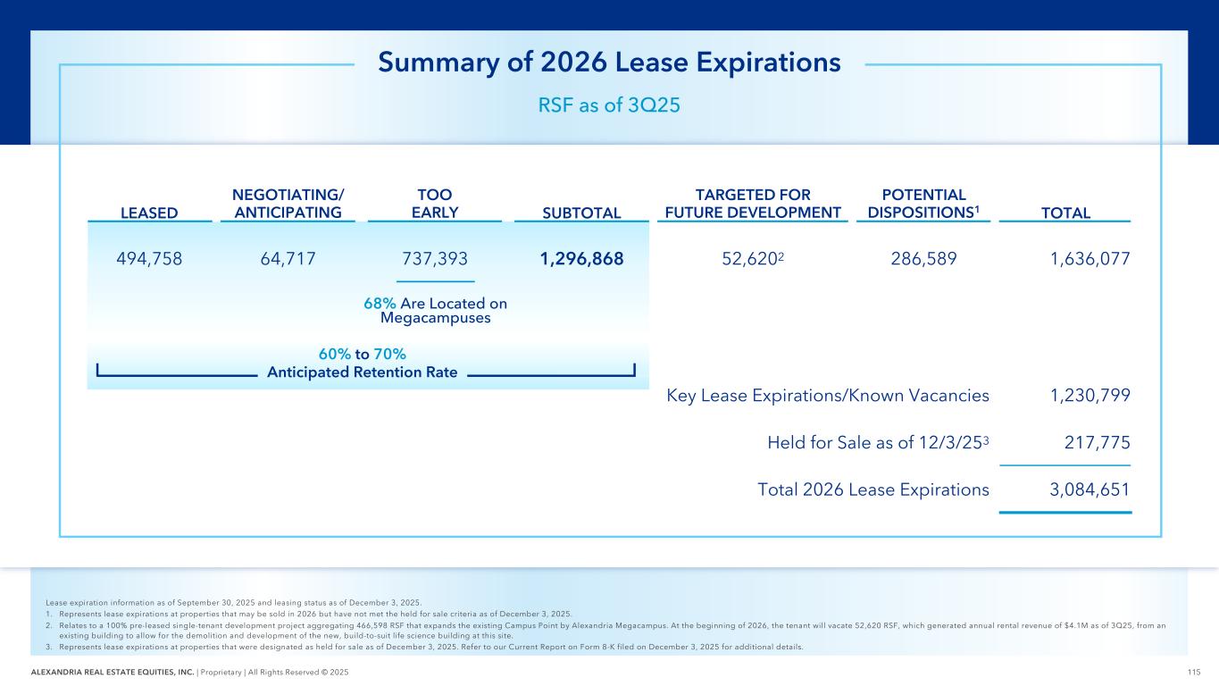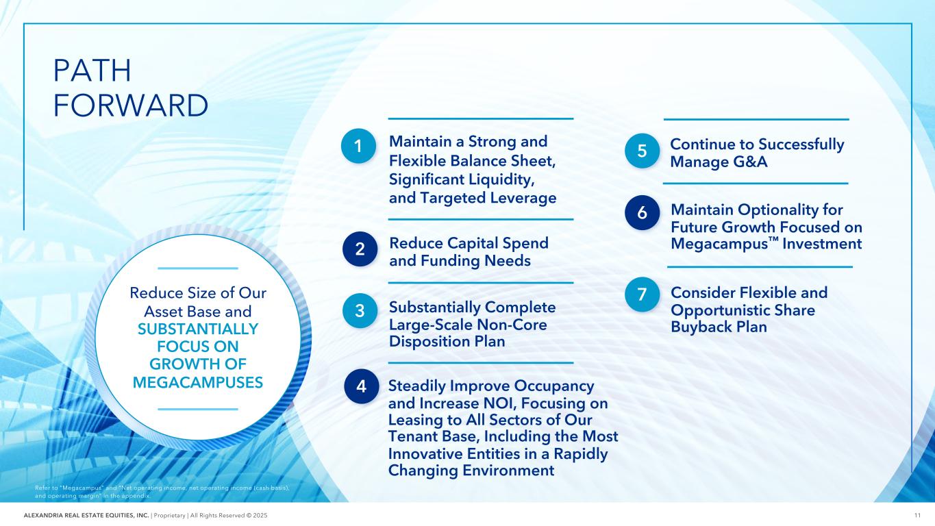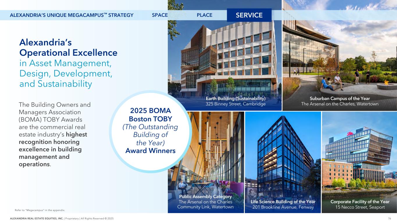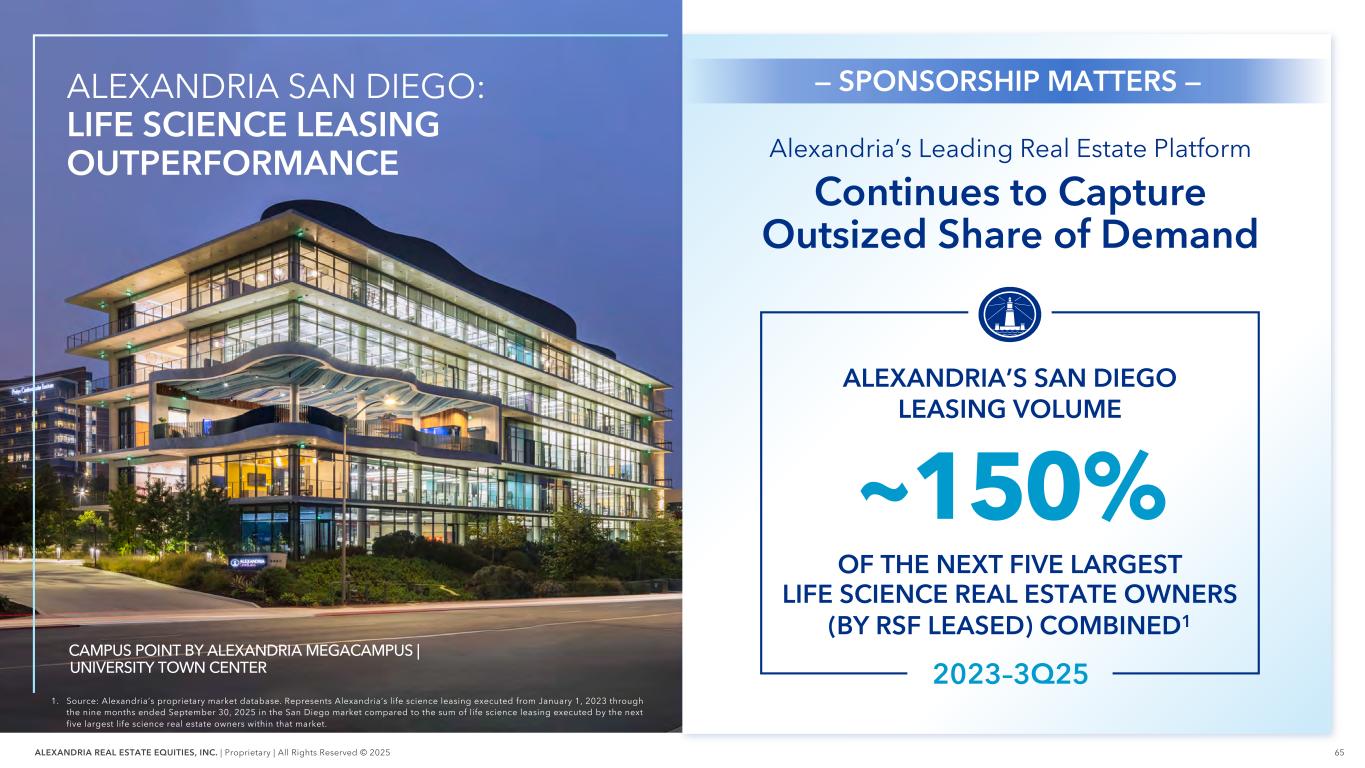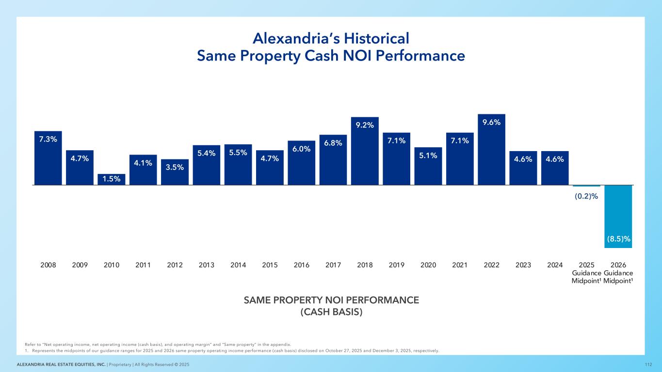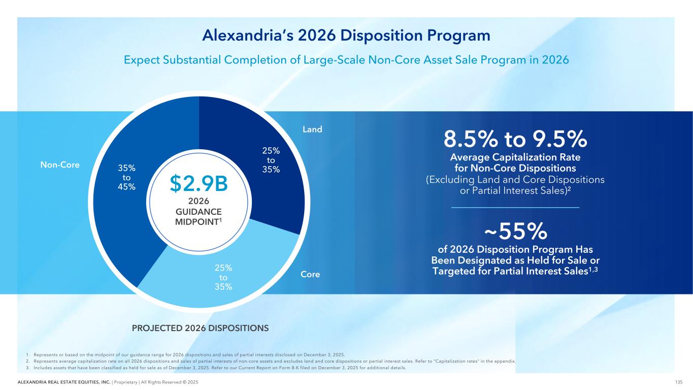 2ALEXANDRIA REAL ESTATE EQUITIES, INC. | Proprietary | All Rights Reserved © 2025 Safe Harbor Alexandria®, Lighthouse Design® logo, Building the Future of Life-Changing Innovation®, Megacampus™, Alexandria Center®, Alexandria Technology Center®, Alexandria Technology Square®, and The Miracle Mile of Medicine™ are copyrights and trademarks of Alexandria Real Estate Equities, Inc. All other company names, trademarks, and logos referenced herein are the property of their respective owners. This presentation contains forward-looking non-GAAP financial measures, including funds from operations, per share – diluted, as adjusted. We do not provide guidance for the most comparable GAAP financial measure or a reconciliation of the forward-looking non-GAAP financial measure of funds from operations, as adjusted, because we are unable to reasonably predict, without unreasonable effort, certain items that would be contained in the comparable GAAP measure, including items that are not indicative of our ongoing operations, such as, without limitation, unrealized gains or losses on non-real estate investments, potential impairments of real estate assets, and gains or losses on sales of real estate. These items are uncertain, depend on various factors, and could have a material impact on our GAAP results for the guidance periods. This presentation includes “forward-looking statements” within the meaning of Section 27A of the Securities Act of 1933, as amended, and Section 21E of the Securities Exchange Act of 1934, as amended. Such forward-looking statements include, without limitation, statements regarding our projected earnings per share attributable to Alexandria’s common stockholders – diluted, funds from operations per share attributable to Alexandria’s common stockholders – diluted, net operating income, sources and uses of capital, and targets and timing for rental revenues and development and value-creation projects, expenses, capital plan strategy, risk management strategy and related actions, and environmental, social, and governance goals. You can identify the forward-looking statements by their use of forward-looking words, such as “forecast,” “guidance,” “goals,” “projects,” “estimates,” “anticipates,” “believes,” “expects,” “intends,” “may,” “plans,” “seeks,” “should,” “targets,” or “will,” or the negative of those words or similar words. These forward-looking statements are based on our current expectations, beliefs, projections, future plans and strategies, anticipated events or trends, and similar expressions concerning matters that are not historical facts, as well as a number of assumptions concerning future events. There can be no assurance that actual results will not be materially higher or lower than these expectations. These statements are subject to risks, uncertainties, assumptions, and other important factors that could cause actual results to differ materially from the results discussed in the forward-looking statements. Factors that might cause such a difference include, without limitation, our failure to obtain capital (debt, construction financing, and/or equity) or refinance debt maturities, lower than expected yields, increased interest rates and construction and operating costs, adverse economic or real estate developments in our markets, greater than expected losses on disposition of properties, our failure to successfully place into service and lease any properties undergoing development or redevelopment and our existing space held for future development or redevelopment (including new properties acquired for that purpose), our failure to successfully operate or lease acquired or existing properties, decreased rental rates, increased vacancy rates or failure to renew or replace expiring leases, defaults on or non-renewal of leases by tenants, adverse general and local economic conditions, an unfavorable capital market environment, volatile, unfavorable, or uncertain social and political conditions (including the effects of new laws, regulations, and policies), decreased leasing activity or lease renewals, failure to obtain LEED and other healthy building certifications and efficiencies, and other risks and uncertainties detailed in our filings with the Securities and Exchange Commission (“SEC”). Accordingly, you are cautioned not to place undue reliance on such forward-looking statements. Other than as may be required by law, we assume no obligation to update this information and expressly disclaim any obligation to update or revise any forward-looking statements, whether as a result of new information, future events, or otherwise. For more discussion relating to risks and uncertainties that could cause actual results to differ materially from those anticipated in our forward-looking statements, and risks to our business in general, please refer to our SEC filings, including our most recent annual report on Form 10-K and any subsequent quarterly reports on Form 10-Q.