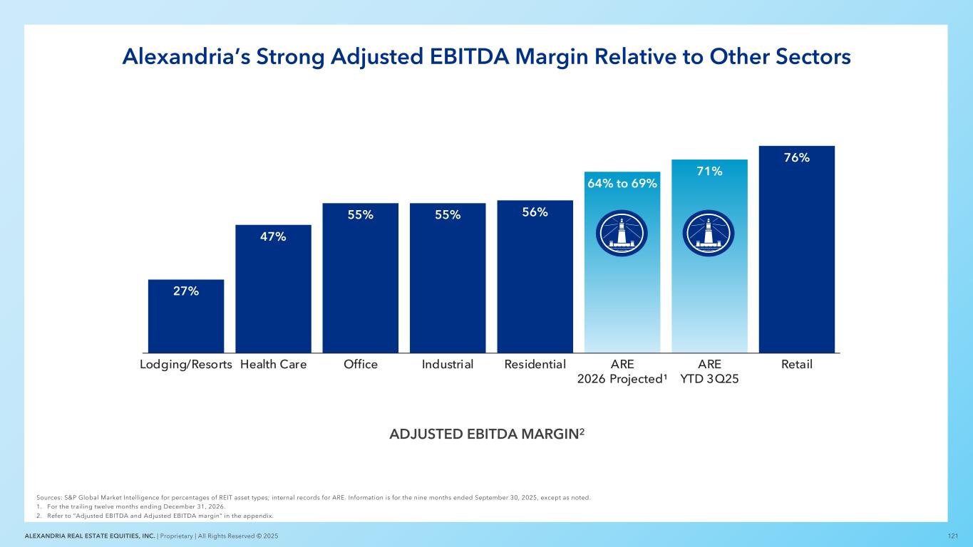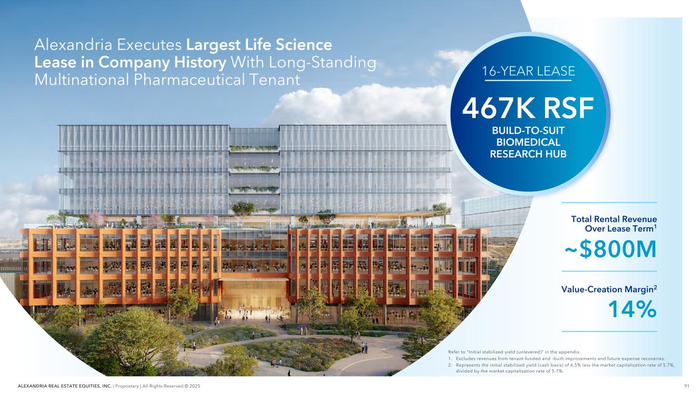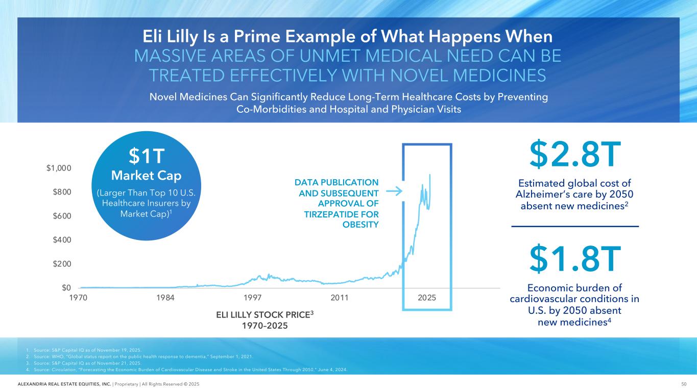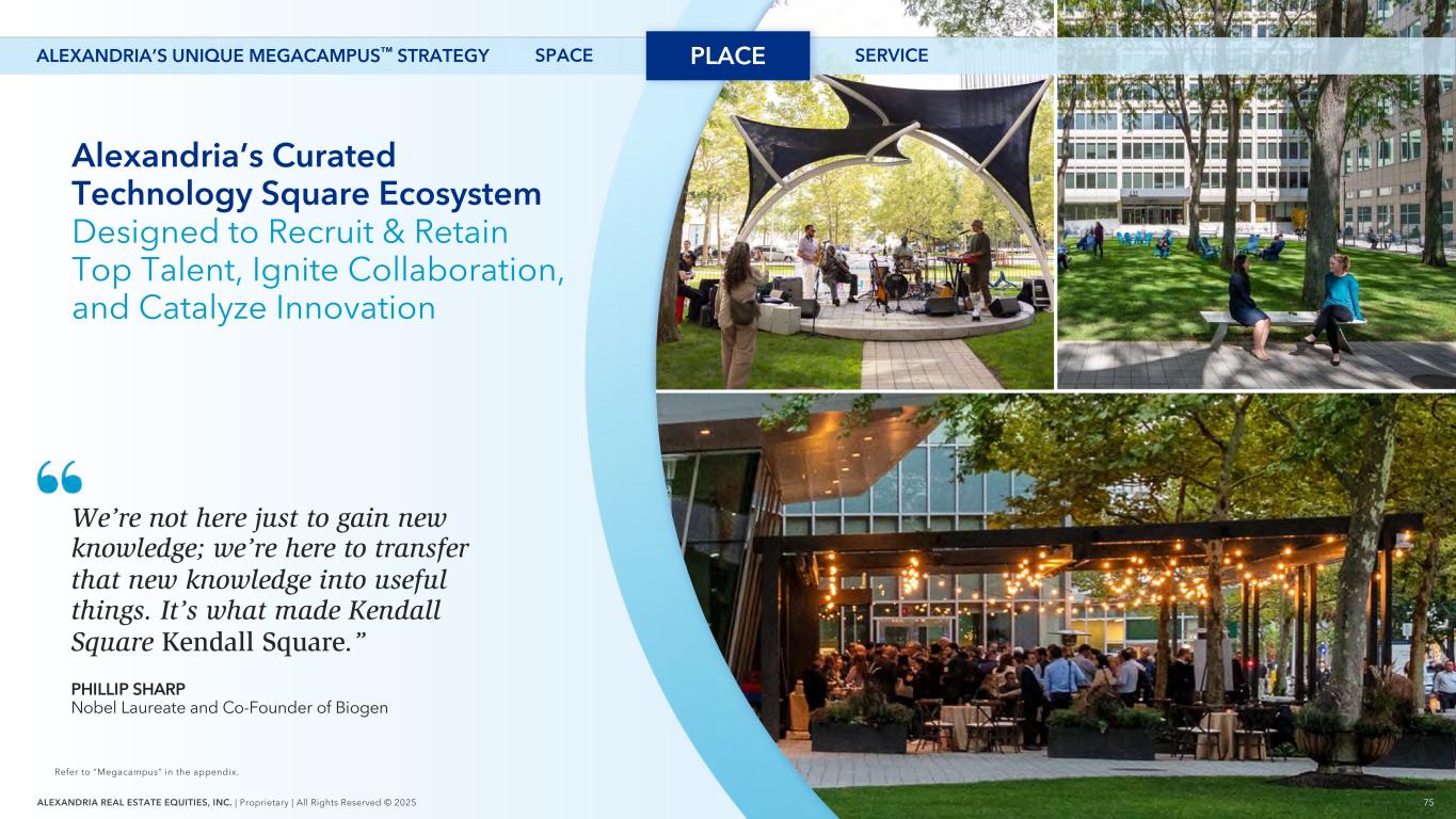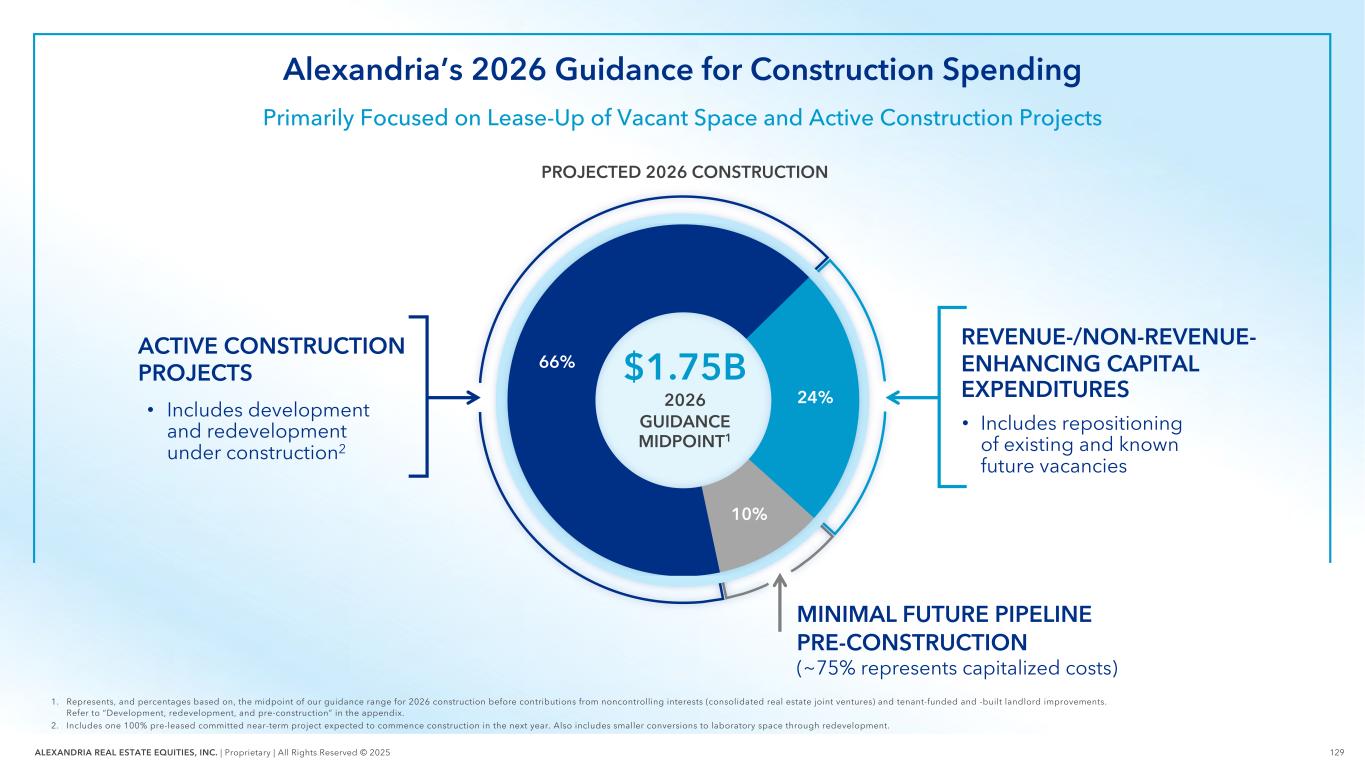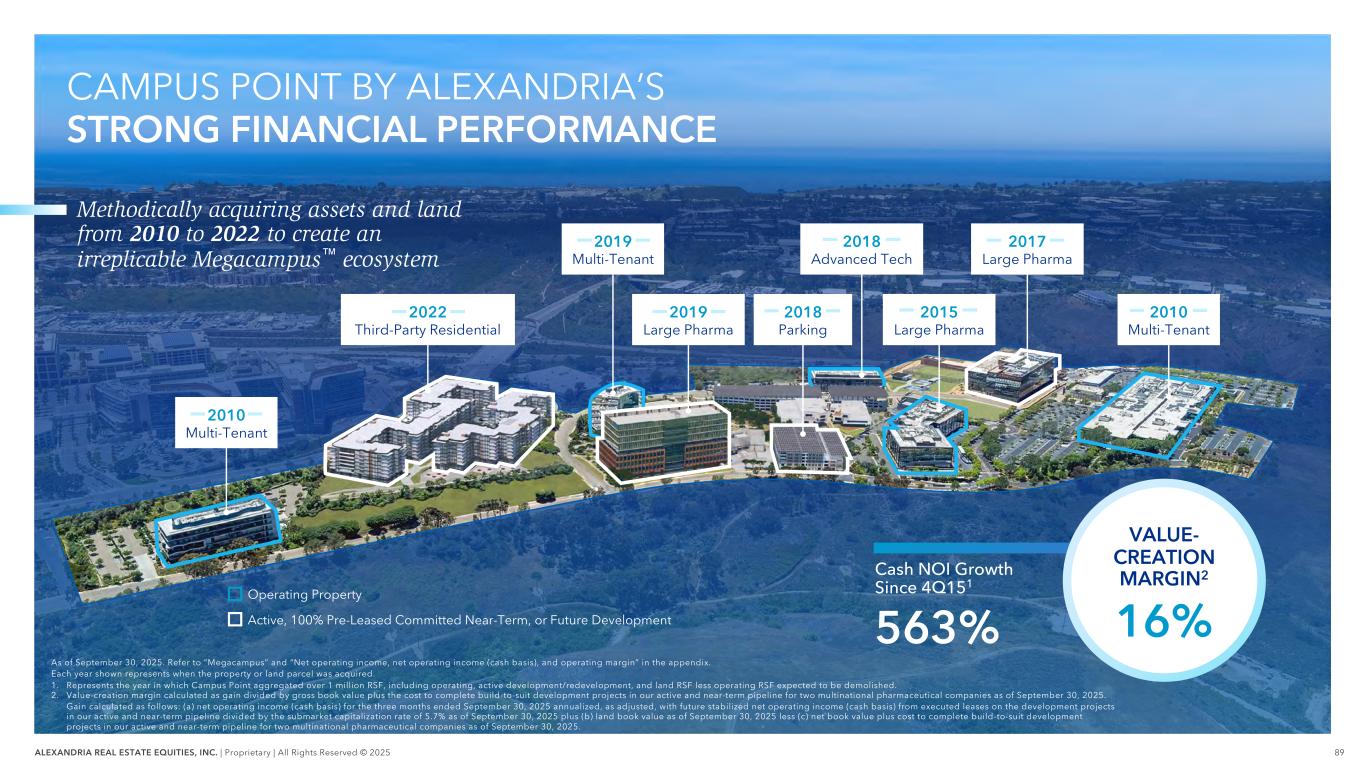 2ALEXANDRIA REAL ESTATE EQUITIES, INC. | Proprietary | All Rights Reserved © 2025 Safe Harbor Alexandria®, Lighthouse Design® logo, Building the Future of Life-Changing Innovation®, Megacampus™, Alexandria Center®, Alexandria Technology Center®, Alexandria Technology Square®, and The Miracle Mile of Medicine™ are copyrights and trademarks of Alexandria Real Estate Equities, Inc. All other company names, trademarks, and logos referenced herein are the property of their respective owners. This presentation contains forward-looking non-GAAP financial measures, including funds from operations, per share – diluted, as adjusted. We do not provide guidance for the most comparable GAAP financial measure or a reconciliation of the forward-looking non-GAAP financial measure of funds from operations, as adjusted, because we are unable to reasonably predict, without unreasonable effort, certain items that would be contained in the comparable GAAP measure, including items that are not indicative of our ongoing operations, such as, without limitation, unrealized gains or losses on non-real estate investments, potential impairments of real estate assets, and gains or losses on sales of real estate. These items are uncertain, depend on various factors, and could have a material impact on our GAAP results for the guidance periods. This presentation includes “forward-looking statements” within the meaning of Section 27A of the Securities Act of 1933, as amended, and Section 21E of the Securities Exchange Act of 1934, as amended. Such forward-looking statements include, without limitation, statements regarding our projected earnings per share attributable to Alexandria’s common stockholders – diluted, funds from operations per share attributable to Alexandria’s common stockholders – diluted, net operating income, sources and uses of capital, and targets and timing for rental revenues and development and value-creation projects, expenses, capital plan strategy, risk management strategy and related actions, and environmental, social, and governance goals. You can identify the forward-looking statements by their use of forward-looking words, such as “forecast,” “guidance,” “goals,” “projects,” “estimates,” “anticipates,” “believes,” “expects,” “intends,” “may,” “plans,” “seeks,” “should,” “targets,” or “will,” or the negative of those words or similar words. These forward-looking statements are based on our current expectations, beliefs, projections, future plans and strategies, anticipated events or trends, and similar expressions concerning matters that are not historical facts, as well as a number of assumptions concerning future events. There can be no assurance that actual results will not be materially higher or lower than these expectations. These statements are subject to risks, uncertainties, assumptions, and other important factors that could cause actual results to differ materially from the results discussed in the forward-looking statements. Factors that might cause such a difference include, without limitation, our failure to obtain capital (debt, construction financing, and/or equity) or refinance debt maturities, lower than expected yields, increased interest rates and construction and operating costs, adverse economic or real estate developments in our markets, greater than expected losses on disposition of properties, our failure to successfully place into service and lease any properties undergoing development or redevelopment and our existing space held for future development or redevelopment (including new properties acquired for that purpose), our failure to successfully operate or lease acquired or existing properties, decreased rental rates, increased vacancy rates or failure to renew or replace expiring leases, defaults on or non-renewal of leases by tenants, adverse general and local economic conditions, an unfavorable capital market environment, volatile, unfavorable, or uncertain social and political conditions (including the effects of new laws, regulations, and policies), decreased leasing activity or lease renewals, failure to obtain LEED and other healthy building certifications and efficiencies, and other risks and uncertainties detailed in our filings with the Securities and Exchange Commission (“SEC”). Accordingly, you are cautioned not to place undue reliance on such forward-looking statements. Other than as may be required by law, we assume no obligation to update this information and expressly disclaim any obligation to update or revise any forward-looking statements, whether as a result of new information, future events, or otherwise. For more discussion relating to risks and uncertainties that could cause actual results to differ materially from those anticipated in our forward-looking statements, and risks to our business in general, please refer to our SEC filings, including our most recent annual report on Form 10-K and any subsequent quarterly reports on Form 10-Q.