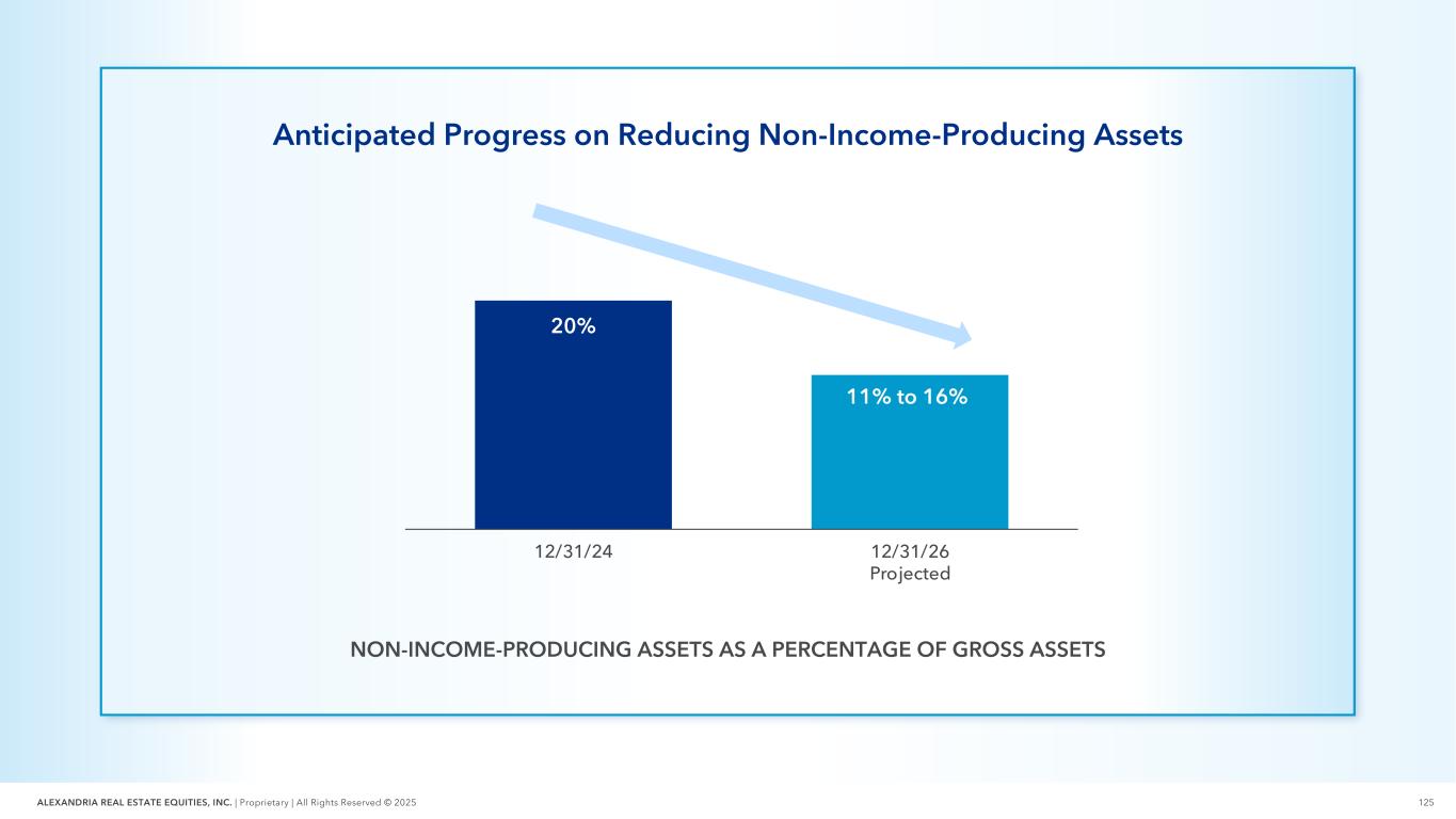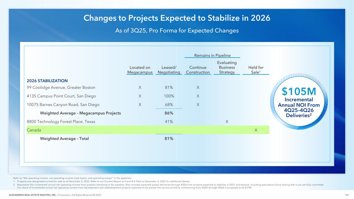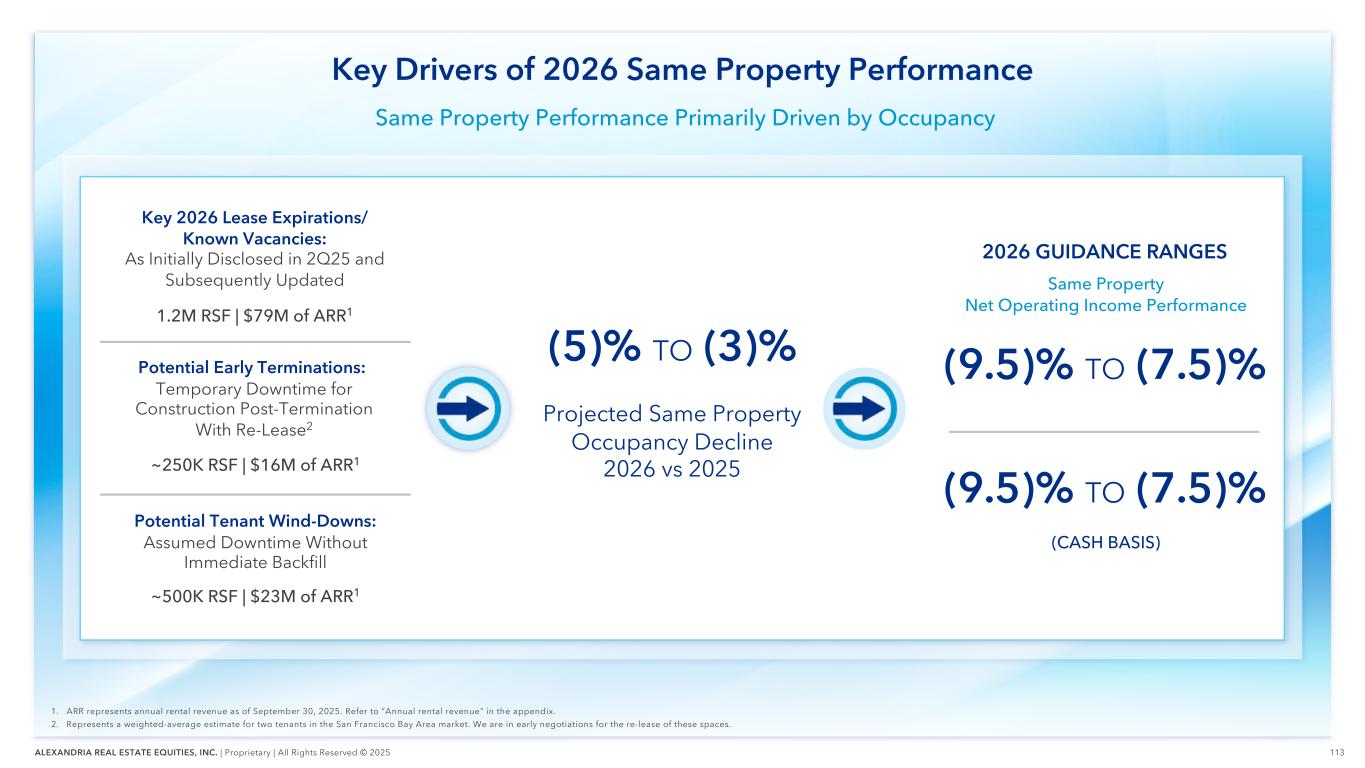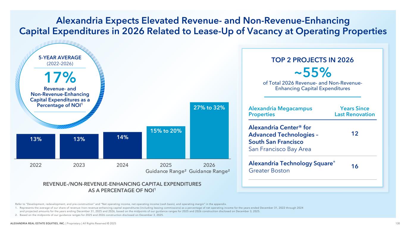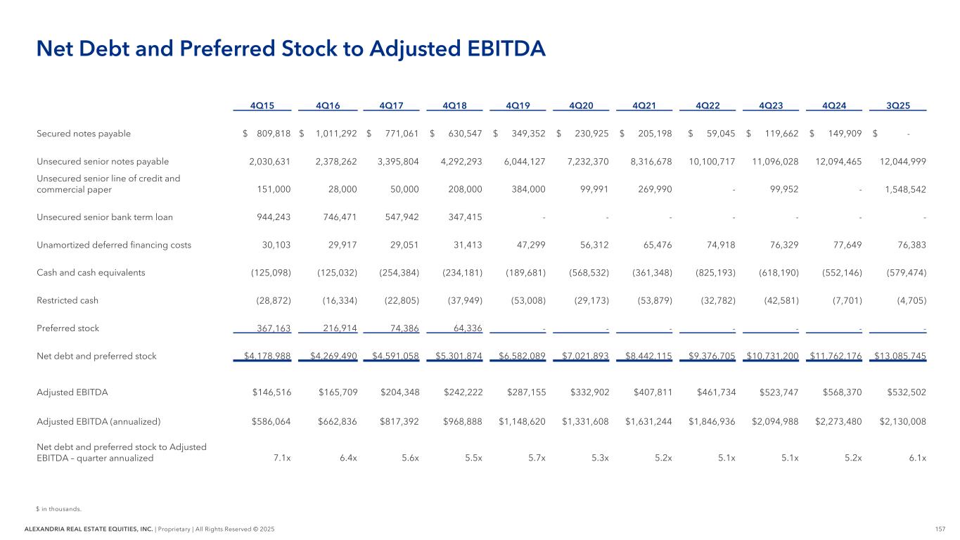2ALEXANDRIA REAL ESTATE EQUITIES, INC. | Proprietary | All Rights Reserved © 2025 Safe Harbor Alexandria®, Lighthouse Design® logo, Building the Future of Life-Changing Innovation®, Megacampus™, Alexandria Center®, Alexandria Technology Center®, Alexandria Technology Square®, and The Miracle Mile of Medicine™ are copyrights and trademarks of Alexandria Real Estate Equities, Inc. All other company names, trademarks, and logos referenced herein are the property of their respective owners. This presentation contains forward-looking non-GAAP financial measures, including funds from operations, per share – diluted, as adjusted. We do not provide guidance for the most comparable GAAP financial measure or a reconciliation of the forward-looking non-GAAP financial measure of funds from operations, as adjusted, because we are unable to reasonably predict, without unreasonable effort, certain items that would be contained in the comparable GAAP measure, including items that are not indicative of our ongoing operations, such as, without limitation, unrealized gains or losses on non-real estate investments, potential impairments of real estate assets, and gains or losses on sales of real estate. These items are uncertain, depend on various factors, and could have a material impact on our GAAP results for the guidance periods. This presentation includes “forward-looking statements” within the meaning of Section 27A of the Securities Act of 1933, as amended, and Section 21E of the Securities Exchange Act of 1934, as amended. Such forward-looking statements include, without limitation, statements regarding our projected earnings per share attributable to Alexandria’s common stockholders – diluted, funds from operations per share attributable to Alexandria’s common stockholders – diluted, net operating income, sources and uses of capital, and targets and timing for rental revenues and development and value-creation projects, expenses, capital plan strategy, risk management strategy and related actions, and environmental, social, and governance goals. You can identify the forward-looking statements by their use of forward-looking words, such as “forecast,” “guidance,” “goals,” “projects,” “estimates,” “anticipates,” “believes,” “expects,” “intends,” “may,” “plans,” “seeks,” “should,” “targets,” or “will,” or the negative of those words or similar words. These forward-looking statements are based on our current expectations, beliefs, projections, future plans and strategies, anticipated events or trends, and similar expressions concerning matters that are not historical facts, as well as a number of assumptions concerning future events. There can be no assurance that actual results will not be materially higher or lower than these expectations. These statements are subject to risks, uncertainties, assumptions, and other important factors that could cause actual results to differ materially from the results discussed in the forward-looking statements. Factors that might cause such a difference include, without limitation, our failure to obtain capital (debt, construction financing, and/or equity) or refinance debt maturities, lower than expected yields, increased interest rates and construction and operating costs, adverse economic or real estate developments in our markets, greater than expected losses on disposition of properties, our failure to successfully place into service and lease any properties undergoing development or redevelopment and our existing space held for future development or redevelopment (including new properties acquired for that purpose), our failure to successfully operate or lease acquired or existing properties, decreased rental rates, increased vacancy rates or failure to renew or replace expiring leases, defaults on or non-renewal of leases by tenants, adverse general and local economic conditions, an unfavorable capital market environment, volatile, unfavorable, or uncertain social and political conditions (including the effects of new laws, regulations, and policies), decreased leasing activity or lease renewals, failure to obtain LEED and other healthy building certifications and efficiencies, and other risks and uncertainties detailed in our filings with the Securities and Exchange Commission (“SEC”). Accordingly, you are cautioned not to place undue reliance on such forward-looking statements. Other than as may be required by law, we assume no obligation to update this information and expressly disclaim any obligation to update or revise any forward-looking statements, whether as a result of new information, future events, or otherwise. For more discussion relating to risks and uncertainties that could cause actual results to differ materially from those anticipated in our forward-looking statements, and risks to our business in general, please refer to our SEC filings, including our most recent annual report on Form 10-K and any subsequent quarterly reports on Form 10-Q.