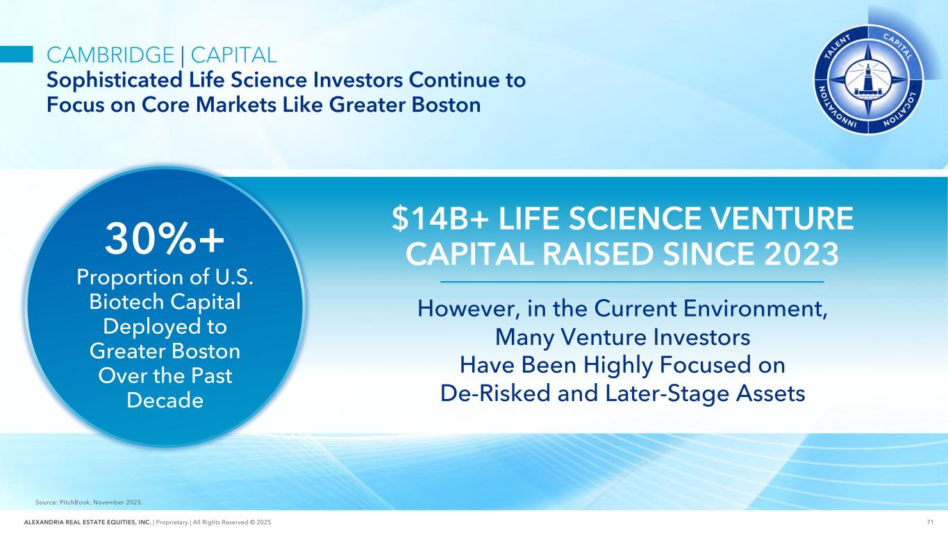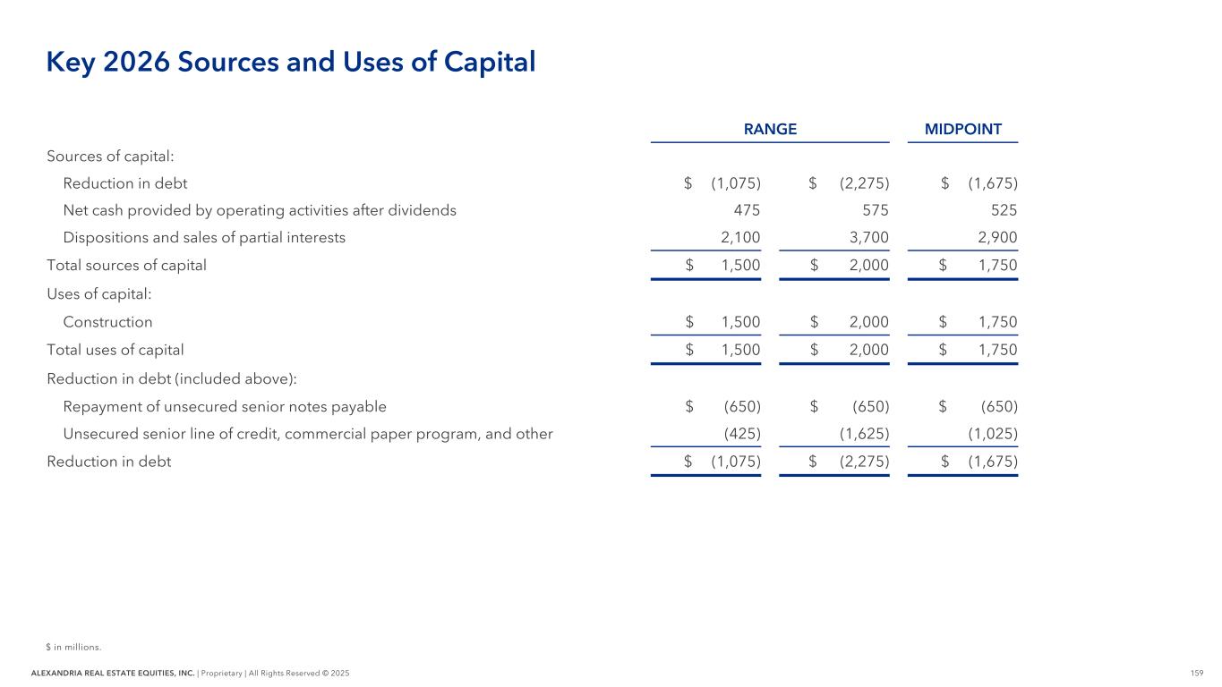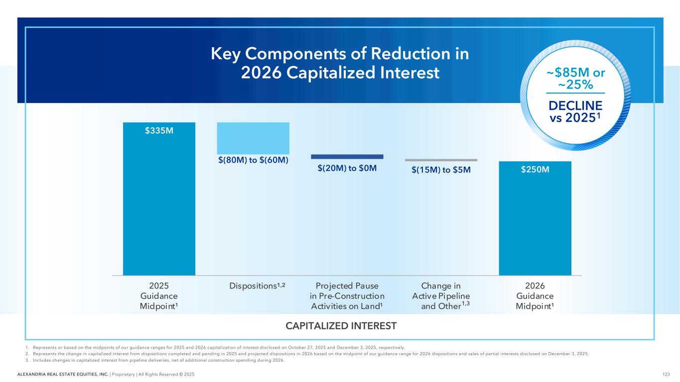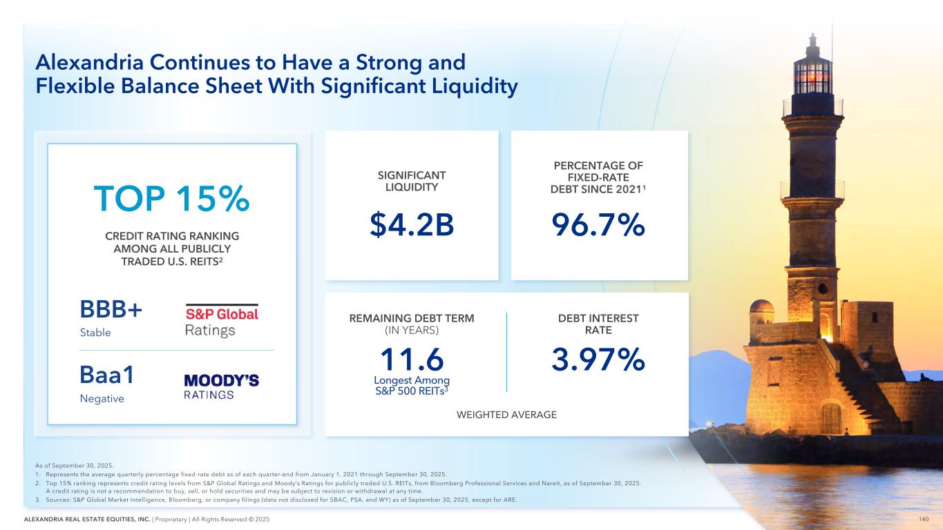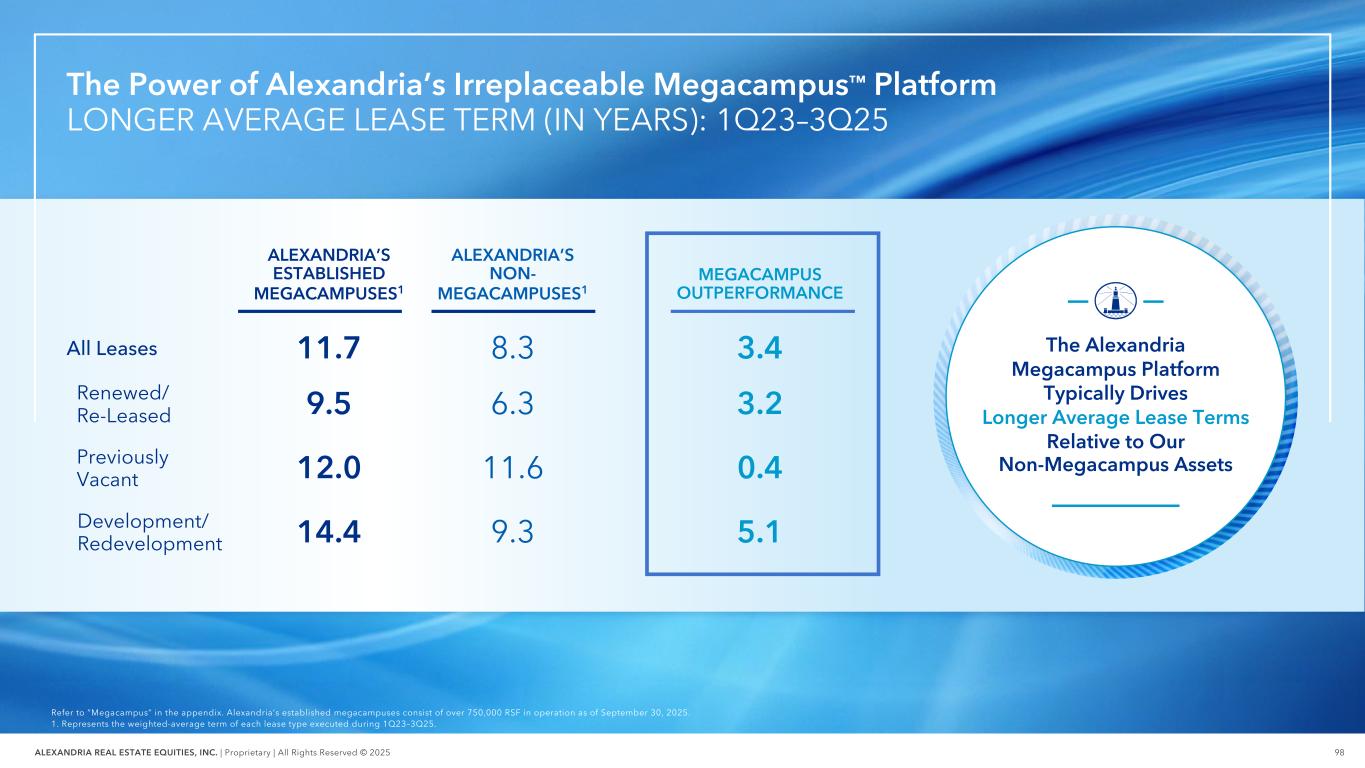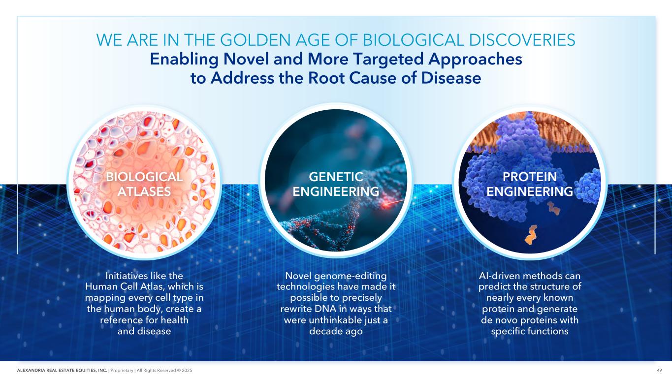 2ALEXANDRIA REAL ESTATE EQUITIES, INC. | Proprietary | All Rights Reserved © 2025 Safe Harbor Alexandria®, Lighthouse Design® logo, Building the Future of Life-Changing Innovation®, Megacampus™, Alexandria Center®, Alexandria Technology Center®, Alexandria Technology Square®, and The Miracle Mile of Medicine™ are copyrights and trademarks of Alexandria Real Estate Equities, Inc. All other company names, trademarks, and logos referenced herein are the property of their respective owners. This presentation contains forward-looking non-GAAP financial measures, including funds from operations, per share – diluted, as adjusted. We do not provide guidance for the most comparable GAAP financial measure or a reconciliation of the forward-looking non-GAAP financial measure of funds from operations, as adjusted, because we are unable to reasonably predict, without unreasonable effort, certain items that would be contained in the comparable GAAP measure, including items that are not indicative of our ongoing operations, such as, without limitation, unrealized gains or losses on non-real estate investments, potential impairments of real estate assets, and gains or losses on sales of real estate. These items are uncertain, depend on various factors, and could have a material impact on our GAAP results for the guidance periods. This presentation includes “forward-looking statements” within the meaning of Section 27A of the Securities Act of 1933, as amended, and Section 21E of the Securities Exchange Act of 1934, as amended. Such forward-looking statements include, without limitation, statements regarding our projected earnings per share attributable to Alexandria’s common stockholders – diluted, funds from operations per share attributable to Alexandria’s common stockholders – diluted, net operating income, sources and uses of capital, and targets and timing for rental revenues and development and value-creation projects, expenses, capital plan strategy, risk management strategy and related actions, and environmental, social, and governance goals. You can identify the forward-looking statements by their use of forward-looking words, such as “forecast,” “guidance,” “goals,” “projects,” “estimates,” “anticipates,” “believes,” “expects,” “intends,” “may,” “plans,” “seeks,” “should,” “targets,” or “will,” or the negative of those words or similar words. These forward-looking statements are based on our current expectations, beliefs, projections, future plans and strategies, anticipated events or trends, and similar expressions concerning matters that are not historical facts, as well as a number of assumptions concerning future events. There can be no assurance that actual results will not be materially higher or lower than these expectations. These statements are subject to risks, uncertainties, assumptions, and other important factors that could cause actual results to differ materially from the results discussed in the forward-looking statements. Factors that might cause such a difference include, without limitation, our failure to obtain capital (debt, construction financing, and/or equity) or refinance debt maturities, lower than expected yields, increased interest rates and construction and operating costs, adverse economic or real estate developments in our markets, greater than expected losses on disposition of properties, our failure to successfully place into service and lease any properties undergoing development or redevelopment and our existing space held for future development or redevelopment (including new properties acquired for that purpose), our failure to successfully operate or lease acquired or existing properties, decreased rental rates, increased vacancy rates or failure to renew or replace expiring leases, defaults on or non-renewal of leases by tenants, adverse general and local economic conditions, an unfavorable capital market environment, volatile, unfavorable, or uncertain social and political conditions (including the effects of new laws, regulations, and policies), decreased leasing activity or lease renewals, failure to obtain LEED and other healthy building certifications and efficiencies, and other risks and uncertainties detailed in our filings with the Securities and Exchange Commission (“SEC”). Accordingly, you are cautioned not to place undue reliance on such forward-looking statements. Other than as may be required by law, we assume no obligation to update this information and expressly disclaim any obligation to update or revise any forward-looking statements, whether as a result of new information, future events, or otherwise. For more discussion relating to risks and uncertainties that could cause actual results to differ materially from those anticipated in our forward-looking statements, and risks to our business in general, please refer to our SEC filings, including our most recent annual report on Form 10-K and any subsequent quarterly reports on Form 10-Q.