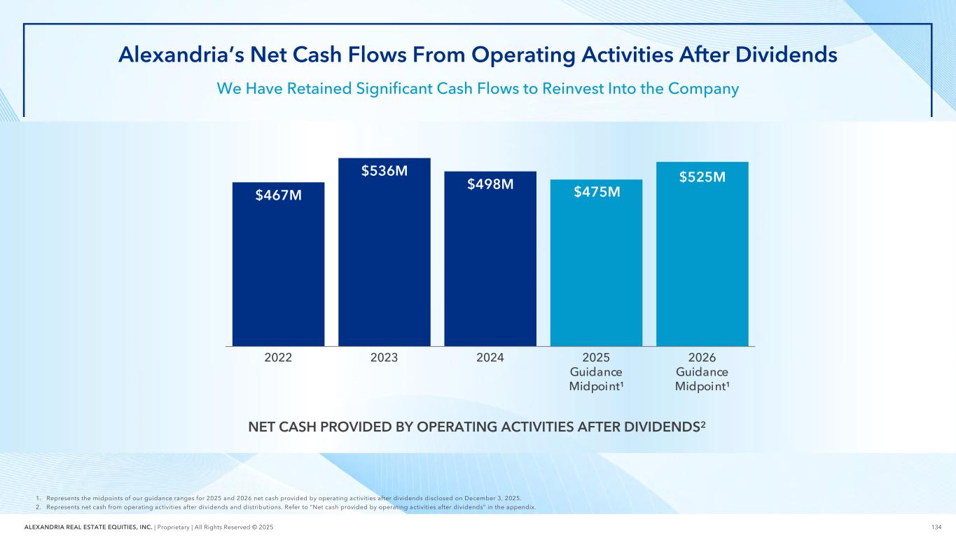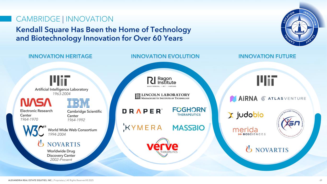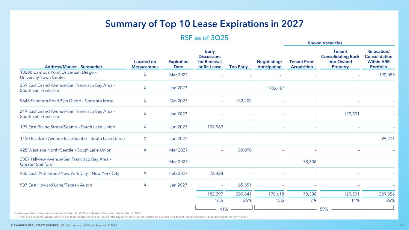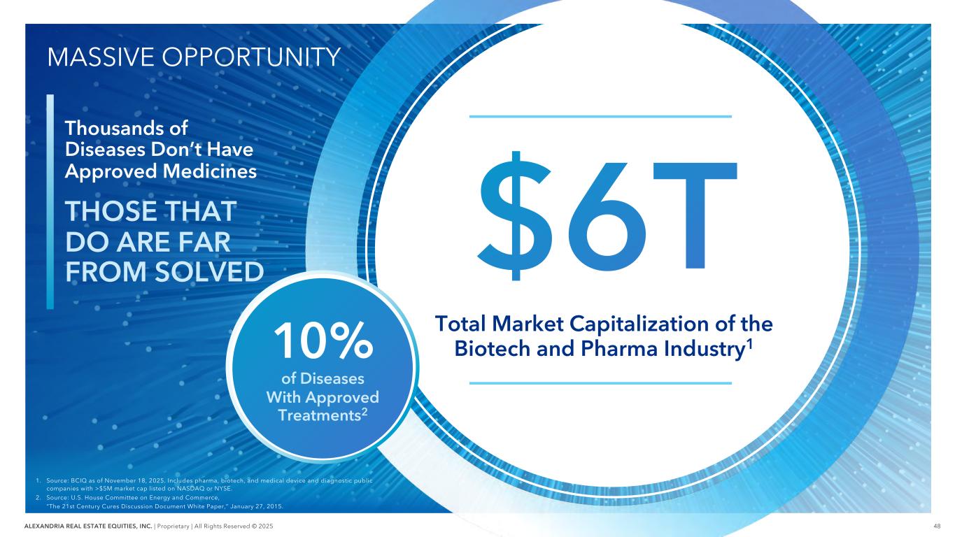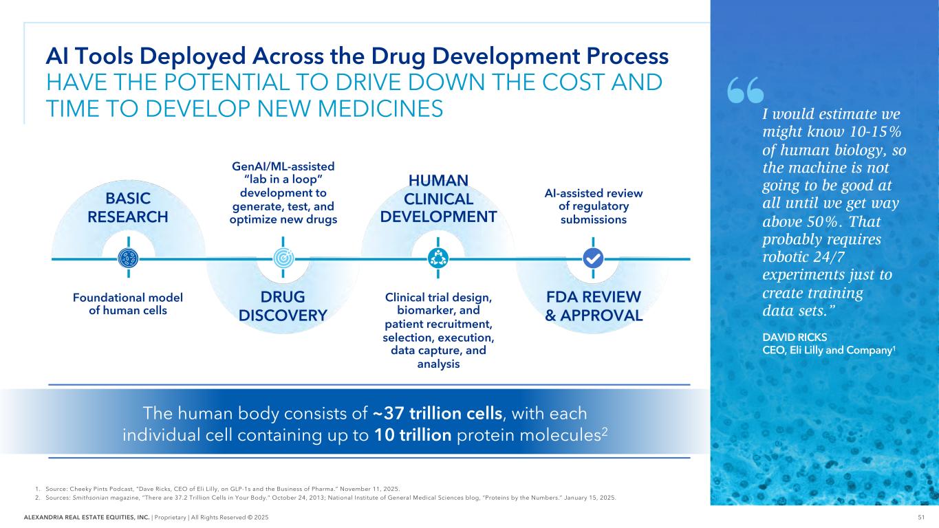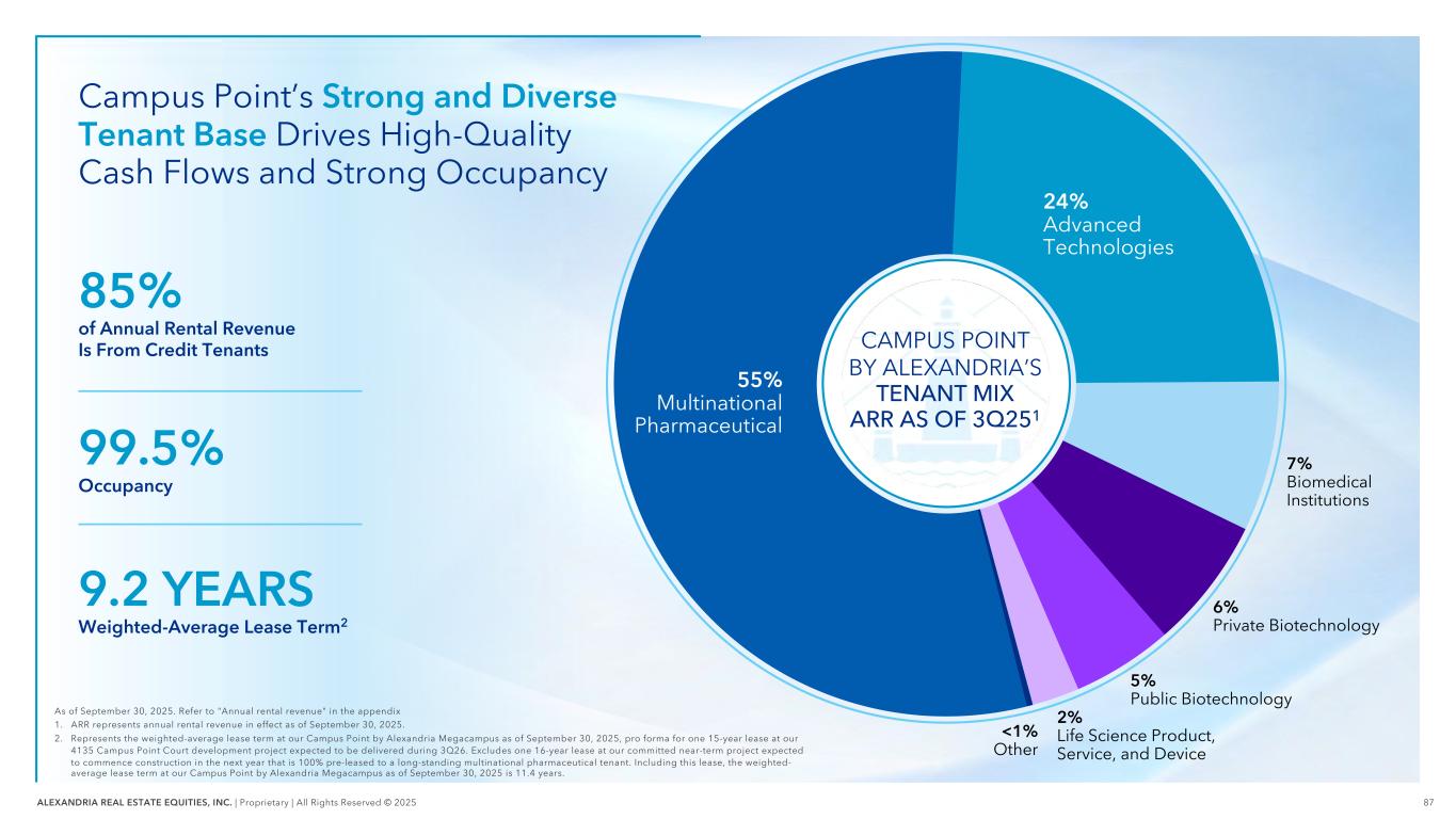 2ALEXANDRIA REAL ESTATE EQUITIES, INC. | Proprietary | All Rights Reserved © 2025 Safe Harbor Alexandria®, Lighthouse Design® logo, Building the Future of Life-Changing Innovation®, Megacampus™, Alexandria Center®, Alexandria Technology Center®, Alexandria Technology Square®, and The Miracle Mile of Medicine™ are copyrights and trademarks of Alexandria Real Estate Equities, Inc. All other company names, trademarks, and logos referenced herein are the property of their respective owners. This presentation contains forward-looking non-GAAP financial measures, including funds from operations, per share – diluted, as adjusted. We do not provide guidance for the most comparable GAAP financial measure or a reconciliation of the forward-looking non-GAAP financial measure of funds from operations, as adjusted, because we are unable to reasonably predict, without unreasonable effort, certain items that would be contained in the comparable GAAP measure, including items that are not indicative of our ongoing operations, such as, without limitation, unrealized gains or losses on non-real estate investments, potential impairments of real estate assets, and gains or losses on sales of real estate. These items are uncertain, depend on various factors, and could have a material impact on our GAAP results for the guidance periods. This presentation includes “forward-looking statements” within the meaning of Section 27A of the Securities Act of 1933, as amended, and Section 21E of the Securities Exchange Act of 1934, as amended. Such forward-looking statements include, without limitation, statements regarding our projected earnings per share attributable to Alexandria’s common stockholders – diluted, funds from operations per share attributable to Alexandria’s common stockholders – diluted, net operating income, sources and uses of capital, and targets and timing for rental revenues and development and value-creation projects, expenses, capital plan strategy, risk management strategy and related actions, and environmental, social, and governance goals. You can identify the forward-looking statements by their use of forward-looking words, such as “forecast,” “guidance,” “goals,” “projects,” “estimates,” “anticipates,” “believes,” “expects,” “intends,” “may,” “plans,” “seeks,” “should,” “targets,” or “will,” or the negative of those words or similar words. These forward-looking statements are based on our current expectations, beliefs, projections, future plans and strategies, anticipated events or trends, and similar expressions concerning matters that are not historical facts, as well as a number of assumptions concerning future events. There can be no assurance that actual results will not be materially higher or lower than these expectations. These statements are subject to risks, uncertainties, assumptions, and other important factors that could cause actual results to differ materially from the results discussed in the forward-looking statements. Factors that might cause such a difference include, without limitation, our failure to obtain capital (debt, construction financing, and/or equity) or refinance debt maturities, lower than expected yields, increased interest rates and construction and operating costs, adverse economic or real estate developments in our markets, greater than expected losses on disposition of properties, our failure to successfully place into service and lease any properties undergoing development or redevelopment and our existing space held for future development or redevelopment (including new properties acquired for that purpose), our failure to successfully operate or lease acquired or existing properties, decreased rental rates, increased vacancy rates or failure to renew or replace expiring leases, defaults on or non-renewal of leases by tenants, adverse general and local economic conditions, an unfavorable capital market environment, volatile, unfavorable, or uncertain social and political conditions (including the effects of new laws, regulations, and policies), decreased leasing activity or lease renewals, failure to obtain LEED and other healthy building certifications and efficiencies, and other risks and uncertainties detailed in our filings with the Securities and Exchange Commission (“SEC”). Accordingly, you are cautioned not to place undue reliance on such forward-looking statements. Other than as may be required by law, we assume no obligation to update this information and expressly disclaim any obligation to update or revise any forward-looking statements, whether as a result of new information, future events, or otherwise. For more discussion relating to risks and uncertainties that could cause actual results to differ materially from those anticipated in our forward-looking statements, and risks to our business in general, please refer to our SEC filings, including our most recent annual report on Form 10-K and any subsequent quarterly reports on Form 10-Q.