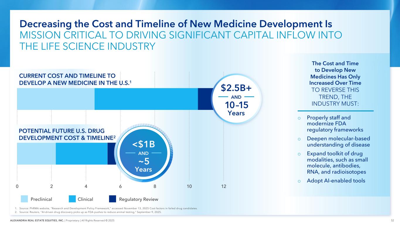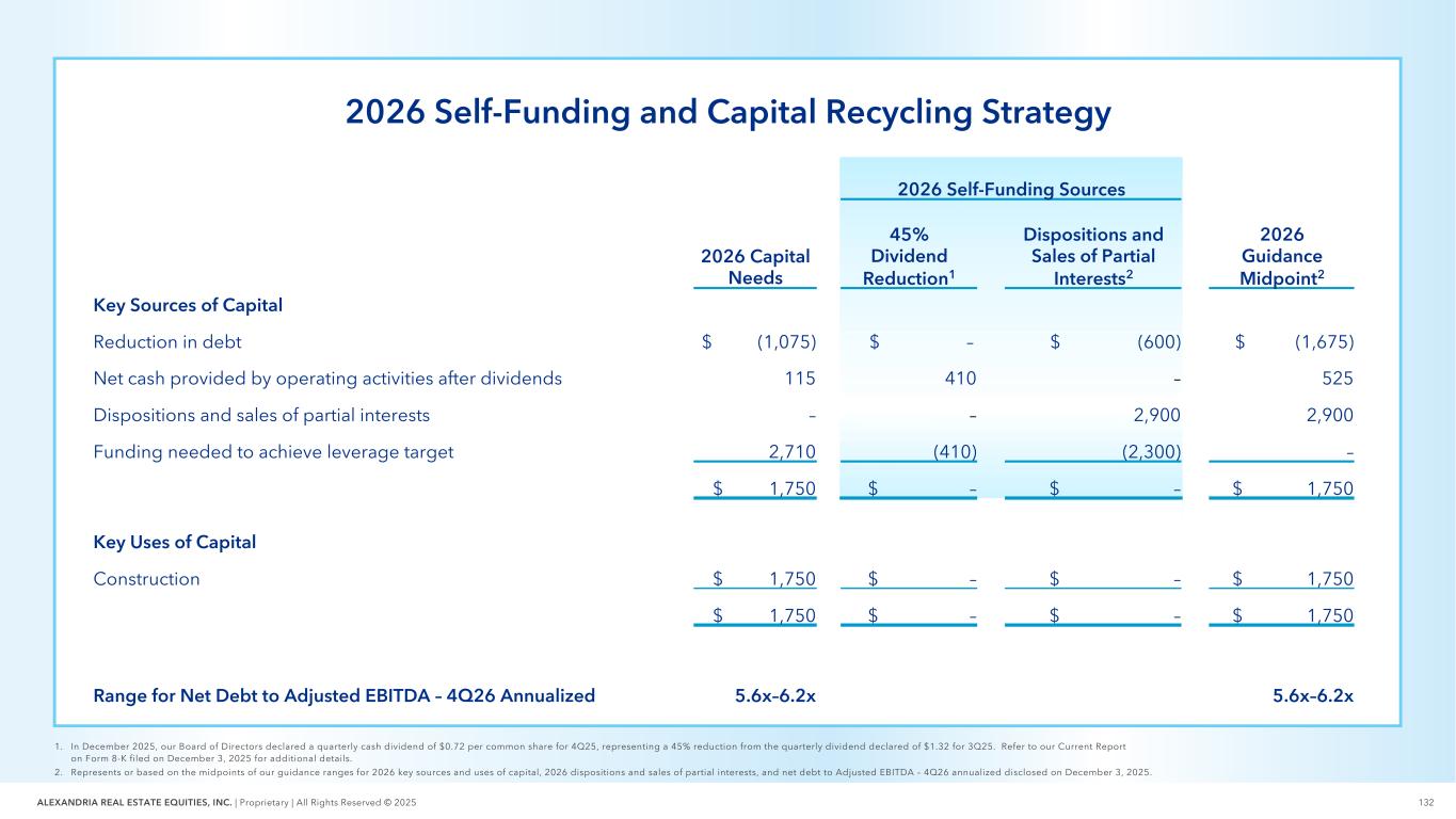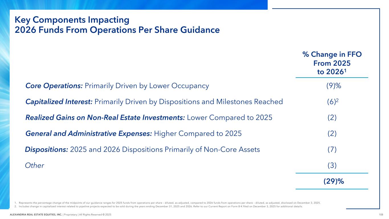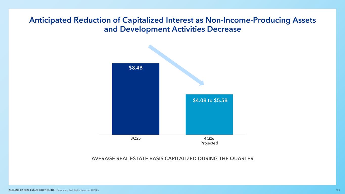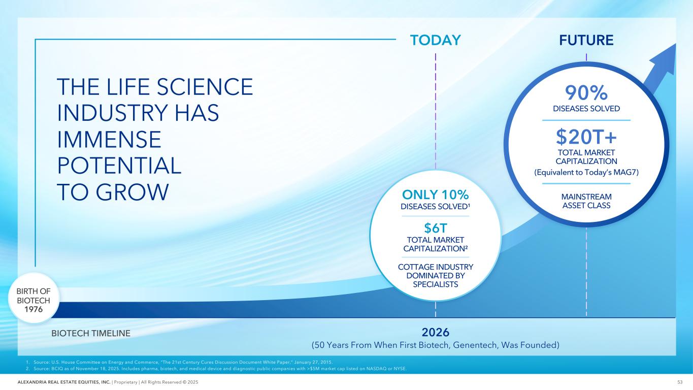 2ALEXANDRIA REAL ESTATE EQUITIES, INC. | Proprietary | All Rights Reserved © 2025 Safe Harbor Alexandria®, Lighthouse Design® logo, Building the Future of Life-Changing Innovation®, Megacampus™, Alexandria Center®, Alexandria Technology Center®, Alexandria Technology Square®, and The Miracle Mile of Medicine™ are copyrights and trademarks of Alexandria Real Estate Equities, Inc. All other company names, trademarks, and logos referenced herein are the property of their respective owners. This presentation contains forward-looking non-GAAP financial measures, including funds from operations, per share – diluted, as adjusted. We do not provide guidance for the most comparable GAAP financial measure or a reconciliation of the forward-looking non-GAAP financial measure of funds from operations, as adjusted, because we are unable to reasonably predict, without unreasonable effort, certain items that would be contained in the comparable GAAP measure, including items that are not indicative of our ongoing operations, such as, without limitation, unrealized gains or losses on non-real estate investments, potential impairments of real estate assets, and gains or losses on sales of real estate. These items are uncertain, depend on various factors, and could have a material impact on our GAAP results for the guidance periods. This presentation includes “forward-looking statements” within the meaning of Section 27A of the Securities Act of 1933, as amended, and Section 21E of the Securities Exchange Act of 1934, as amended. Such forward-looking statements include, without limitation, statements regarding our projected earnings per share attributable to Alexandria’s common stockholders – diluted, funds from operations per share attributable to Alexandria’s common stockholders – diluted, net operating income, sources and uses of capital, and targets and timing for rental revenues and development and value-creation projects, expenses, capital plan strategy, risk management strategy and related actions, and environmental, social, and governance goals. You can identify the forward-looking statements by their use of forward-looking words, such as “forecast,” “guidance,” “goals,” “projects,” “estimates,” “anticipates,” “believes,” “expects,” “intends,” “may,” “plans,” “seeks,” “should,” “targets,” or “will,” or the negative of those words or similar words. These forward-looking statements are based on our current expectations, beliefs, projections, future plans and strategies, anticipated events or trends, and similar expressions concerning matters that are not historical facts, as well as a number of assumptions concerning future events. There can be no assurance that actual results will not be materially higher or lower than these expectations. These statements are subject to risks, uncertainties, assumptions, and other important factors that could cause actual results to differ materially from the results discussed in the forward-looking statements. Factors that might cause such a difference include, without limitation, our failure to obtain capital (debt, construction financing, and/or equity) or refinance debt maturities, lower than expected yields, increased interest rates and construction and operating costs, adverse economic or real estate developments in our markets, greater than expected losses on disposition of properties, our failure to successfully place into service and lease any properties undergoing development or redevelopment and our existing space held for future development or redevelopment (including new properties acquired for that purpose), our failure to successfully operate or lease acquired or existing properties, decreased rental rates, increased vacancy rates or failure to renew or replace expiring leases, defaults on or non-renewal of leases by tenants, adverse general and local economic conditions, an unfavorable capital market environment, volatile, unfavorable, or uncertain social and political conditions (including the effects of new laws, regulations, and policies), decreased leasing activity or lease renewals, failure to obtain LEED and other healthy building certifications and efficiencies, and other risks and uncertainties detailed in our filings with the Securities and Exchange Commission (“SEC”). Accordingly, you are cautioned not to place undue reliance on such forward-looking statements. Other than as may be required by law, we assume no obligation to update this information and expressly disclaim any obligation to update or revise any forward-looking statements, whether as a result of new information, future events, or otherwise. For more discussion relating to risks and uncertainties that could cause actual results to differ materially from those anticipated in our forward-looking statements, and risks to our business in general, please refer to our SEC filings, including our most recent annual report on Form 10-K and any subsequent quarterly reports on Form 10-Q.