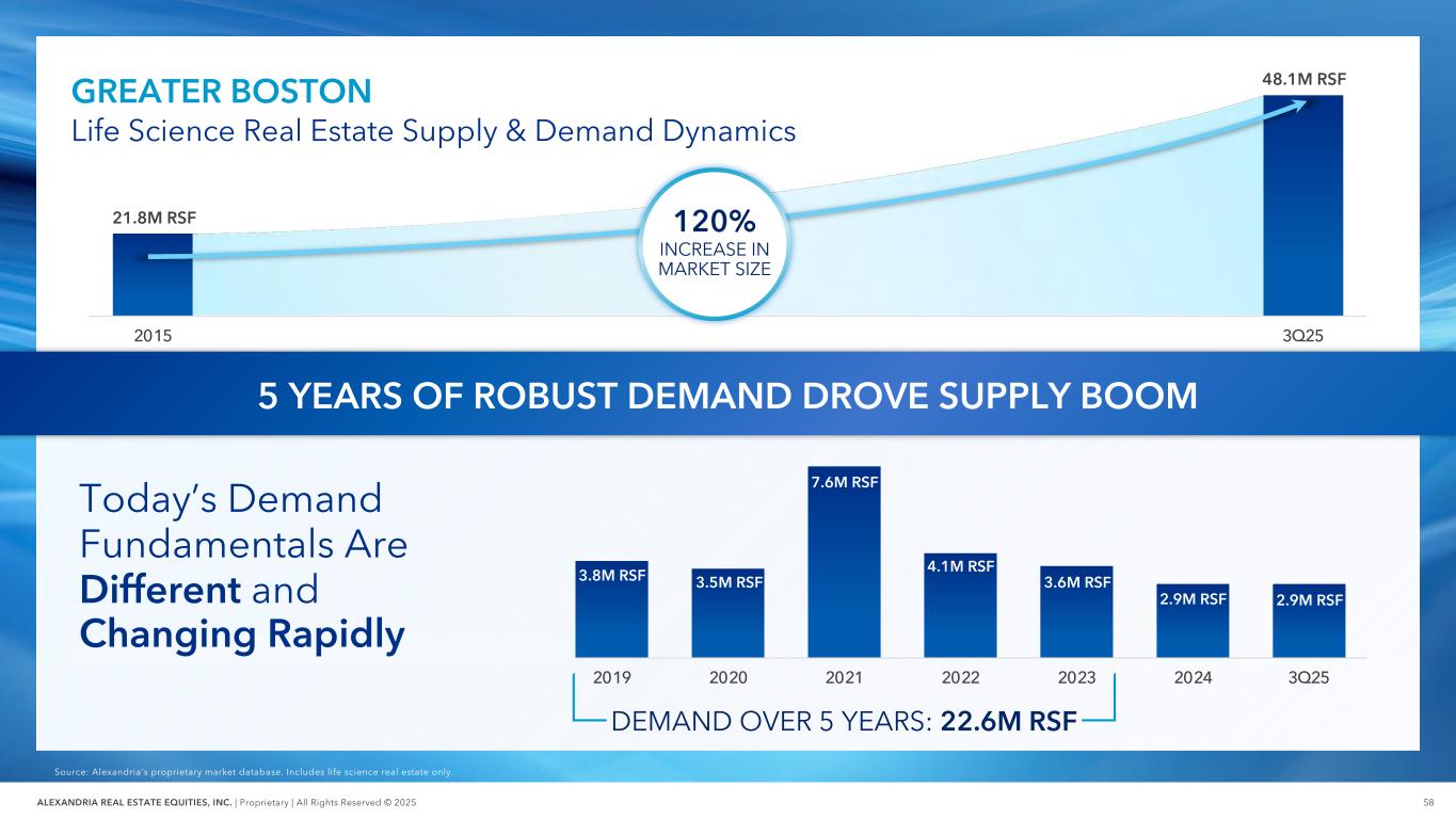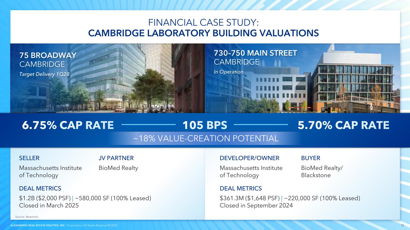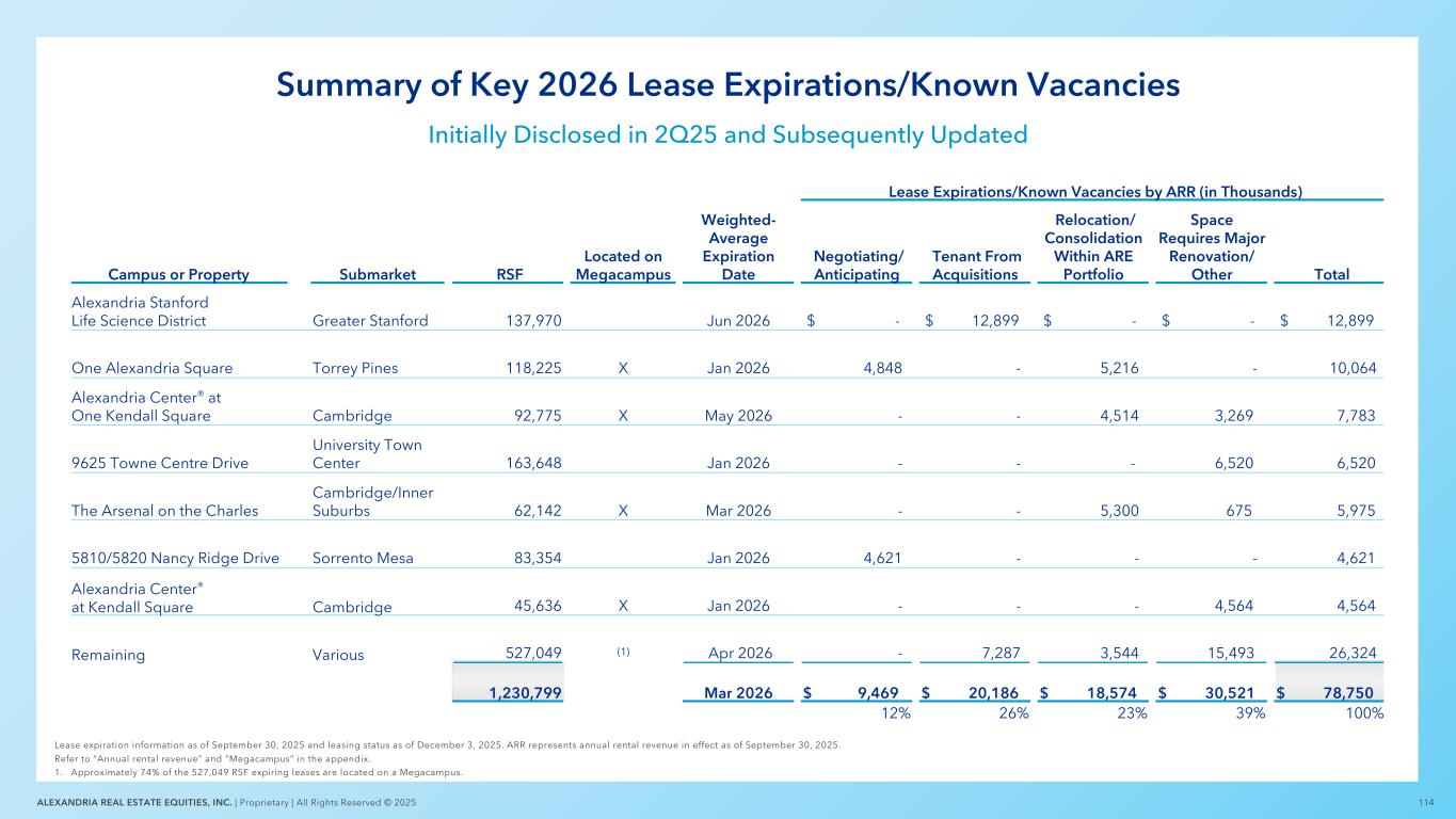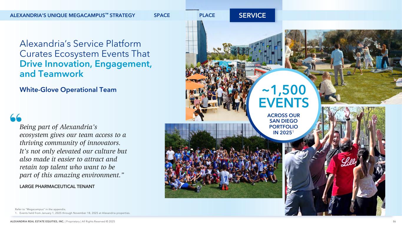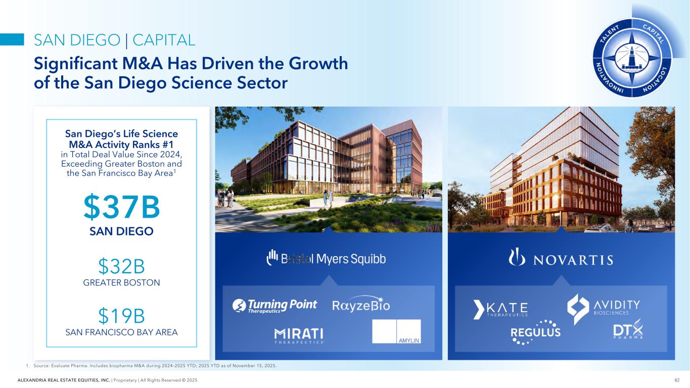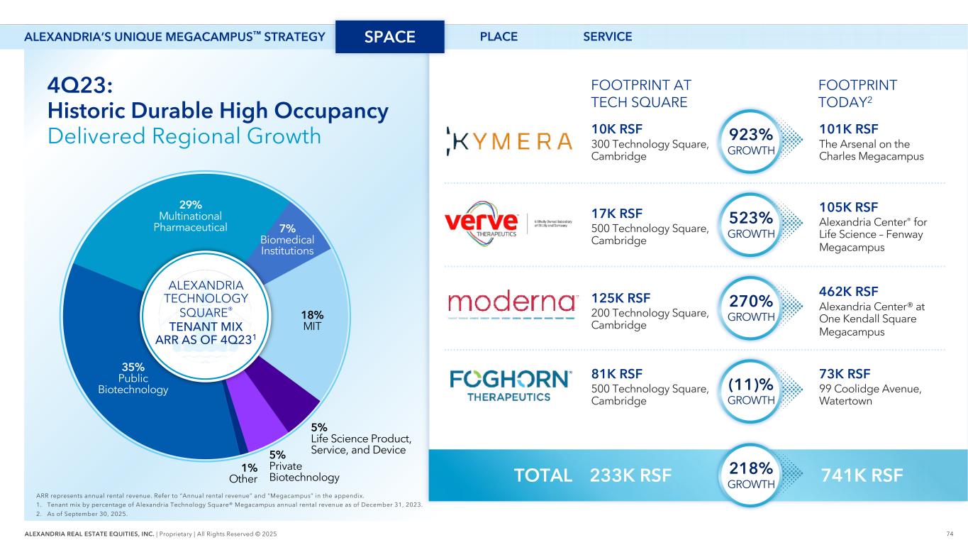 2ALEXANDRIA REAL ESTATE EQUITIES, INC. | Proprietary | All Rights Reserved © 2025 Safe Harbor Alexandria®, Lighthouse Design® logo, Building the Future of Life-Changing Innovation®, Megacampus™, Alexandria Center®, Alexandria Technology Center®, Alexandria Technology Square®, and The Miracle Mile of Medicine™ are copyrights and trademarks of Alexandria Real Estate Equities, Inc. All other company names, trademarks, and logos referenced herein are the property of their respective owners. This presentation contains forward-looking non-GAAP financial measures, including funds from operations, per share – diluted, as adjusted. We do not provide guidance for the most comparable GAAP financial measure or a reconciliation of the forward-looking non-GAAP financial measure of funds from operations, as adjusted, because we are unable to reasonably predict, without unreasonable effort, certain items that would be contained in the comparable GAAP measure, including items that are not indicative of our ongoing operations, such as, without limitation, unrealized gains or losses on non-real estate investments, potential impairments of real estate assets, and gains or losses on sales of real estate. These items are uncertain, depend on various factors, and could have a material impact on our GAAP results for the guidance periods. This presentation includes “forward-looking statements” within the meaning of Section 27A of the Securities Act of 1933, as amended, and Section 21E of the Securities Exchange Act of 1934, as amended. Such forward-looking statements include, without limitation, statements regarding our projected earnings per share attributable to Alexandria’s common stockholders – diluted, funds from operations per share attributable to Alexandria’s common stockholders – diluted, net operating income, sources and uses of capital, and targets and timing for rental revenues and development and value-creation projects, expenses, capital plan strategy, risk management strategy and related actions, and environmental, social, and governance goals. You can identify the forward-looking statements by their use of forward-looking words, such as “forecast,” “guidance,” “goals,” “projects,” “estimates,” “anticipates,” “believes,” “expects,” “intends,” “may,” “plans,” “seeks,” “should,” “targets,” or “will,” or the negative of those words or similar words. These forward-looking statements are based on our current expectations, beliefs, projections, future plans and strategies, anticipated events or trends, and similar expressions concerning matters that are not historical facts, as well as a number of assumptions concerning future events. There can be no assurance that actual results will not be materially higher or lower than these expectations. These statements are subject to risks, uncertainties, assumptions, and other important factors that could cause actual results to differ materially from the results discussed in the forward-looking statements. Factors that might cause such a difference include, without limitation, our failure to obtain capital (debt, construction financing, and/or equity) or refinance debt maturities, lower than expected yields, increased interest rates and construction and operating costs, adverse economic or real estate developments in our markets, greater than expected losses on disposition of properties, our failure to successfully place into service and lease any properties undergoing development or redevelopment and our existing space held for future development or redevelopment (including new properties acquired for that purpose), our failure to successfully operate or lease acquired or existing properties, decreased rental rates, increased vacancy rates or failure to renew or replace expiring leases, defaults on or non-renewal of leases by tenants, adverse general and local economic conditions, an unfavorable capital market environment, volatile, unfavorable, or uncertain social and political conditions (including the effects of new laws, regulations, and policies), decreased leasing activity or lease renewals, failure to obtain LEED and other healthy building certifications and efficiencies, and other risks and uncertainties detailed in our filings with the Securities and Exchange Commission (“SEC”). Accordingly, you are cautioned not to place undue reliance on such forward-looking statements. Other than as may be required by law, we assume no obligation to update this information and expressly disclaim any obligation to update or revise any forward-looking statements, whether as a result of new information, future events, or otherwise. For more discussion relating to risks and uncertainties that could cause actual results to differ materially from those anticipated in our forward-looking statements, and risks to our business in general, please refer to our SEC filings, including our most recent annual report on Form 10-K and any subsequent quarterly reports on Form 10-Q.