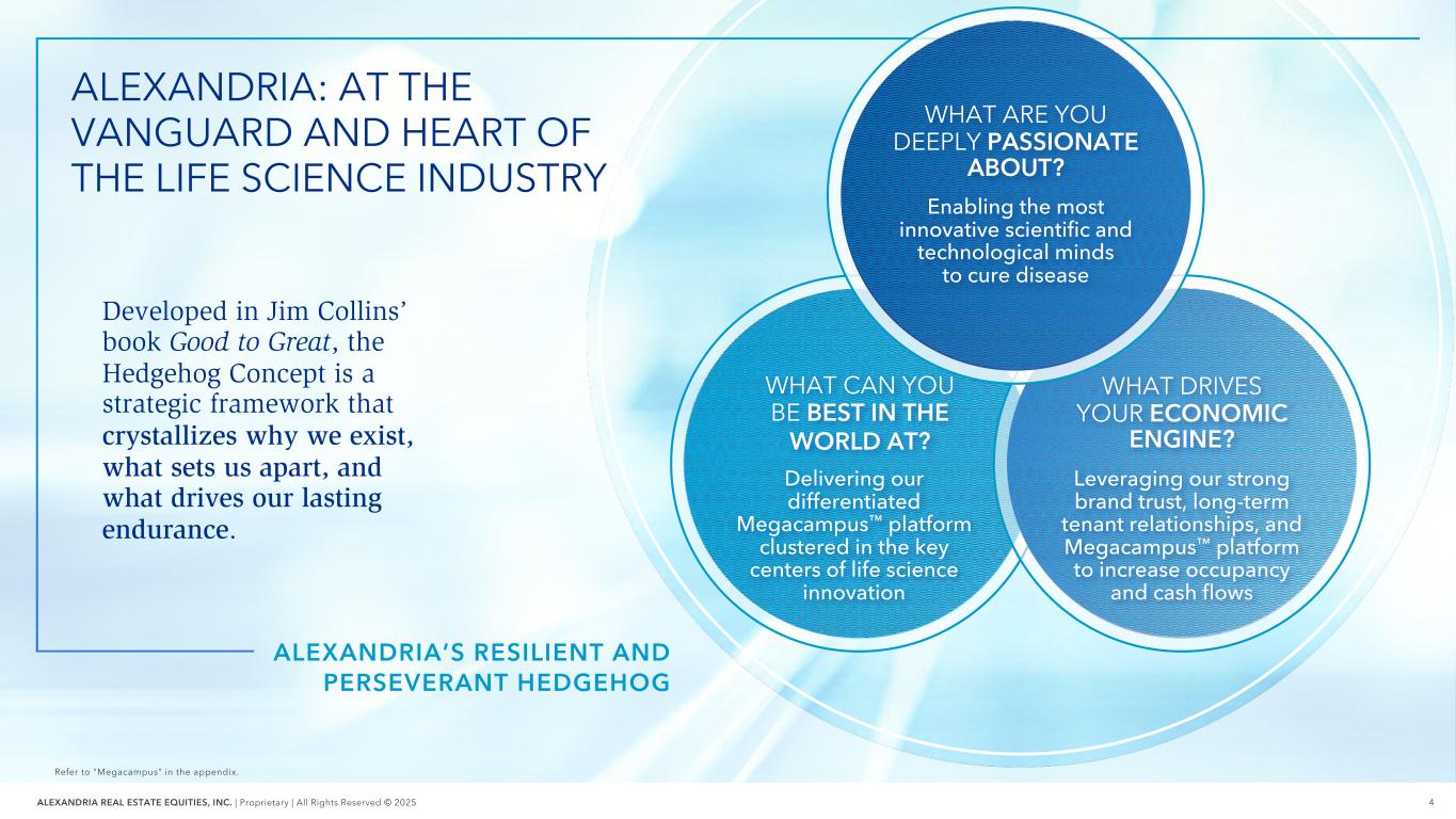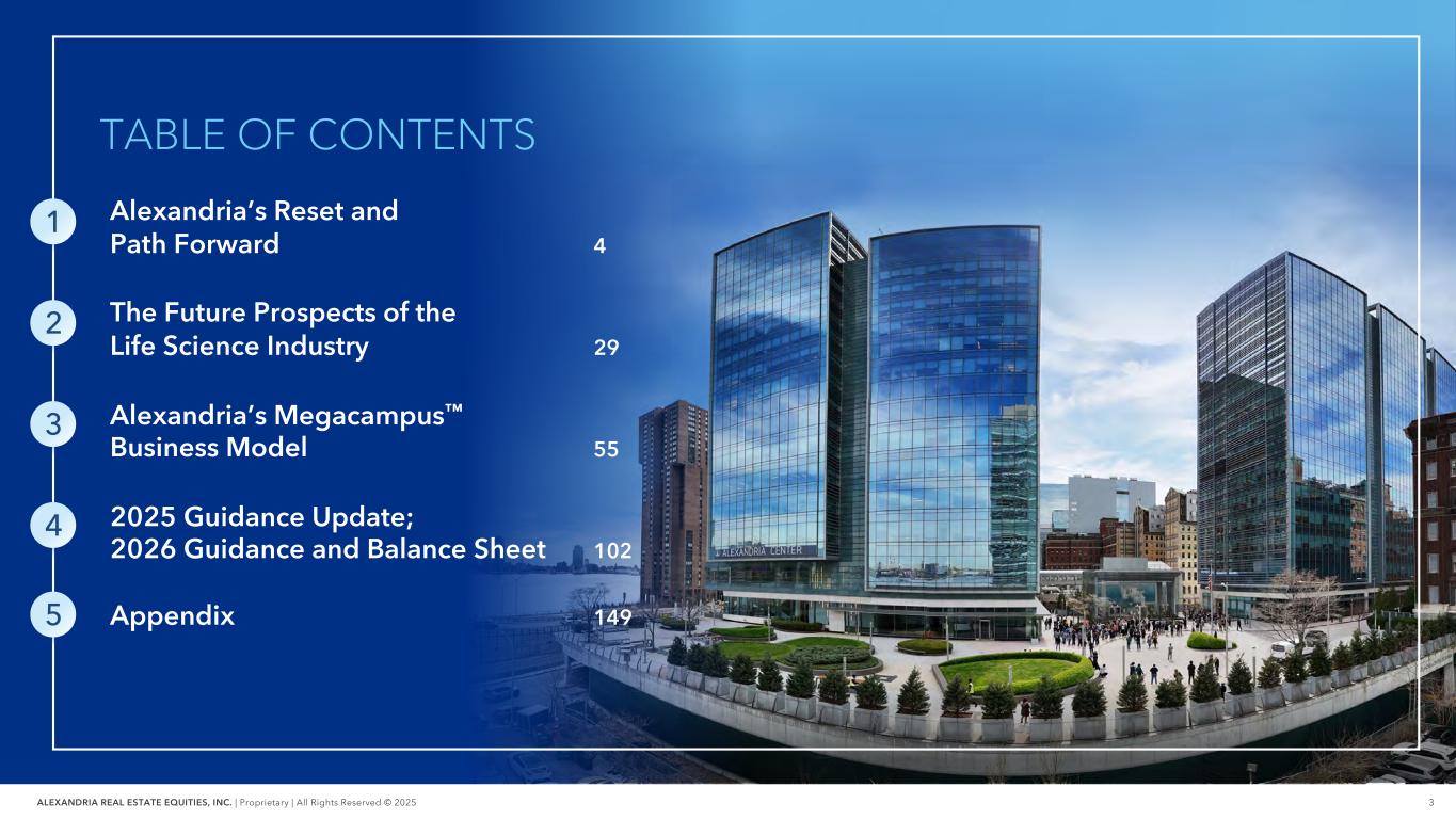 3ALEXANDRIA REAL ESTATE EQUITIES, INC. | Proprietary | All Rights Reserved © 2025 Alexandria’s Reset and Path Forward 4 The Future Prospects of the Life Science Industry 29 Alexandria’s Megacampus™ Business Model 55 2025 Guidance Update; 2026 Guidance and Balance Sheet 102 Appendix 149 TABLE OF CONTENTS 1 3 4 2 5