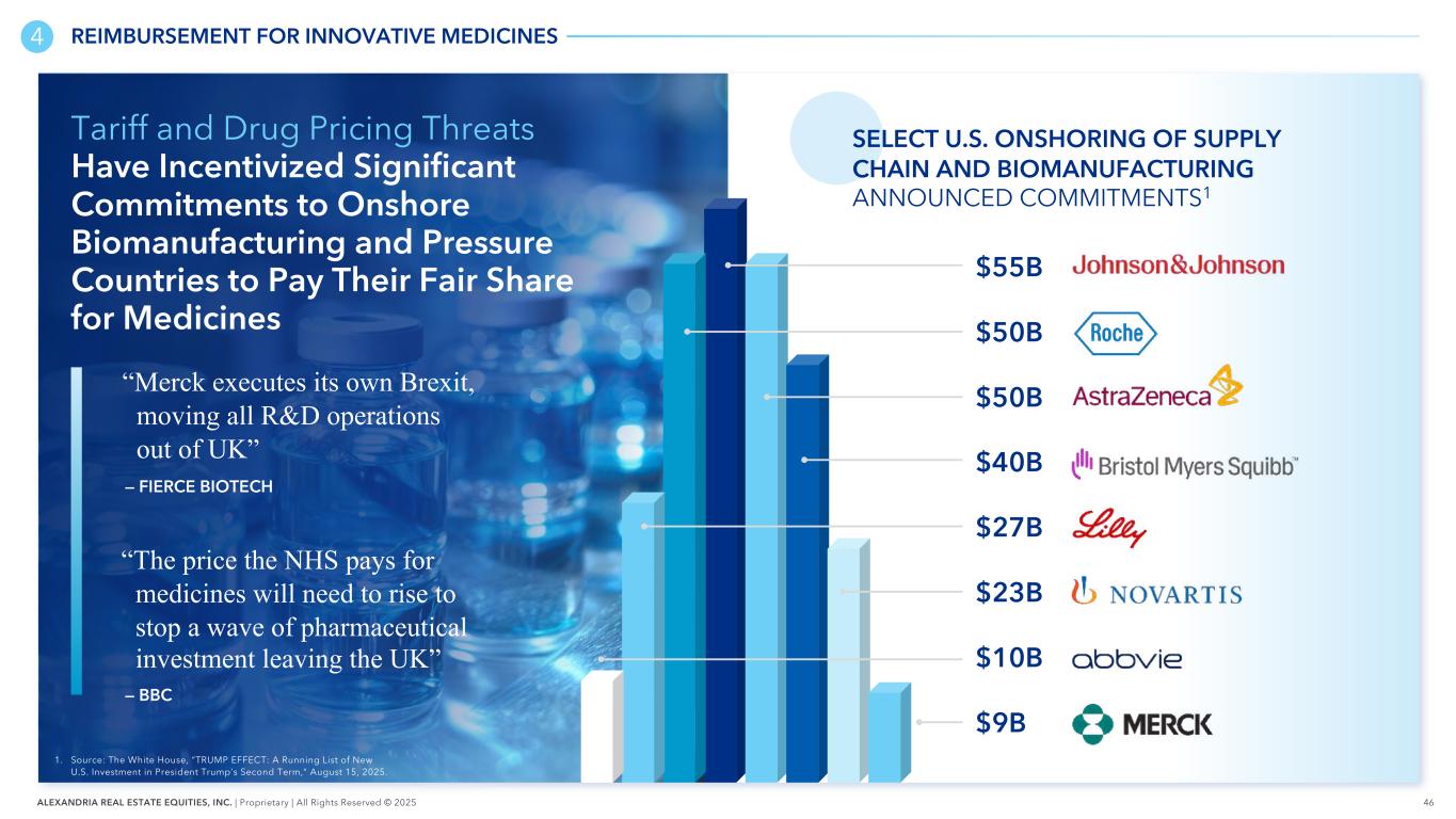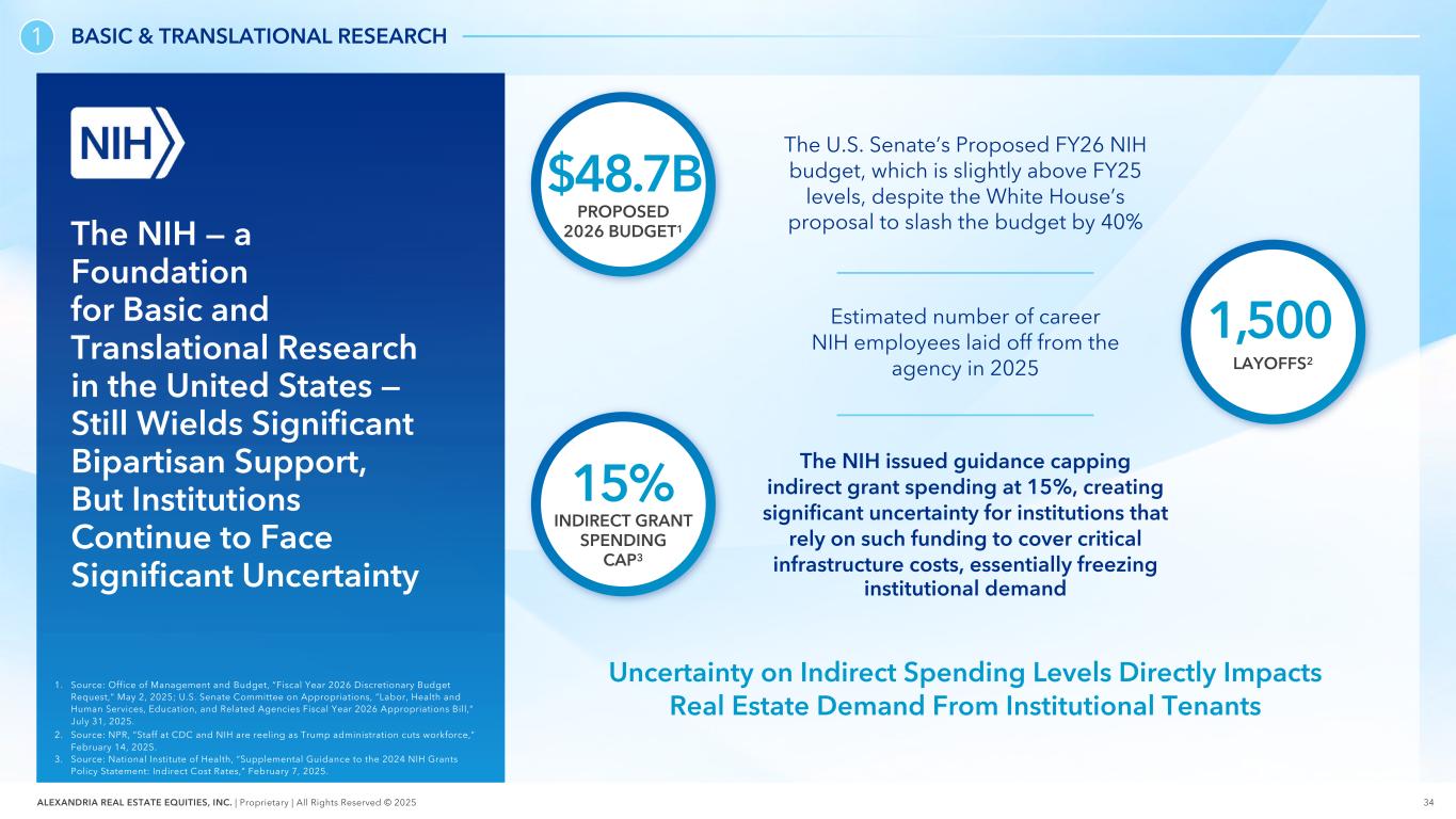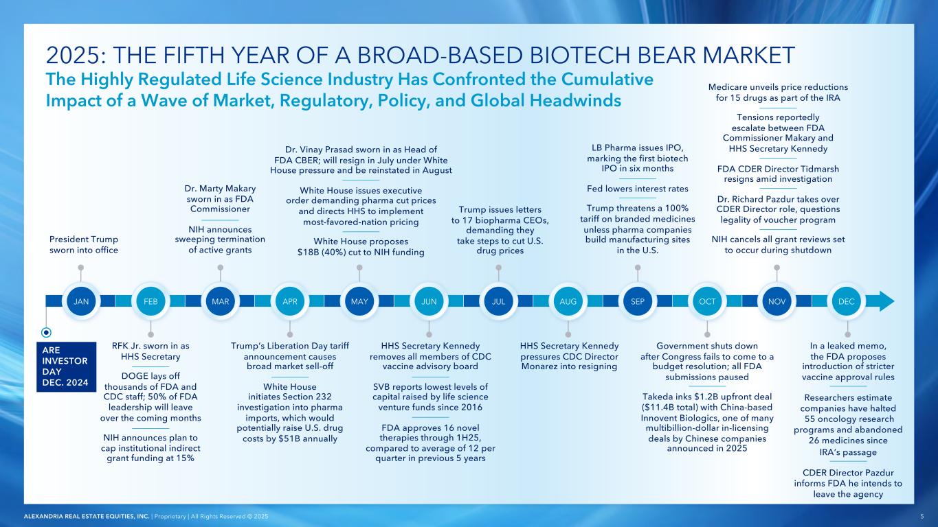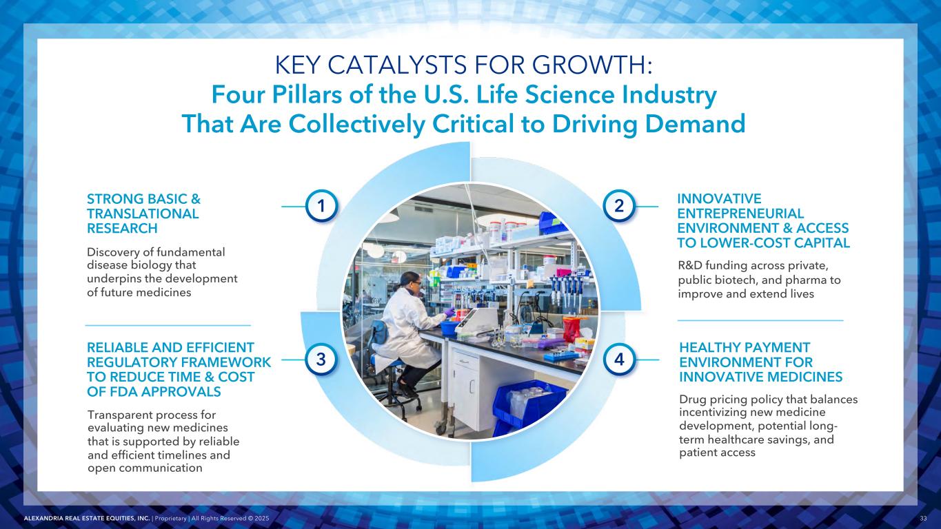 32ALEXANDRIA REAL ESTATE EQUITIES, INC. | Proprietary | All Rights Reserved © 2025 2025: THE FIFTH YEAR OF A BROAD-BASED BIOTECH BEAR MARKET President Trump sworn into office RFK Jr. sworn in as HHS Secretary DOGE lays off thousands of FDA and CDC staff; 50% of FDA leadership will leave over the coming months NIH announces plan to cap institutional indirect grant funding at 15% Trump’s Liberation Day tariff announcement causes broad market sell-off White House initiates Section 232 investigation into pharma imports, which would potentially raise U.S. drug costs by $51B annually LB Pharma issues IPO, marking the first biotech IPO in six months Fed lowers interest rates Trump threatens a 100% tariff on branded medicines unless pharma companies build manufacturing sites in the U.S. Dr. Vinay Prasad sworn in as Head of FDA CBER; will resign in July under White House pressure and be reinstated in August White House issues executive order demanding pharma cut prices and directs HHS to implement most-favored-nation pricing White House proposes $18B (40%) cut to NIH funding Dr. Marty Makary sworn in as FDA Commissioner NIH announces sweeping termination of active grants Trump issues letters to 17 biopharma CEOs, demanding they take steps to cut U.S. drug prices HHS Secretary Kennedy removes all members of CDC vaccine advisory board SVB reports lowest levels of capital raised by life science venture funds since 2016 FDA approves 16 novel therapies through 1H25, compared to average of 12 per quarter in previous 5 years HHS Secretary Kennedy pressures CDC Director Monarez into resigning Government shuts down after Congress fails to come to a budget resolution; all FDA submissions paused Takeda inks $1.2B upfront deal ($11.4B total) with China-based Innovent Biologics, one of many multibillion-dollar in-licensing deals by Chinese companies announced in 2025 JAN FEB MAR MAY JUN JUL SEP OCTAUG NOVAPR The Highly Regulated Life Science Industry Has Confronted the Cumulative Impact of a Wave of Market, Regulatory, Policy, and Global Headwinds Medicare unveils price reductions for 15 drugs as part of the IRA Tensions reportedly escalate between FDA Commissioner Makary and HHS Secretary Kennedy FDA CDER Director Tidmarsh resigns amid investigation Dr. Richard Pazdur takes over CDER Director role, questions legality of voucher program NIH cancels all grant reviews set to occur during shutdown In a leaked memo, the FDA proposes introduction of stricter vaccine approval rules Researchers estimate companies have halted 55 oncology research programs and abandoned 26 medicines since IRA’s passage CDER Director Pazdur informs FDA he intends to leave the agency DEC ARE INVESTOR DAY DEC. 2024
