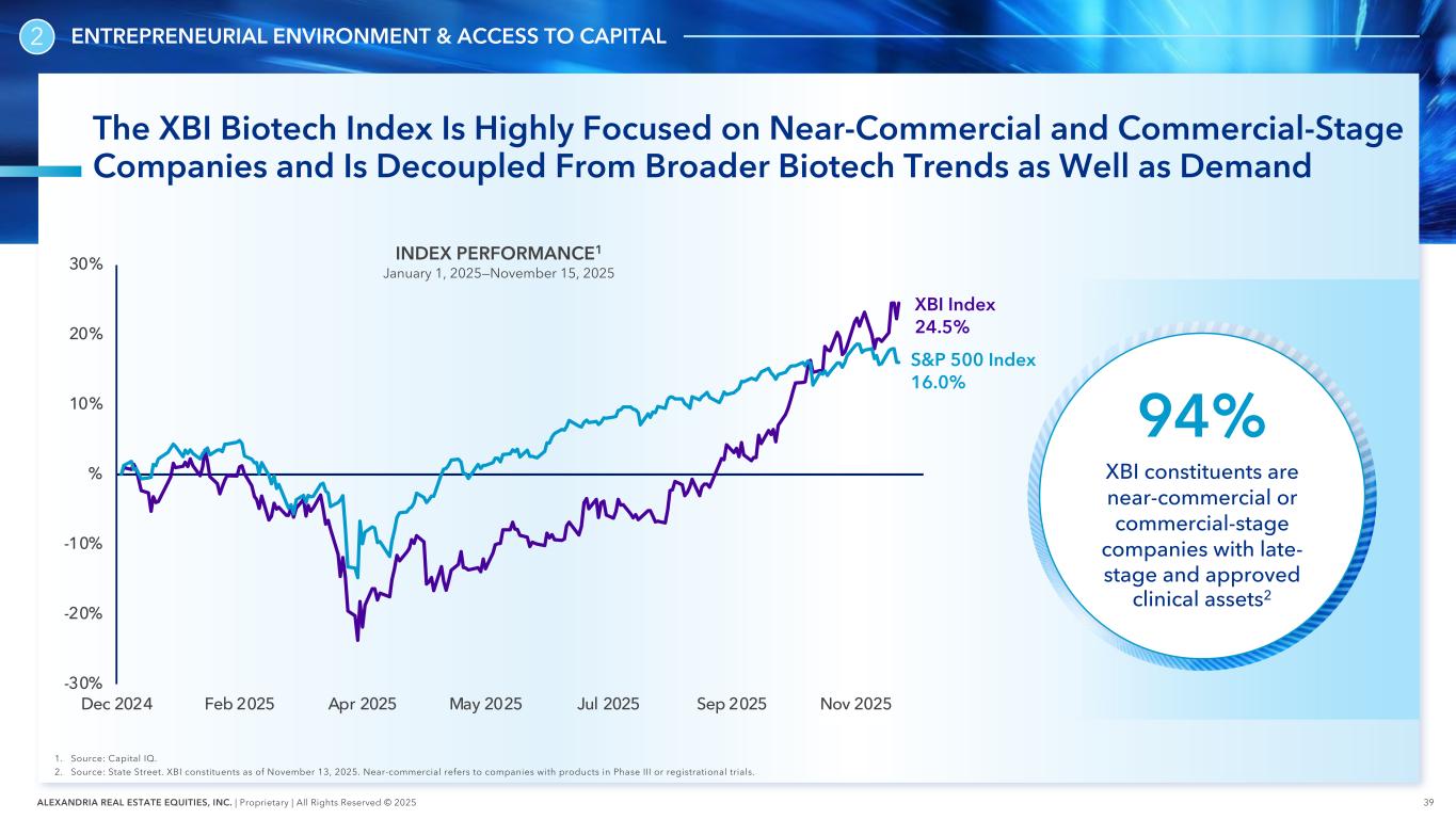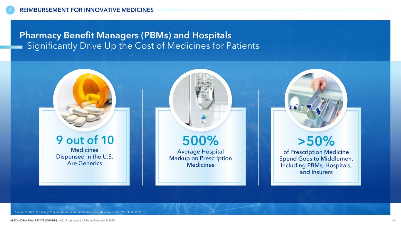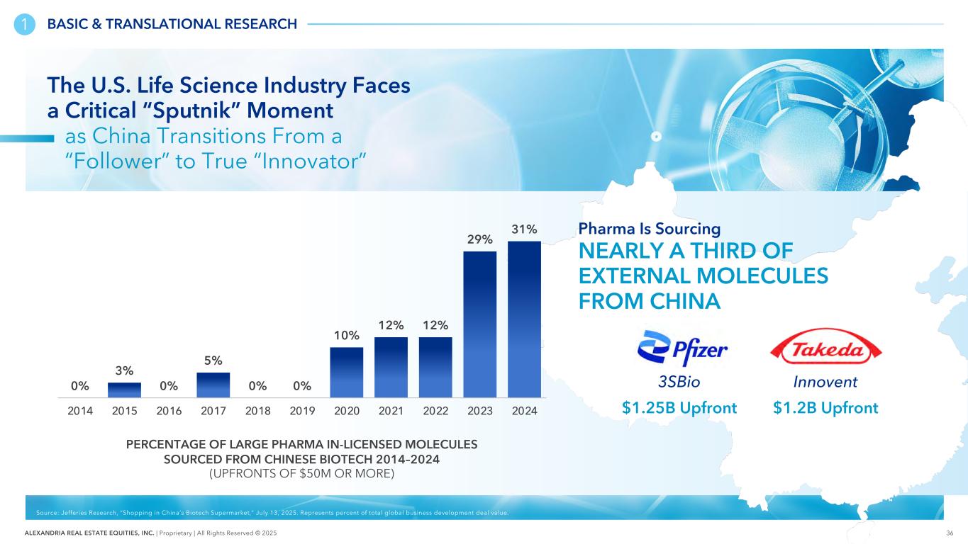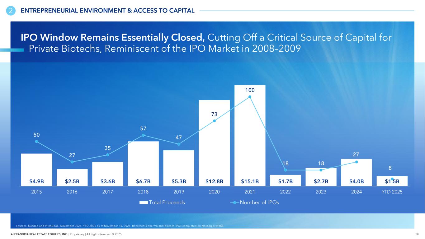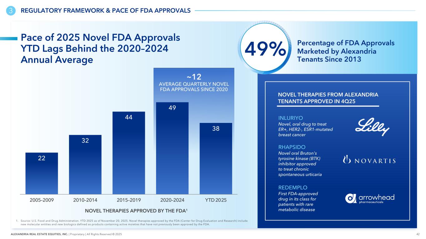 32ALEXANDRIA REAL ESTATE EQUITIES, INC. | Proprietary | All Rights Reserved © 2025 2025: THE FIFTH YEAR OF A BROAD-BASED BIOTECH BEAR MARKET President Trump sworn into office RFK Jr. sworn in as HHS Secretary DOGE lays off thousands of FDA and CDC staff; 50% of FDA leadership will leave over the coming months NIH announces plan to cap institutional indirect grant funding at 15% Trump’s Liberation Day tariff announcement causes broad market sell-off White House initiates Section 232 investigation into pharma imports, which would potentially raise U.S. drug costs by $51B annually LB Pharma issues IPO, marking the first biotech IPO in six months Fed lowers interest rates Trump threatens a 100% tariff on branded medicines unless pharma companies build manufacturing sites in the U.S. Dr. Vinay Prasad sworn in as Head of FDA CBER; will resign in July under White House pressure and be reinstated in August White House issues executive order demanding pharma cut prices and directs HHS to implement most-favored-nation pricing White House proposes $18B (40%) cut to NIH funding Dr. Marty Makary sworn in as FDA Commissioner NIH announces sweeping termination of active grants Trump issues letters to 17 biopharma CEOs, demanding they take steps to cut U.S. drug prices HHS Secretary Kennedy removes all members of CDC vaccine advisory board SVB reports lowest levels of capital raised by life science venture funds since 2016 FDA approves 16 novel therapies through 1H25, compared to average of 12 per quarter in previous 5 years HHS Secretary Kennedy pressures CDC Director Monarez into resigning Government shuts down after Congress fails to come to a budget resolution; all FDA submissions paused Takeda inks $1.2B upfront deal ($11.4B total) with China-based Innovent Biologics, one of many multibillion-dollar in-licensing deals by Chinese companies announced in 2025 JAN FEB MAR MAY JUN JUL SEP OCTAUG NOVAPR The Highly Regulated Life Science Industry Has Confronted the Cumulative Impact of a Wave of Market, Regulatory, Policy, and Global Headwinds Medicare unveils price reductions for 15 drugs as part of the IRA Tensions reportedly escalate between FDA Commissioner Makary and HHS Secretary Kennedy FDA CDER Director Tidmarsh resigns amid investigation Dr. Richard Pazdur takes over CDER Director role, questions legality of voucher program NIH cancels all grant reviews set to occur during shutdown In a leaked memo, the FDA proposes introduction of stricter vaccine approval rules Researchers estimate companies have halted 55 oncology research programs and abandoned 26 medicines since IRA’s passage CDER Director Pazdur informs FDA he intends to leave the agency DEC ARE INVESTOR DAY DEC. 2024