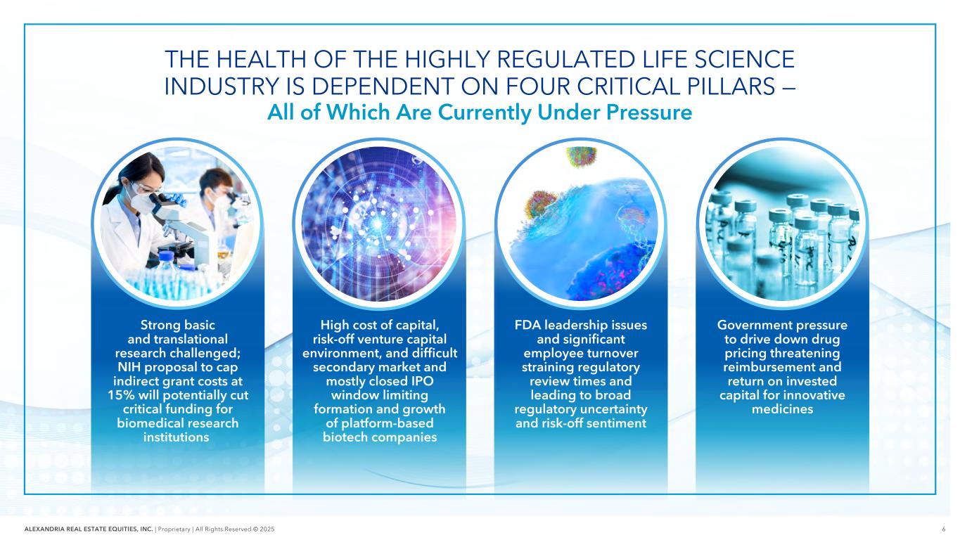 5ALEXANDRIA REAL ESTATE EQUITIES, INC. | Proprietary | All Rights Reserved © 2025 2025: THE FIFTH YEAR OF A BROAD-BASED BIOTECH BEAR MARKET President Trump sworn into office RFK Jr. sworn in as HHS Secretary DOGE lays off thousands of FDA and CDC staff; 50% of FDA leadership will leave over the coming months NIH announces plan to cap institutional indirect grant funding at 15% Trump’s Liberation Day tariff announcement causes broad market sell-off White House initiates Section 232 investigation into pharma imports, which would potentially raise U.S. drug costs by $51B annually LB Pharma issues IPO, marking the first biotech IPO in six months Fed lowers interest rates Trump threatens a 100% tariff on branded medicines unless pharma companies build manufacturing sites in the U.S. Dr. Vinay Prasad sworn in as Head of FDA CBER; will resign in July under White House pressure and be reinstated in August White House issues executive order demanding pharma cut prices and directs HHS to implement most-favored-nation pricing White House proposes $18B (40%) cut to NIH funding Dr. Marty Makary sworn in as FDA Commissioner NIH announces sweeping termination of active grants Trump issues letters to 17 biopharma CEOs, demanding they take steps to cut U.S. drug prices HHS Secretary Kennedy removes all members of CDC vaccine advisory board SVB reports lowest levels of capital raised by life science venture funds since 2016 FDA approves 16 novel therapies through 1H25, compared to average of 12 per quarter in previous 5 years HHS Secretary Kennedy pressures CDC Director Monarez into resigning Government shuts down after Congress fails to come to a budget resolution; all FDA submissions paused Takeda inks $1.2B upfront deal ($11.4B total) with China-based Innovent Biologics, one of many multibillion-dollar in-licensing deals by Chinese companies announced in 2025 JAN FEB MAR MAY JUN JUL SEP OCTAUG NOVAPR The Highly Regulated Life Science Industry Has Confronted the Cumulative Impact of a Wave of Market, Regulatory, Policy, and Global Headwinds Medicare unveils price reductions for 15 drugs as part of the IRA Tensions reportedly escalate between FDA Commissioner Makary and HHS Secretary Kennedy FDA CDER Director Tidmarsh resigns amid investigation Dr. Richard Pazdur takes over CDER Director role, questions legality of voucher program NIH cancels all grant reviews set to occur during shutdown In a leaked memo, the FDA proposes introduction of stricter vaccine approval rules Researchers estimate companies have halted 55 oncology research programs and abandoned 26 medicines since IRA’s passage CDER Director Pazdur informs FDA he intends to leave the agency DEC ARE INVESTOR DAY DEC. 2024