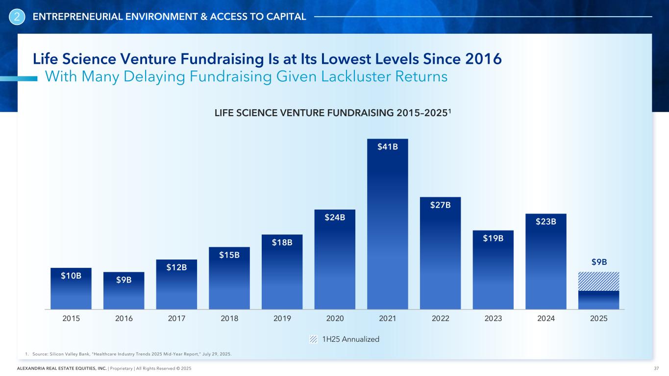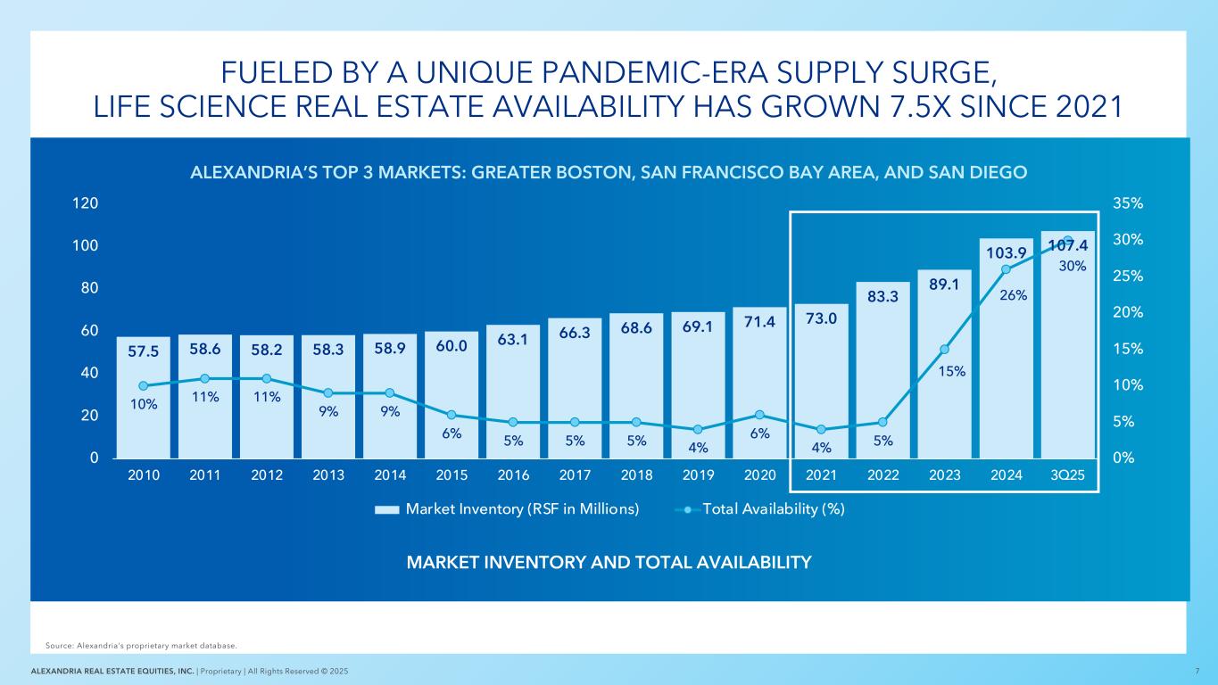 6ALEXANDRIA REAL ESTATE EQUITIES, INC. | Proprietary | All Rights Reserved © 2025 THE HEALTH OF THE HIGHLY REGULATED LIFE SCIENCE INDUSTRY IS DEPENDENT ON FOUR CRITICAL PILLARS — All of Which Are Currently Under Pressure Strong basic and translational research challenged; NIH proposal to cap indirect grant costs at 15% will potentially cut critical funding for biomedical research institutions High cost of capital, risk-off venture capital environment, and difficult secondary market and mostly closed IPO window limiting formation and growth of platform-based biotech companies FDA leadership issues and significant employee turnover straining regulatory review times and leading to broad regulatory uncertainty and risk-off sentiment Government pressure to drive down drug pricing threatening reimbursement and return on invested capital for innovative medicines