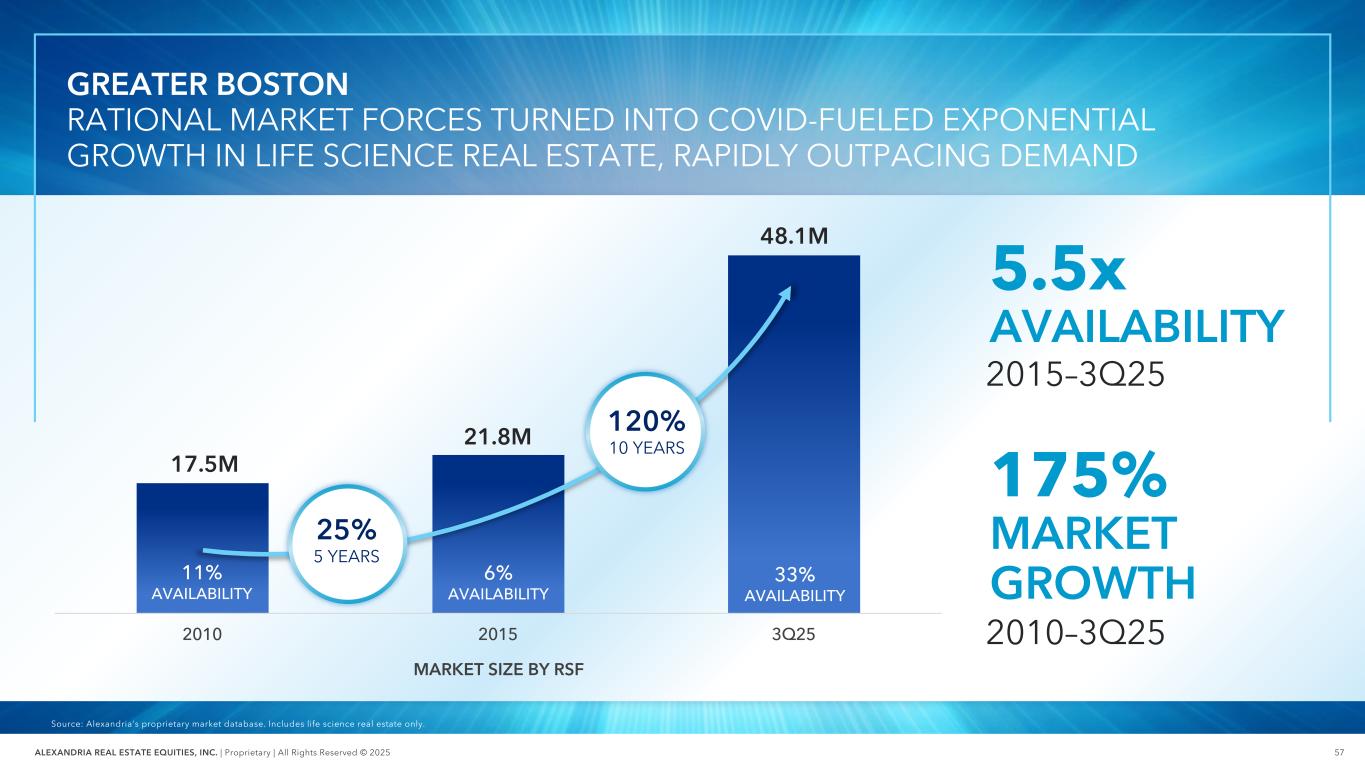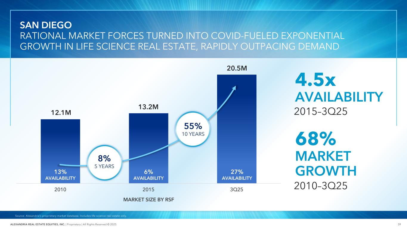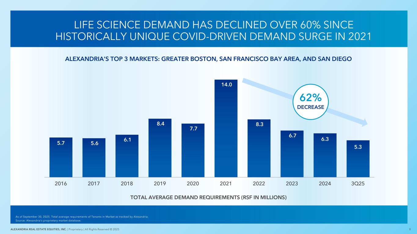 7ALEXANDRIA REAL ESTATE EQUITIES, INC. | Proprietary | All Rights Reserved © 2025 FUELED BY A UNIQUE PANDEMIC-ERA SUPPLY SURGE, LIFE SCIENCE REAL ESTATE AVAILABILITY HAS GROWN 7.5X SINCE 2021 Source: Alexandria’s proprietary market database. 57.5 58.6 58.2 58.3 58.9 60.0 63.1 66.3 68.6 69.1 71.4 73.0 83.3 89.1 103.9 107.4 10% 11% 11% 9% 9% 6% 5% 5% 5% 4% 6% 4% 5% 15% 26% 30% 0 20 40 60 80 100 120 0% 5% 10% 15% 20% 25% 30% 35% 2010 2011 2012 2013 2014 2015 2016 2017 2018 2019 2020 2021 2022 2023 2024 3Q25 Market Inventory (RSF in Millions) Total Availability (%) MARKET INVENTORY AND TOTAL AVAILABILITY ALEXANDRIA’S TOP 3 MARKETS: GREATER BOSTON, SAN FRANCISCO BAY AREA, AND SAN DIEGO