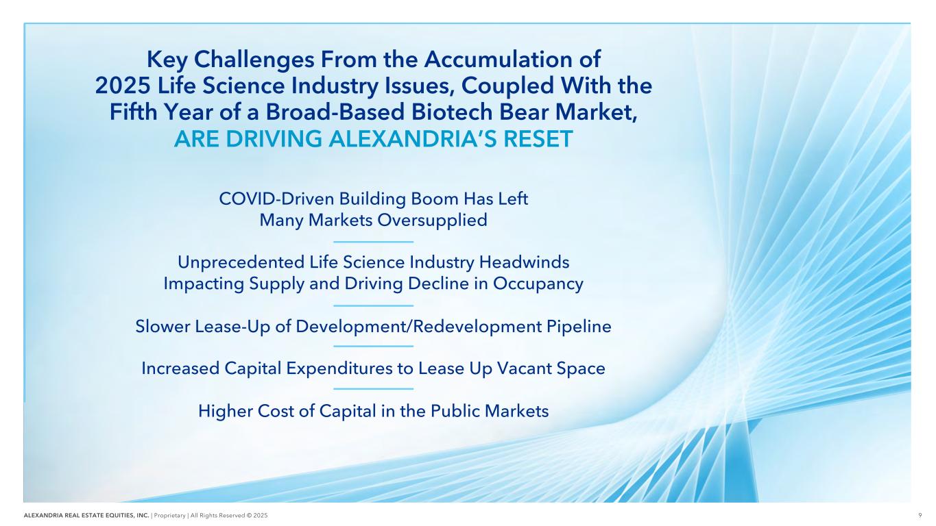 9ALEXANDRIA REAL ESTATE EQUITIES, INC. | Proprietary | All Rights Reserved © 2025 Key Challenges From the Accumulation of 2025 Life Science Industry Issues, Coupled With the Fifth Year of a Broad-Based Biotech Bear Market, ARE DRIVING ALEXANDRIA’S RESET COVID-Driven Building Boom Has Left Many Markets Oversupplied Unprecedented Life Science Industry Headwinds Impacting Supply and Driving Decline in Occupancy Slower Lease-Up of Development/Redevelopment Pipeline Increased Capital Expenditures to Lease Up Vacant Space Higher Cost of Capital in the Public Markets
