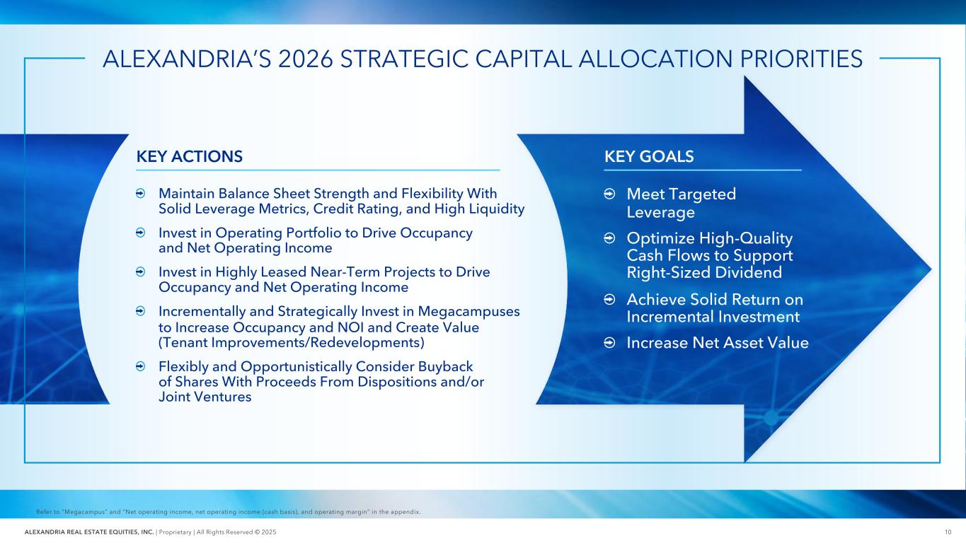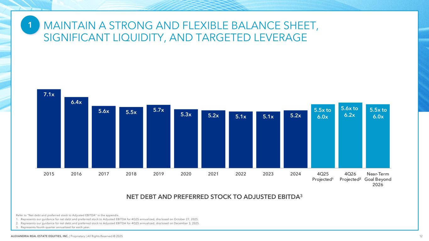 10ALEXANDRIA REAL ESTATE EQUITIES, INC. | Proprietary | All Rights Reserved © 2025 Refer to “Megacampus” and “Net operating income, net operating income (cash basis), and operating margin” in the appendix. Maintain Balance Sheet Strength and Flexibility With Solid Leverage Metrics, Credit Rating, and High Liquidity Invest in Operating Portfolio to Drive Occupancy and Net Operating Income Invest in Highly Leased Near-Term Projects to Drive Occupancy and Net Operating Income Incrementally and Strategically Invest in Megacampuses to Increase Occupancy and NOI and Create Value (Tenant Improvements/Redevelopments) Flexibly and Opportunistically Consider Buyback of Shares With Proceeds From Dispositions and/or Joint Ventures KEY ACTIONS ALEXANDRIA’S 2026 STRATEGIC CAPITAL ALLOCATION PRIORITIES Meet Targeted Leverage Optimize High-Quality Cash Flows to Support Right-Sized Dividend Achieve Solid Return on Incremental Investment Increase Net Asset Value KEY GOALS