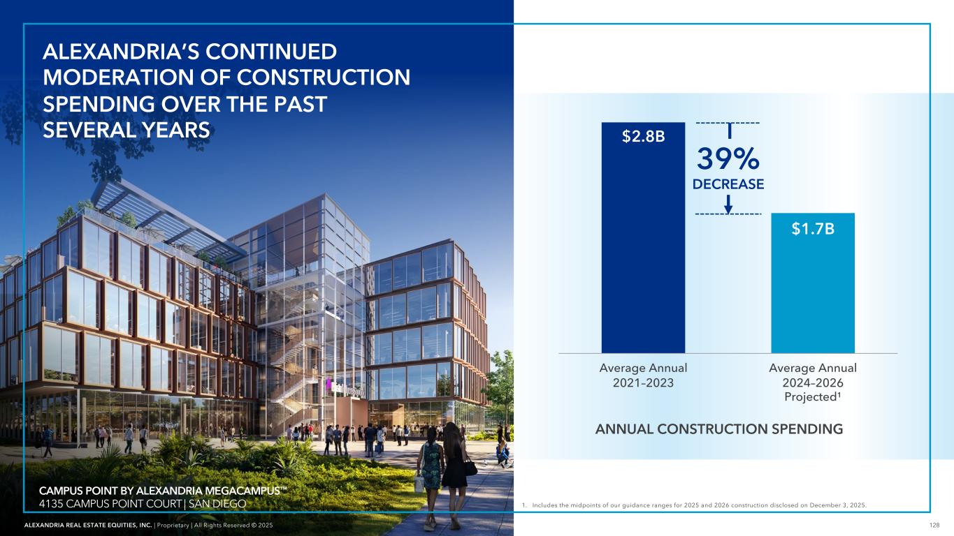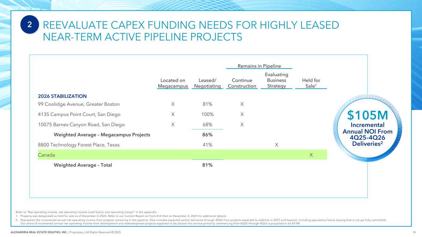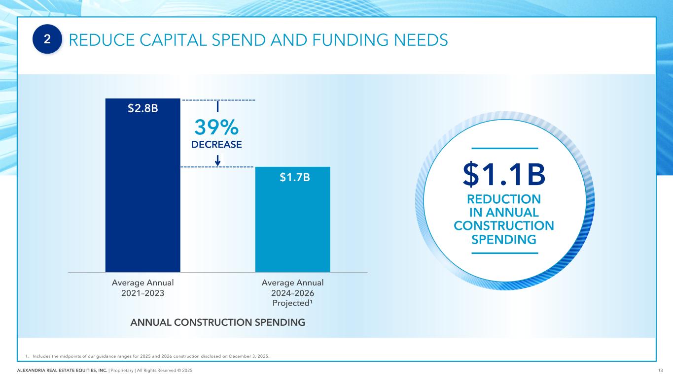 13ALEXANDRIA REAL ESTATE EQUITIES, INC. | Proprietary | All Rights Reserved © 2025 $2.8B $1.7B Average Annual 2021–2023 Average Annual 2024–2026 Projected¹ ANNUAL CONSTRUCTION SPENDING REDUCE CAPITAL SPEND AND FUNDING NEEDS 1. Includes the midpoints of our guidance ranges for 2025 and 2026 construction disclosed on December 3, 2025. 2 $1.1B REDUCTION IN ANNUAL CONSTRUCTION SPENDING 39% DECREASE