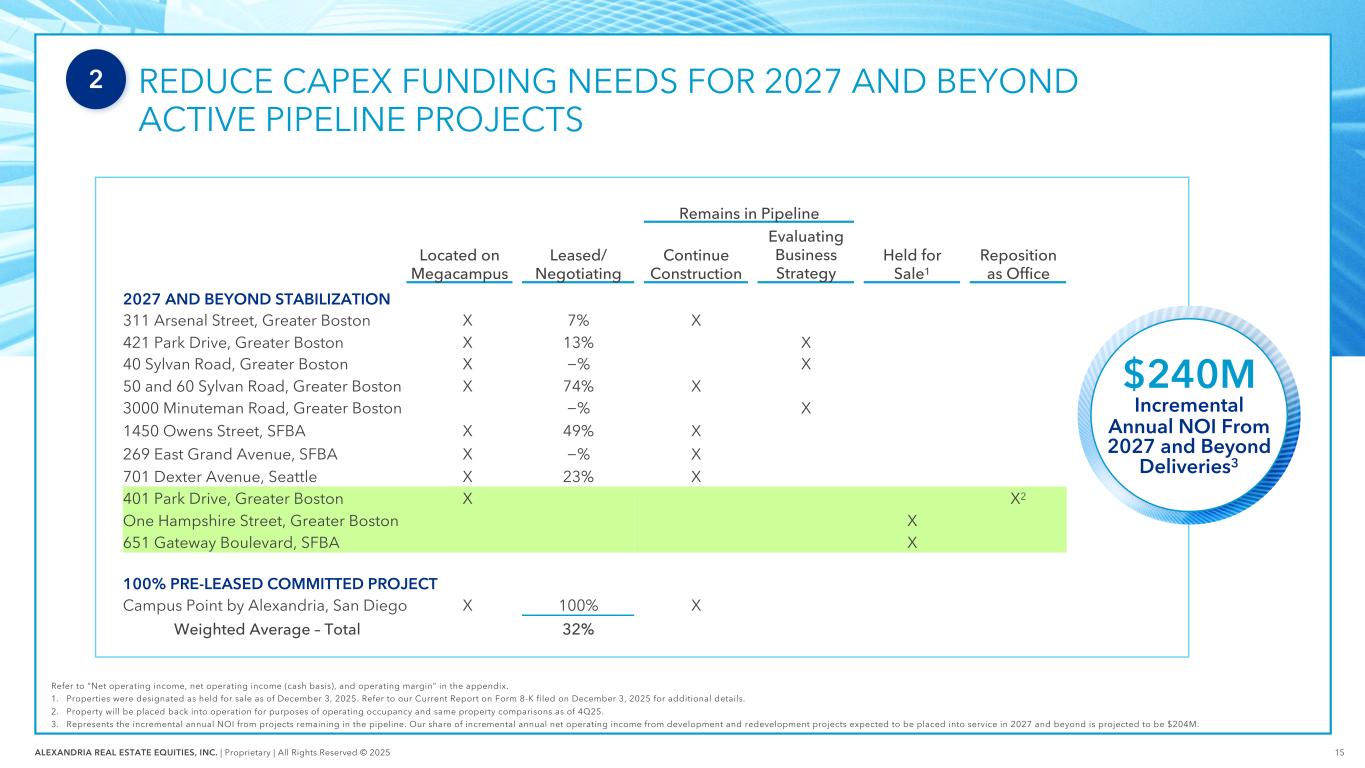 14ALEXANDRIA REAL ESTATE EQUITIES, INC. | Proprietary | All Rights Reserved © 2025 REEVALUATE CAPEX FUNDING NEEDS FOR HIGHLY LEASED NEAR-TERM ACTIVE PIPELINE PROJECTS 2 Refer to “Net operating income, net operating income (cash basis), and operating margin” in the appendix. 1. Property was designated as held for sale as of December 3, 2025. Refer to our Current Report on Form 8-K filed on December 3, 2025 for additional details. 2. Represents the incremental annual net operating income from projects remaining in the pipeline. Also includes expected partial deliveries through 4Q26 from projects expected to stabilize in 2027 and beyond, including speculative future leasing that is not yet fully committed. Our share of incremental annual net operating income from development and redevelopment projects expected to be placed into service primarily commencing from 4Q25 through 4Q26 is projected to be $77M. Located on Megacampus Leased/ Negotiating Remains in Pipeline Held for Sale1 Continue Construction Evaluating Business Strategy 2026 STABILIZATION 99 Coolidge Avenue, Greater Boston X 81% X 4135 Campus Point Court, San Diego X 100% X 10075 Barnes Canyon Road, San Diego X 68% X Weighted Average – Megacampus Projects 86% 8800 Technology Forest Place, Texas 41% X Canada X Weighted Average – Total 81% $105M Incremental Annual NOI From 4Q25–4Q26 Deliveries2