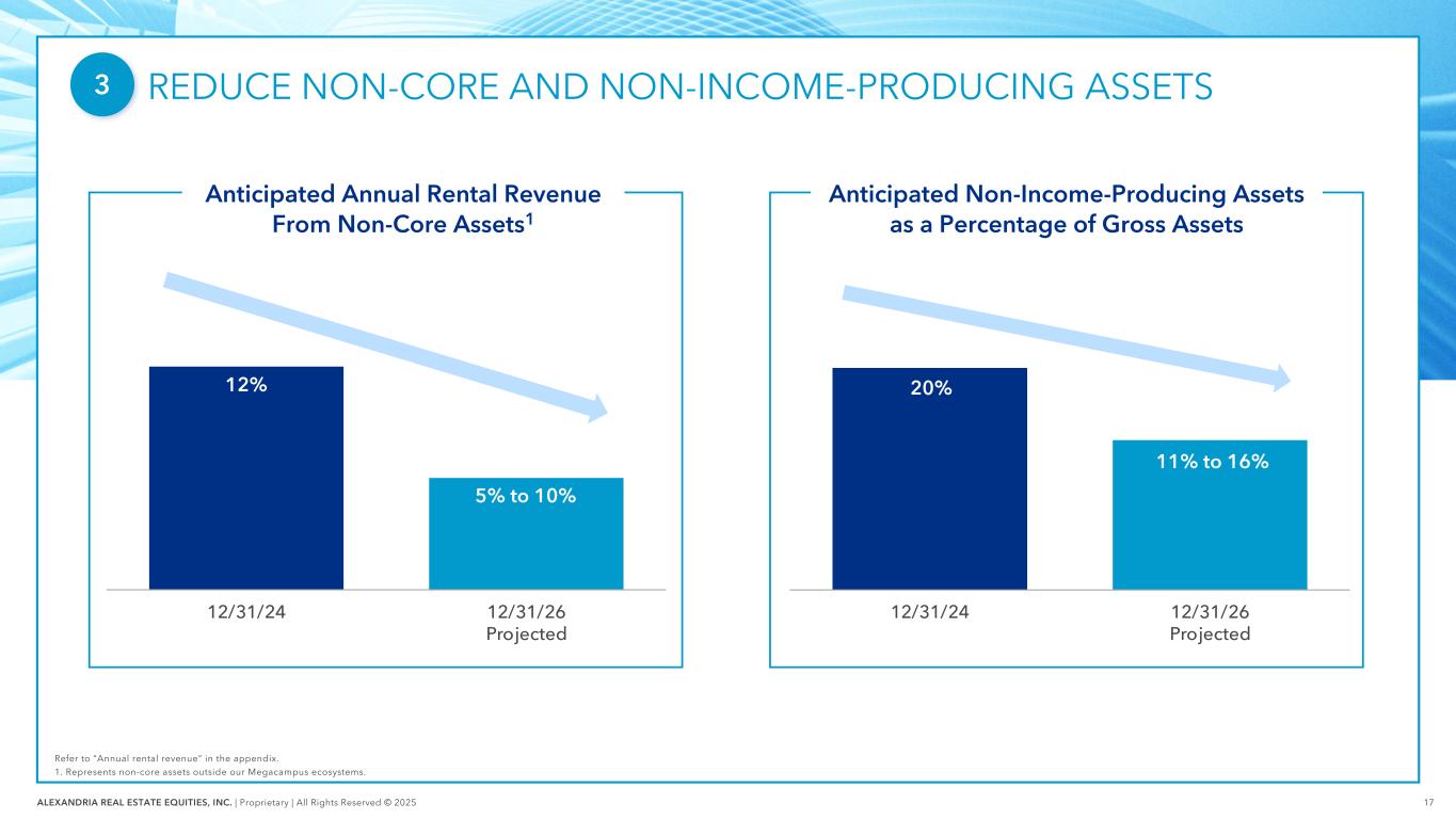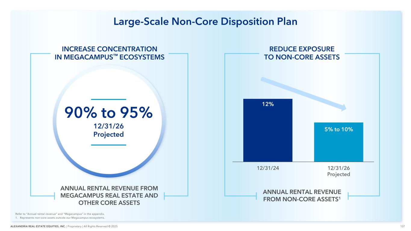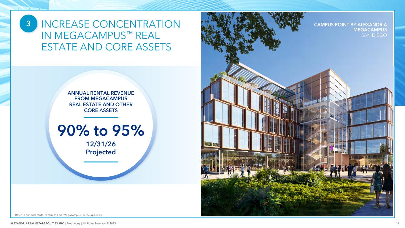 17ALEXANDRIA REAL ESTATE EQUITIES, INC. | Proprietary | All Rights Reserved © 2025 12% 5% to 10% 12/31/24 12/31/26 Projected REDUCE NON-CORE AND NON-INCOME-PRODUCING ASSETS Refer to “Annual rental revenue” in the appendix. 1. Represents non-core assets outside our Megacampus ecosystems. 3 20% 11% to 16% 12/31/24 12/31/26 Projected Anticipated Non-Income-Producing Assets as a Percentage of Gross Assets Anticipated Annual Rental Revenue From Non-Core Assets1