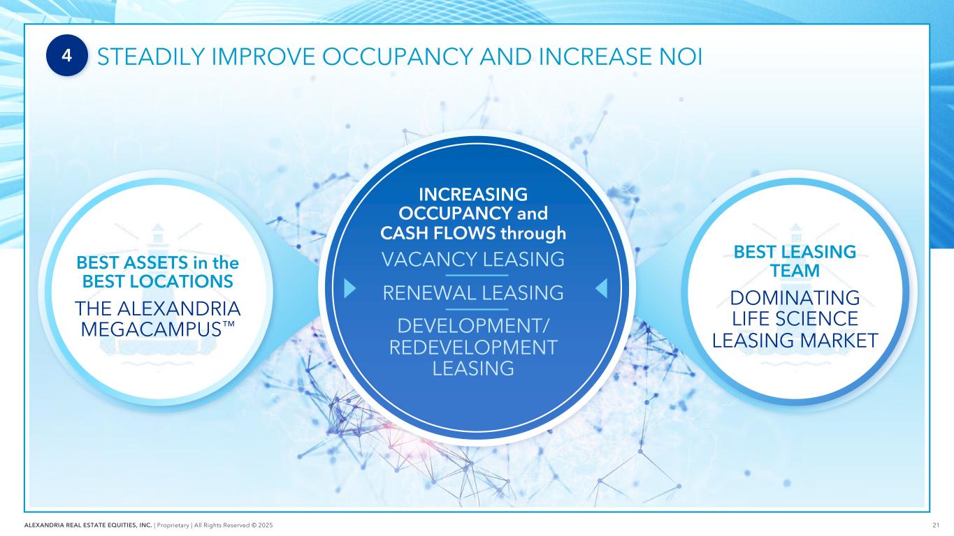 20ALEXANDRIA REAL ESTATE EQUITIES, INC. | Proprietary | All Rights Reserved © 2025 STEADILY IMPROVE OCCUPANCY AND INCREASE NOI4 2023–3Q25 1. Source: Alexandria’s proprietary market database. Represents Alexandria’s life science leasing executed from January 1, 2023 through the nine months ended September 30, 2025 in the Greater Boston, San Francisco Bay Area, and San Diego markets compared to the sum of life science leasing executed by the next five largest life science real estate owners within the respective markets. 2. Represents the years ended December 31, 2021 through 2024 and the nine months ended September 30, 2025. >80% Average Tenant Retention Rate for the Past 5 Years2 Strong Tenant Retention Alexandria’s Greater Boston, San Francisco Bay Area, and San Diego Combined Leasing Volume ~105% of the Next Five Largest Life Science Real Estate Owners (by RSF Leased) Combined1 ALEXANDRIA CONTINUES TO CAPTURE OUTSIZED SHARE OF DEMAND