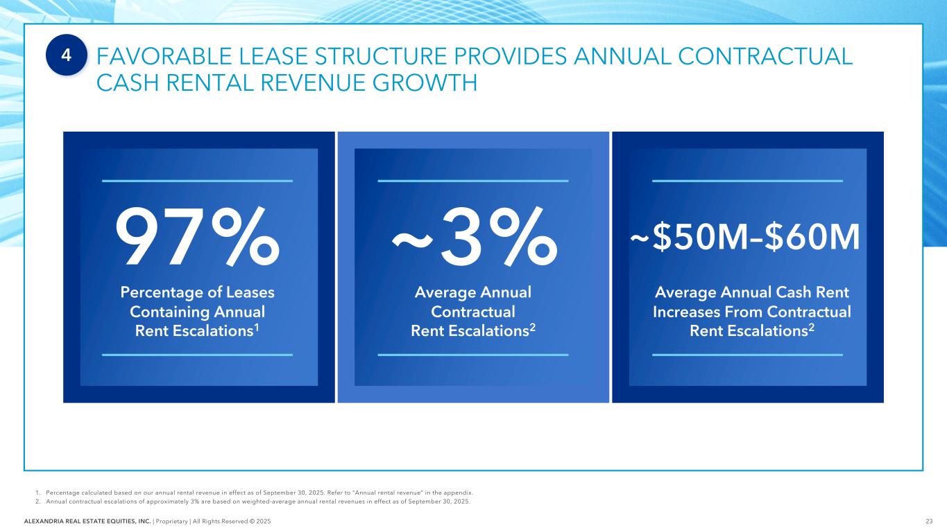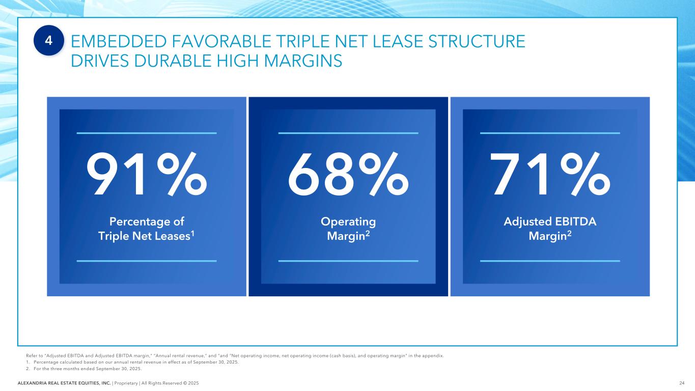 23ALEXANDRIA REAL ESTATE EQUITIES, INC. | Proprietary | All Rights Reserved © 2025 Average Annual Contractual Rent Escalations2 FAVORABLE LEASE STRUCTURE PROVIDES ANNUAL CONTRACTUAL CASH RENTAL REVENUE GROWTH 1. Percentage calculated based on our annual rental revenue in effect as of September 30, 2025. Refer to “Annual rental revenue” in the appendix. 2. Annual contractual escalations of approximately 3% are based on weighted-average annual rental revenues in effect as of September 30, 2025. 4 Percentage of Leases Containing Annual Rent Escalations1 97% ~3% Average Annual Contractual Rent Escalations2 ~$50M–$60M Average Annual Cash Rent Increases From Contractual Rent Escalations2